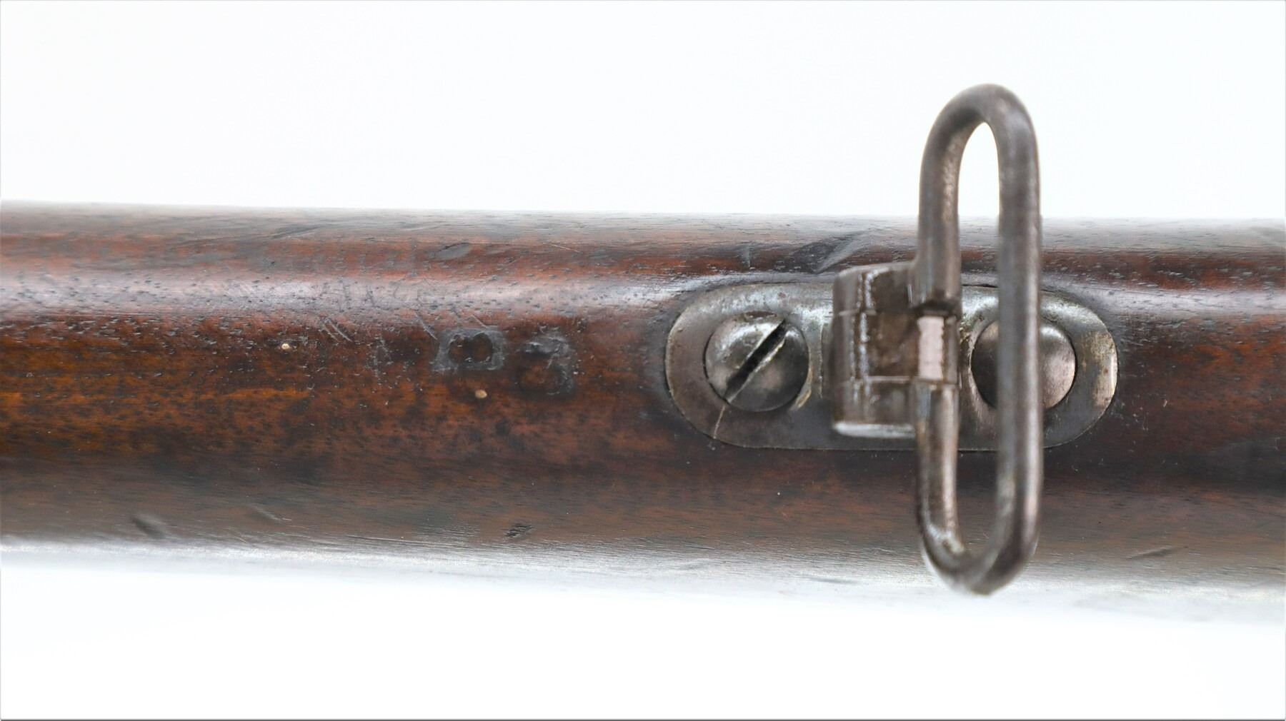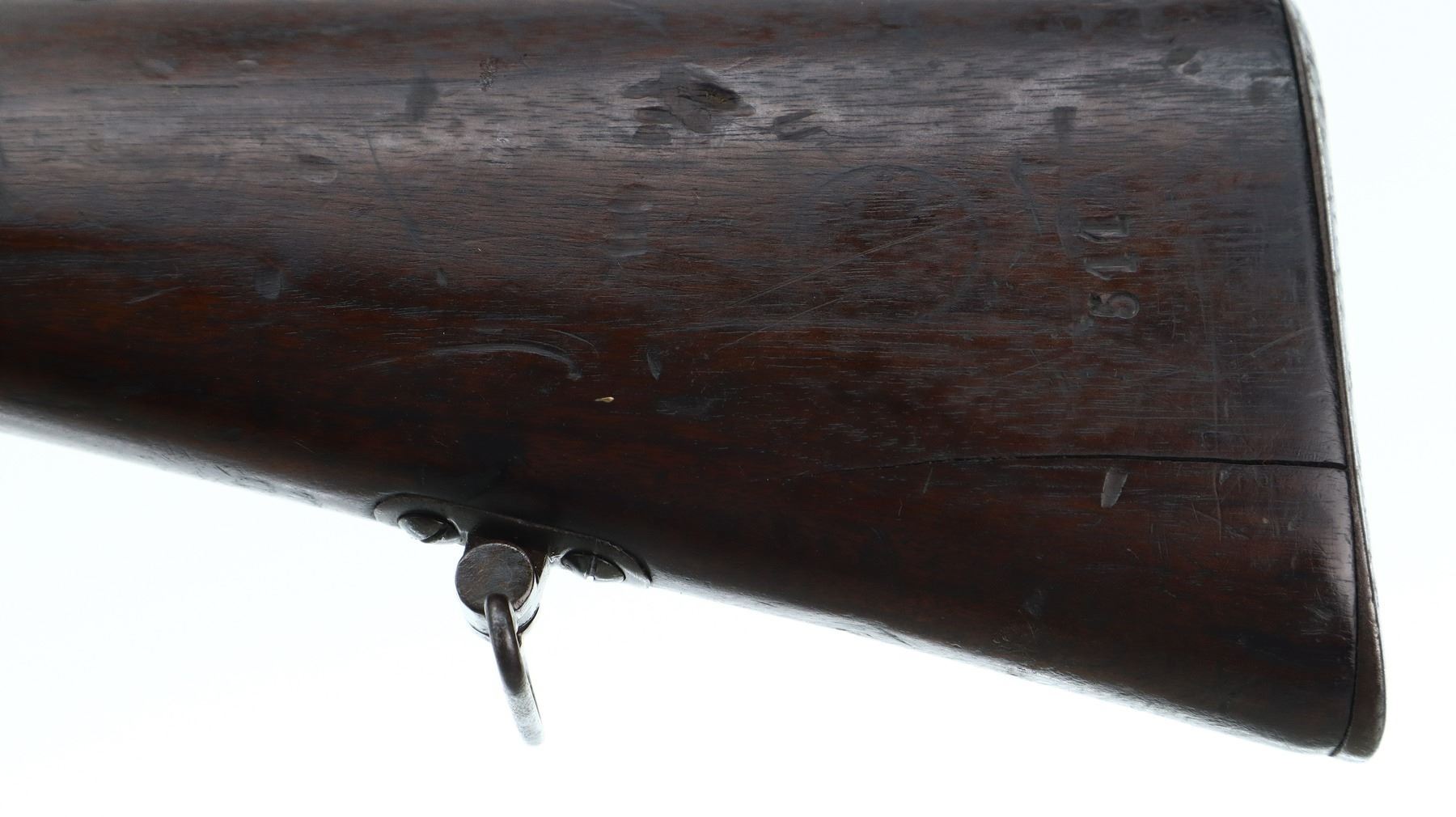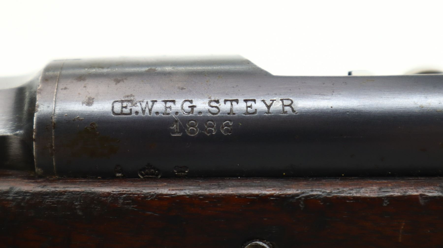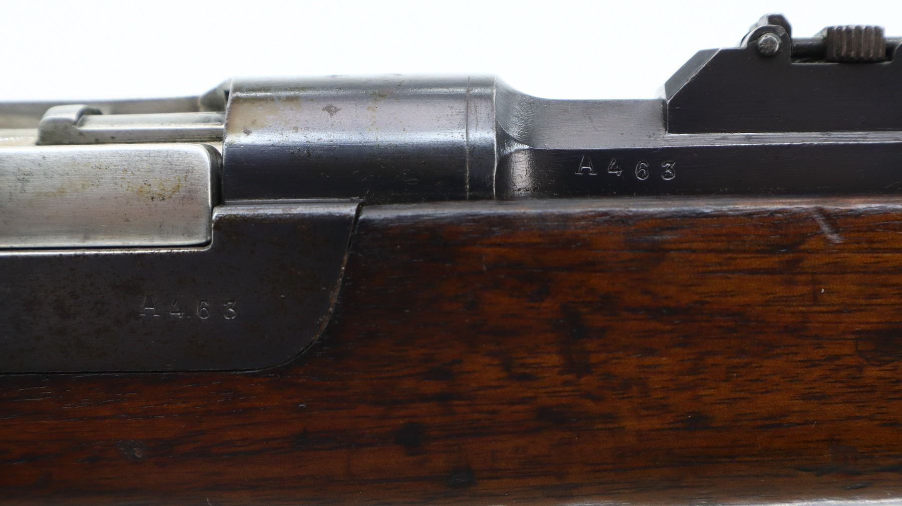 6+/10, PORTUGUESE KROPATSCHEK , MODEL: 1886 CARBINE, CALIBER:8 X 60R, BORE IS FAIR, SLIGHT WEAR, LIGHT PITTING. MANUFACTURED BY STEYR 1886, BOLT MISMATCHED. BARLEY CORN FRONT SIGHT WITH RAMP, ADJUSTABLE U NOTCHED LADDER REAR SIGHT, SILVER BOLT WITH TURNED DOWN HANDLE. ONE PIECE FULL MILITARY WOOD STOCK, STRAIGHT GRIP, SMOOTH STEEL BUTT PLATE, STOCK CRACKED AT TOE, STEEL TRIGGER GUARD WITH FINGER REST, SLING SWIVELS, CLEANING ROD, BAYONET LUG. METAL FINISH SHOWS A FEW LIGHT RUST SPECKLES, SCRATCHES, HANDLING MARKS AND WEAR. STOCKS SHOW SOME MARKS, SCRATCHES AND WEAR. , ACTION: BOLT ACTION RIFLE, BARREL LENGTH: 20.25", SERIAL # A463, CONDITION: 6+/10, CLASS: CANADIAN NON RESTRICTED
