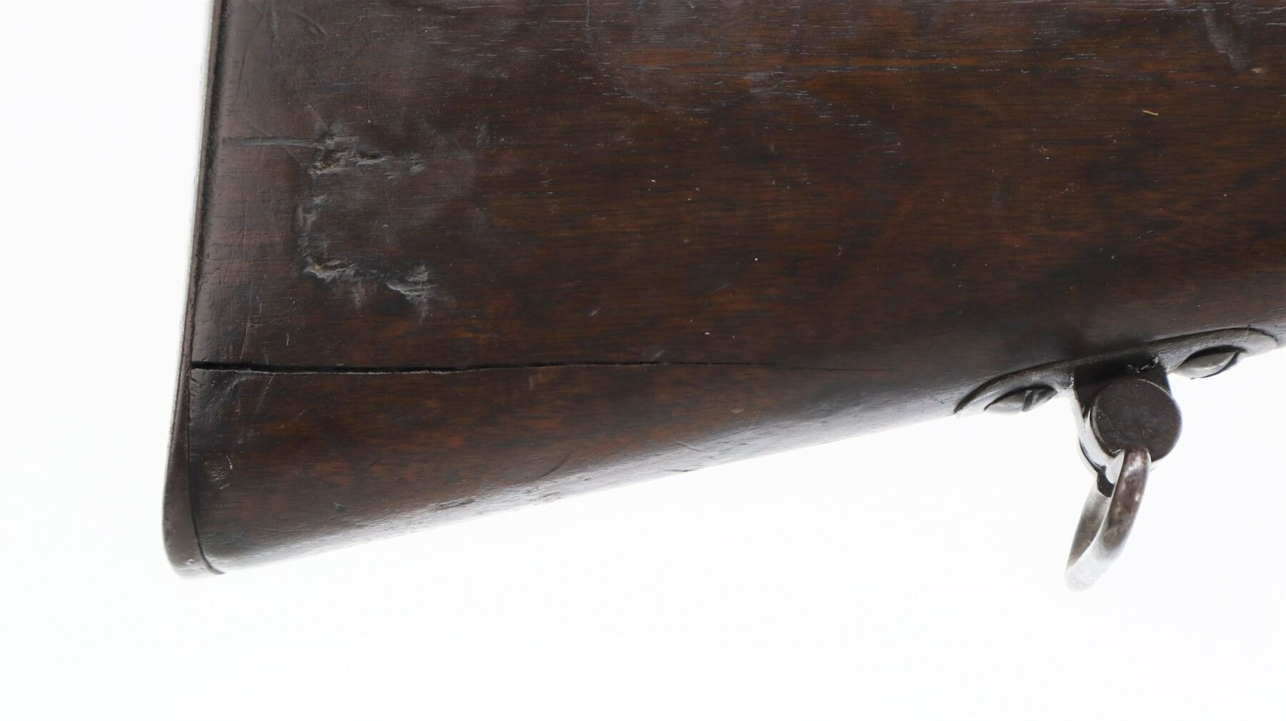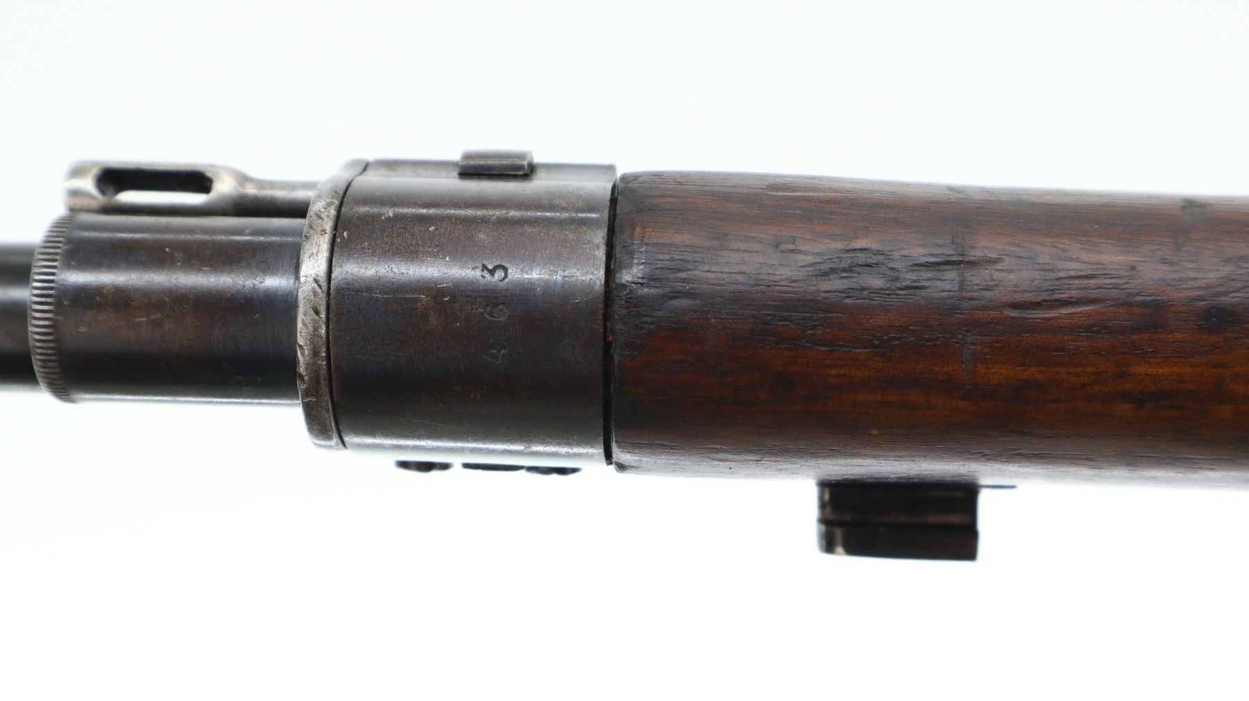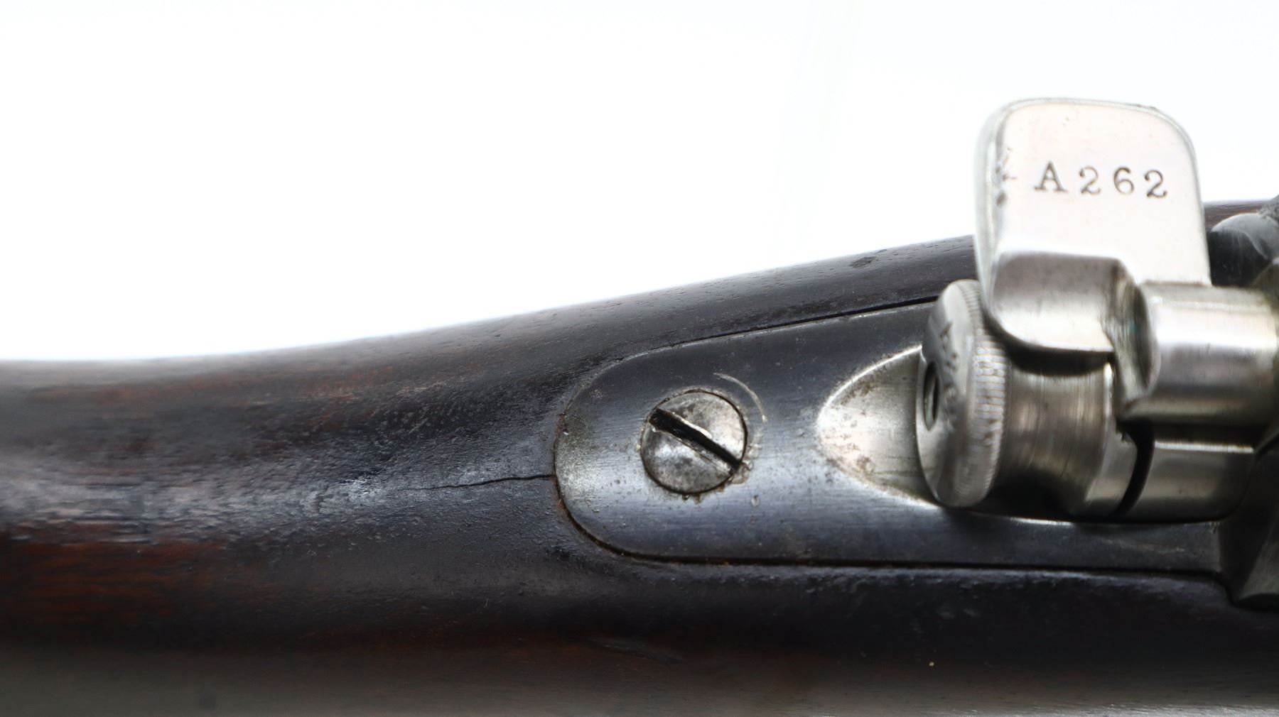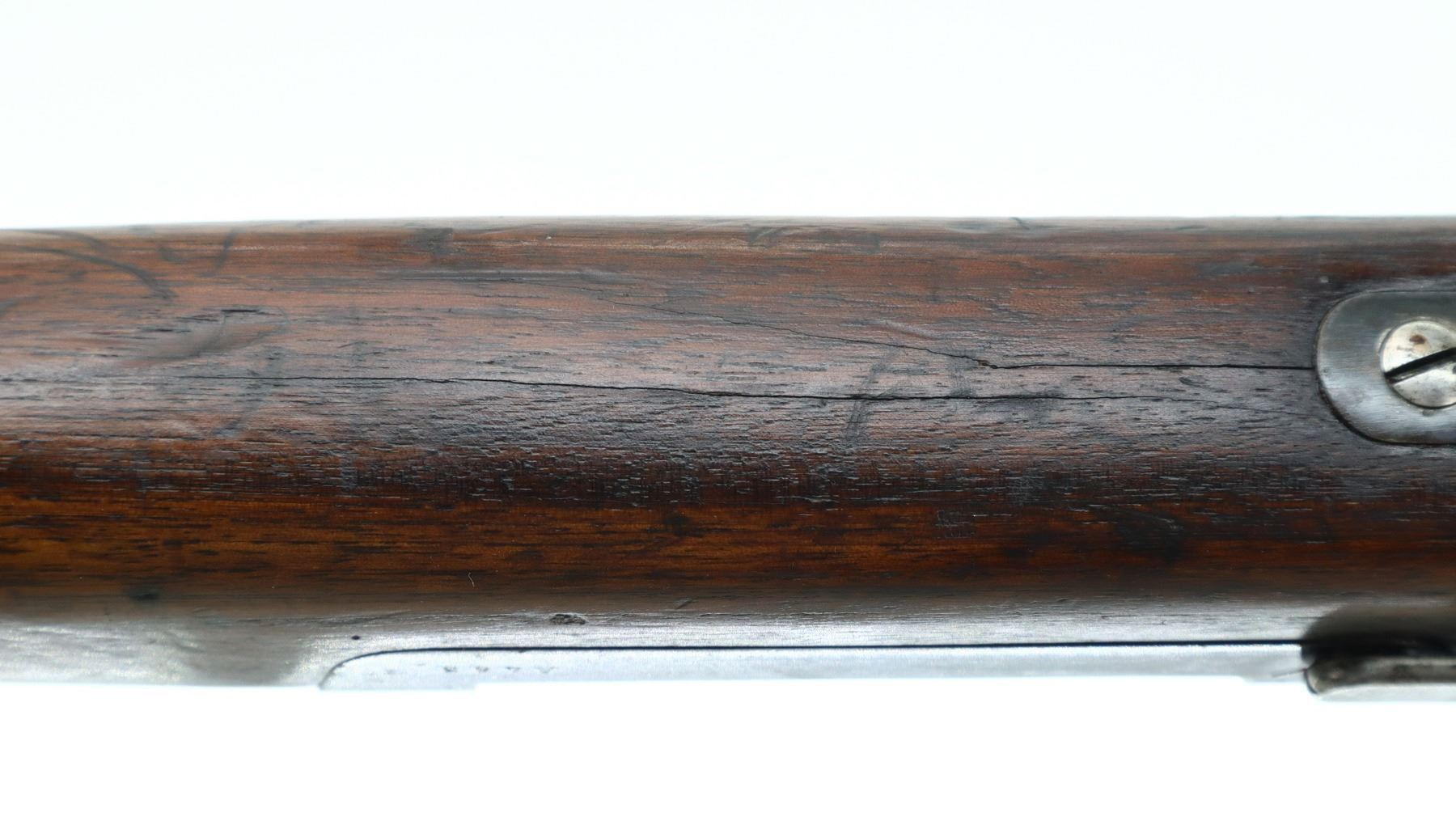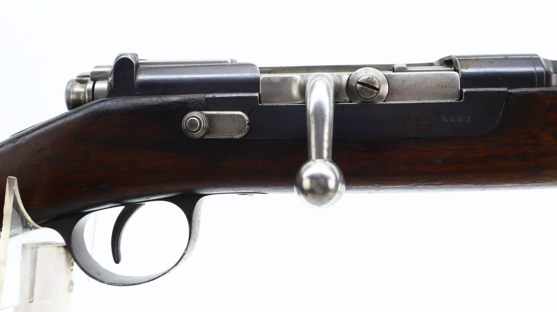6+/10, PORTUGUESE KROPATSCHEK , MODEL: 1886 CARBINE, CALIBER:8 X 60R, BORE IS FAIR, SLIGHT WEAR, LIGHT PITTING. MANUFACTURED BY STEYR 1886, BOLT MISMATCHED. BARLEY CORN FRONT SIGHT WITH RAMP, ADJUSTABLE U NOTCHED LADDER REAR SIGHT, SILVER BOLT WITH TURNED DOWN HANDLE. ONE PIECE FULL MILITARY WOOD STOCK, STRAIGHT GRIP, SMOOTH STEEL BUTT PLATE, STOCK CRACKED AT TOE, STEEL TRIGGER GUARD WITH FINGER REST, SLING SWIVELS, CLEANING ROD, BAYONET LUG. METAL FINISH SHOWS A FEW LIGHT RUST SPECKLES, SCRATCHES, HANDLING MARKS AND WEAR. STOCKS SHOW SOME MARKS, SCRATCHES AND WEAR. , ACTION: BOLT ACTION RIFLE, BARREL LENGTH: 20.25", SERIAL # A463, CONDITION: 6+/10, CLASS: CANADIAN NON RESTRICTED