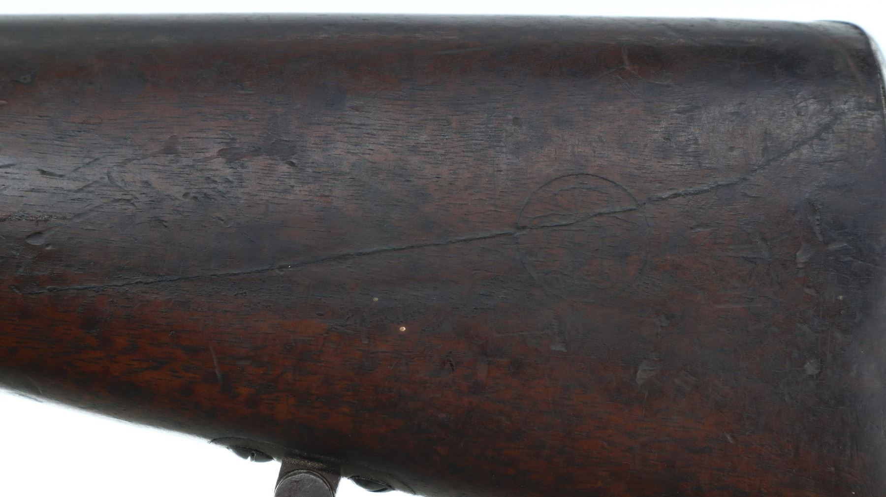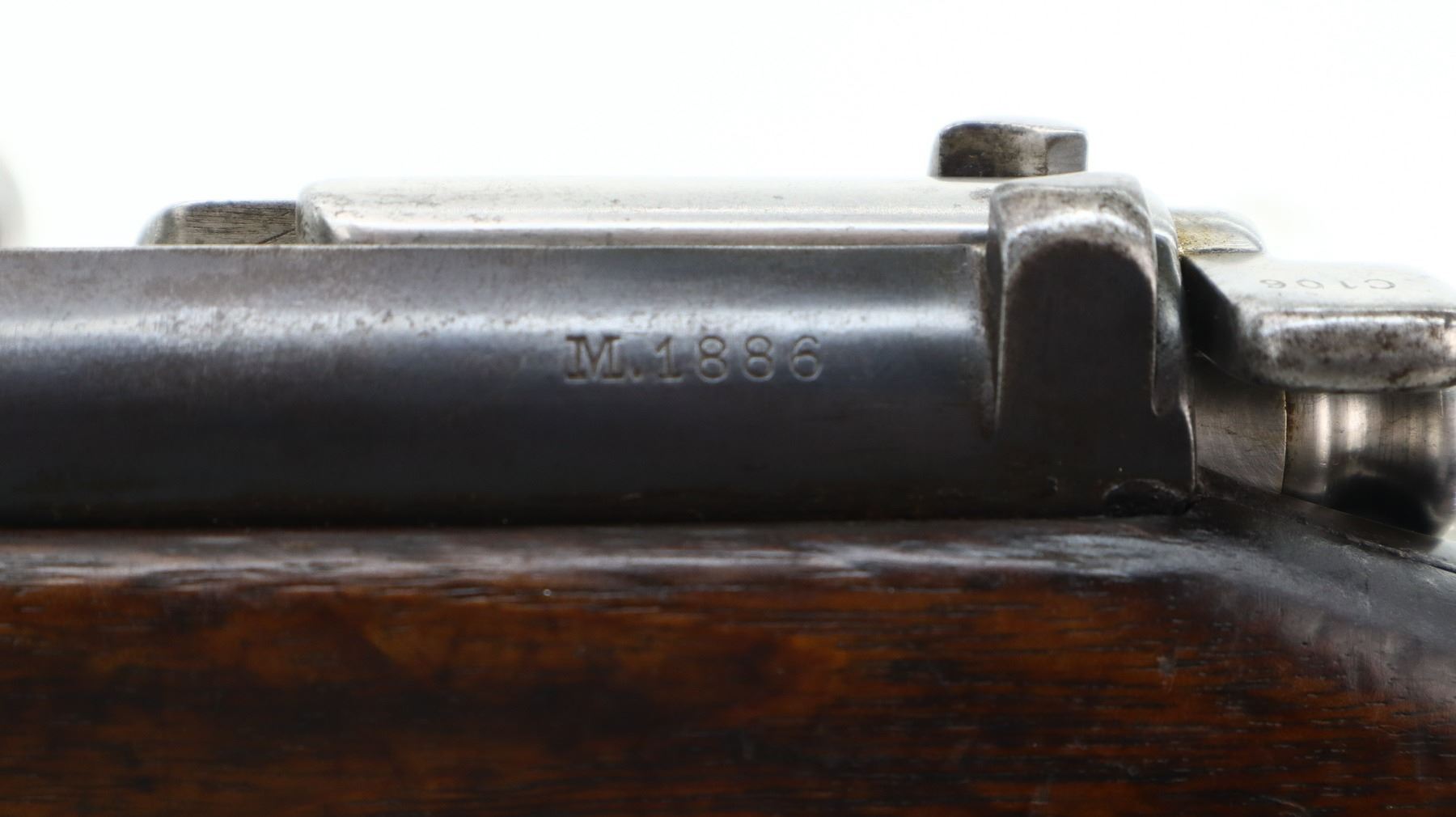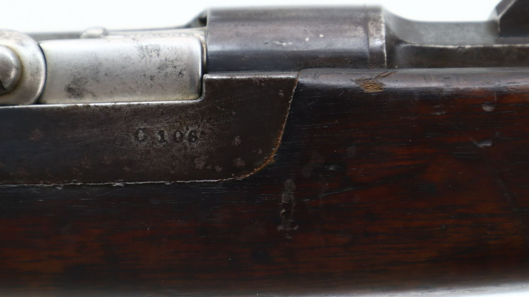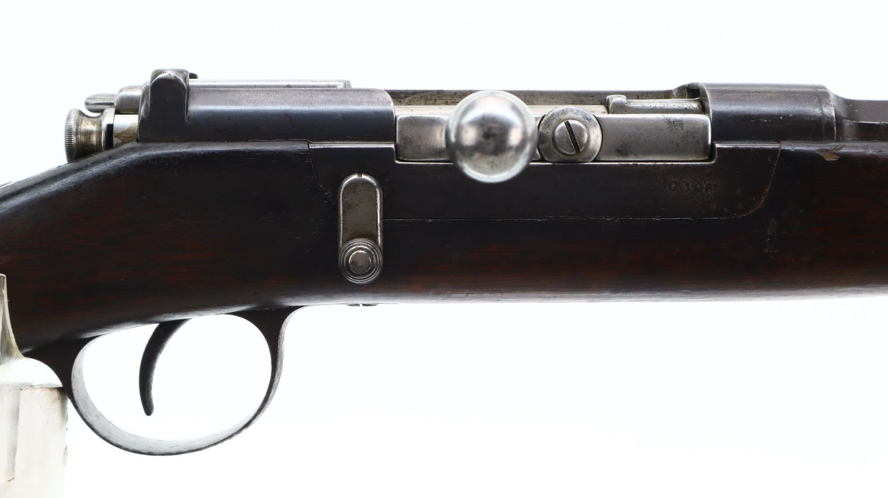 6+/10, PORTUGUESE KROPATSCHEK , MODEL: 1886 SHORT RIFLE, CALIBER:8 X 60R, BORE IS FAIR, WORN, LIGHT PITTING. MANUFACTURED BY STEYR 1886, VISIBLE NUMBERS MATCH. BARLEY CORN FRONT SIGHT WITH RAMP, ADJUSTABLE U NOTCHED LADDER REAR SIGHT, BLUED FINISH, SILVER BOLT WITH STRAIGHT HANDLE. ONE PIECE FULL MILITARY WOOD STOCK, STRAIGHT GRIP, SMOOTH STEEL BUTT PLATE, STEEL TRIGGER GUARD WITH FINGER REST, SWIVELS, CLEANING ROD, BAYONET LUG. METAL FINISH TURNING BROWN WITH LIGHT RUST SPECKLES, SCRATCHES, HANDLING MARKS AND WEAR. STOCK SHOWS SOME MARKS, SCRATCHES AND WEAR. , ACTION: BOLT ACTION RIFLE, BARREL LENGTH: 26", SERIAL # C106, CONDITION: 6+/10, CLASS: CANADIAN NON RESTRICTED