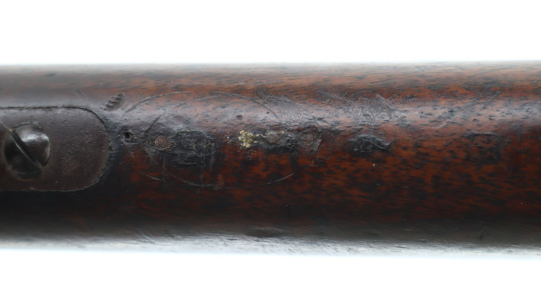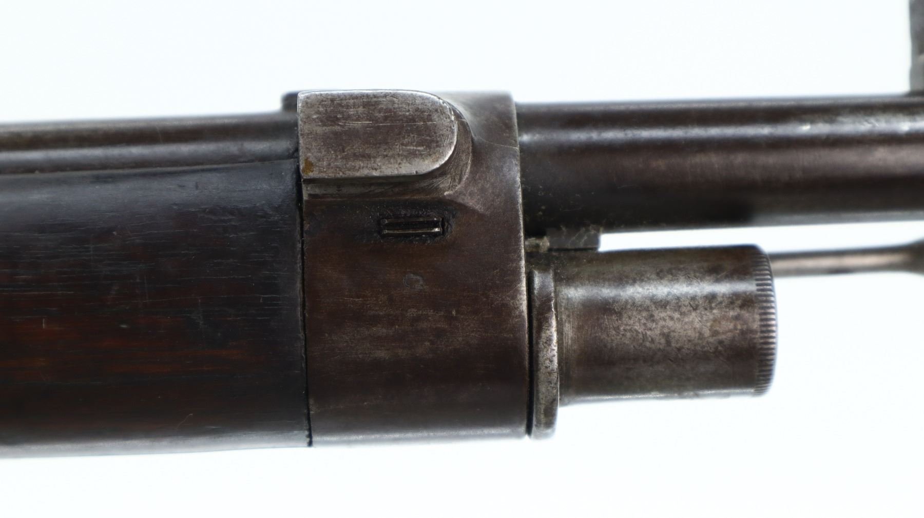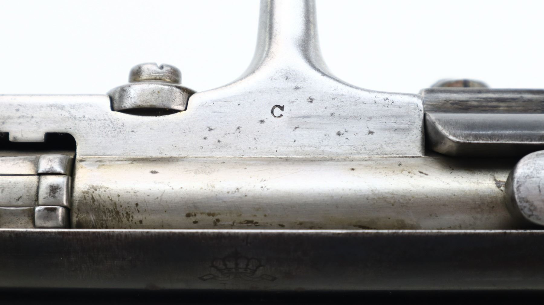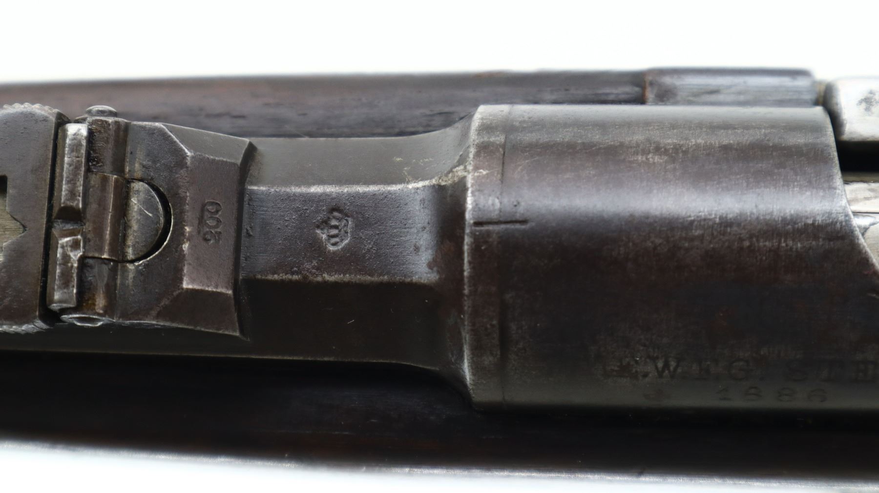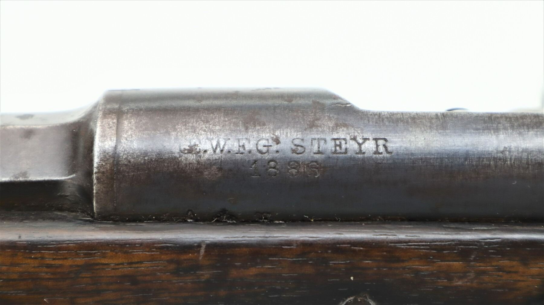 6+/10, PORTUGUESE KROPATSCHEK , MODEL: 1886 SHORT RIFLE, CALIBER:8 X 60R, BORE IS FAIR, WORN, LIGHT PITTING. MANUFACTURED BY STEYR 1886, VISIBLE NUMBERS MATCH. BARLEY CORN FRONT SIGHT WITH RAMP, ADJUSTABLE U NOTCHED LADDER REAR SIGHT, BLUED FINISH, SILVER BOLT WITH STRAIGHT HANDLE. ONE PIECE FULL MILITARY WOOD STOCK, STRAIGHT GRIP, SMOOTH STEEL BUTT PLATE, STEEL TRIGGER GUARD WITH FINGER REST, SWIVELS, CLEANING ROD, BAYONET LUG. METAL FINISH TURNING BROWN WITH LIGHT RUST SPECKLES, SCRATCHES, HANDLING MARKS AND WEAR. STOCK SHOWS SOME MARKS, SCRATCHES AND WEAR. , ACTION: BOLT ACTION RIFLE, BARREL LENGTH: 26", SERIAL # C106, CONDITION: 6+/10, CLASS: CANADIAN NON RESTRICTED