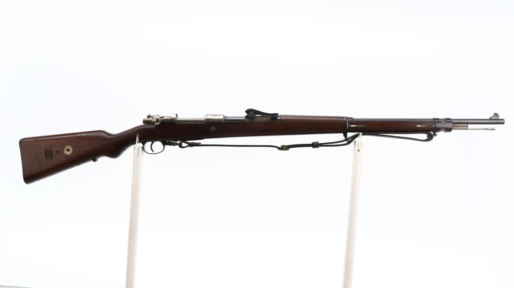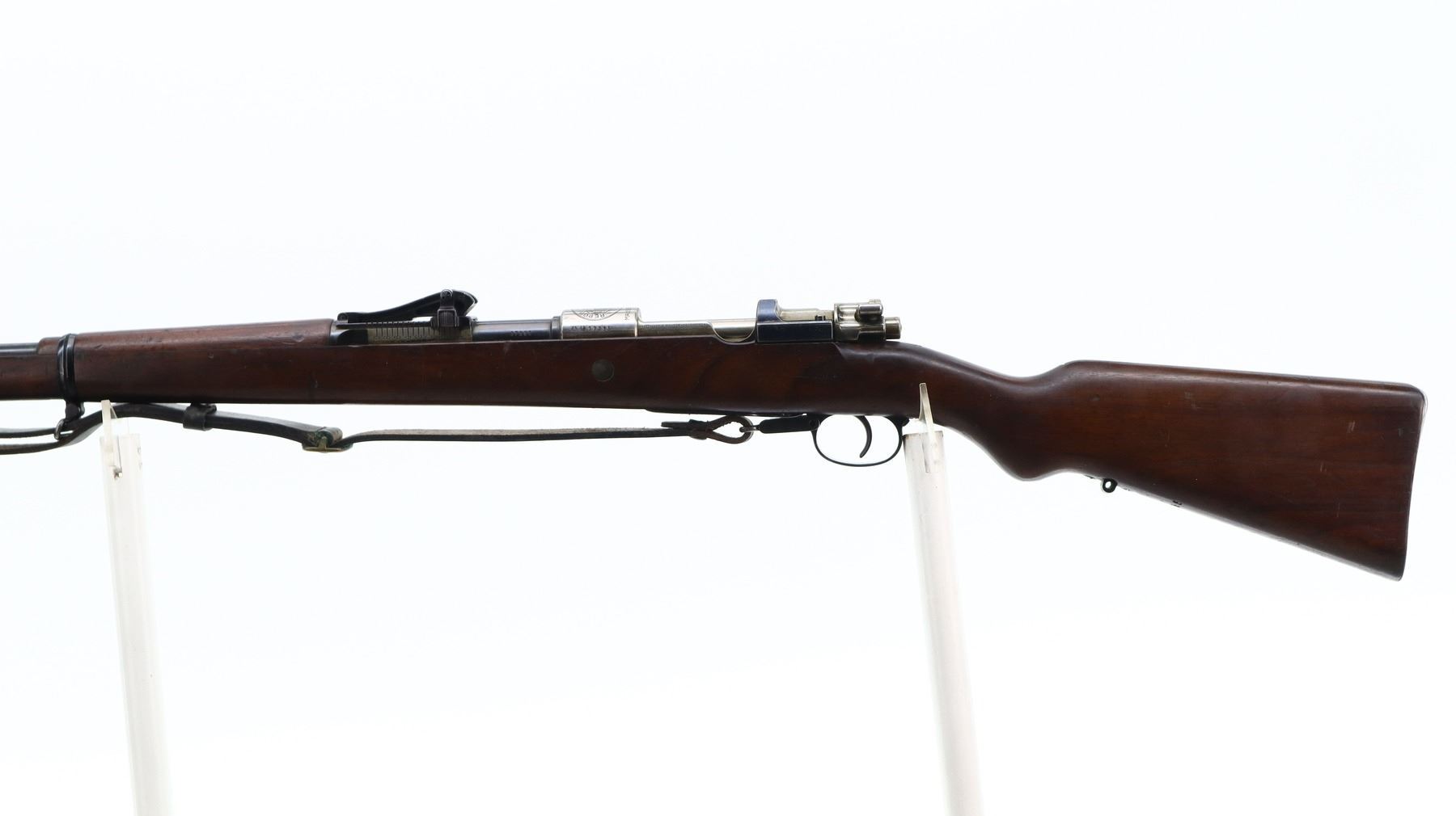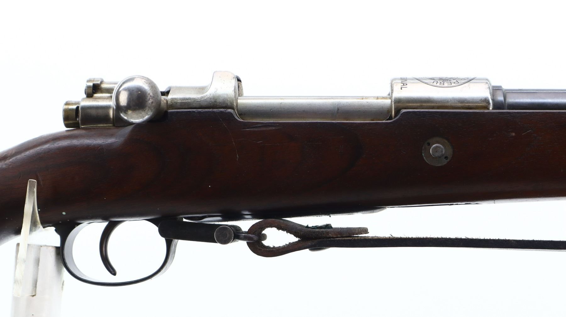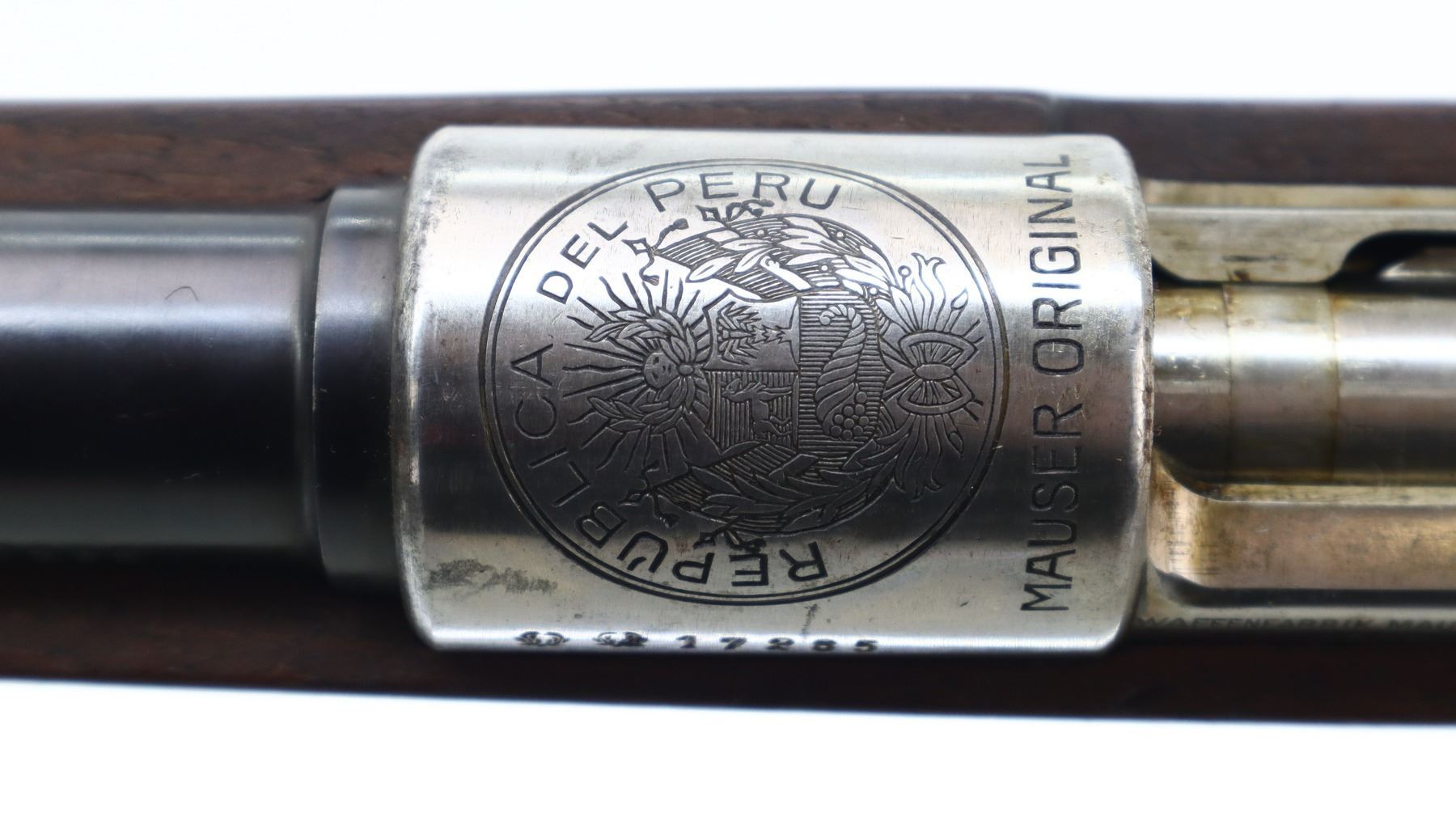 7/10, PERUVIAN MAUSER, MODEL: 1909, CALIBER:7.65 X 53, BORE IS VERY GOOD. MANUFACTURED BY MAUSER, VISIBLE NUMBERS MATCH. BARLEY CORN FRONT SIGHT WITH RAMP, ADJUSTABLE U NOTCHED LANGE REAR SIGHT, BLUED FINISH, SILVER RECEIVER WITH PERUVIAN CREST, STRAIGHT BOLT HANDLE. TWO PIECE FULL MILITARY WOOD STOCKS, PISTOL GRIP, SMOOTH STEEL BUTT PLATE, SLING SWIVELS WITH BLACK LEATHER MILITARY SLING, CLEANING ROD, BAYONET LUG. METAL FINISH SHOWS SOME SCRATCHES, HANDLING MARKS AND WEAR. STOCKS SHOW SOME MARKS, SCRATCHES AND WEAR. , ACTION: BOLT ACTION RIFLE, BARREL LENGTH: 29.25", SERIAL # 17285, CONDITION: 7/10, CLASS: CANADIAN NON RESTRICTED
