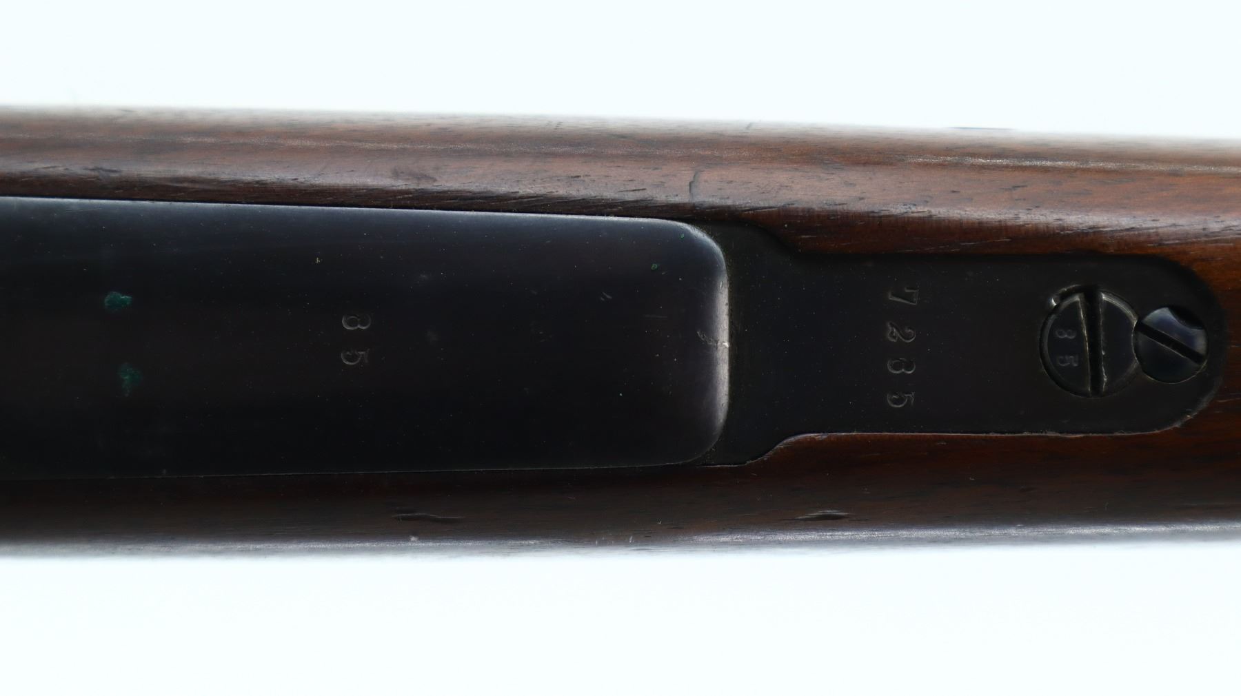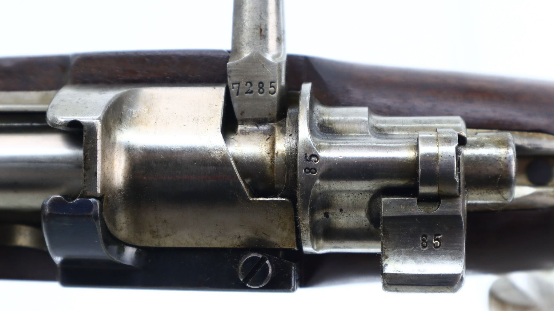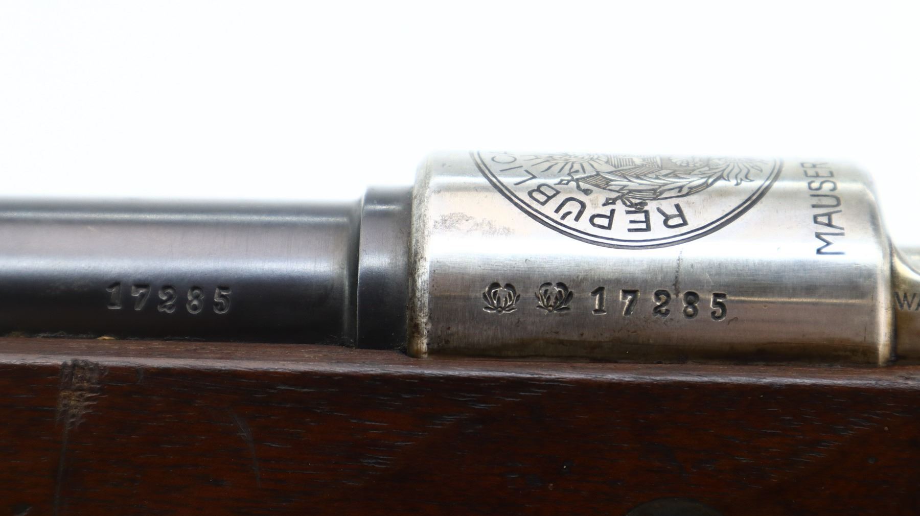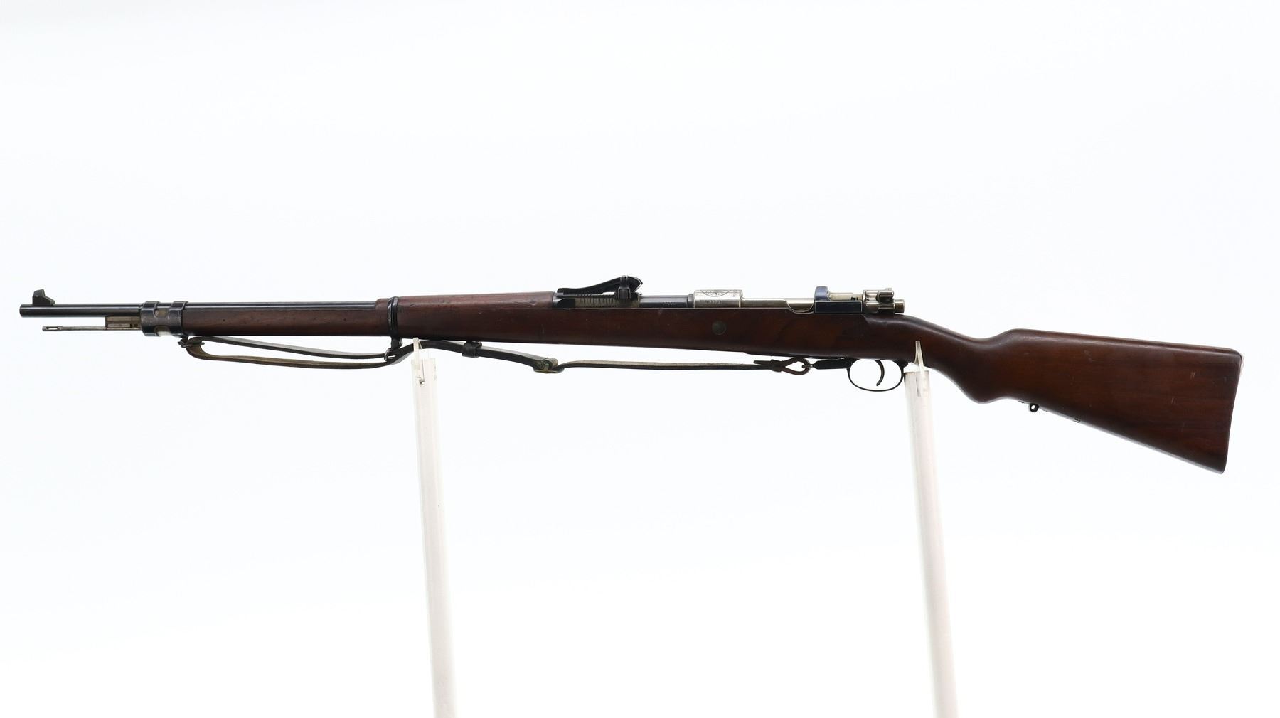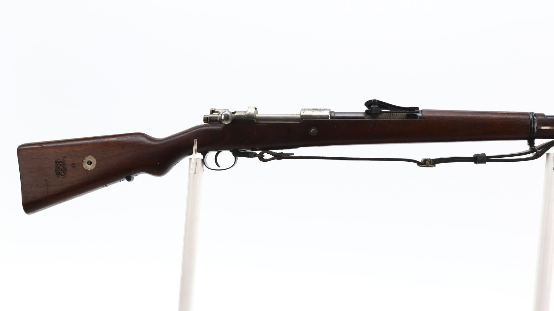 7/10, PERUVIAN MAUSER, MODEL: 1909, CALIBER:7.65 X 53, BORE IS VERY GOOD. MANUFACTURED BY MAUSER, VISIBLE NUMBERS MATCH. BARLEY CORN FRONT SIGHT WITH RAMP, ADJUSTABLE U NOTCHED LANGE REAR SIGHT, BLUED FINISH, SILVER RECEIVER WITH PERUVIAN CREST, STRAIGHT BOLT HANDLE. TWO PIECE FULL MILITARY WOOD STOCKS, PISTOL GRIP, SMOOTH STEEL BUTT PLATE, SLING SWIVELS WITH BLACK LEATHER MILITARY SLING, CLEANING ROD, BAYONET LUG. METAL FINISH SHOWS SOME SCRATCHES, HANDLING MARKS AND WEAR. STOCKS SHOW SOME MARKS, SCRATCHES AND WEAR. , ACTION: BOLT ACTION RIFLE, BARREL LENGTH: 29.25", SERIAL # 17285, CONDITION: 7/10, CLASS: CANADIAN NON RESTRICTED