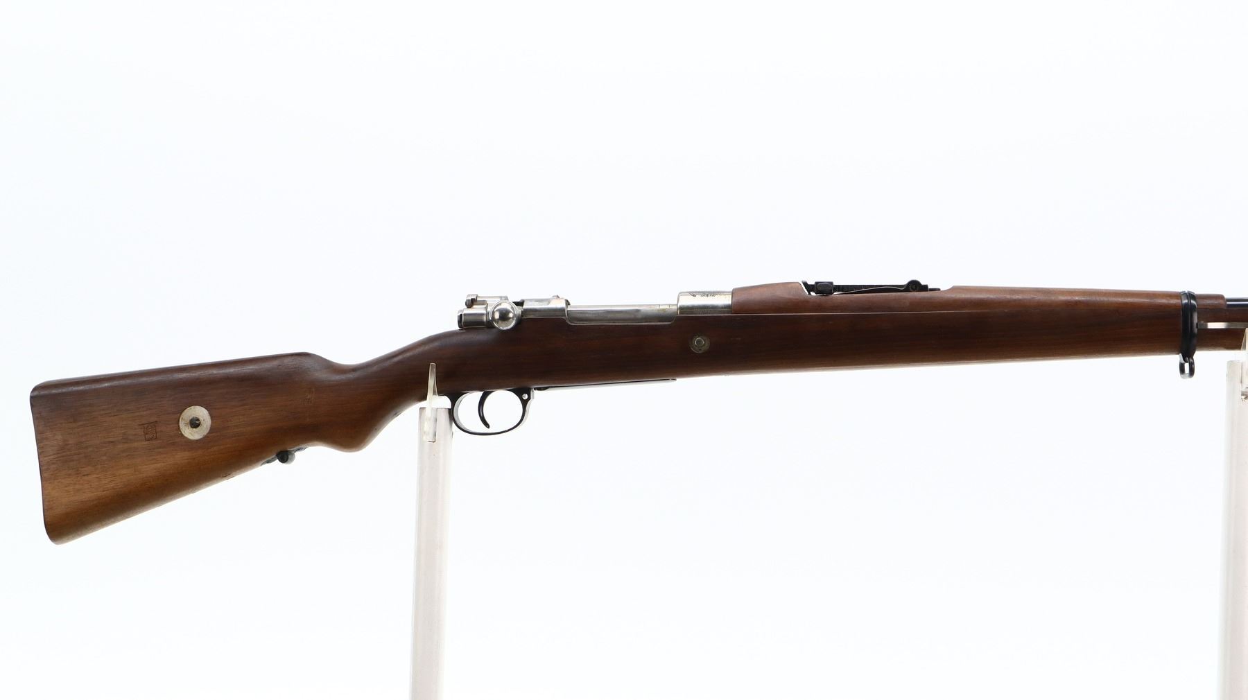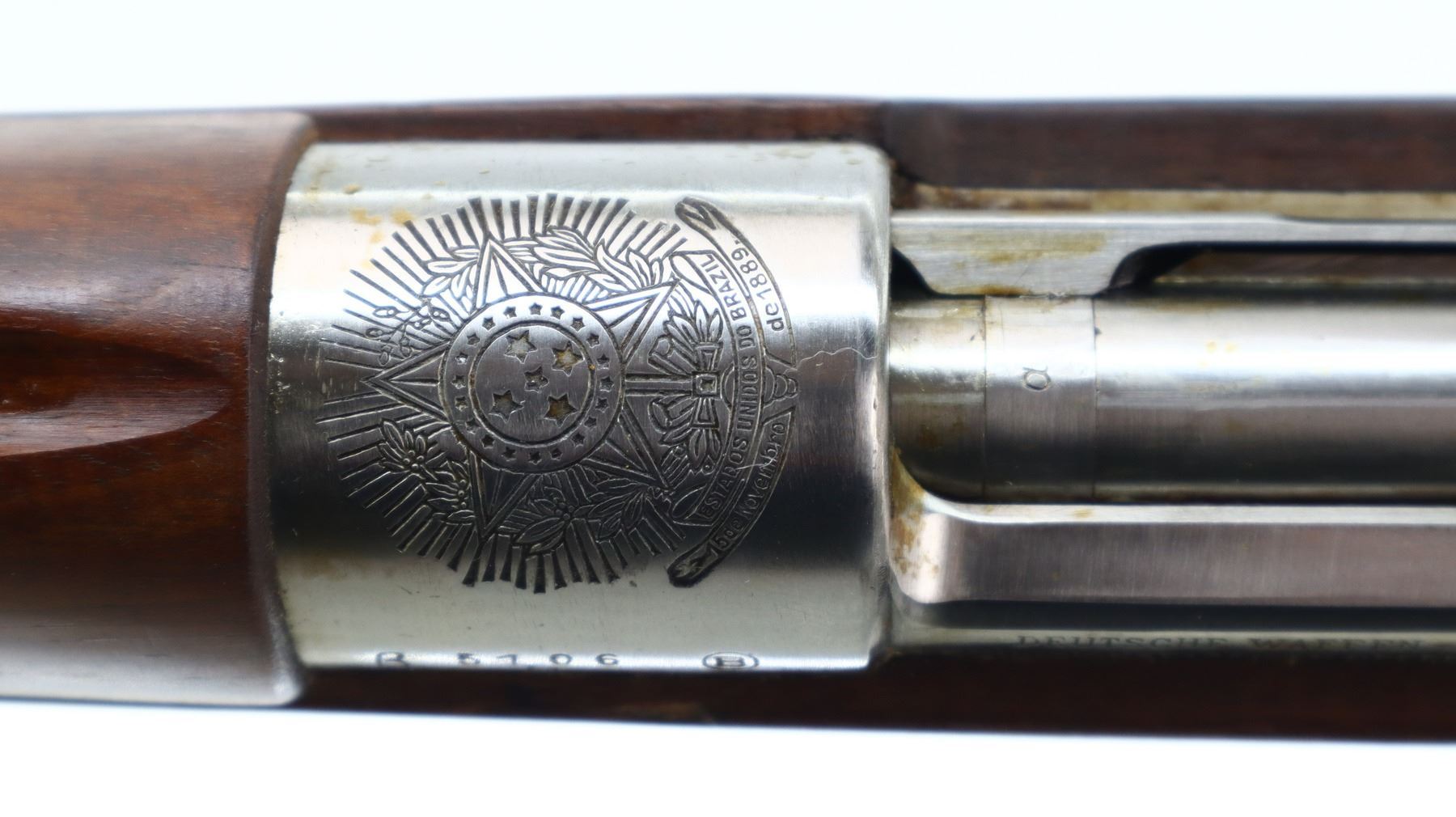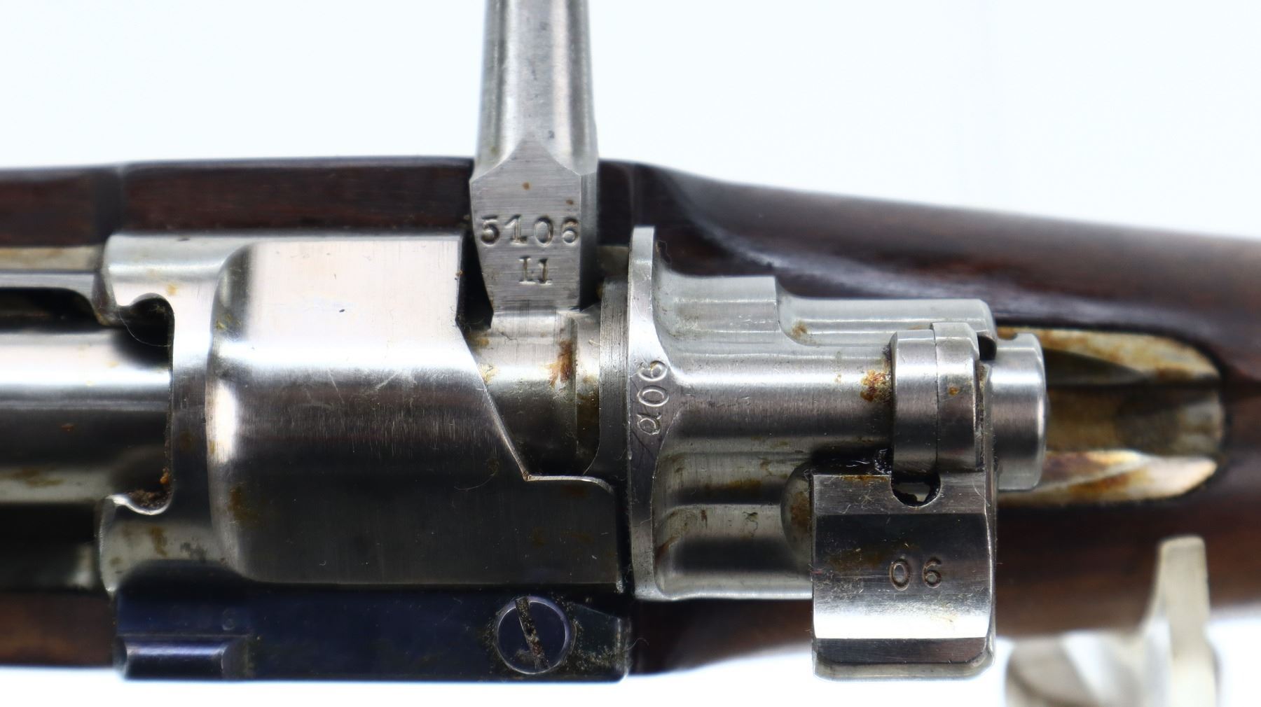 8/10, BRAZILIAN MAUSER, MODEL: 1908, CALIBER:7MM MAUSER, COMES WITH BROKEN MUZZLE COVER, BORE IS EXCELLENT. MANUFACTURED DWM, VISIBLE SERIAL NUMBERS MATCH. BARLEY CORN FRONT SIGHT WITH RAMP, ADJUSTABLE U NOTCHED REAR SIGHT, BLUED FINISH, SILVER RECEIVER WITH BRAZILIAN CREST, STRAIGHT BOLT HANDLE. TWO PIECE FULL MILITARY WOOD STOCKS, PISTOL GRIP, SMOOTH STEEL BUTT PLATE, SILVER STEEL STOCK DISK, REAR SWIVEL STUDS, FRONT SWIVEL, CLEANING ROD, BAYONET LUG. METAL FINISH SHOWS SOME SCRATCHES AND HANDLING MARKS. STOCKS SHOW SOME MARKS AND SCRATCHES. , ACTION: BOLT ACTION RIFLE, BARREL LENGTH: 29.25", SERIAL # B5106, CONDITION: 8/10, CLASS: CANADIAN NON RESTRICTED