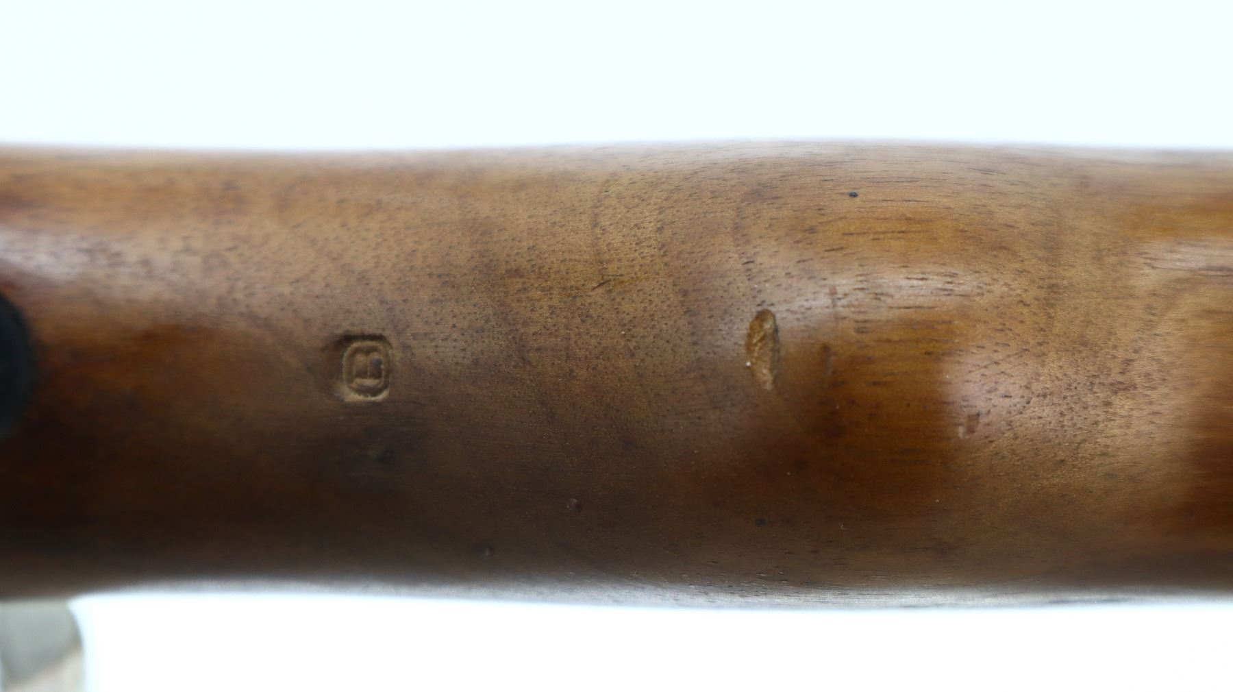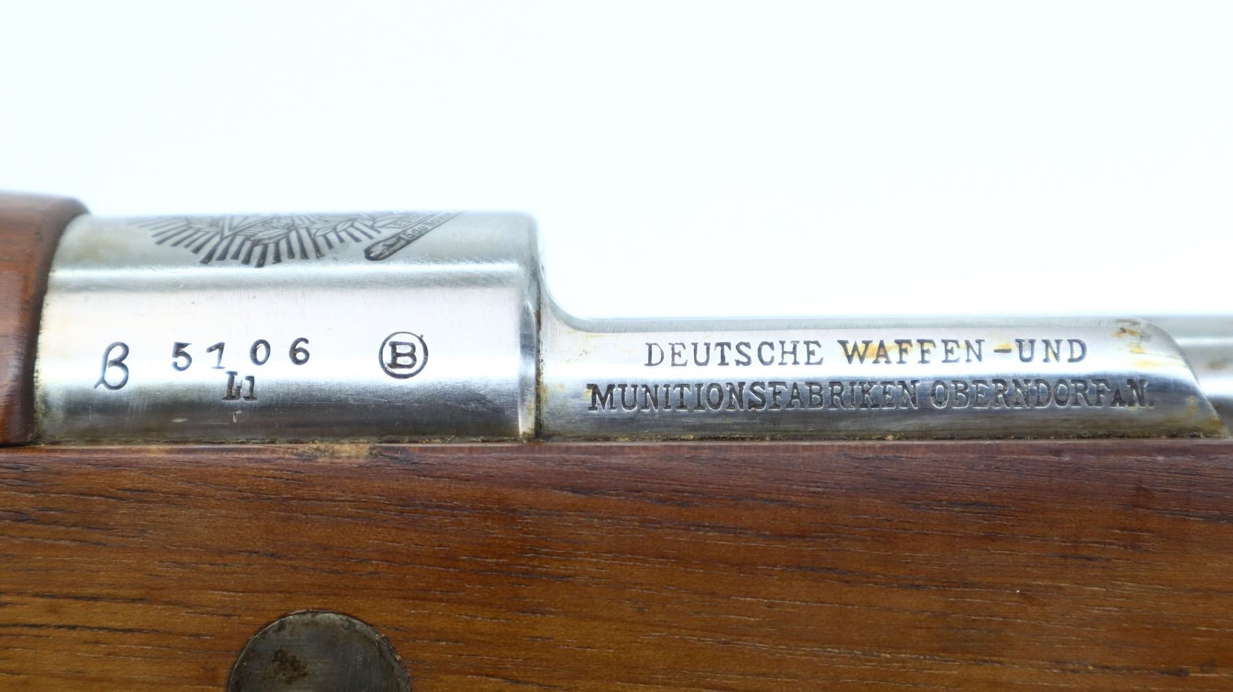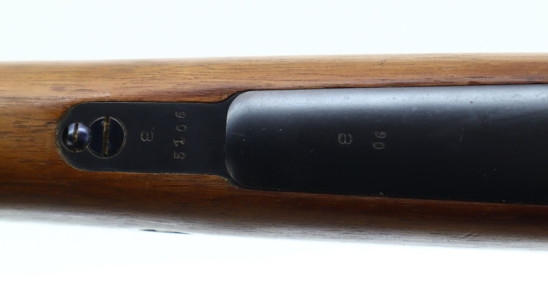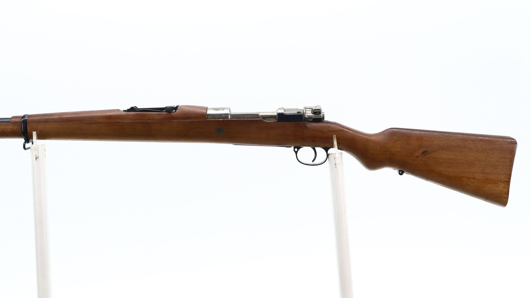 8/10, BRAZILIAN MAUSER, MODEL: 1908, CALIBER:7MM MAUSER, COMES WITH BROKEN MUZZLE COVER, BORE IS EXCELLENT. MANUFACTURED DWM, VISIBLE SERIAL NUMBERS MATCH. BARLEY CORN FRONT SIGHT WITH RAMP, ADJUSTABLE U NOTCHED REAR SIGHT, BLUED FINISH, SILVER RECEIVER WITH BRAZILIAN CREST, STRAIGHT BOLT HANDLE. TWO PIECE FULL MILITARY WOOD STOCKS, PISTOL GRIP, SMOOTH STEEL BUTT PLATE, SILVER STEEL STOCK DISK, REAR SWIVEL STUDS, FRONT SWIVEL, CLEANING ROD, BAYONET LUG. METAL FINISH SHOWS SOME SCRATCHES AND HANDLING MARKS. STOCKS SHOW SOME MARKS AND SCRATCHES. , ACTION: BOLT ACTION RIFLE, BARREL LENGTH: 29.25", SERIAL # B5106, CONDITION: 8/10, CLASS: CANADIAN NON RESTRICTED