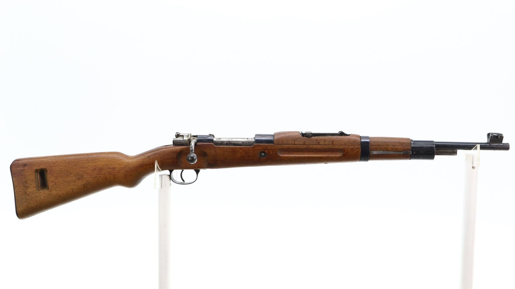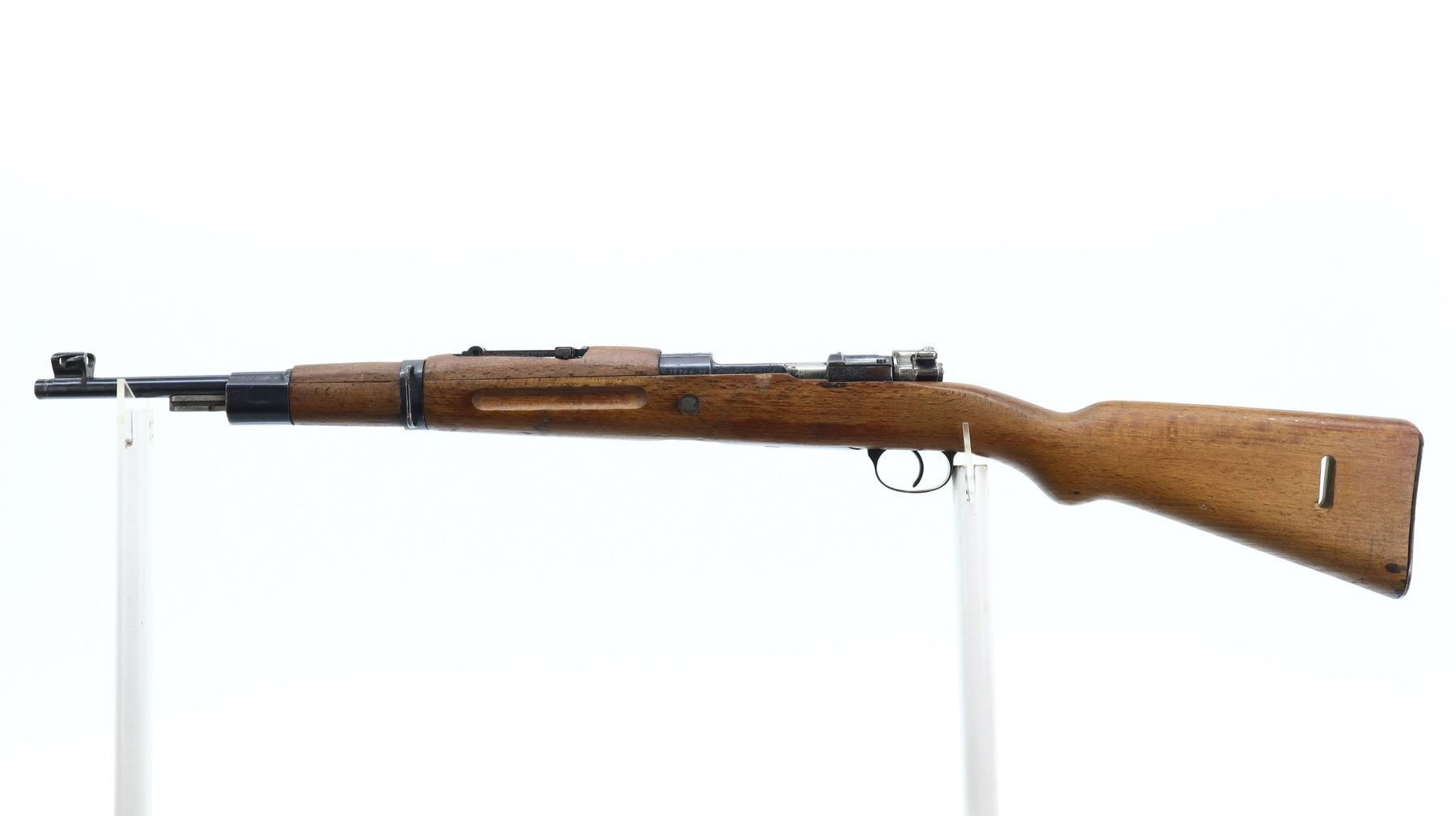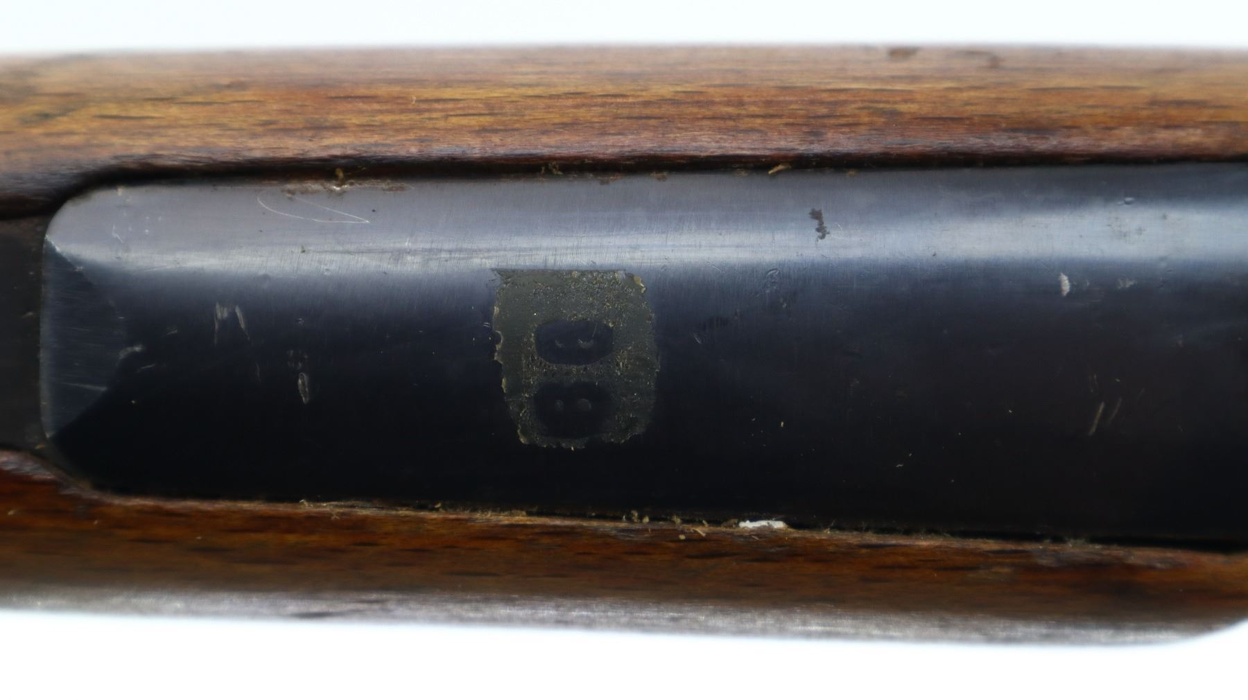 6+/10, PERSIAN MAUSER, MODEL: 49 CARBINE, CALIBER:8MM MAUSER, BORE IS VERY GOOD. BARLEY CORN FRONT SIGHT WITH EARS AND RAMP, ADJUSTABLE U NOTCHED REAR SIGHT WITH ARABIC NUMBERS, BLUED FINISH, SILVER BOLT WITH TURNED DOWN HANDLE. TWO PIECE FULL MILITARY WOOD STOCKS, FINGER GROOVED FOREND, PISTOL GRIP, SMOOTH STEEL BUTT PLATE, REAR SLOT FRONT SWIVEL, MISSING CLEANING ROD, HAS BAYONET LUG. METAL FINISH SHOWS SOME PITTING IN SOME SPOTS, SCRATCHES, HANDLING MARKS AND WEAR. STOCKS SHOW SOME MARKS AND SCRATCHES. , ACTION: BOLT ACTION RIFLE, BARREL LENGTH: 18", SERIAL # IN FARSI, CONDITION: 6+/10, CLASS: CANADIAN NON RESTRICTED