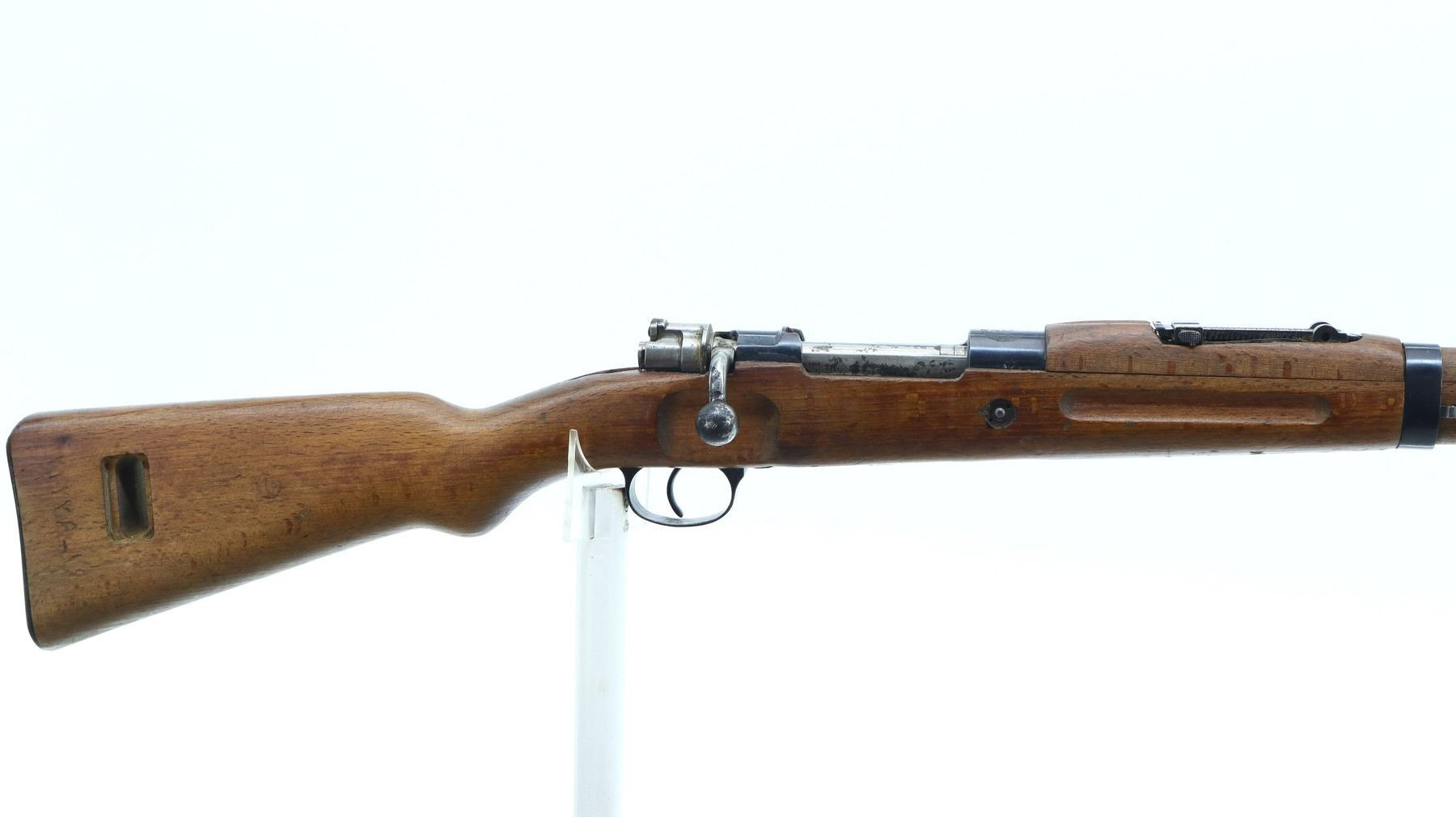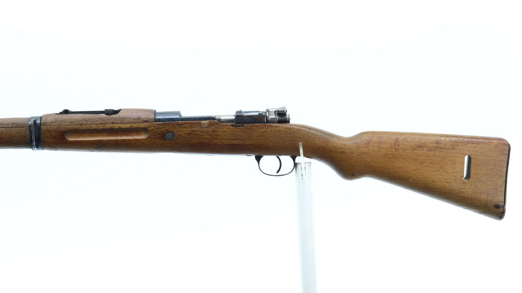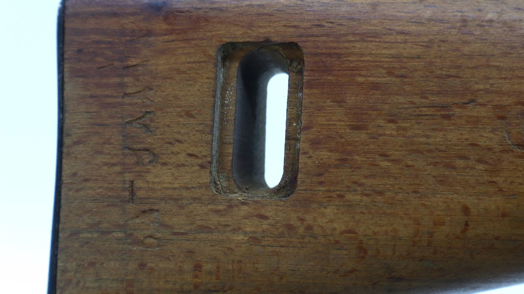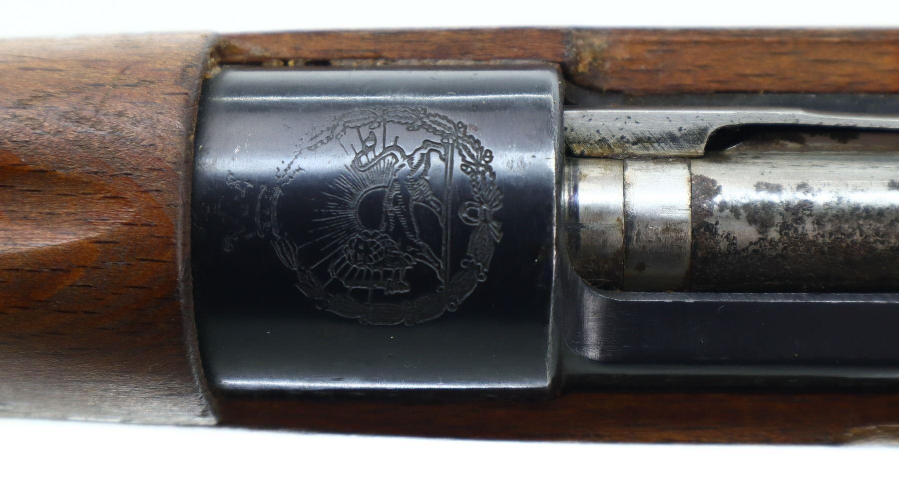6+/10, PERSIAN MAUSER, MODEL: 49 CARBINE, CALIBER:8MM MAUSER, BORE IS VERY GOOD. BARLEY CORN FRONT SIGHT WITH EARS AND RAMP, ADJUSTABLE U NOTCHED REAR SIGHT WITH ARABIC NUMBERS, BLUED FINISH, SILVER BOLT WITH TURNED DOWN HANDLE. TWO PIECE FULL MILITARY WOOD STOCKS, FINGER GROOVED FOREND, PISTOL GRIP, SMOOTH STEEL BUTT PLATE, REAR SLOT FRONT SWIVEL, MISSING CLEANING ROD, HAS BAYONET LUG. METAL FINISH SHOWS SOME PITTING IN SOME SPOTS, SCRATCHES, HANDLING MARKS AND WEAR. STOCKS SHOW SOME MARKS AND SCRATCHES. , ACTION: BOLT ACTION RIFLE, BARREL LENGTH: 18", SERIAL # IN FARSI, CONDITION: 6+/10, CLASS: CANADIAN NON RESTRICTED