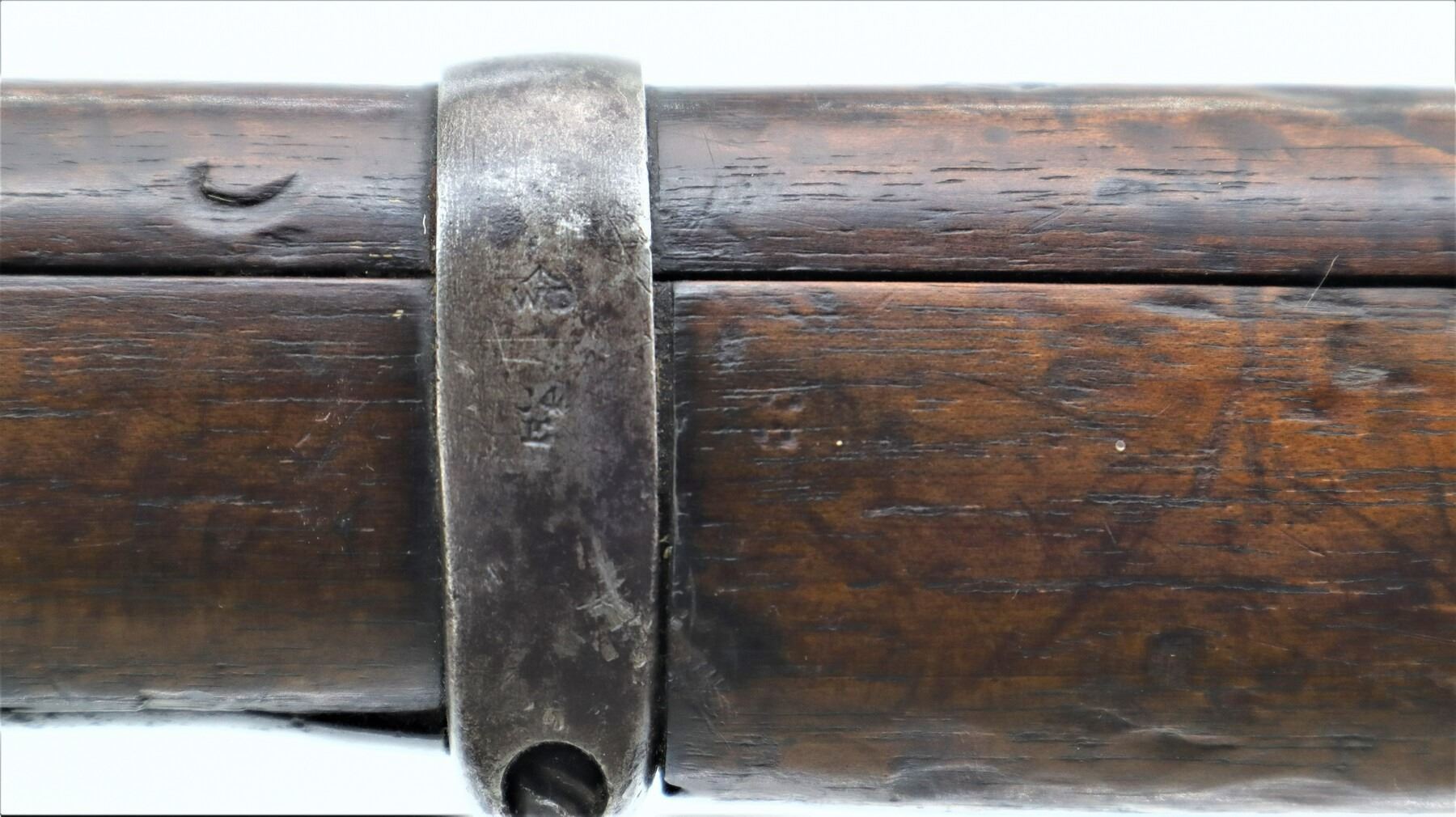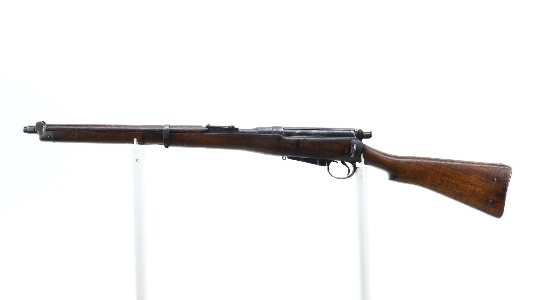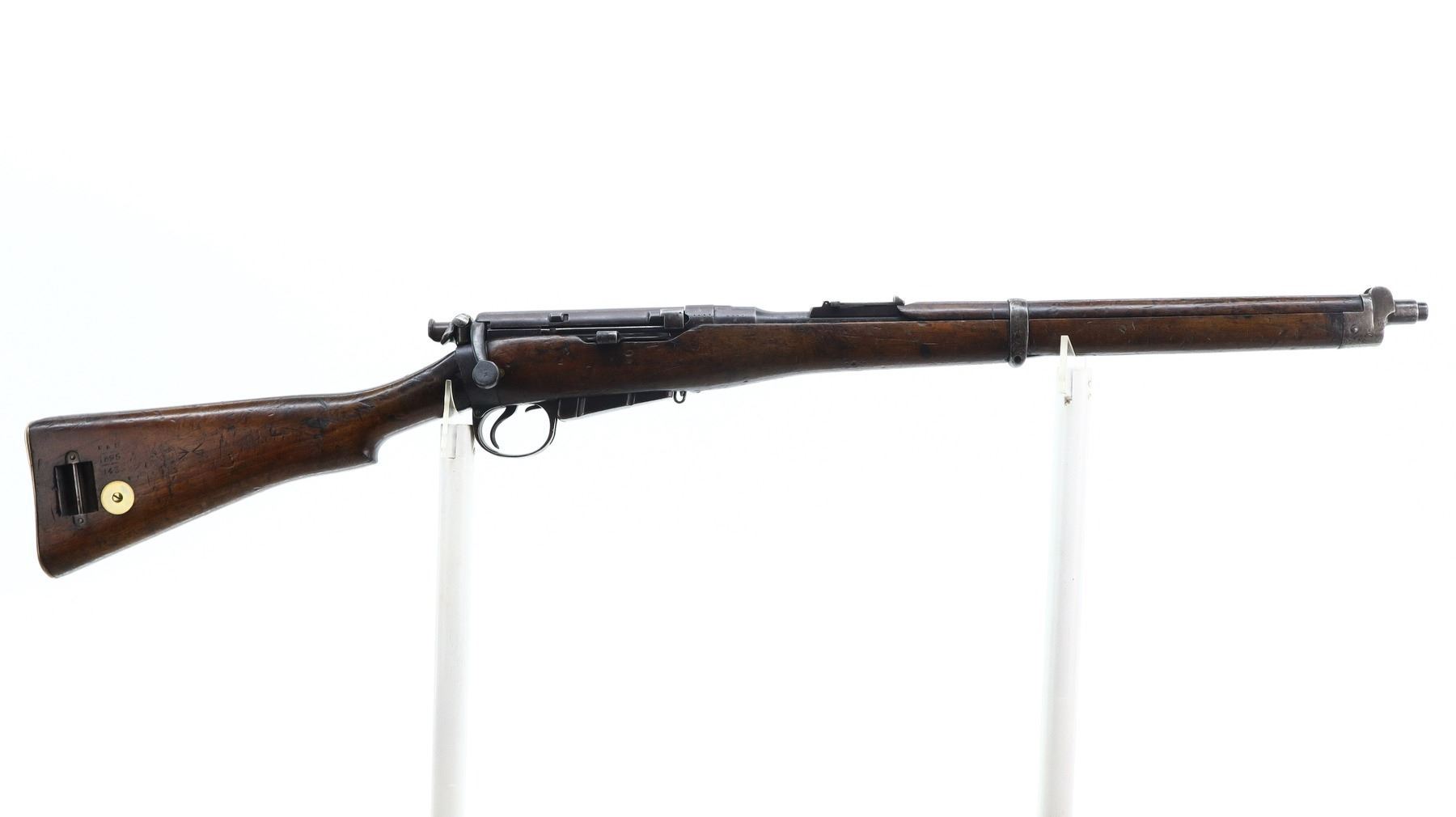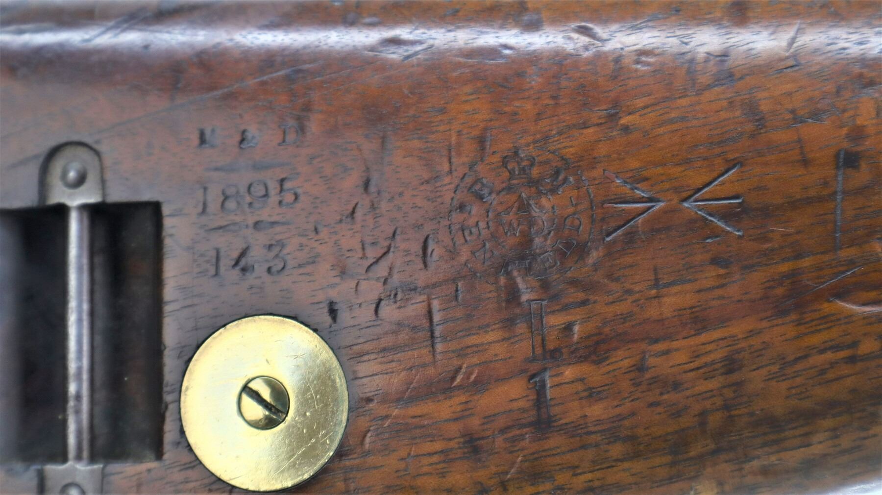 6+/10, CANADIAN LEE METFORD, MODEL: MKI CARBINE, CALIBER:303 BR, COMES WITH MAGAZINE, BORE IS POOR, WORN, PITTED. MANUFACTURED BY ENFIELD 1895, BOLT UNNUMBERED. BLADE FRONT SIGHT WITH RAMP AND EARS, ADJUSTABLE U NOTCHED REAR SIGHT, BARREL AND RECEIVER HAVE DOUBLE BROAD ARROWS INDICATING SOLD FROM STORES, DUST COVER, MAGAZINE CUT OFF, TURNED DOWN HANDLE WITH FLAT KNOB, SAFETY ON COCKING PIECE. LEFT SIDE OF BUTT SOCKET RETAINS ORIGINAL "D" RING. THREE PIECE FULL MILITARY WOOD STOCKS, PISTOL GRIP, SMOOTH BRASS BUTT PLATE WITH TRAP, BLANK BRASS STOCK DISK, RIGHT SIDE OF STOCK HAS ENFIELD ROUNDEL SOLD FROM STORES MARKS M&D INDICATING CANADIAN MILITIA AND DEFENCE, 1895 143. REAR SLING SWIVEL ONLY, CORRECT CARBINE MAGAZINE WITH RETAINING LINK. METAL FINISH SHOWS SOME PITTING, SCRATCHES, HANDLING MARKS AND WEAR. STOCKS SHOW SOME MARKS, SCRATCHES AND WEAR. , ACTION: BOLT ACTION RIFLE, BARREL LENGTH: 21", SERIAL # 4449A, CONDITION: 6+/10, CLASS: CANADIAN NON RESTRICTED