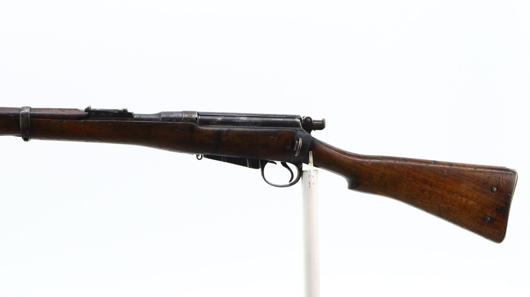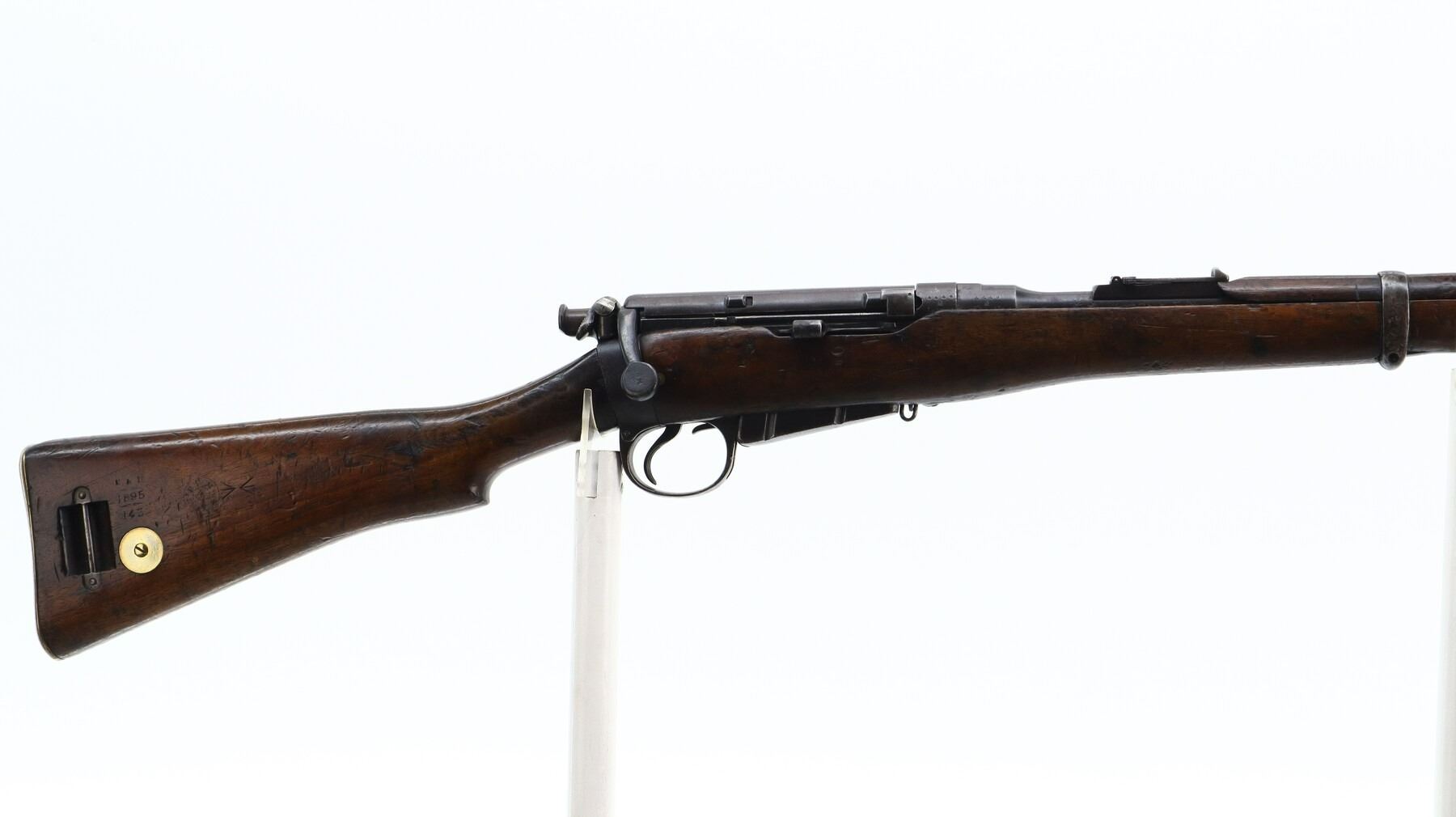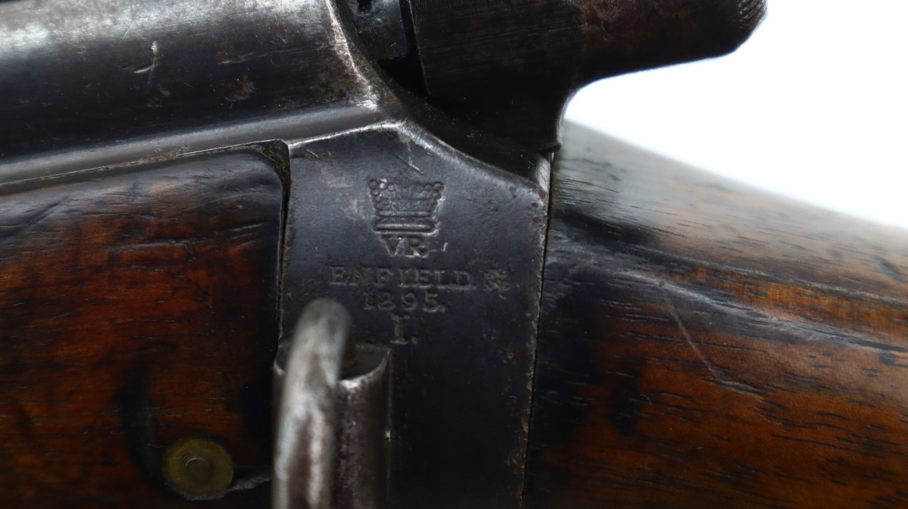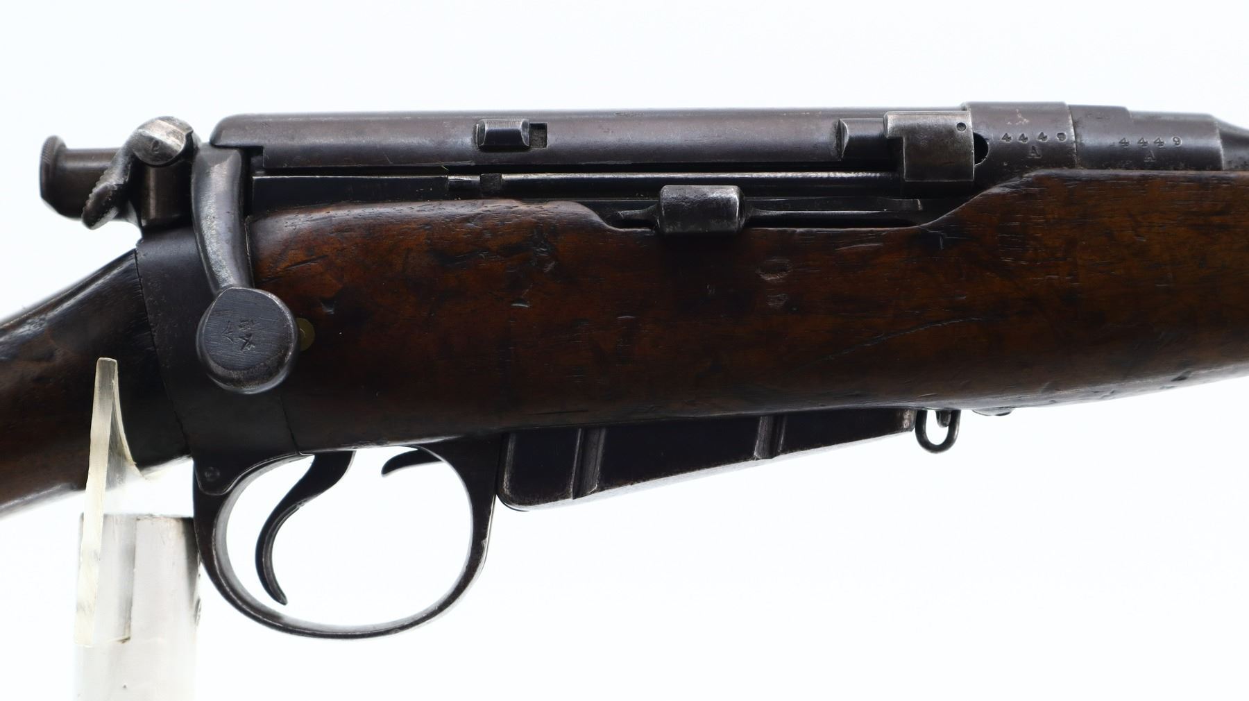 6+/10, CANADIAN LEE METFORD, MODEL: MKI CARBINE, CALIBER:303 BR, COMES WITH MAGAZINE, BORE IS POOR, WORN, PITTED. MANUFACTURED BY ENFIELD 1895, BOLT UNNUMBERED. BLADE FRONT SIGHT WITH RAMP AND EARS, ADJUSTABLE U NOTCHED REAR SIGHT, BARREL AND RECEIVER HAVE DOUBLE BROAD ARROWS INDICATING SOLD FROM STORES, DUST COVER, MAGAZINE CUT OFF, TURNED DOWN HANDLE WITH FLAT KNOB, SAFETY ON COCKING PIECE. LEFT SIDE OF BUTT SOCKET RETAINS ORIGINAL "D" RING. THREE PIECE FULL MILITARY WOOD STOCKS, PISTOL GRIP, SMOOTH BRASS BUTT PLATE WITH TRAP, BLANK BRASS STOCK DISK, RIGHT SIDE OF STOCK HAS ENFIELD ROUNDEL SOLD FROM STORES MARKS M&D INDICATING CANADIAN MILITIA AND DEFENCE, 1895 143. REAR SLING SWIVEL ONLY, CORRECT CARBINE MAGAZINE WITH RETAINING LINK. METAL FINISH SHOWS SOME PITTING, SCRATCHES, HANDLING MARKS AND WEAR. STOCKS SHOW SOME MARKS, SCRATCHES AND WEAR. , ACTION: BOLT ACTION RIFLE, BARREL LENGTH: 21", SERIAL # 4449A, CONDITION: 6+/10, CLASS: CANADIAN NON RESTRICTED