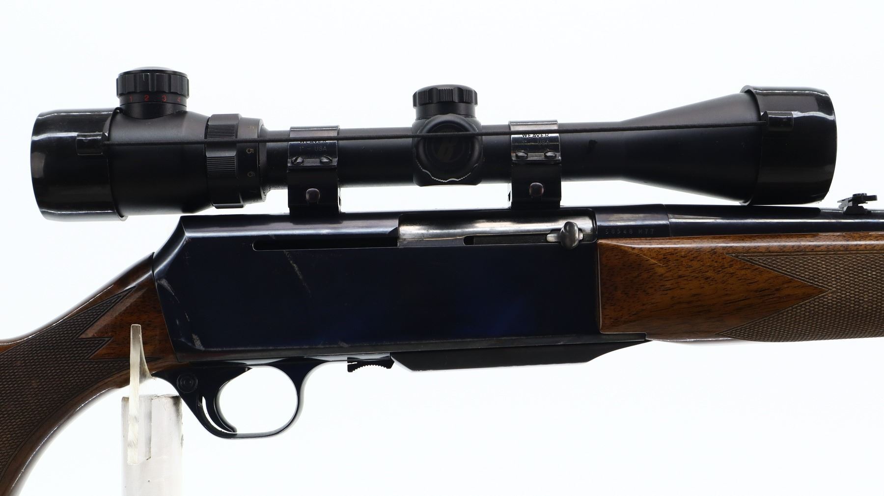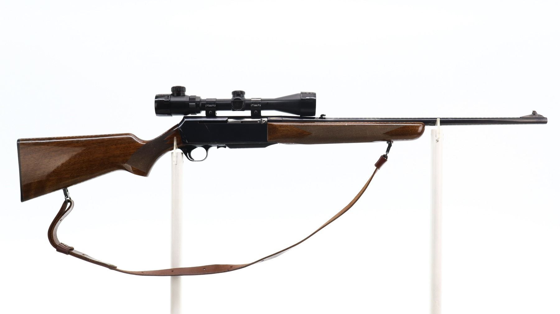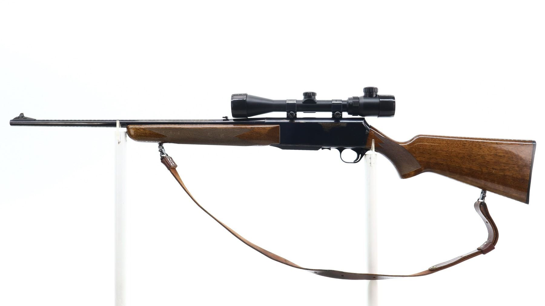 6+/10, BROWNING, MODEL: BAR, CALIBER:30-06 SPRG, DOES NOT COME WITH MAGAZINE, BORE IS GOOD. BLADE FRONT SIGHT WITH RAMP, ADJUSTABLE FOLDING U NOTCHED REAR SIGHT, BLUED FINISH, RECEIVER DRILLED AND TAPPED WITH BUSHNELL 3-9 X 40 SCOPE, CLEAR OPTICS WITH ILLUMINATED RETICLE (NOT TESTED). TWO PIECE WOOD STOCKS, CHECKERED FOREARM AND PISTOL GRIP, TEXTURED BLACK POLYMER BUTT PLATE, SLING SWIVELS WITH BROWN LEATHER SLING. METAL FINISH SHOWS SOME LIGHT PITTED SPOTS, SCRATCHES, HANDLING MARKS AND WEAR. STOCKS SHOW SOME MARKS, SCRATCHES AND WEAR. , ACTION: SEMI AUTOMATIC RIFLE, BARREL LENGTH: 22", SERIAL # 58548M77, CONDITION: 6+/10, CLASS: CANADIAN NON RESTRICTED