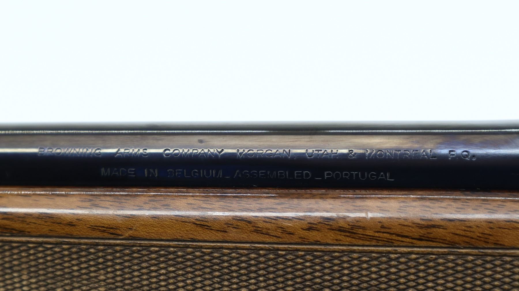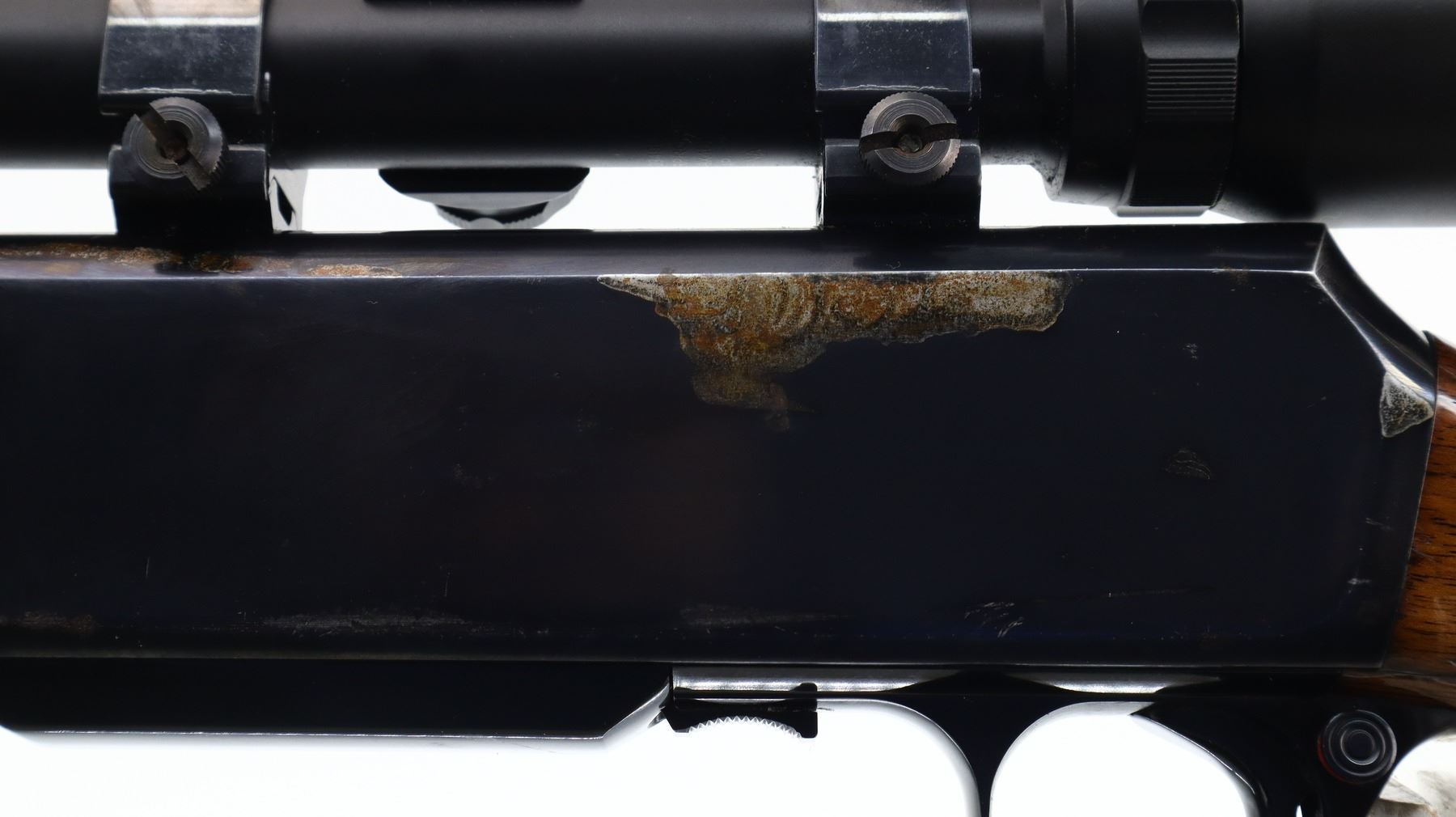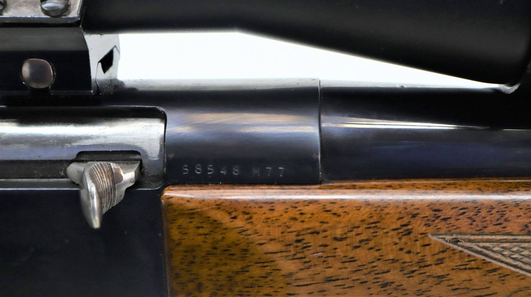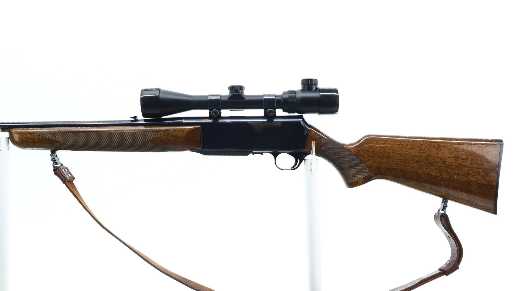 6+/10, BROWNING, MODEL: BAR, CALIBER:30-06 SPRG, DOES NOT COME WITH MAGAZINE, BORE IS GOOD. BLADE FRONT SIGHT WITH RAMP, ADJUSTABLE FOLDING U NOTCHED REAR SIGHT, BLUED FINISH, RECEIVER DRILLED AND TAPPED WITH BUSHNELL 3-9 X 40 SCOPE, CLEAR OPTICS WITH ILLUMINATED RETICLE (NOT TESTED). TWO PIECE WOOD STOCKS, CHECKERED FOREARM AND PISTOL GRIP, TEXTURED BLACK POLYMER BUTT PLATE, SLING SWIVELS WITH BROWN LEATHER SLING. METAL FINISH SHOWS SOME LIGHT PITTED SPOTS, SCRATCHES, HANDLING MARKS AND WEAR. STOCKS SHOW SOME MARKS, SCRATCHES AND WEAR. , ACTION: SEMI AUTOMATIC RIFLE, BARREL LENGTH: 22", SERIAL # 58548M77, CONDITION: 6+/10, CLASS: CANADIAN NON RESTRICTED