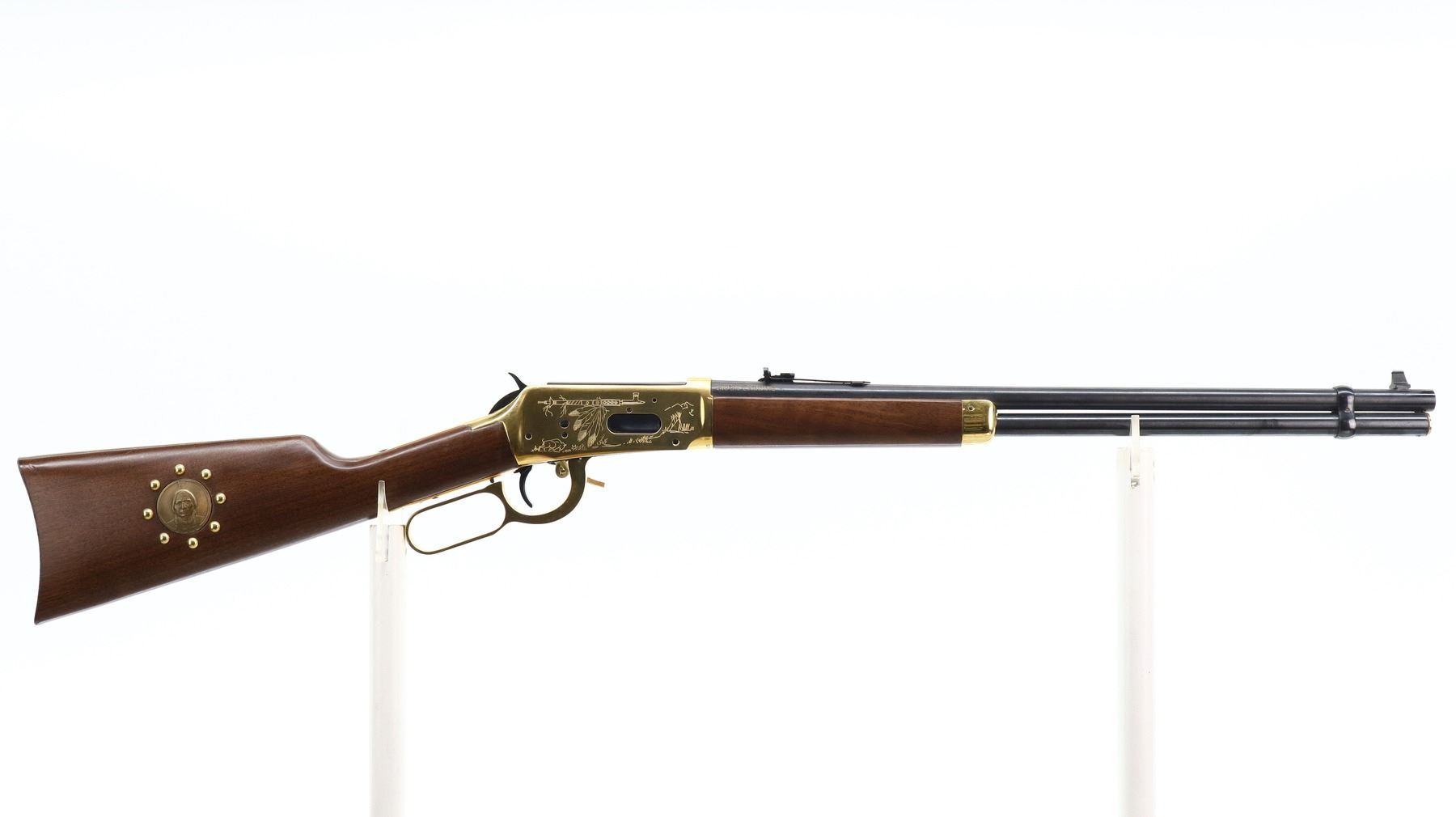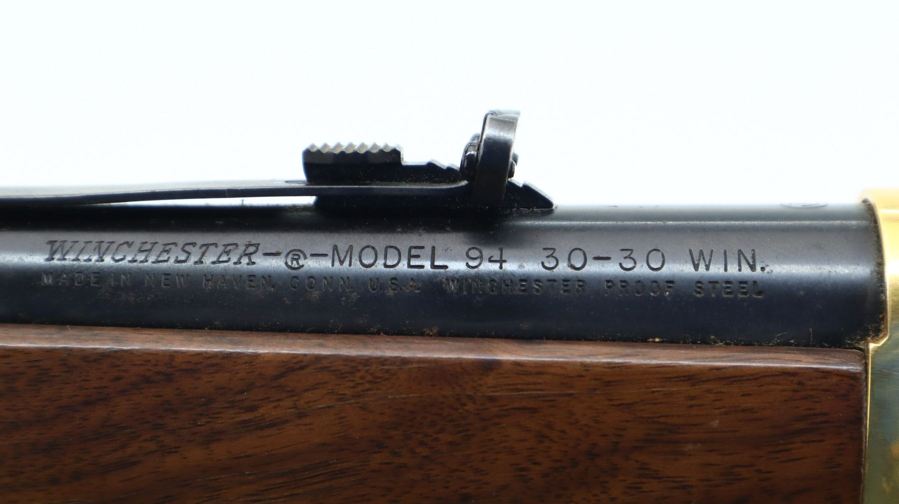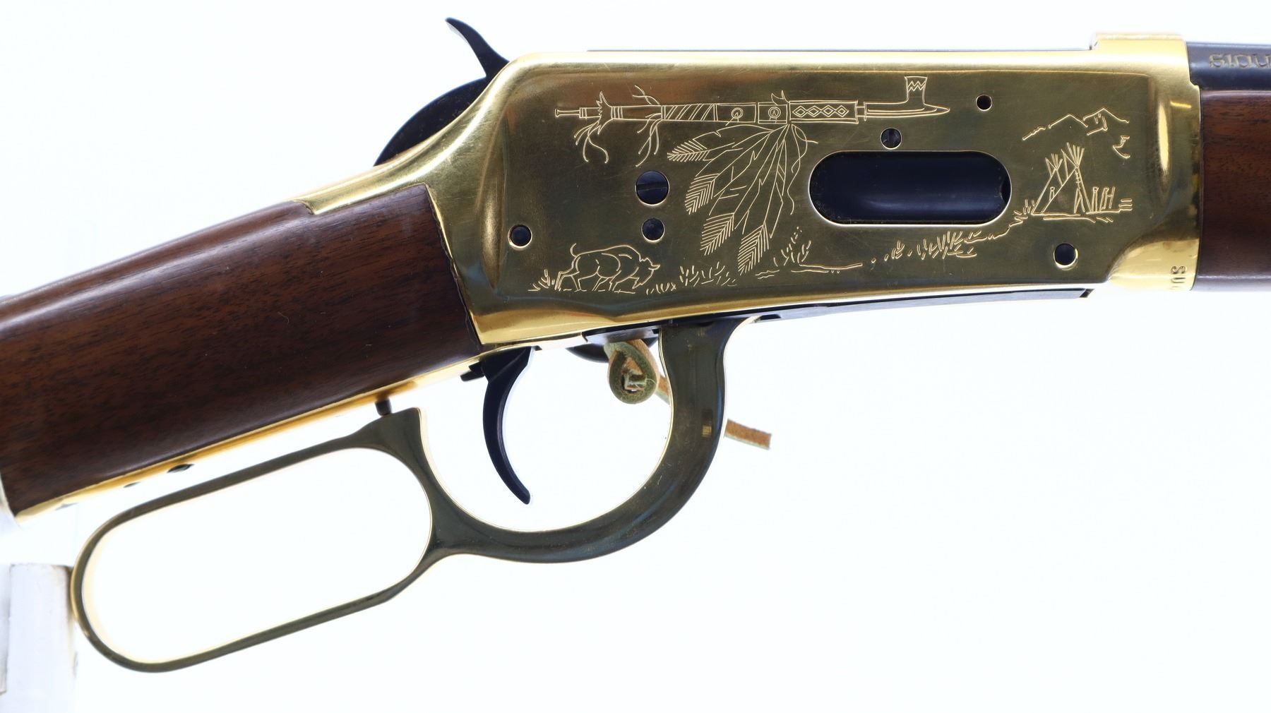 7+/10, WINCHESTER, MODEL: 94 SIOUX CARBINE COMMEMORATIVE, CALIBER:30-30 WIN, COMES WITH COMMEMORATIVE SLEEVE, BORE IS EXCELLENT. BLADE FRONT SIGHT, ADJUSTABLE U NOTCHED REAR SIGHT, BLUED BARREL BOLT AND MAG TUBE, GOLD ENGRAVED WESTERN SCENE RECEIVER, GROOVED HAMMER. TWO PIECE SMOOTH WOOD STOCKS, STRAIGHT GRIP, SMOOTH CURVED STEEL BUTT PLATE (LIGHT RUST SPOTS), RIGHT SIDE OF STOCK HAS MEDALLION WITH GOLD TACKS, SADDLE RING AND STUD, FULL LENGTH MAG TUBE. METAL FINISH SHOWS A FEW LIGHT RUST SPECKLES, SCRATCHES AND HANDLING MARKS. STOCKS SHOW SOME SLIGHT MARKS AND SCRATCHES. , ACTION: LEVER ACTION RIFLE, BARREL LENGTH: 20", SERIAL # SU09226, CONDITION: 7+/10, CLASS: CANADIAN NON RESTRICTED