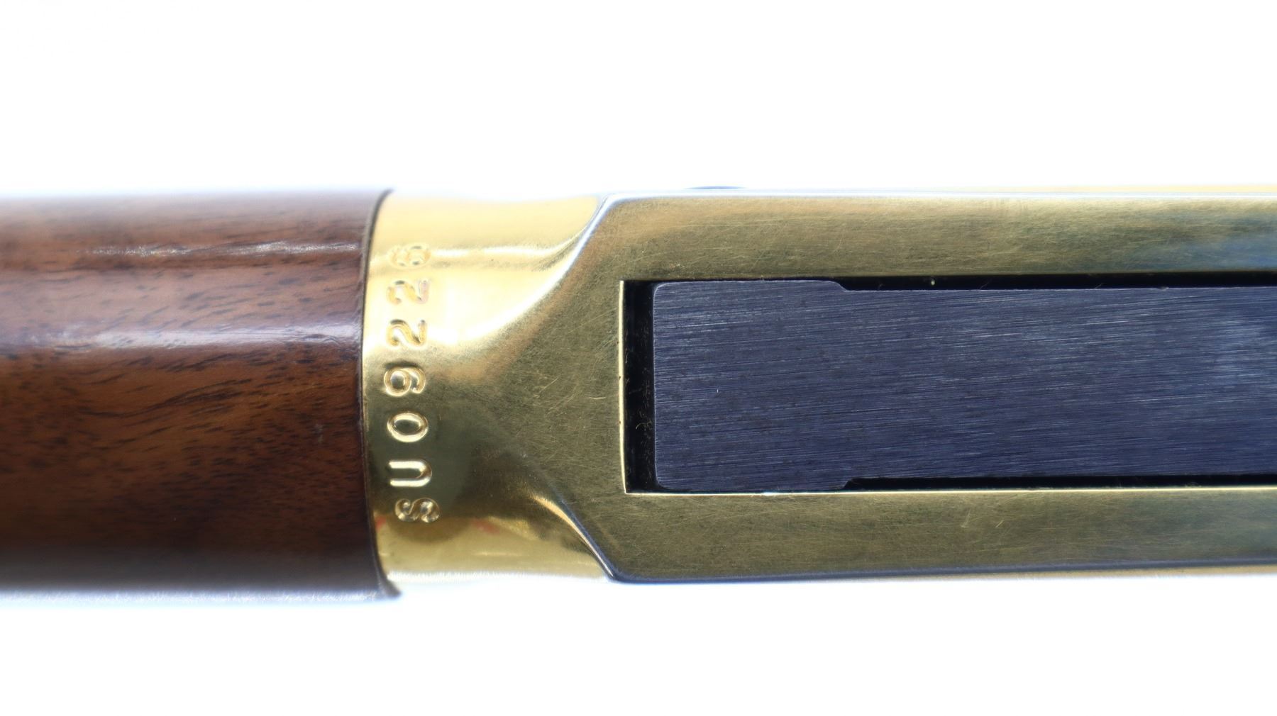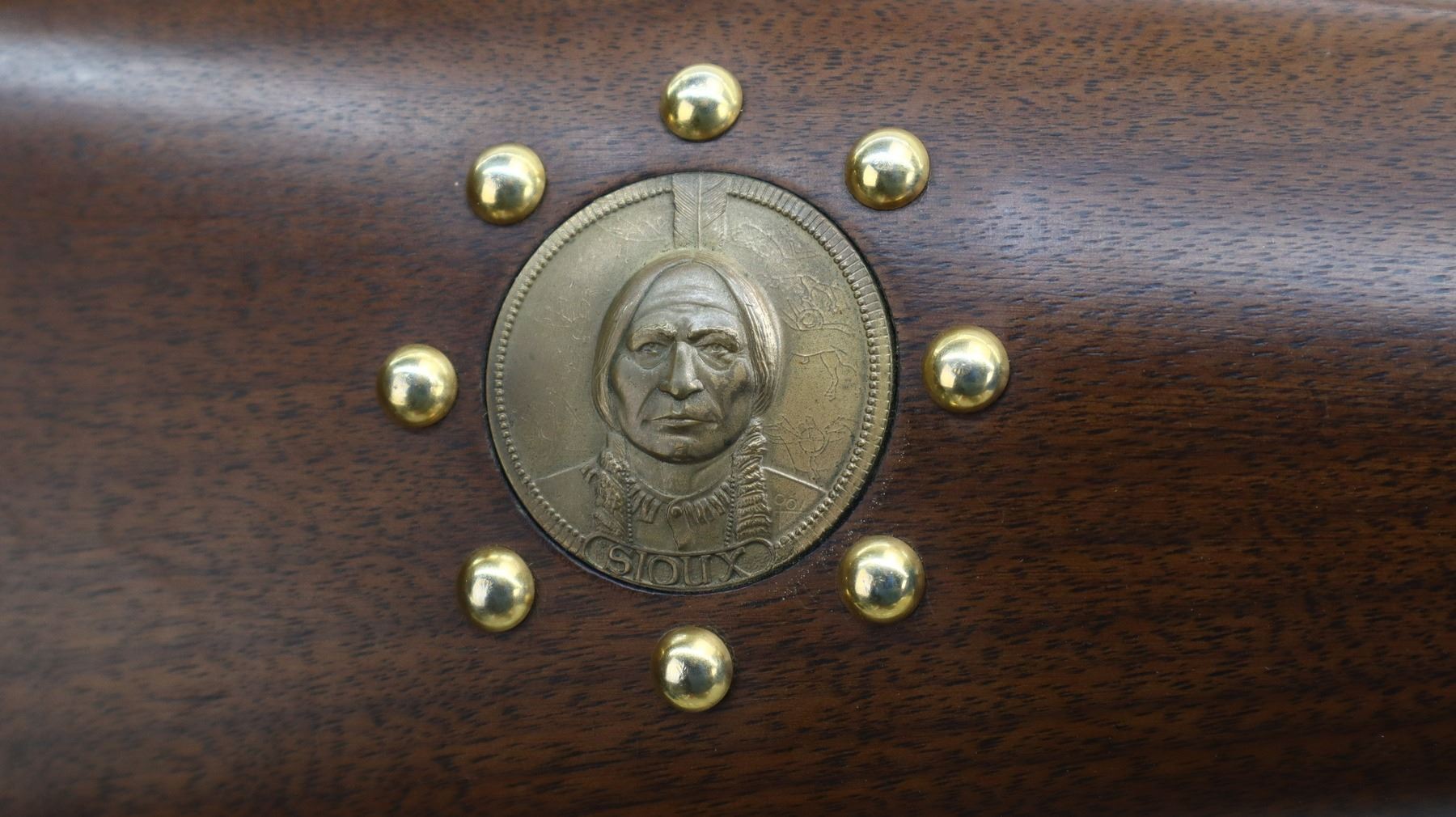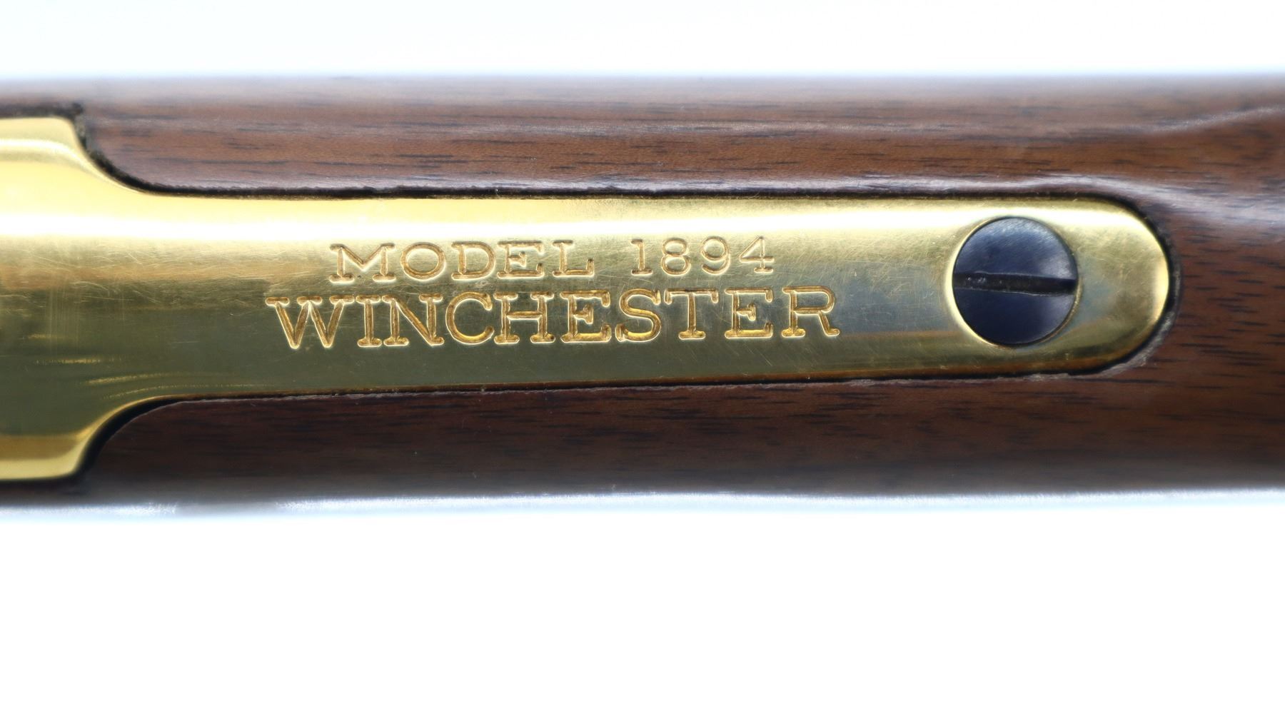 7+/10, WINCHESTER, MODEL: 94 SIOUX CARBINE COMMEMORATIVE, CALIBER:30-30 WIN, COMES WITH COMMEMORATIVE SLEEVE, BORE IS EXCELLENT. BLADE FRONT SIGHT, ADJUSTABLE U NOTCHED REAR SIGHT, BLUED BARREL BOLT AND MAG TUBE, GOLD ENGRAVED WESTERN SCENE RECEIVER, GROOVED HAMMER. TWO PIECE SMOOTH WOOD STOCKS, STRAIGHT GRIP, SMOOTH CURVED STEEL BUTT PLATE (LIGHT RUST SPOTS), RIGHT SIDE OF STOCK HAS MEDALLION WITH GOLD TACKS, SADDLE RING AND STUD, FULL LENGTH MAG TUBE. METAL FINISH SHOWS A FEW LIGHT RUST SPECKLES, SCRATCHES AND HANDLING MARKS. STOCKS SHOW SOME SLIGHT MARKS AND SCRATCHES. , ACTION: LEVER ACTION RIFLE, BARREL LENGTH: 20", SERIAL # SU09226, CONDITION: 7+/10, CLASS: CANADIAN NON RESTRICTED