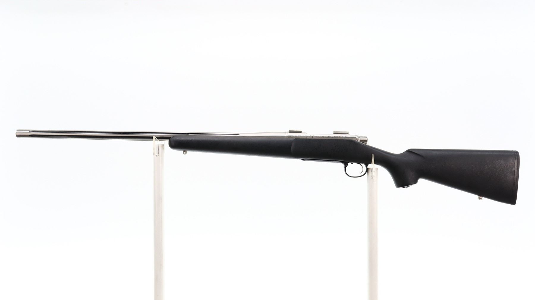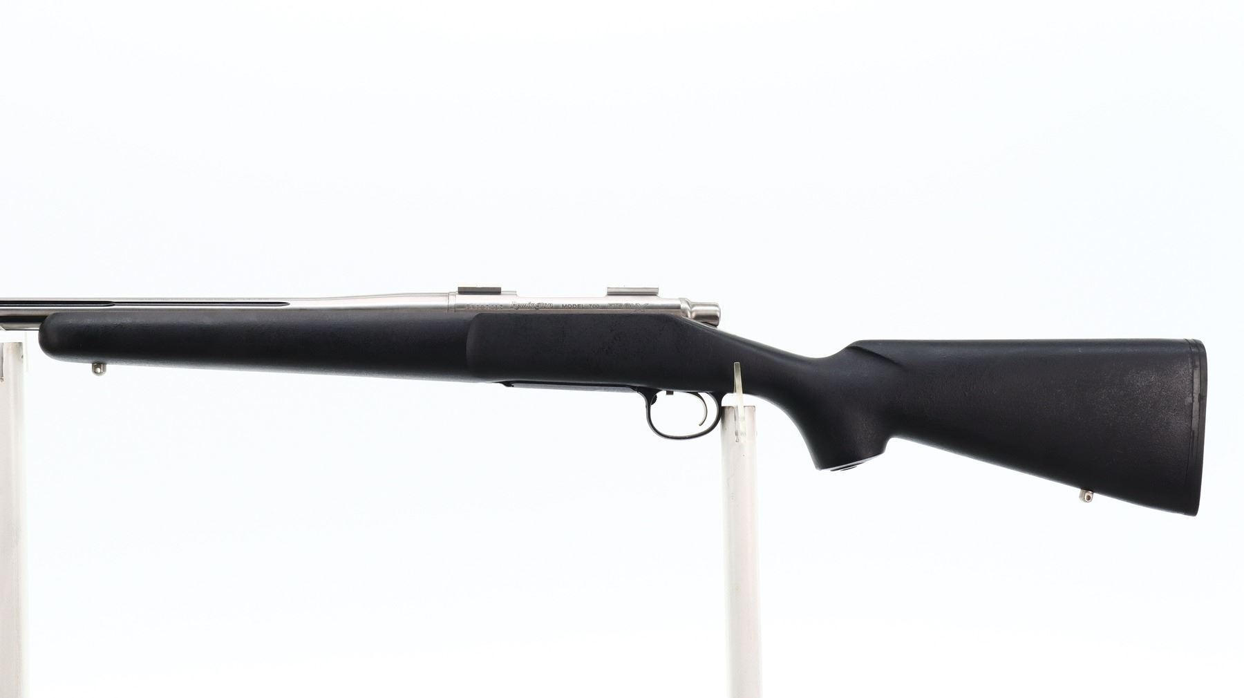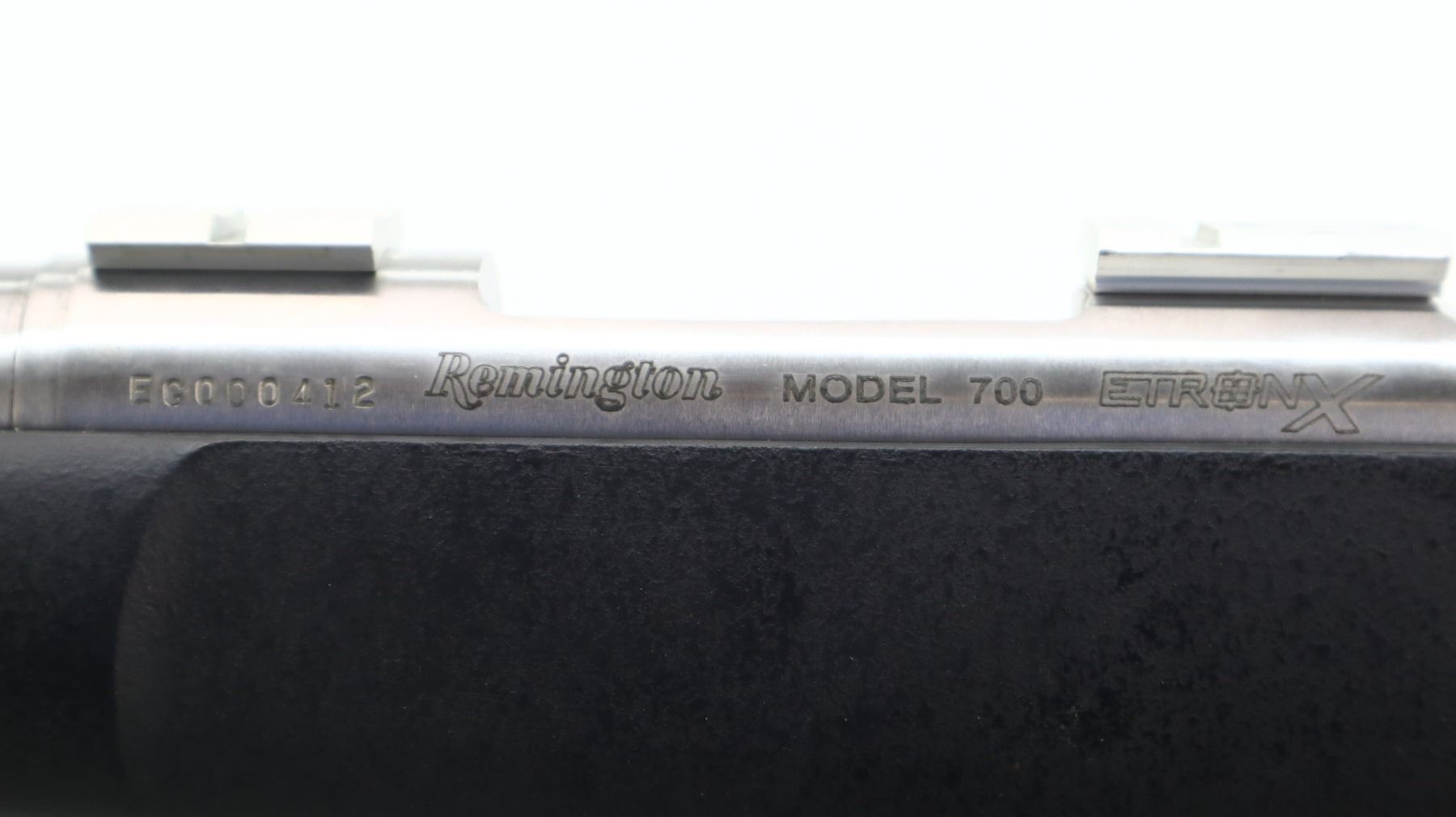 7/10, REMINGTON, MODEL: 700 ETRONX, CALIBER:243 WIN, BORE IS EXCELLENT. NO SIGHTS, STAINLESS HEAVY BARREL WITH BLACK FLUTES, RECEIVER DRILLED AND TAPPED WITH TWO PIECE SCOPE BASES INSTALLED, JEWELLED BOLT, ELECTRONIC TRIGGER. ONE PIECE TEXTURED BLACK FIBER GLASS STOCK, TARGET FOREND, PISTOL GRIP, BLACK RUBBER RECOIL PAD, HINGED FLOOR PLATE, SWIVEL STUDS. PISTOL GRIP HAS SAFETY MECHANISM NO KEY INCLUDED. METAL FINISH SHOWS SOME SCRATCHES, HANDLING MARKS AND WEAR. STOCK SHOWS SOME MARKS, SCRATCHES AND WEAR. , ACTION: BOLT ACTION RIFLE, BARREL LENGTH: 26", SERIAL # EG000412, CONDITION: 7/10, CLASS: CANADIAN NON RESTRICTED