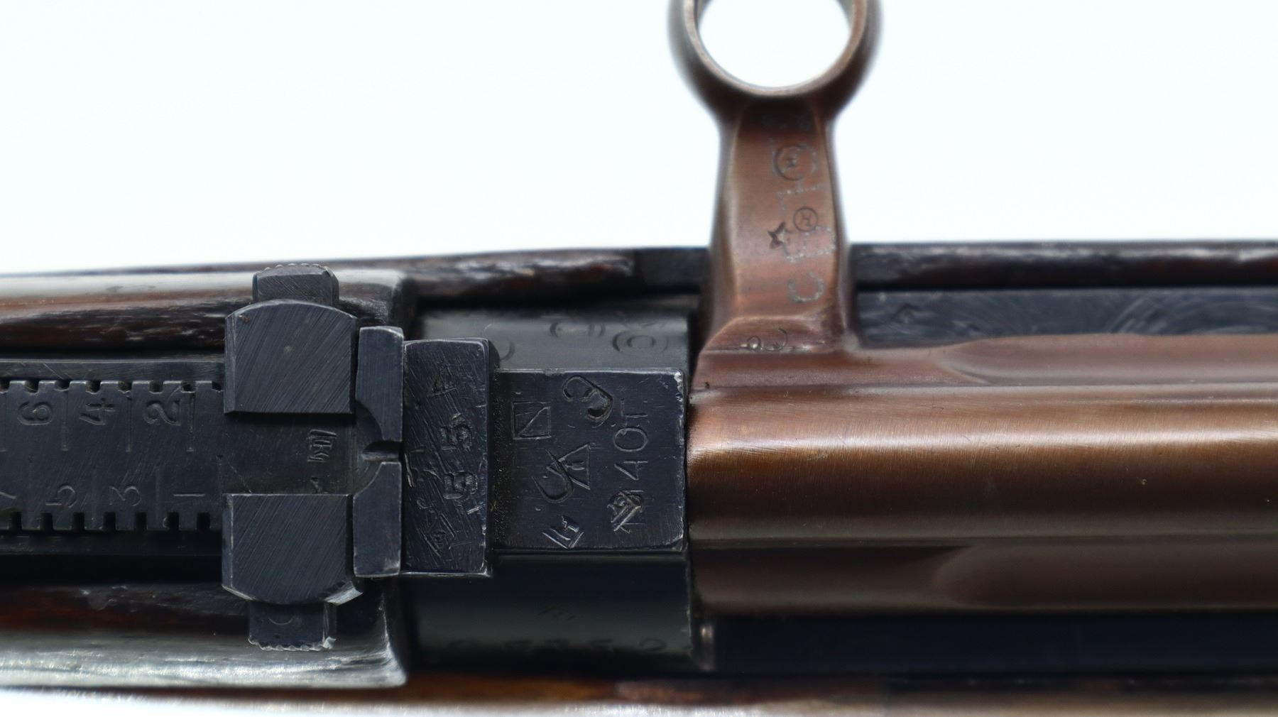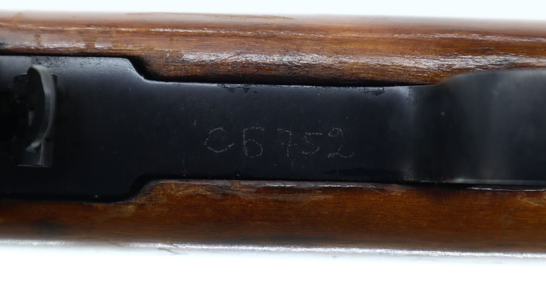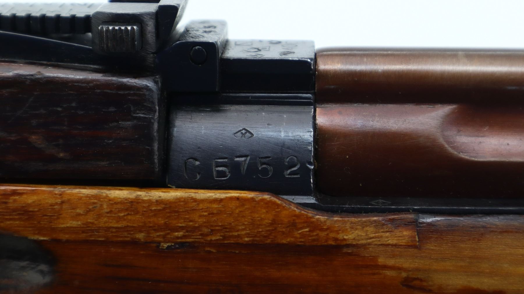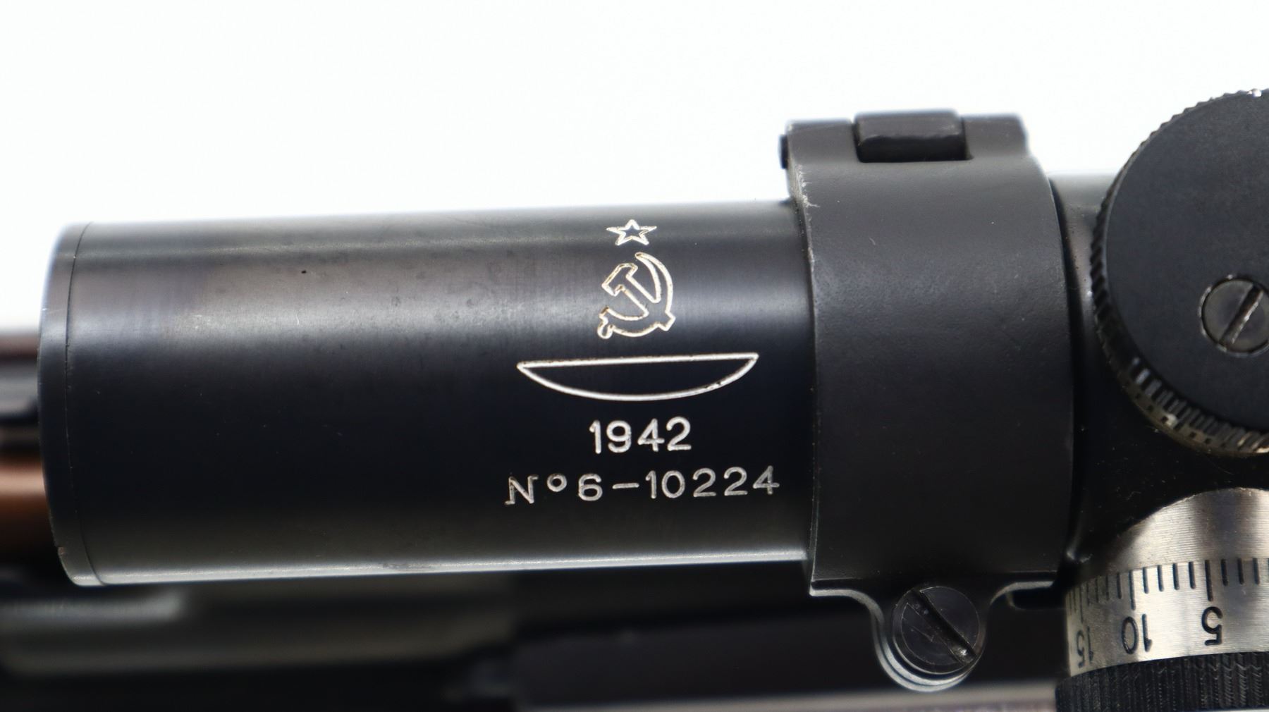 7+/10, RUSSIAN TOKAREV, MODEL: SVT-40 SNIPER, CALIBER:7.62 X 54R, COMES WITH MAGAZINE, SLING, BORE IS GOOD, SLIGHT WEAR, SOME SHINE. MANUFACTURED BY IZHEVSK 1940, RENUMBERED TO MATCH. POST FRONT SIGHT WITH HOOD AND RAMP, ADJUSTABLE U NOTCHED REAR SIGHT, BLUED FINISH, RECEIVER GROOVED ON BOTH SIDES FOR SNIPER SCOPE MOUNT, REAR CROSS SLOT IS A LATER MODIFICATION, REPRODUCTION MOUNT AND SCOPE MARKED WITH HAMMER AND SICKLE DATED 1942 NO6-10224, CLEAR OPTICS WITH THREE POST RETICLE. TWO PIECE FULL MILITARY WOOD STOCKS, VENTILATED TOP HAND GUARD, FINGER GROOVED FOREND, PISTOL GRIP, SMOOTH STEEL BUTT PLATE, SLING SWIVELS. TWO PIECE VENTILATED STEEL FRONT HAND GUARDS, CLEANING ROD, BAYONET LUG, 12 PORT MUZZLE BREAK. METAL FINISH SHOWS SOME SCRATCHES, HANDLING MARKS AND WEAR. STOCKS SHOW SOME MARKS, SCRATCHES AND WEAR. , ACTION: SEMI AUTOMATIC RIFLE, BARREL LENGTH: 24.75", SERIAL # C6752, CONDITION: 7+/10, CLASS: CANADIAN NON RESTRICTED