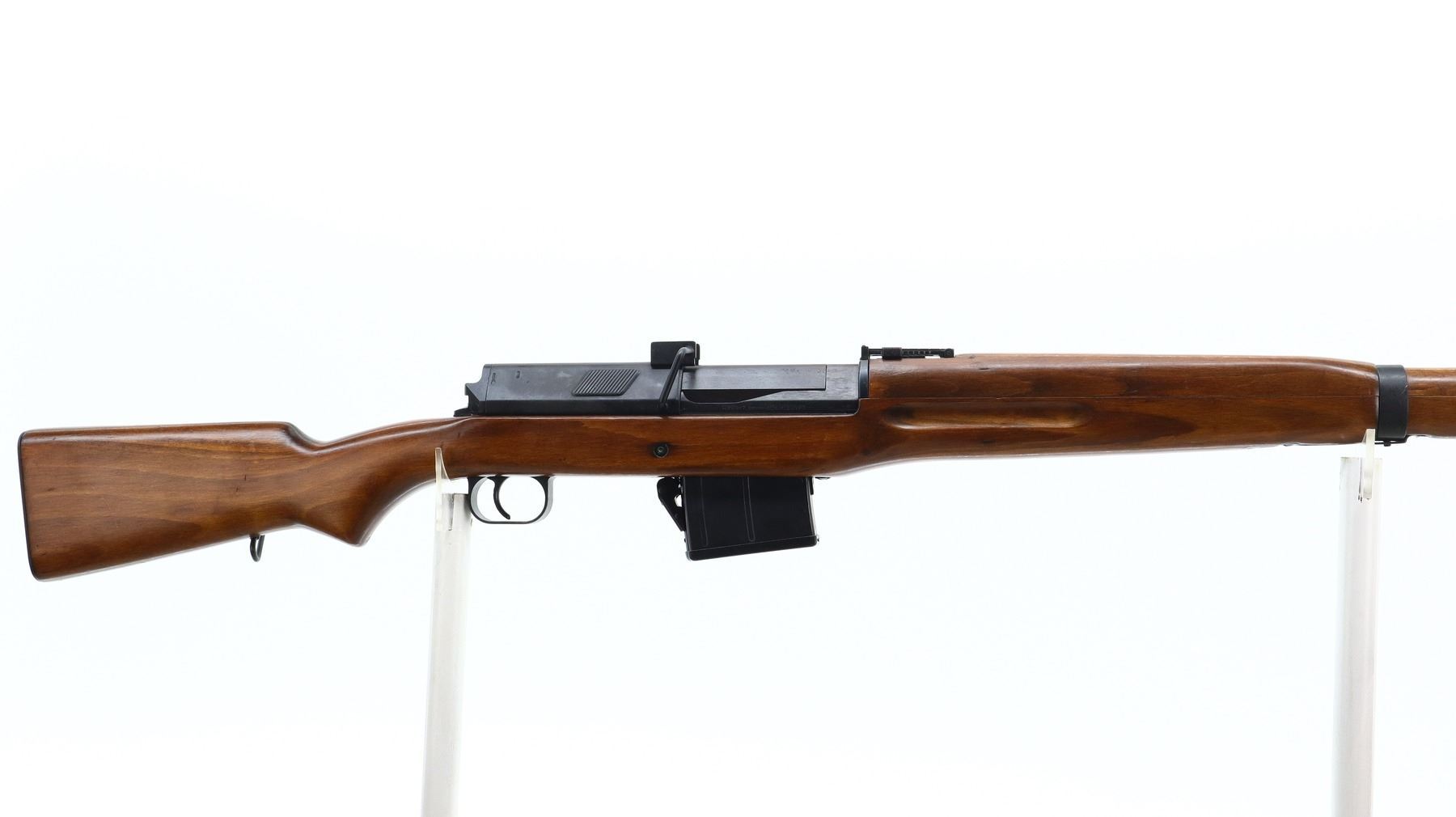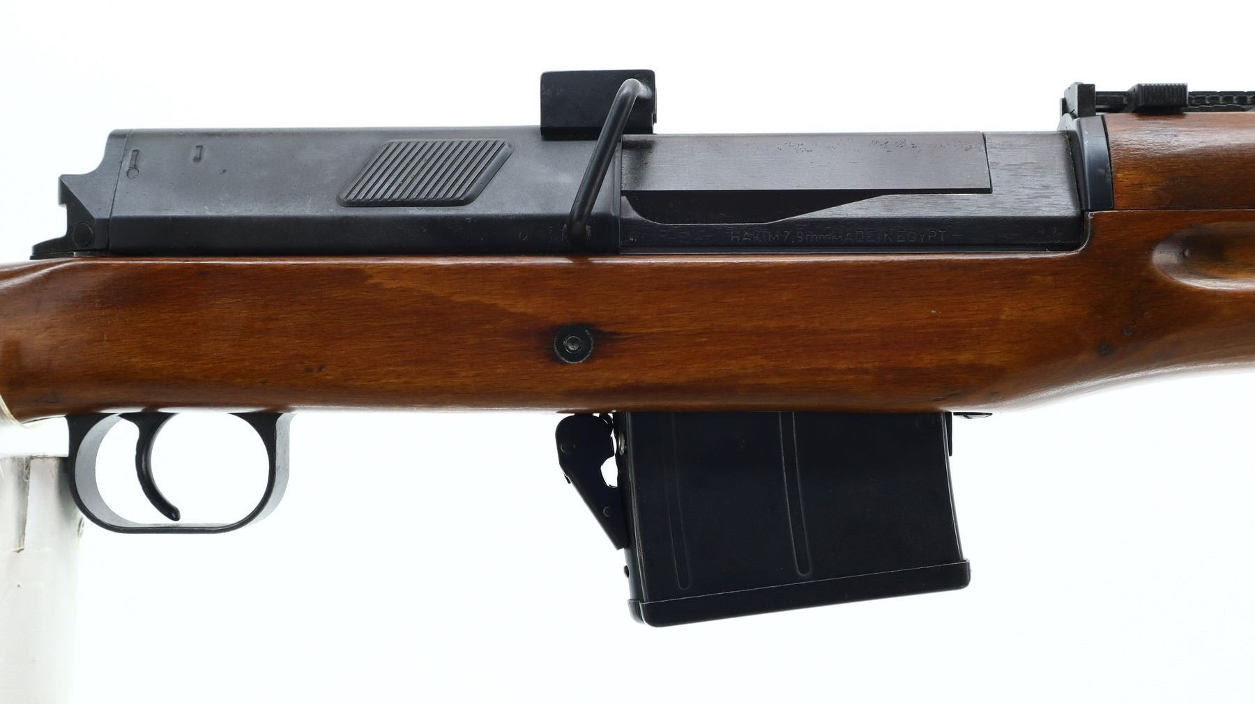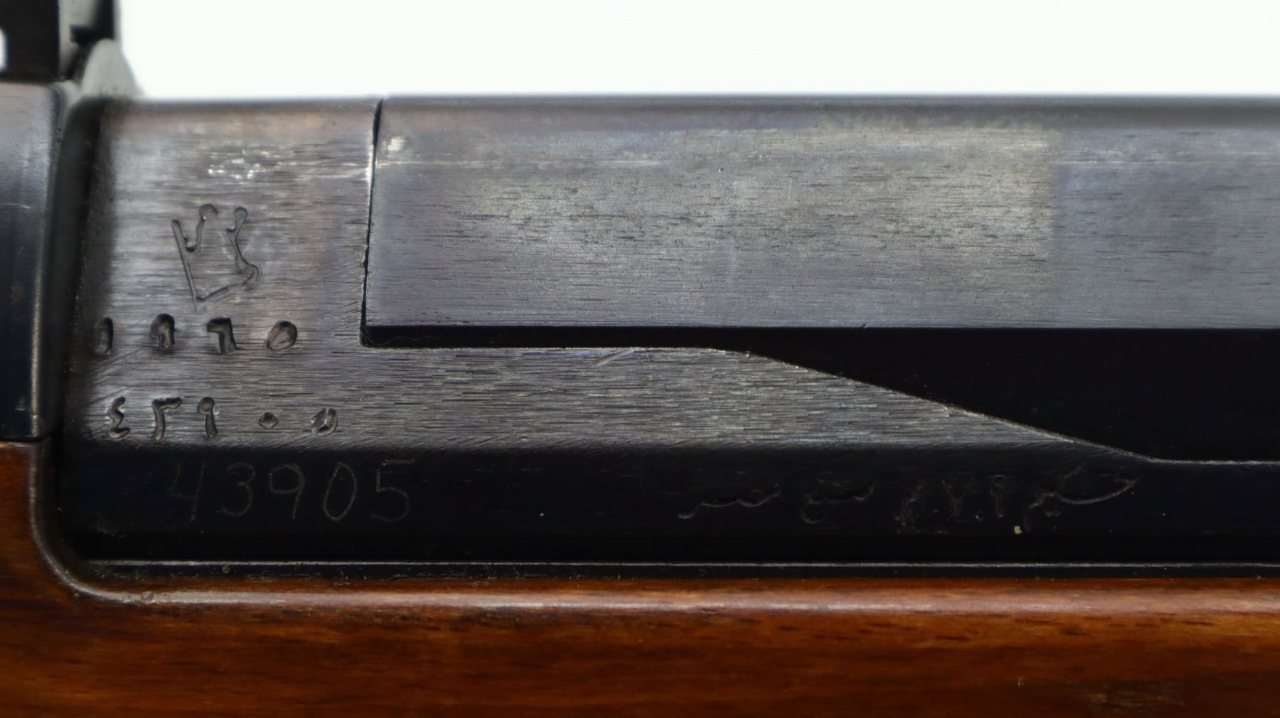8/10, EGYPTIAN , MODEL: HAKIM, CALIBER:8MM MAUSER, COMES WITH MAGAZINE, BORE IS EXCELLENT. BLADE FRONT SIGHT WITH HOOD AND RAMP, ADJUSTABLE U NOTCHED REAR SIGHT, ARABIC MARKINGS ON REAR SIGHT AND RECEIVER, BLUED FINISH. TWO PIECE FULL MILITARY WOOD STOCKS, FINGER GROOVED FOREND, PISTOL GRIP, SMOOTH STEEL BUTT PLATE, YELLOW PAINTED ARABIC MARKINGS ON LEFT SIDE OF STOCK, SLING SWIVELS, BAYONET LUG. BARREL HAS INTEGRAL MUZZLE BREAK. METAL FINISH HAS SOME SCRATCHES, HANDLING MARKS. STOCKS SHOW SOME MARKS AND SCRATCHES. , ACTION: SEMI AUTOMATIC RIFLE, BARREL LENGTH: 23", SERIAL # 43905, CONDITION: 8/10, CLASS: CANADIAN NON RESTRICTED