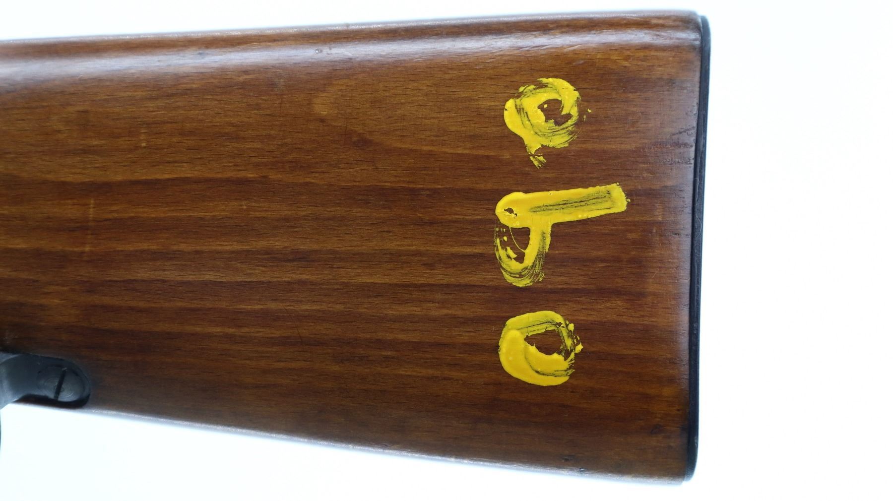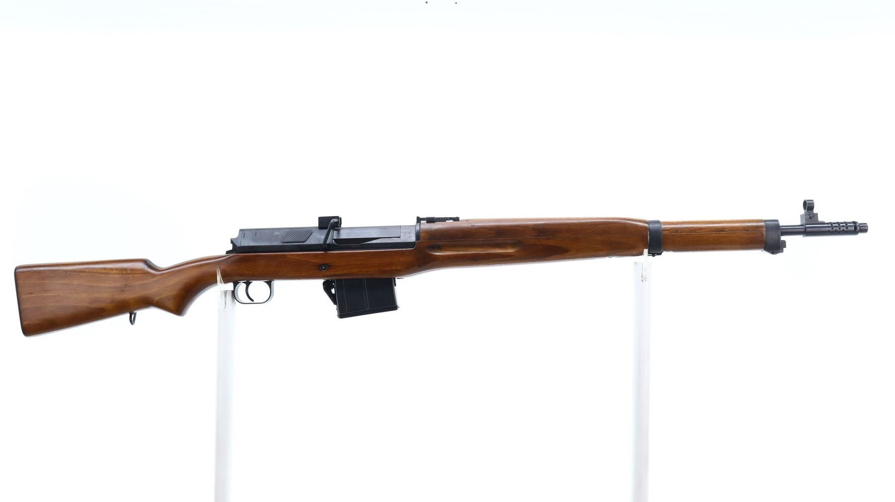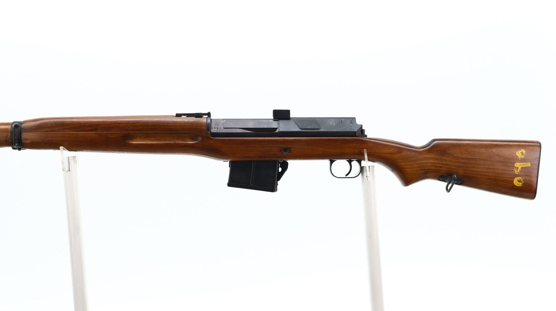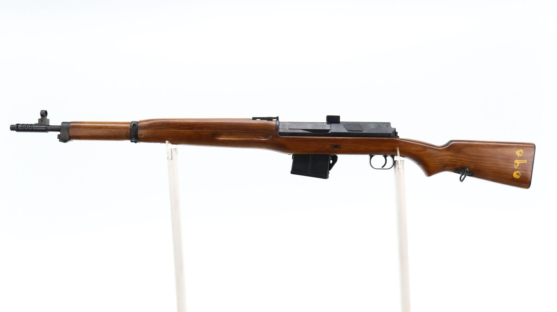 8/10, EGYPTIAN , MODEL: HAKIM, CALIBER:8MM MAUSER, COMES WITH MAGAZINE, BORE IS EXCELLENT. BLADE FRONT SIGHT WITH HOOD AND RAMP, ADJUSTABLE U NOTCHED REAR SIGHT, ARABIC MARKINGS ON REAR SIGHT AND RECEIVER, BLUED FINISH. TWO PIECE FULL MILITARY WOOD STOCKS, FINGER GROOVED FOREND, PISTOL GRIP, SMOOTH STEEL BUTT PLATE, YELLOW PAINTED ARABIC MARKINGS ON LEFT SIDE OF STOCK, SLING SWIVELS, BAYONET LUG. BARREL HAS INTEGRAL MUZZLE BREAK. METAL FINISH HAS SOME SCRATCHES, HANDLING MARKS. STOCKS SHOW SOME MARKS AND SCRATCHES. , ACTION: SEMI AUTOMATIC RIFLE, BARREL LENGTH: 23", SERIAL # 43905, CONDITION: 8/10, CLASS: CANADIAN NON RESTRICTED