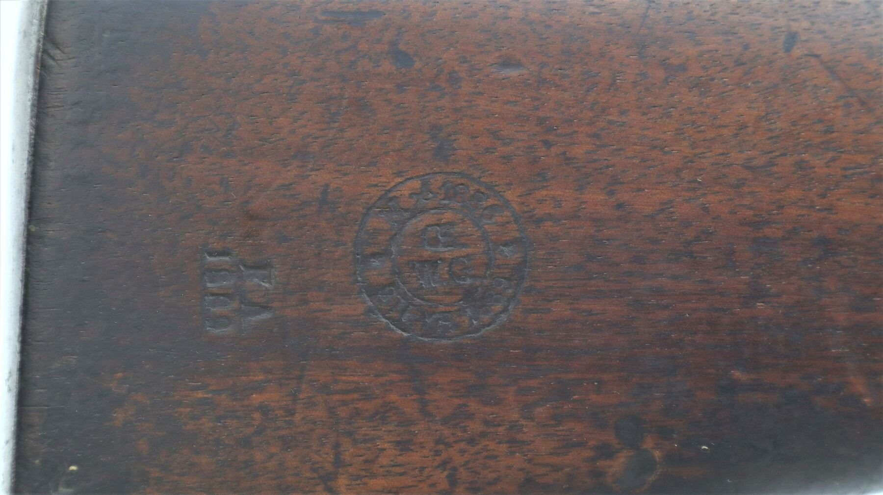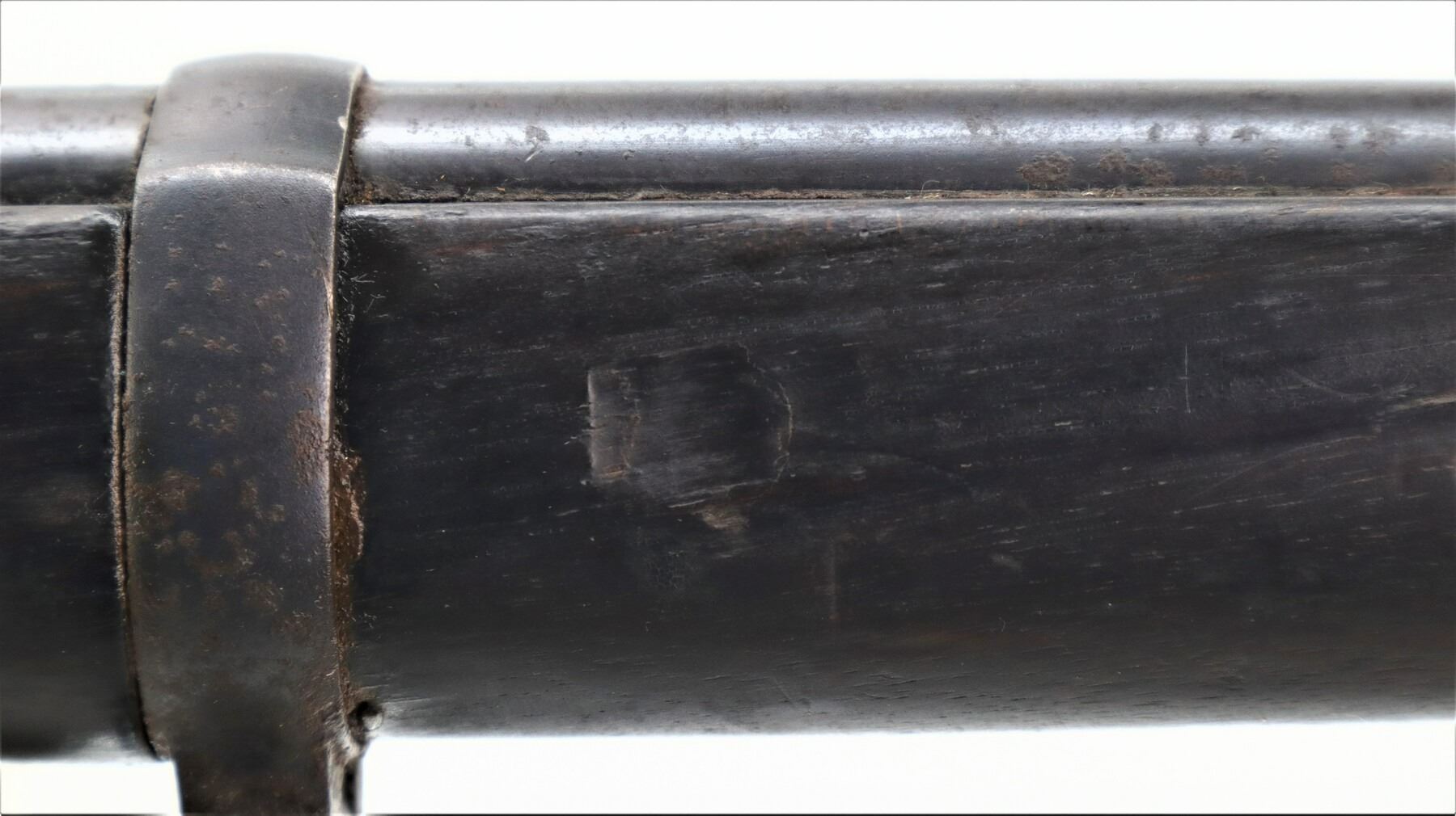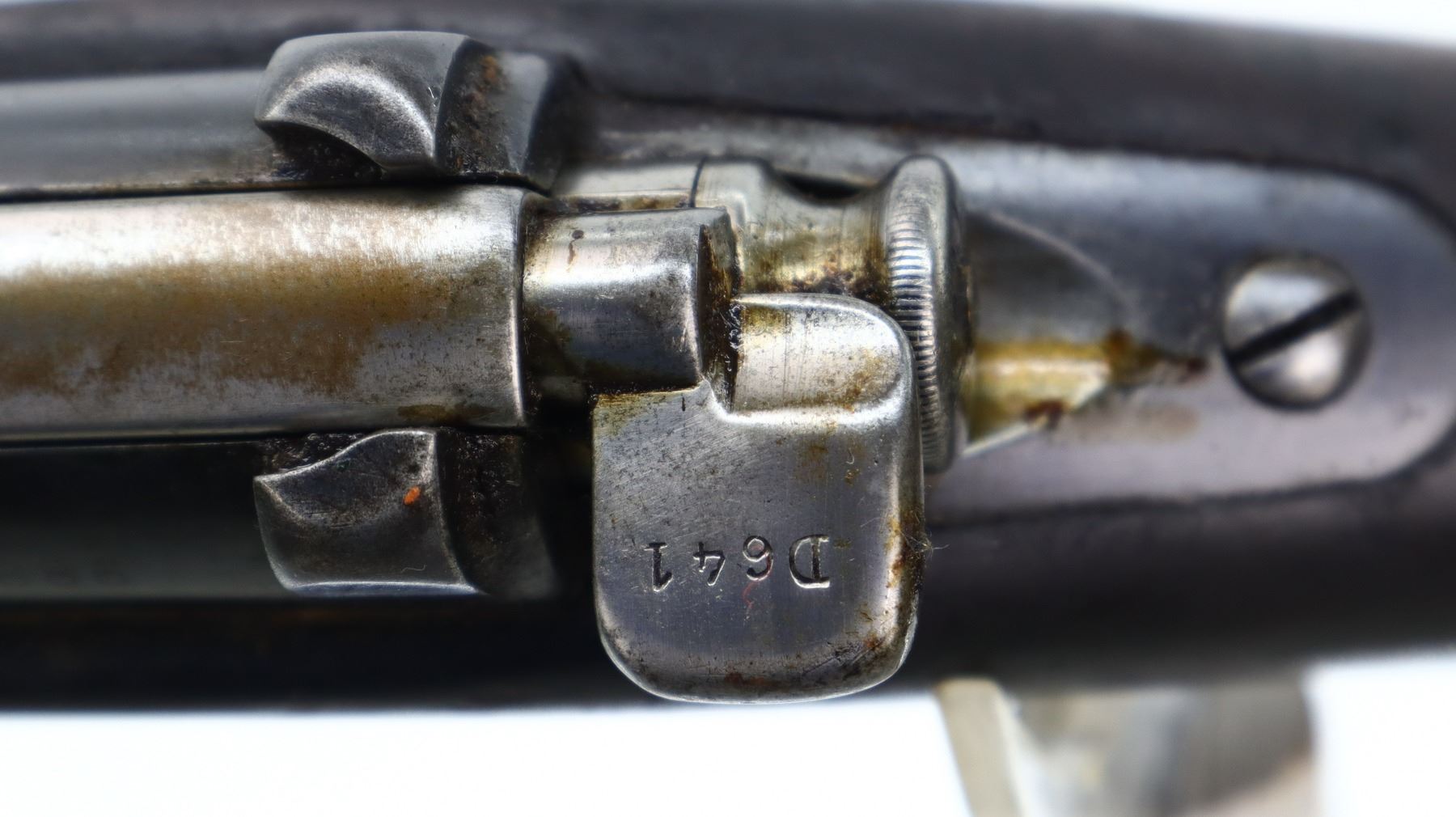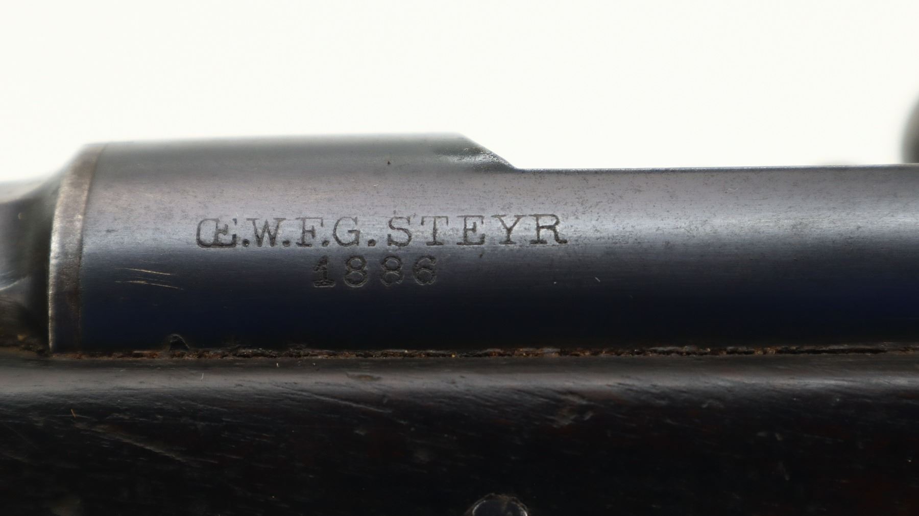 7/10, PORTUGUESE KROPATSCHEK , MODEL: 1886 SHORT RIFLE, CALIBER:8 X 60, BORE IS GOOD, SHINY. MANUFACTURED BY STEYR 1886, VISIBLE NUMBERS MATCH. BARLEY CORN FRONT SIGHT WITH RAMP, ADJUSTABLE U NOTCHED LADDER REAR SIGHT, BLUED FINISH, SILVER BOLT WITH STRAIGHT HANDLE. ONE PIECE FULL MILITARY WOOD STOCK, STRAIGHT GRIP, SMOOTH STEEL BUTT PLATE, STEEL TRIGGER GUARD WITH FINGER REST, SWIVELS, CLEANING ROD, BAYONET LUG. METAL FINISH SHOWS SOME LIGHT RUST SPECKLES, SCRATCHES, HANDLING MARKS AND WEAR. STOCK SHOWS SOME MARKS, SCRATCHES AND WEAR. , ACTION: BOLT ACTION RIFLE, BARREL LENGTH: 25.75", SERIAL # D641, CONDITION: 7/10, CLASS: CANADIAN NON RESTRICTED