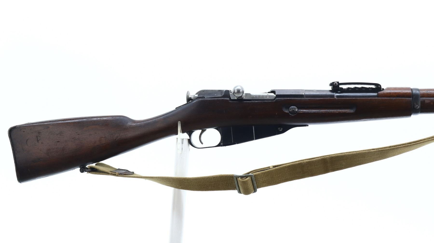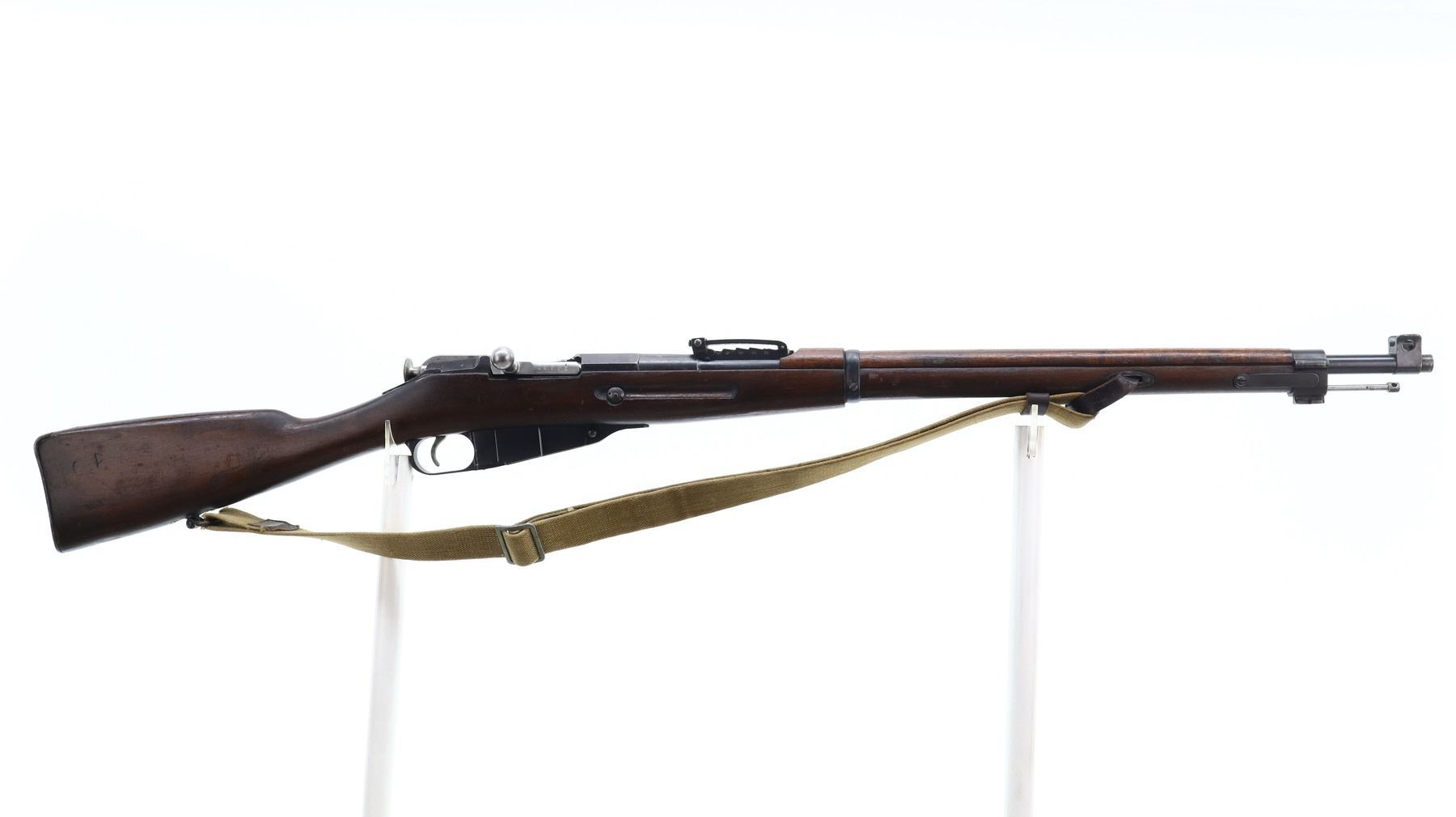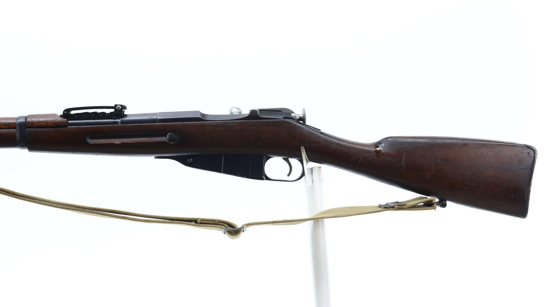 7+/10, FINNISH MOSIN NAGANT, MODEL: 27, CALIBER:7.62 X 54R, BORE IS GOOD, SHINY. FINNISH REBUILD, BOLT MATCHES, MAGAZINE DOES NOT. BLADE FRONT SIGHT WITH RAMP AND EARS, ADJUSTABLE U NOTCHED REAR SIGHT, BLUED FINISH, BARREL MANUFACTURED BY TIKKA 1928 "D", SILVER BOLT WITH STRAIGHT HANDLE. TWO PIECE FULL MILITARY WOOD STOCKS, FINGER GROOVED FOREND, STRAIGHT GRIP, SMOOTH STEEL BUTT PLATE, REAR SLING SLOT FILLED IN HAS STANDARD REAR SWIVEL, FRONT SLOT WITH CANVAS MILITARY SLING, CLEANING ROD, BAYONET LUG. METAL FINISH SHOWS SOME SCRATCHES, HANDLING MARKS AND WEAR. STOCKS SHOW SOME MARKS, SCRATCHES AND WEAR. , ACTION: BOLT ACTION RIFLE, BARREL LENGTH: 27", SERIAL # 28887, CONDITION: 7+/10, CLASS: CANADIAN NON RESTRICTED