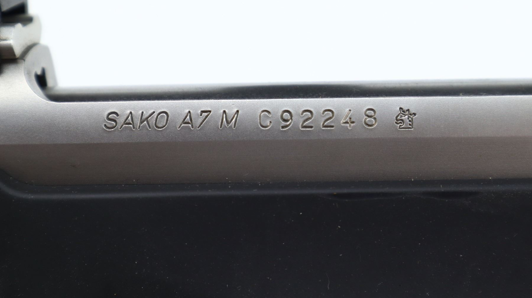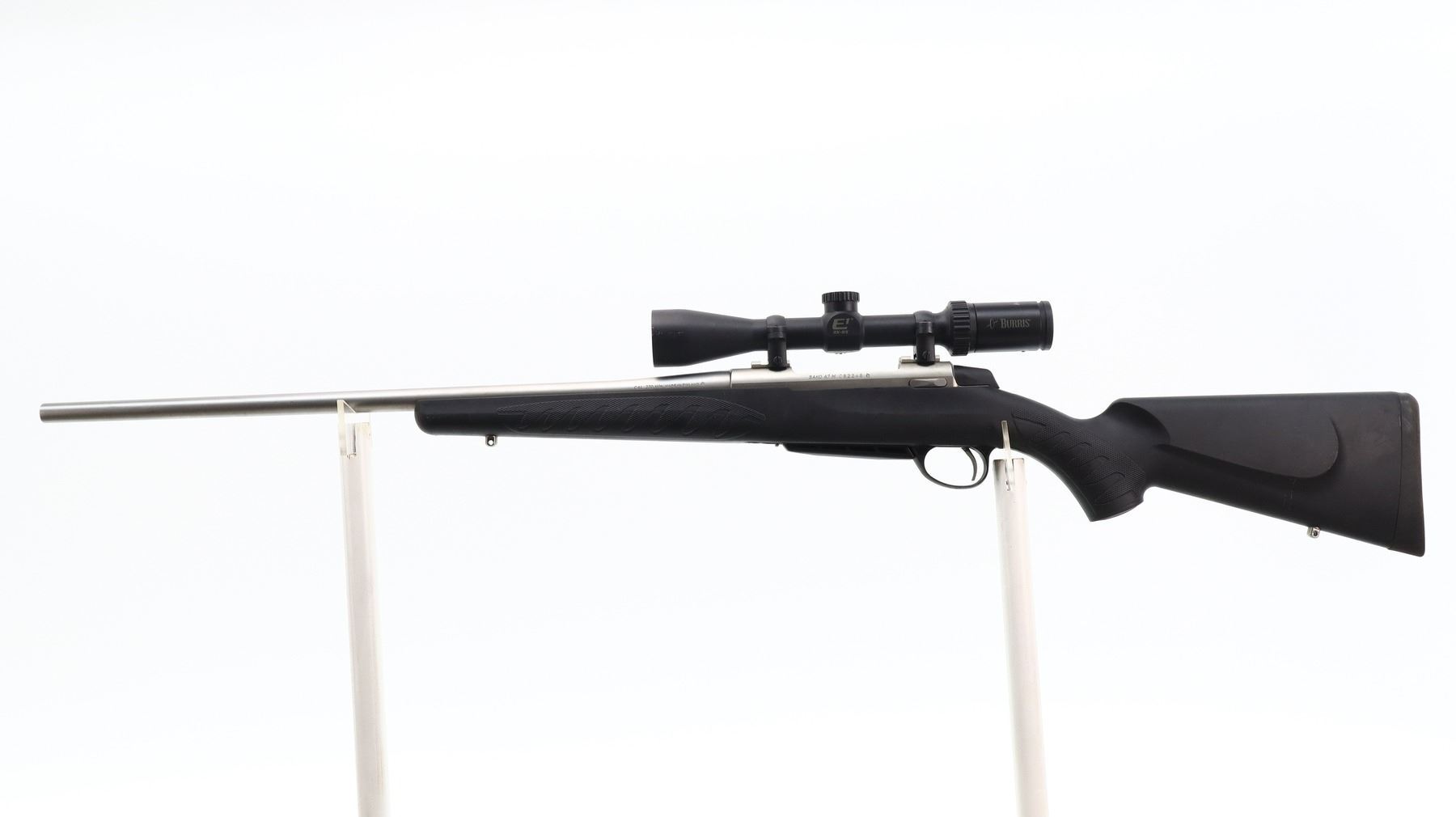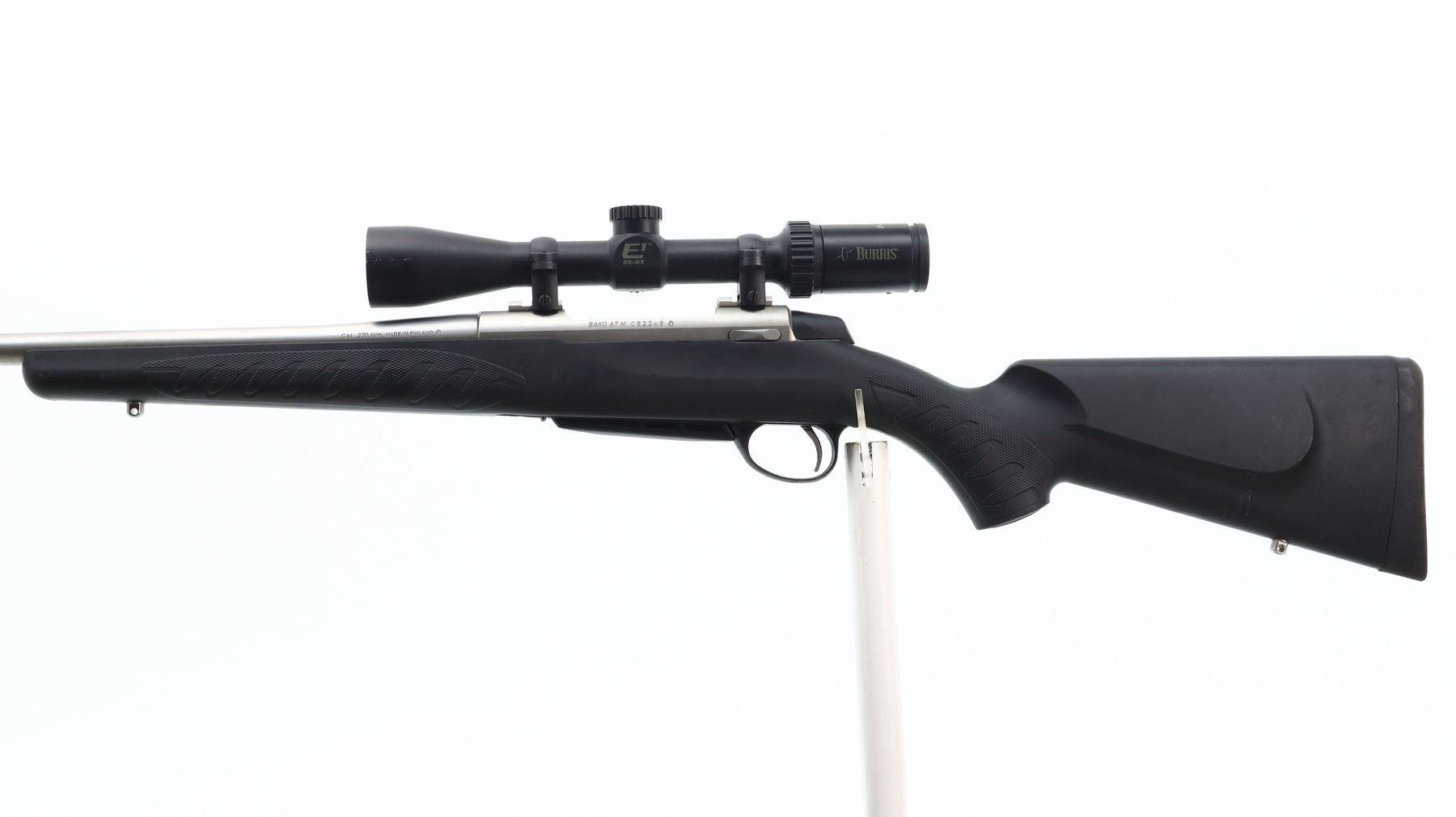 7/10, SAKO, MODEL: A7M, CALIBER:270 WIN, COMES WITH MAGAZINE, BORE IS EXCELLENT. NO SIGHTS, ROUND BARREL, STAINLESS FINISH, RECEIVER DRILLED AND TAPPED WITH BURRIS E1 3-9 X 40 SCOPE, CLEAR OPTICS WITH RANGE FINDING RETICLE. ONE PIECE BLACK SYNTHETIC STOCK WITH CHECKERED FOREARM AND PISTOL GRIP, CHEEK REST, BLACK RUBBER RECOIL PAD, SWIVEL STUDS. METAL FINISH SHOWS SOME SCRATCHES, HANDLING MARKS AND WEAR. STOCK SHOWS SOME MARKS AND SCRATCHES. , ACTION: BOLT ACTION RIFLE, BARREL LENGTH: 22", SERIAL # C92248, CONDITION: 7/10, CLASS: CANADIAN NON RESTRICTED