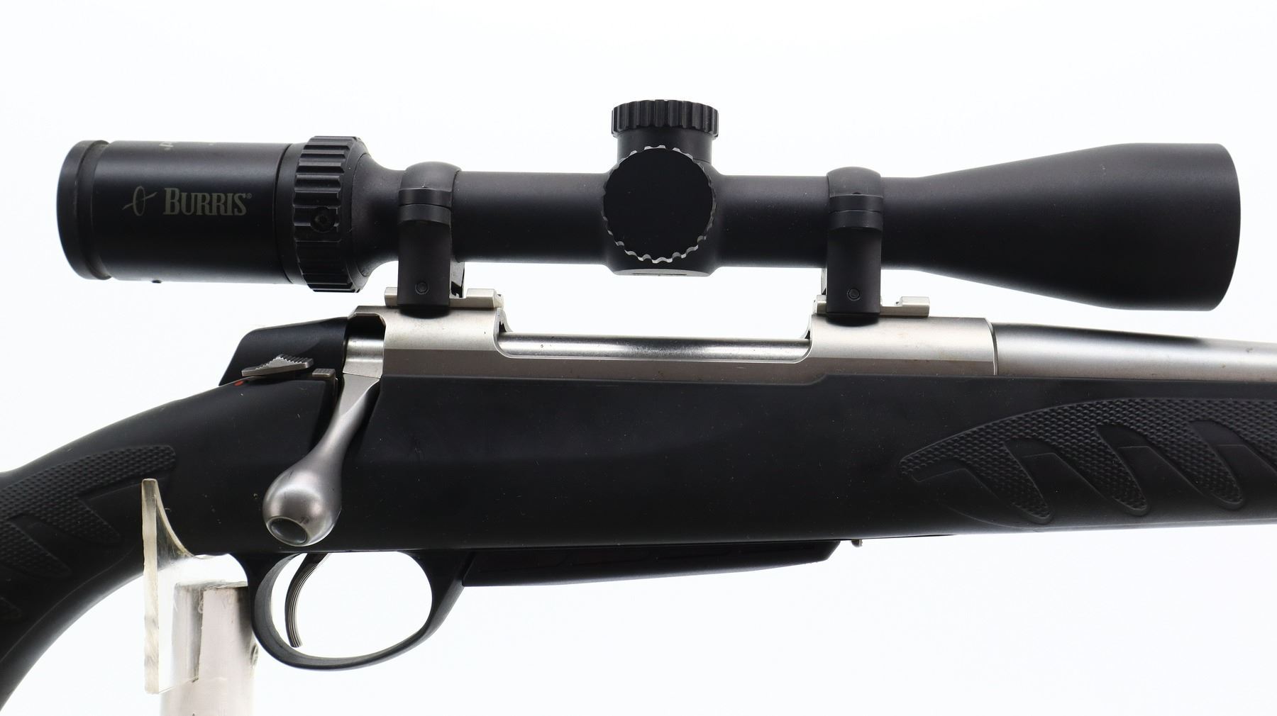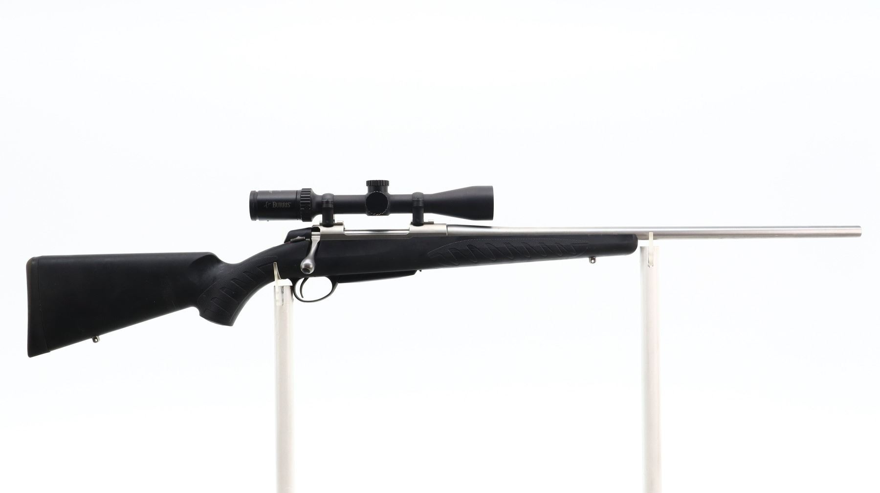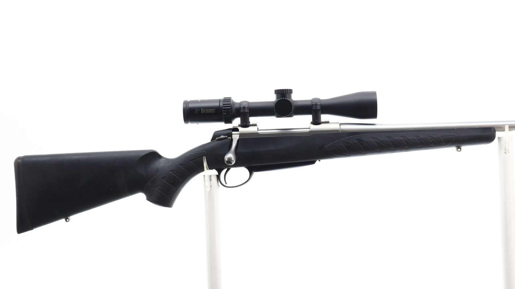7/10, SAKO, MODEL: A7M, CALIBER:270 WIN, COMES WITH MAGAZINE, BORE IS EXCELLENT. NO SIGHTS, ROUND BARREL, STAINLESS FINISH, RECEIVER DRILLED AND TAPPED WITH BURRIS E1 3-9 X 40 SCOPE, CLEAR OPTICS WITH RANGE FINDING RETICLE. ONE PIECE BLACK SYNTHETIC STOCK WITH CHECKERED FOREARM AND PISTOL GRIP, CHEEK REST, BLACK RUBBER RECOIL PAD, SWIVEL STUDS. METAL FINISH SHOWS SOME SCRATCHES, HANDLING MARKS AND WEAR. STOCK SHOWS SOME MARKS AND SCRATCHES. , ACTION: BOLT ACTION RIFLE, BARREL LENGTH: 22", SERIAL # C92248, CONDITION: 7/10, CLASS: CANADIAN NON RESTRICTED