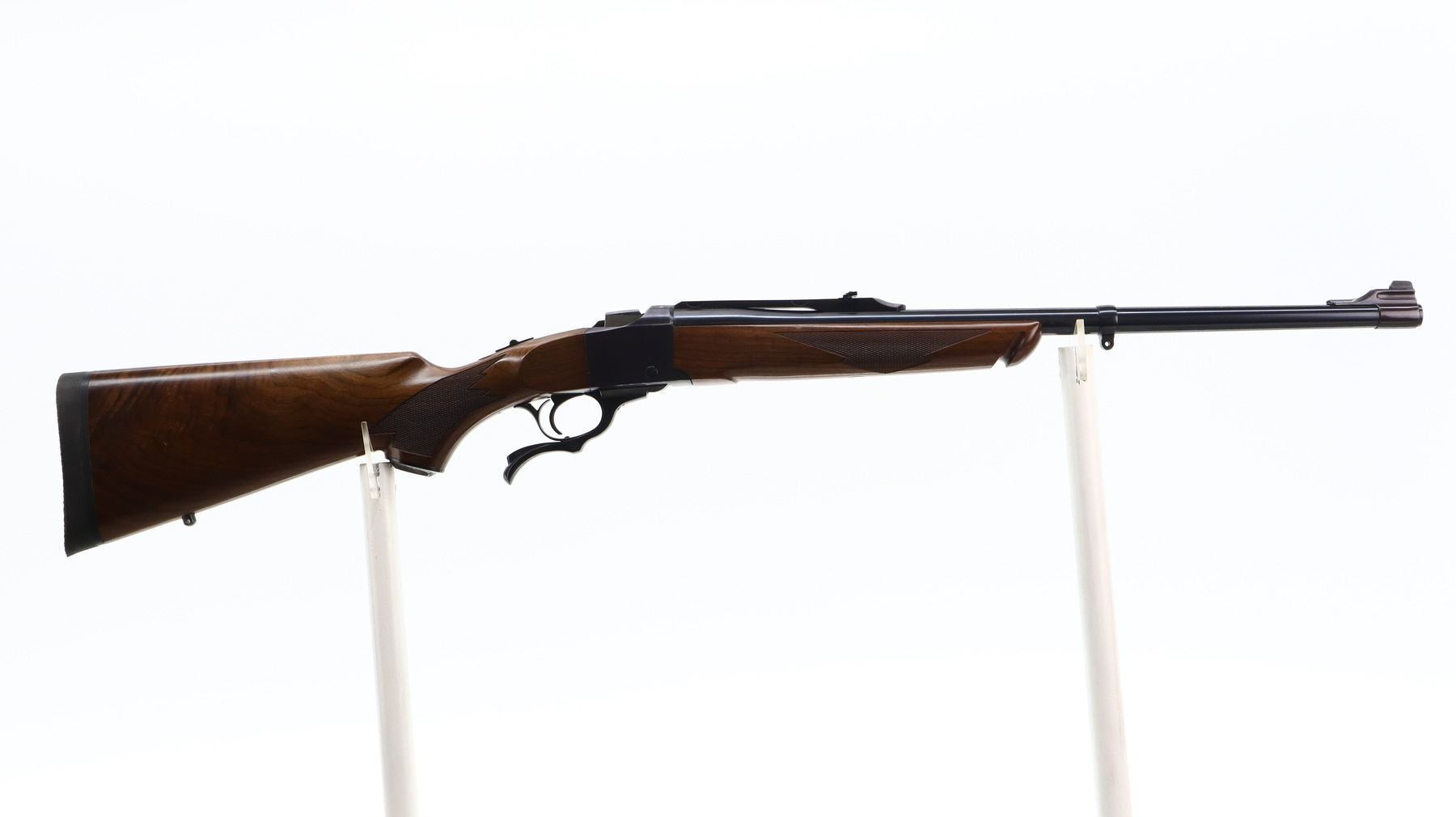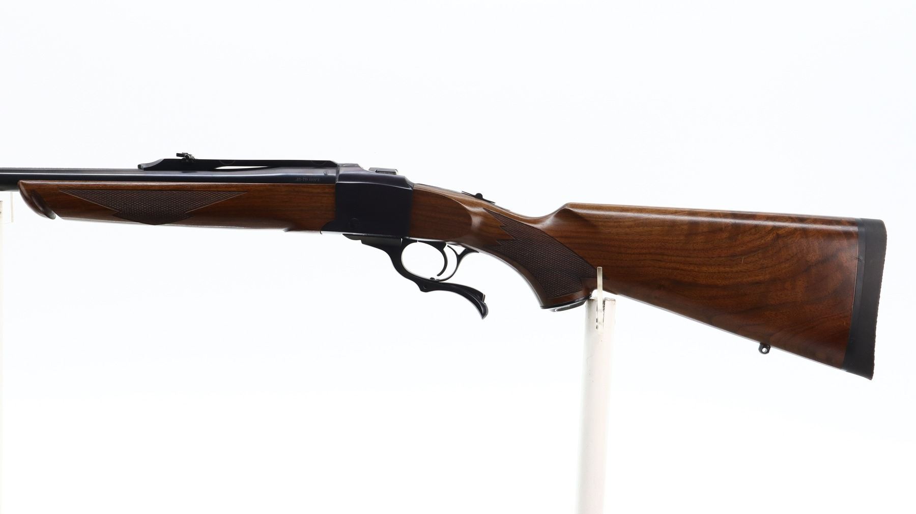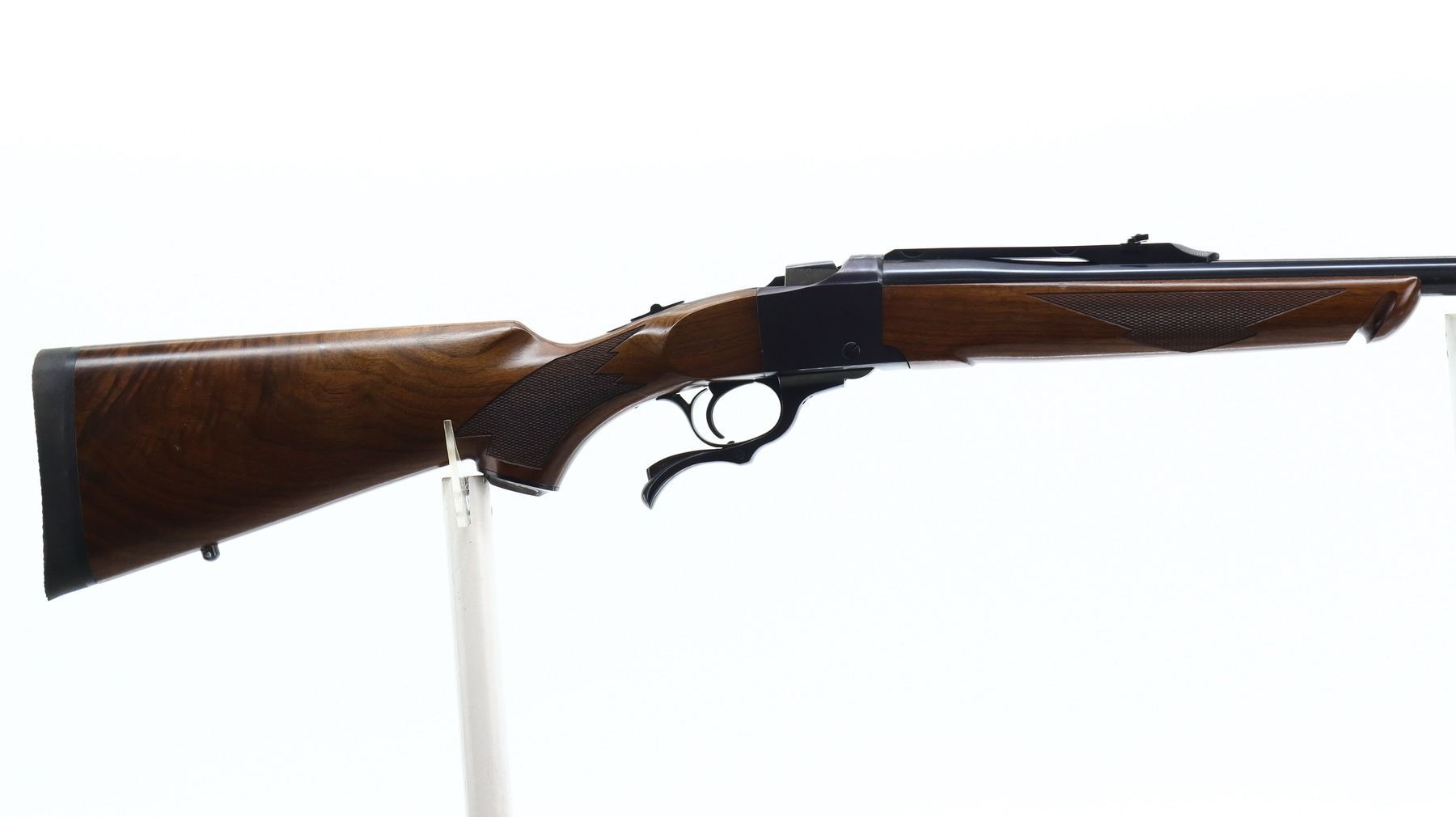 7+/10, RUGER, MODEL: NO1 A LIGHT SPORTER, CALIBER:45-70 GOVT, BORE IS EXCELLENT. BLADE FRONT SIGHT WITH RAMP, ADJUSTABLE FOLDING U NOTCHED REAR SIGHT WITH INTEGRAL SCOPE RAIL ON BARREL, BLUED FINISH, TANG SAFETY. TWO PIECE WOOD STOCKS, ALEXANDER HENRY CHECKERED FOREARM, CHECKERED PISTOL GRIP, TEXTURED BLACK RUBBER RECOIL PAD, GRIP CAP, SWIVEL STUDS. METAL FINISH SHOWS SOME SCRATCHES AND HANDLING MARKS. STOCKS SHOW SOME SLIGHT MARKS AND SCRATCHES. , ACTION: SINGLE SHOT DROP BLOCK, BARREL LENGTH: 22", SERIAL # 13335025, CONDITION: 7+/10, CLASS: CANADIAN NON RESTRICTED