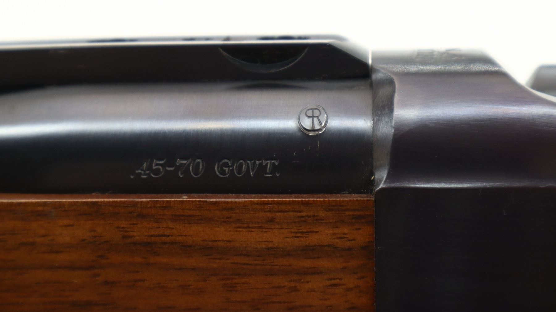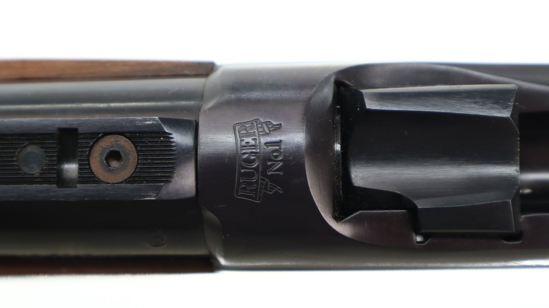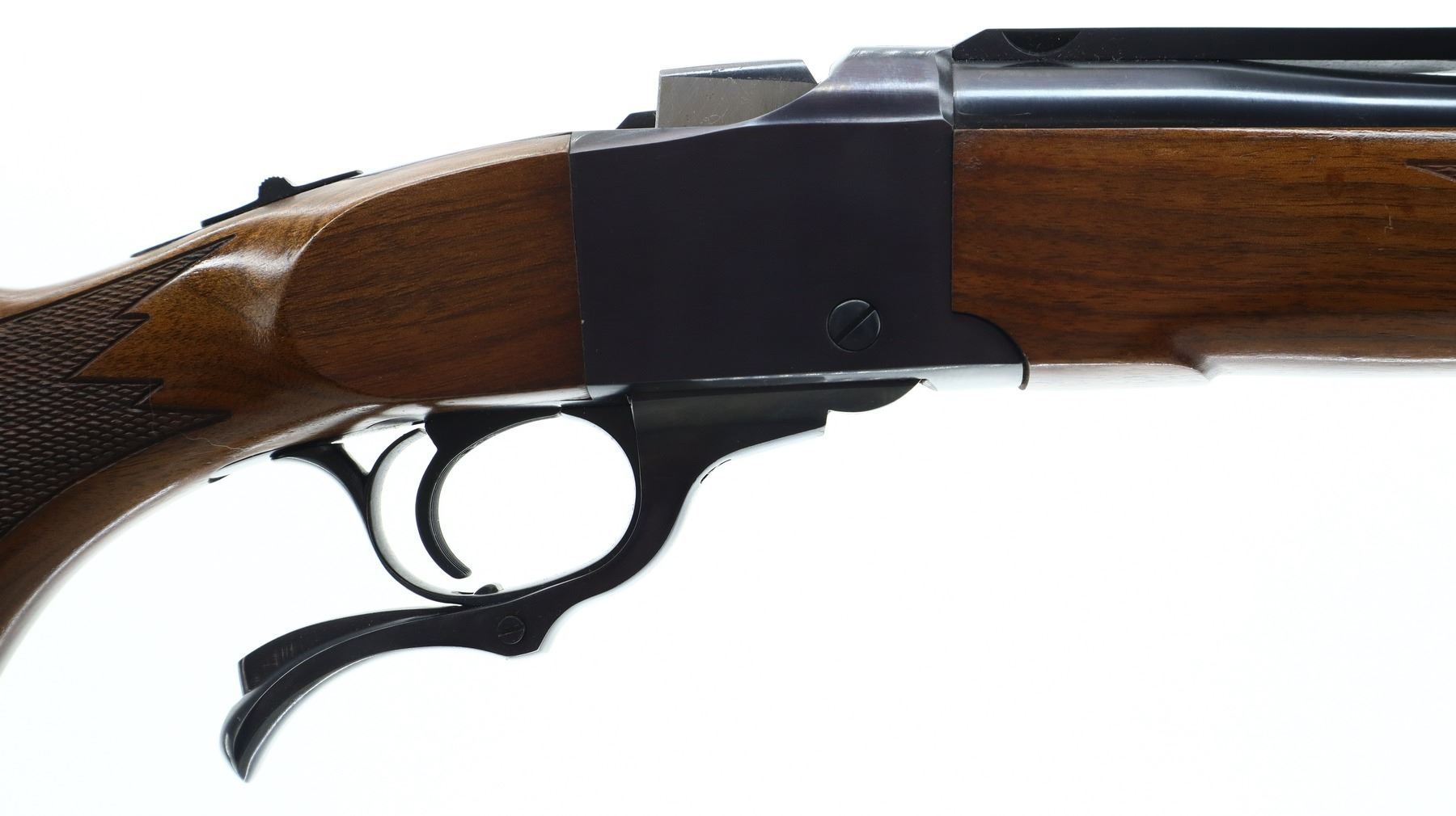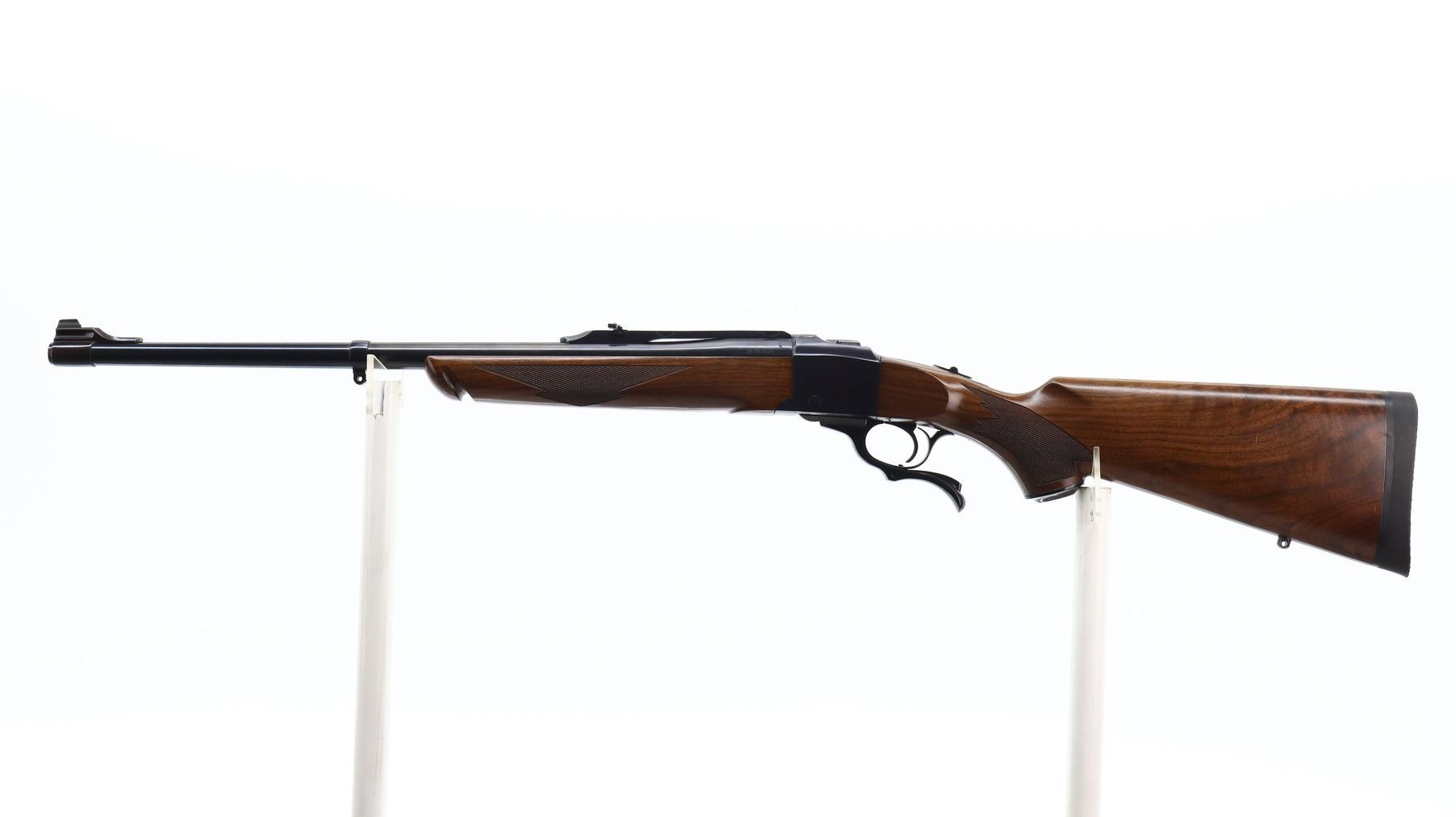 7+/10, RUGER, MODEL: NO1 A LIGHT SPORTER, CALIBER:45-70 GOVT, BORE IS EXCELLENT. BLADE FRONT SIGHT WITH RAMP, ADJUSTABLE FOLDING U NOTCHED REAR SIGHT WITH INTEGRAL SCOPE RAIL ON BARREL, BLUED FINISH, TANG SAFETY. TWO PIECE WOOD STOCKS, ALEXANDER HENRY CHECKERED FOREARM, CHECKERED PISTOL GRIP, TEXTURED BLACK RUBBER RECOIL PAD, GRIP CAP, SWIVEL STUDS. METAL FINISH SHOWS SOME SCRATCHES AND HANDLING MARKS. STOCKS SHOW SOME SLIGHT MARKS AND SCRATCHES. , ACTION: SINGLE SHOT DROP BLOCK, BARREL LENGTH: 22", SERIAL # 13335025, CONDITION: 7+/10, CLASS: CANADIAN NON RESTRICTED