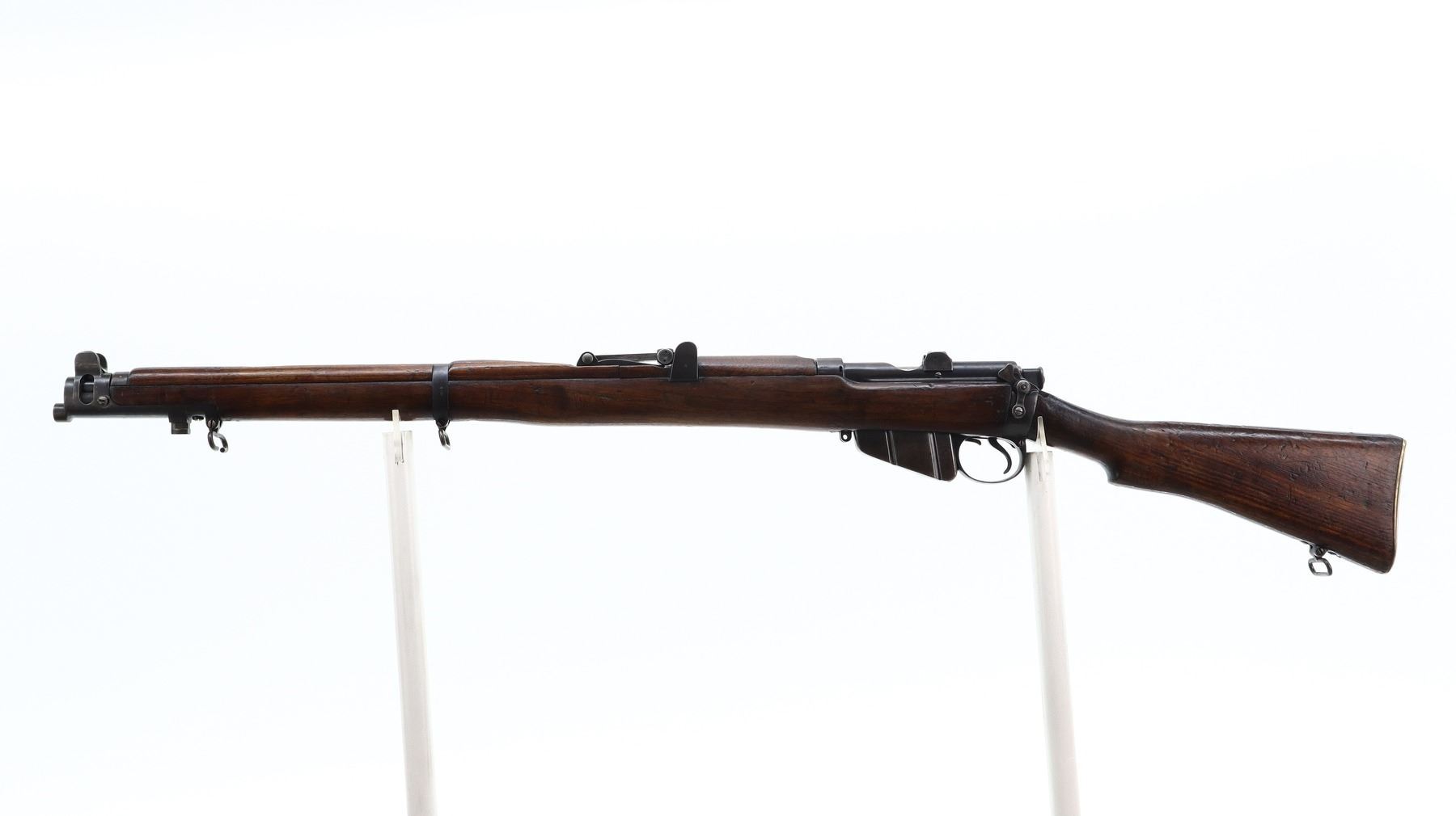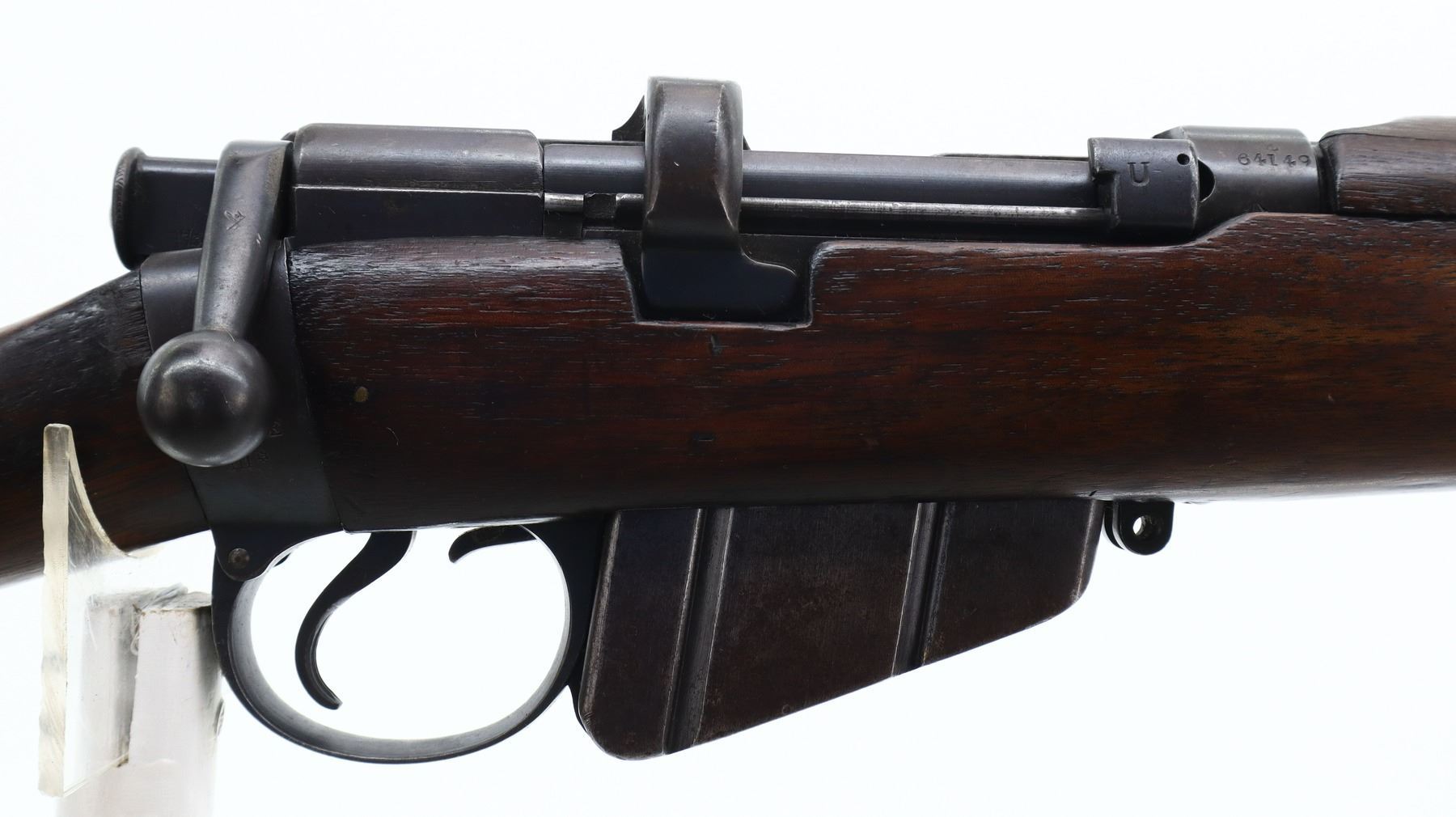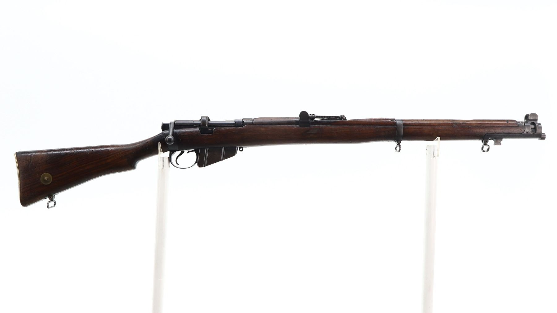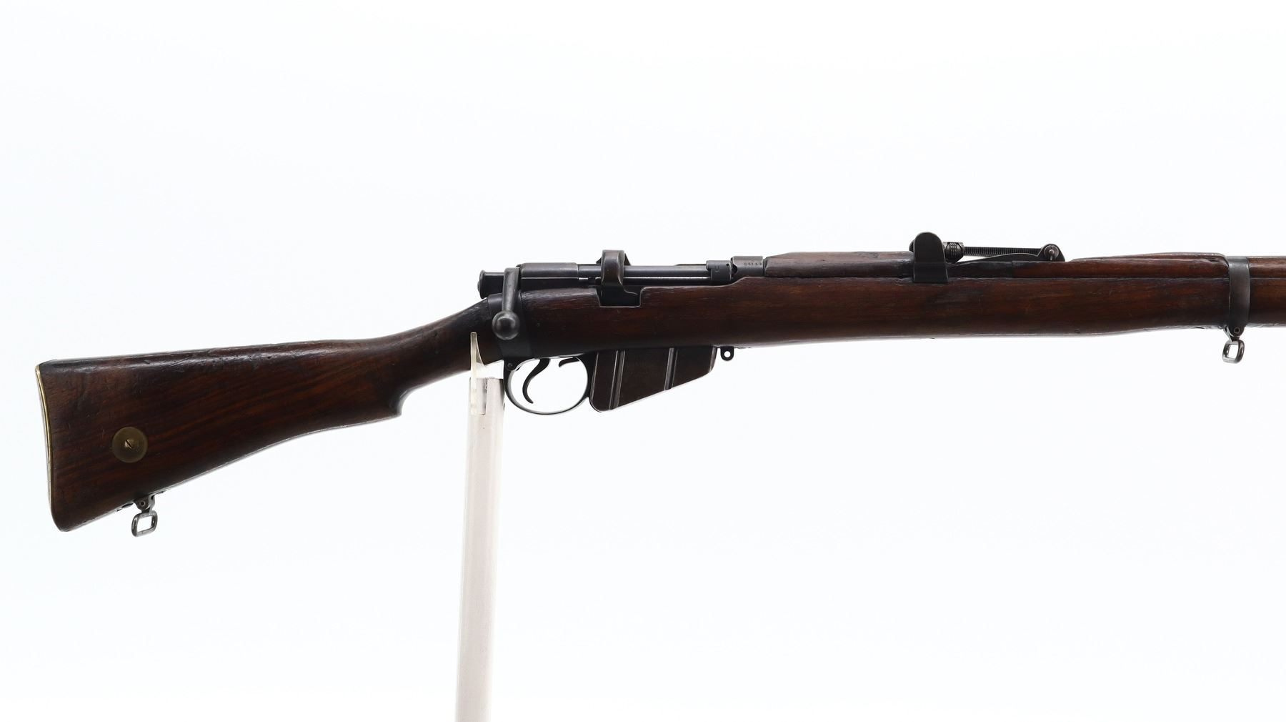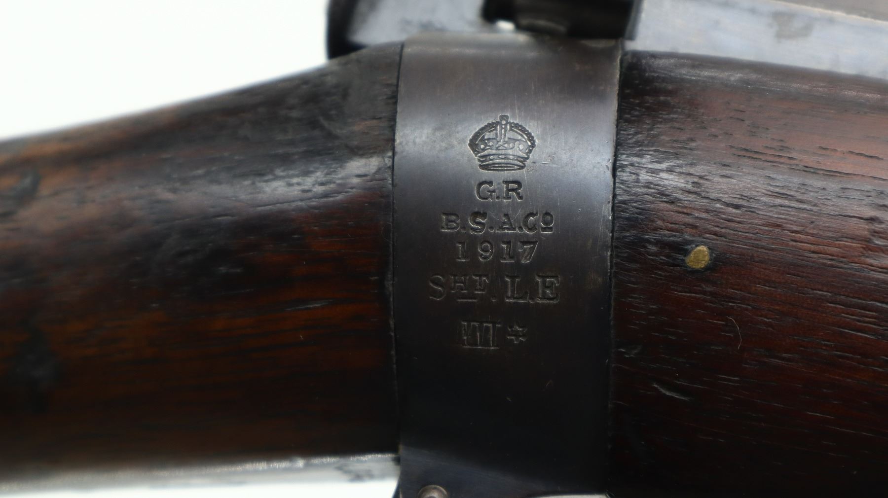 7/10, LEE ENFIELD, MODEL: NO1 MKIII*, CALIBER:303 BR, COMES WITH MAGAZINE, BORE IS GOOD, SOME SHINE. MANUFACTURED BY BSA 1917, VISIBLE NUMBERS MATCH. BLADE FRONT SIGHT WITH EARS, ADJUSTABLE U NOTCHED REAR SIGHT WITH EARS. FOUR PIECE FULL MILITARY WOOD STOCKS, PISTOL GRIP, SMOOTH BRASS BUTT PLATE WITH TRAP, BRASS STOCK DISK, SWIVELS, STACKING SWIVEL, BAYONET LUG. METAL FINISH SHOWS SOME SCRATCHES, HANDLING MARKS AND WEAR. STOCKS SHOW SOME MARKS, SCRATCHES AND WEAR. , ACTION: BOLT ACTION RIFLE, BARREL LENGTH: 25.25", SERIAL # E64149, CONDITION: 7/10, CLASS: CANADIAN NON RESTRICTED