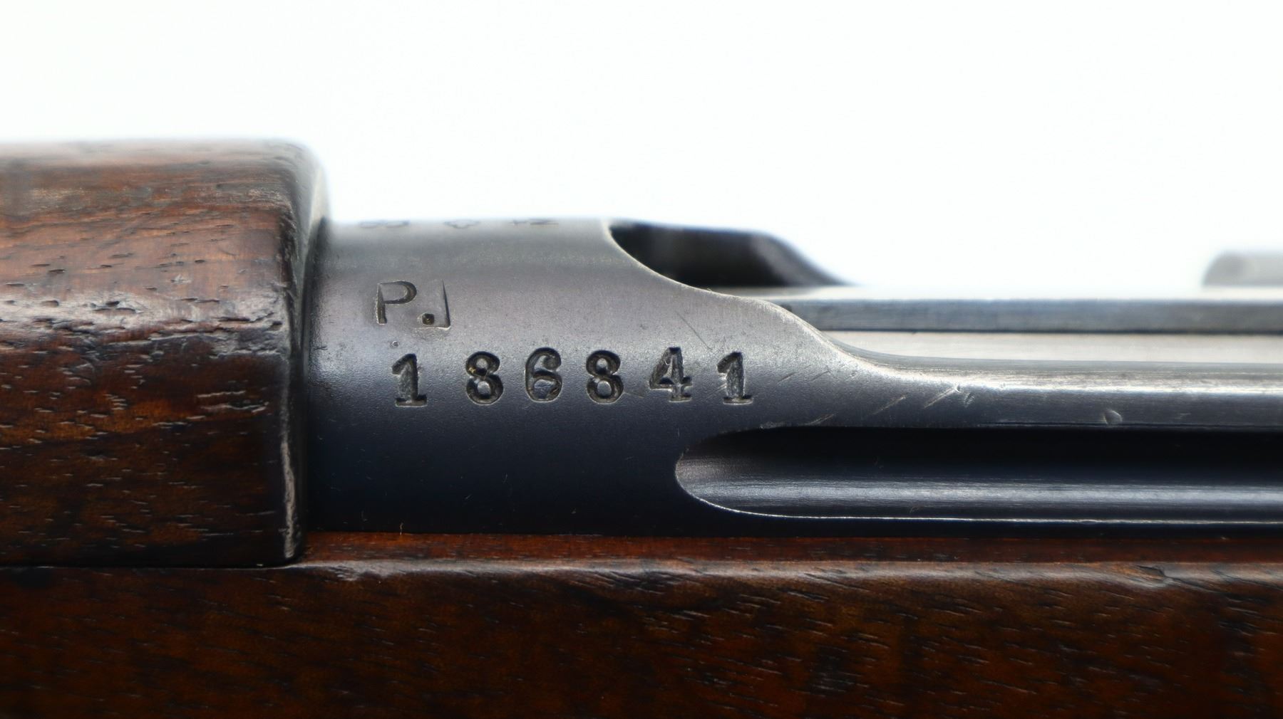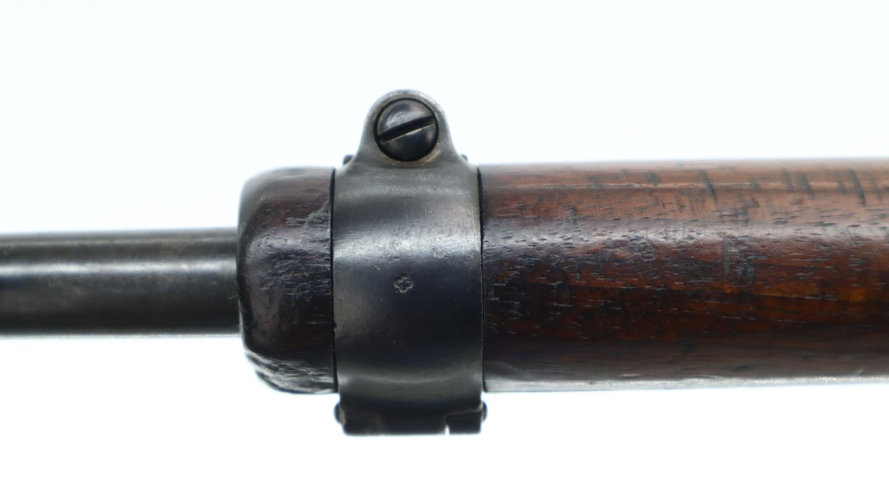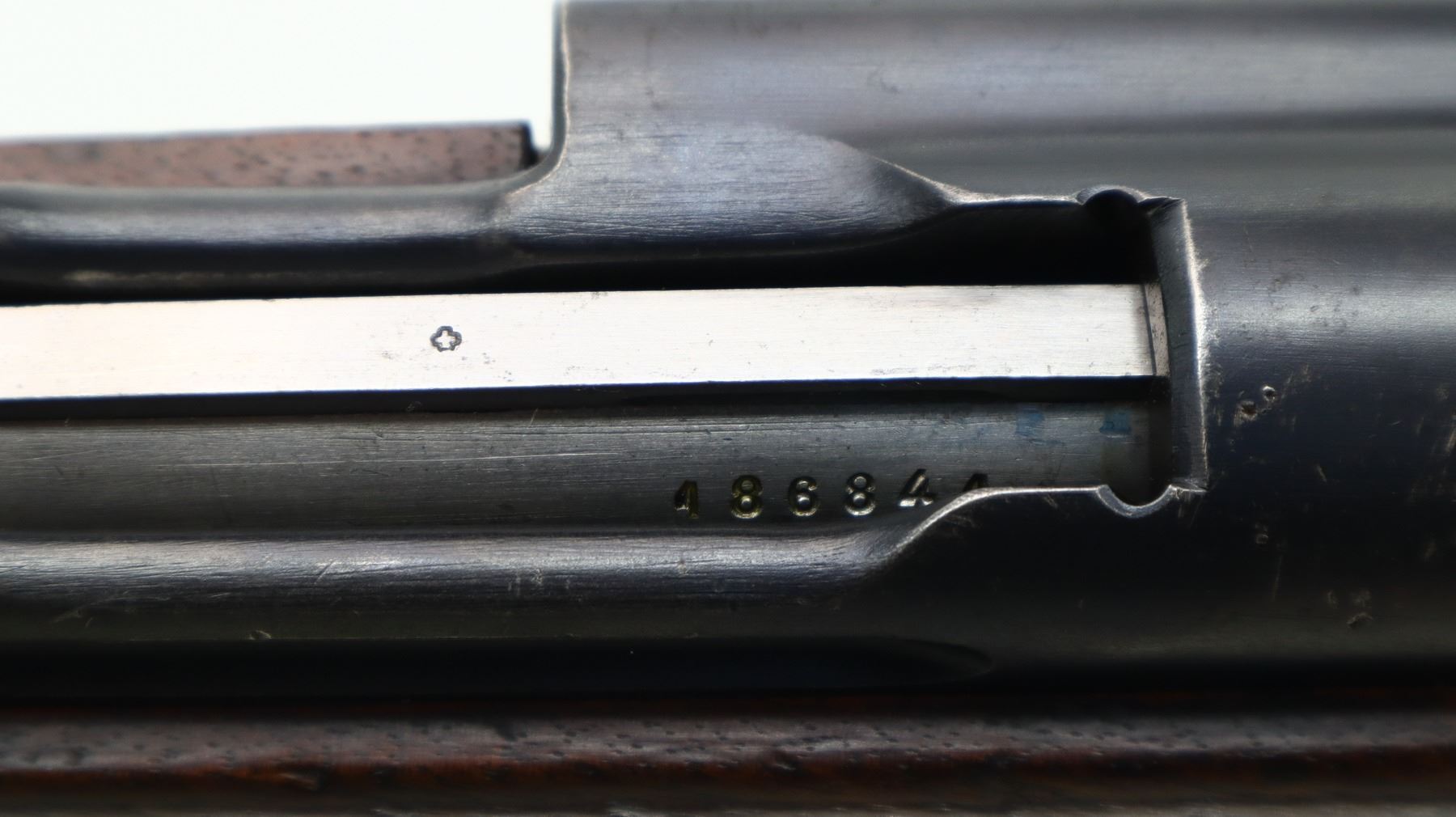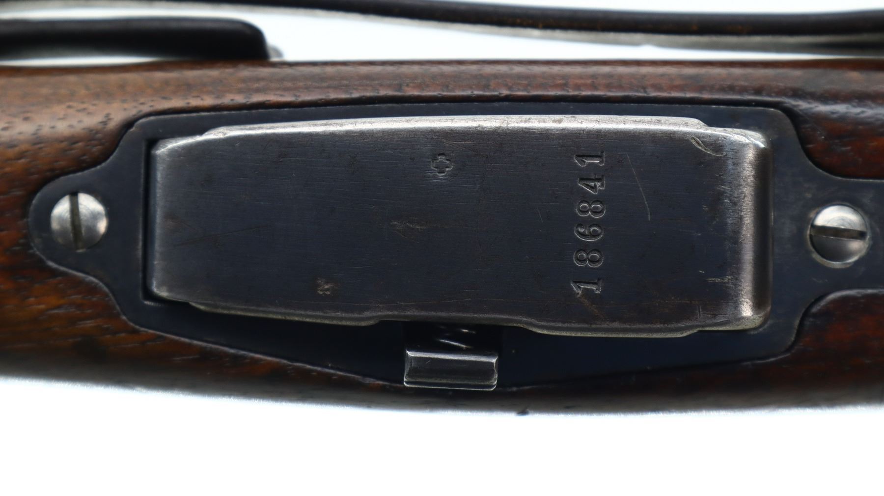 7/10, SWISS SCHMIDT RUBIN, MODEL: K11 CARBINE, CALIBER:7.5 X 55, COMES WITH MATCHING BAYONET, COVER, BORE IS GOOD, SHINY. MANUFACTURED 1930, VISIBLE NUMBERS MATCH INCLUDING MATCHING M1914 SAWBACK SWORD BAYONET. BLADE FRONT SIGHT WITH EARS AND RAMP, ADJUSTABLE U NOTCHED REAR SIGHT, BROWN POLYMER BOLT KNOBS, SILVER BOLT. TWO PIECE FULL MILITARY WOOD STOCKS, FINGER GROOVED FOREND, PISTOL GRIP, SMOOTH STEEL BUTT PLATE, SLING SWIVELS WITH SWISS BROWN LEATHER MILITARY SLING, STACKING HOOK, BAYONET LUG. BAYONET MANUFACTURED BY NEUHAUSEN WITH MATCHING 186841 SERIAL NUMBER, WOOD GRIPS, LEATHER AND STEEL SCABBARD WITH BROWN LEATHER FROG WITH SWISS MARKINGS. METAL FINISH SHOWS SOME SCRATCHES, HANDLING MARKS AND WEAR. STOCKS SHOW SOME DINGS, SCRATCHES AND WEAR. , ACTION: STRAIGHT PULL RIFLE, BARREL LENGTH: 23.5", SERIAL # 186841, CONDITION: 7/10, CLASS: CANADIAN NON RESTRICTED