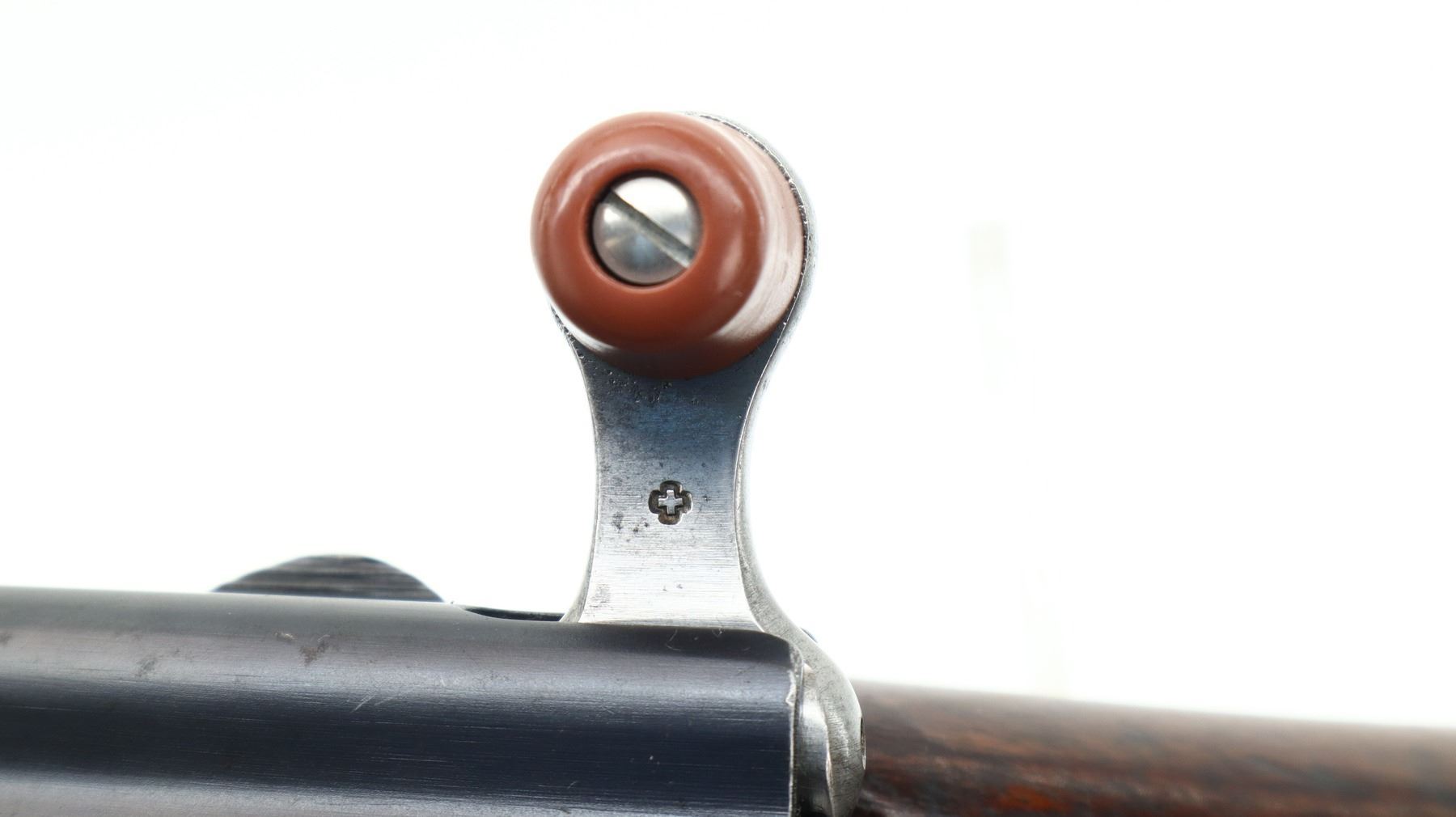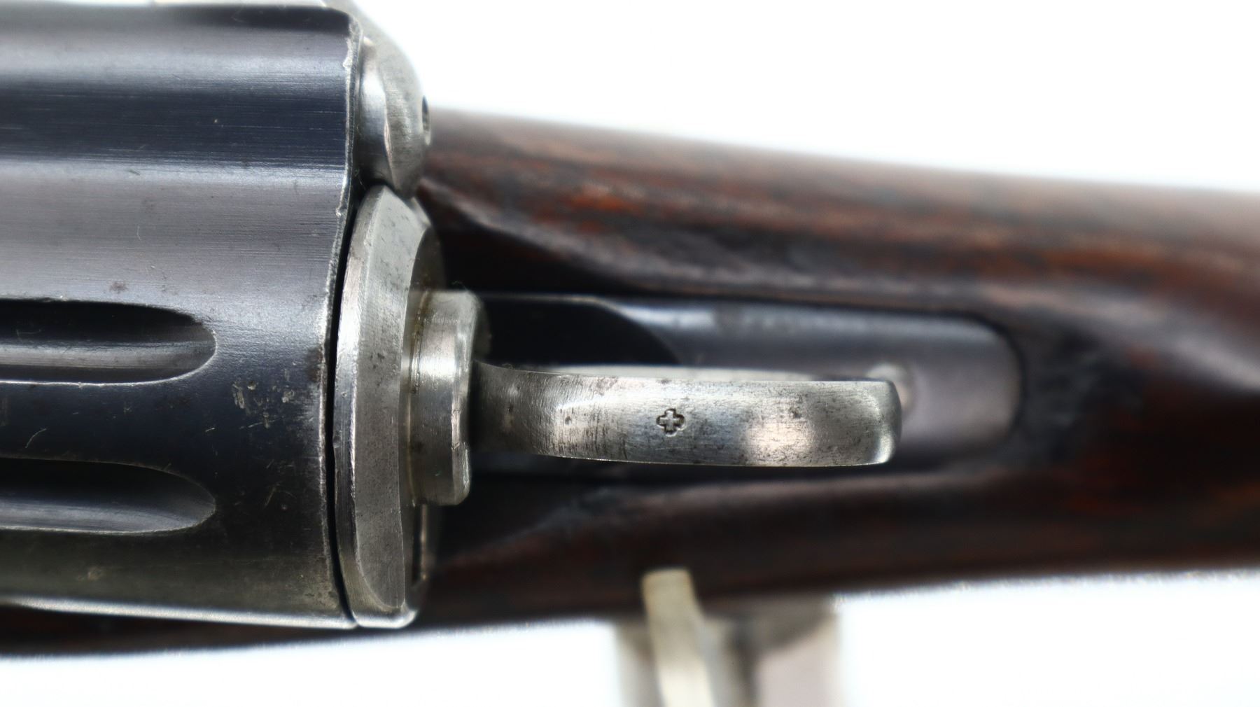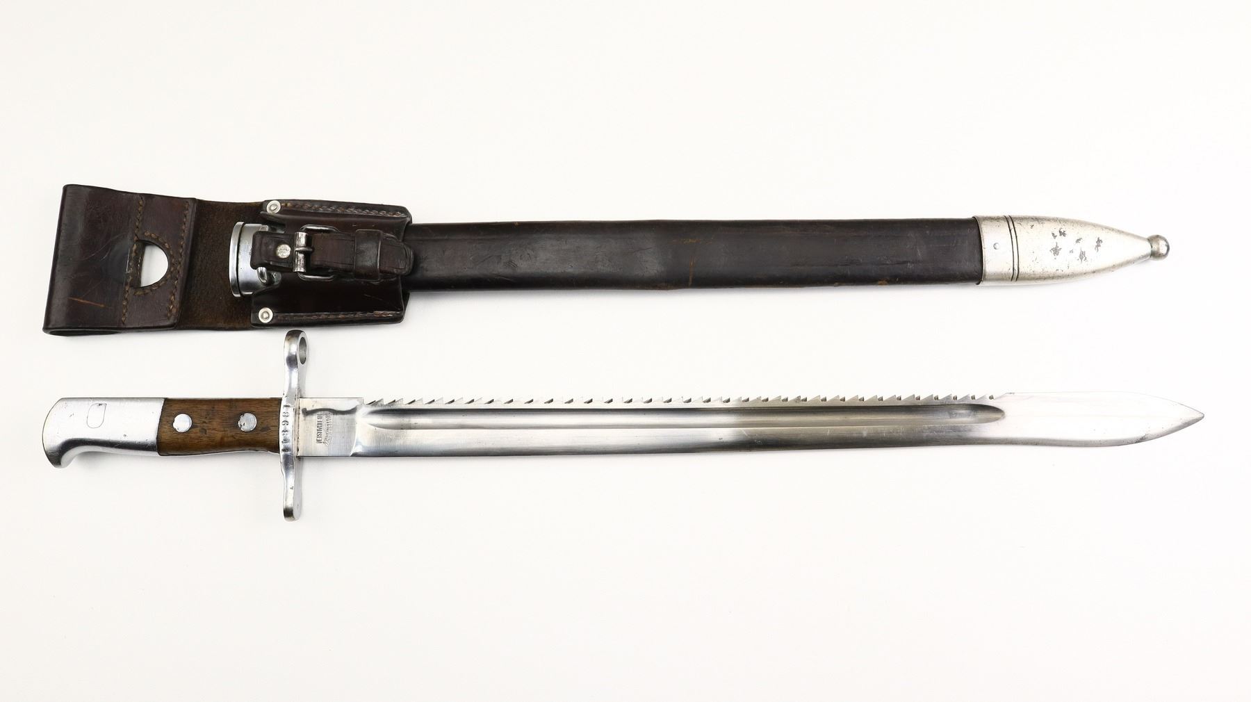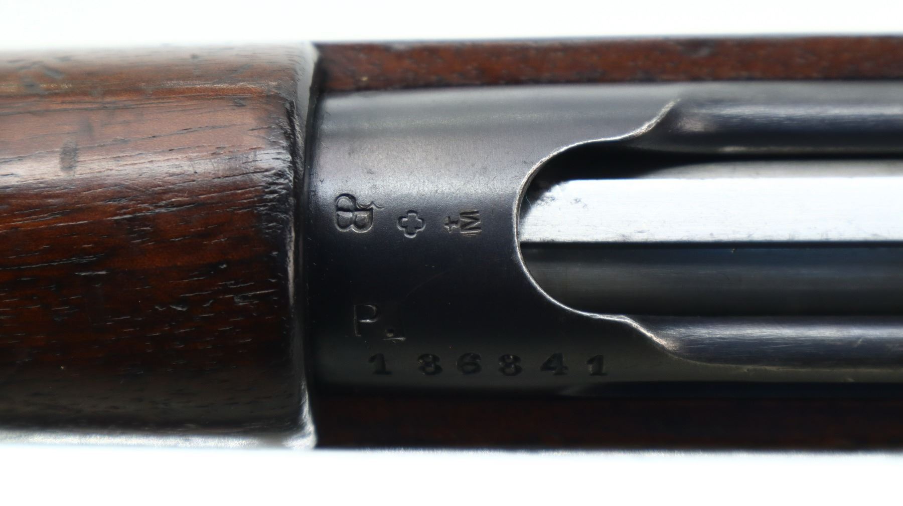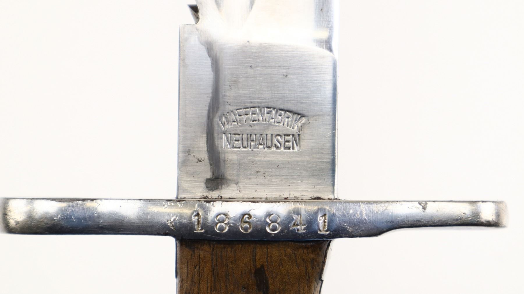 7/10, SWISS SCHMIDT RUBIN, MODEL: K11 CARBINE, CALIBER:7.5 X 55, COMES WITH MATCHING BAYONET, COVER, BORE IS GOOD, SHINY. MANUFACTURED 1930, VISIBLE NUMBERS MATCH INCLUDING MATCHING M1914 SAWBACK SWORD BAYONET. BLADE FRONT SIGHT WITH EARS AND RAMP, ADJUSTABLE U NOTCHED REAR SIGHT, BROWN POLYMER BOLT KNOBS, SILVER BOLT. TWO PIECE FULL MILITARY WOOD STOCKS, FINGER GROOVED FOREND, PISTOL GRIP, SMOOTH STEEL BUTT PLATE, SLING SWIVELS WITH SWISS BROWN LEATHER MILITARY SLING, STACKING HOOK, BAYONET LUG. BAYONET MANUFACTURED BY NEUHAUSEN WITH MATCHING 186841 SERIAL NUMBER, WOOD GRIPS, LEATHER AND STEEL SCABBARD WITH BROWN LEATHER FROG WITH SWISS MARKINGS. METAL FINISH SHOWS SOME SCRATCHES, HANDLING MARKS AND WEAR. STOCKS SHOW SOME DINGS, SCRATCHES AND WEAR. , ACTION: STRAIGHT PULL RIFLE, BARREL LENGTH: 23.5", SERIAL # 186841, CONDITION: 7/10, CLASS: CANADIAN NON RESTRICTED