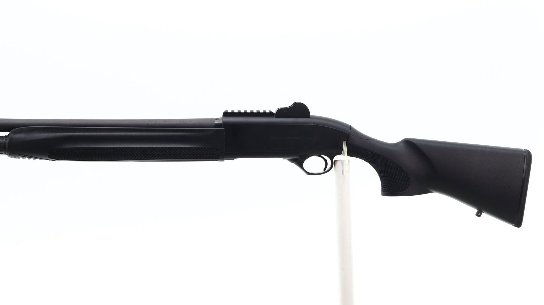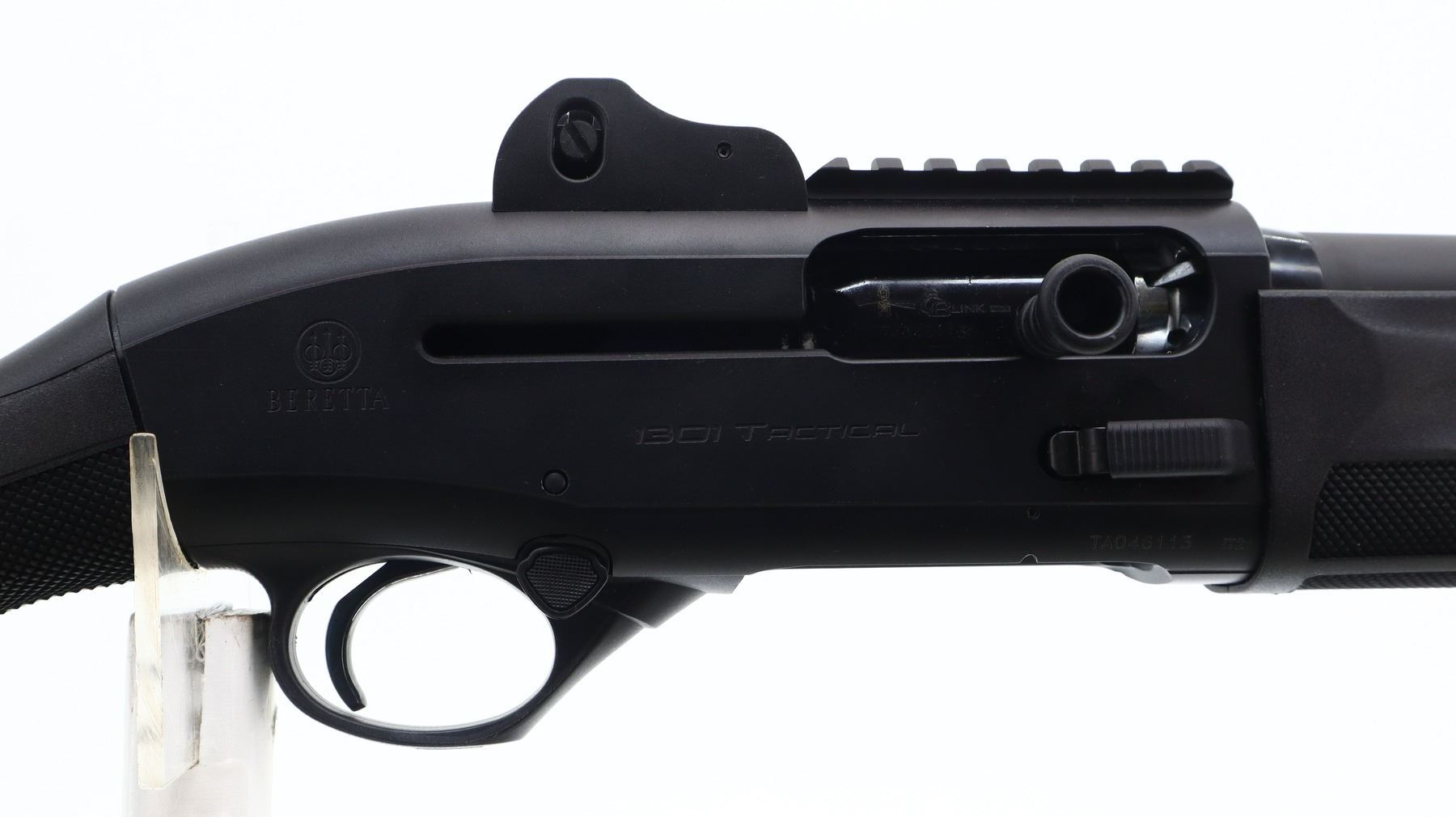 8/10, BENELLI, MODEL: 1301 TACTICAL, CALIBER:12 G X 3 1/2", COMES WITH HARD CASE, BORE IS EXCELLENT. HAS REMOVABLE CYLINDER CHOKE. BLADE FRONT SIGHT WITH EARS AND RAMP, ADJUSTABLE PEEP SIGHT WITH EARS, BLACK MATTE FINISH BARREL, BLACK ALLOY RECEIVER WITH SHORT ONE PIECE RAIL INSTALLED, GROOVED EXTENDED BOLT KNOB, BOLT RELEASE. TWO PIECE BLACK SYNTHETIC STOCKS, CHECKERED FOREARM AND PISTOL GRIP, BLACK RUBBER RECOIL PAD, SLING SWIVELS, CHECKERED LARGE HEAD SAFETY. METAL FINISH SHOWS SOME SCRATCHES, HANDLING MARKS AND WEAR. STOCKS SHOW SOME MARKS AND SCRATCHES. , ACTION: SEMI AUTOMATIC SHOTGUN, BARREL LENGTH: 19.5", SERIAL # TA046113, CONDITION: 8/10, CLASS: CANADIAN NON RESTRICTED