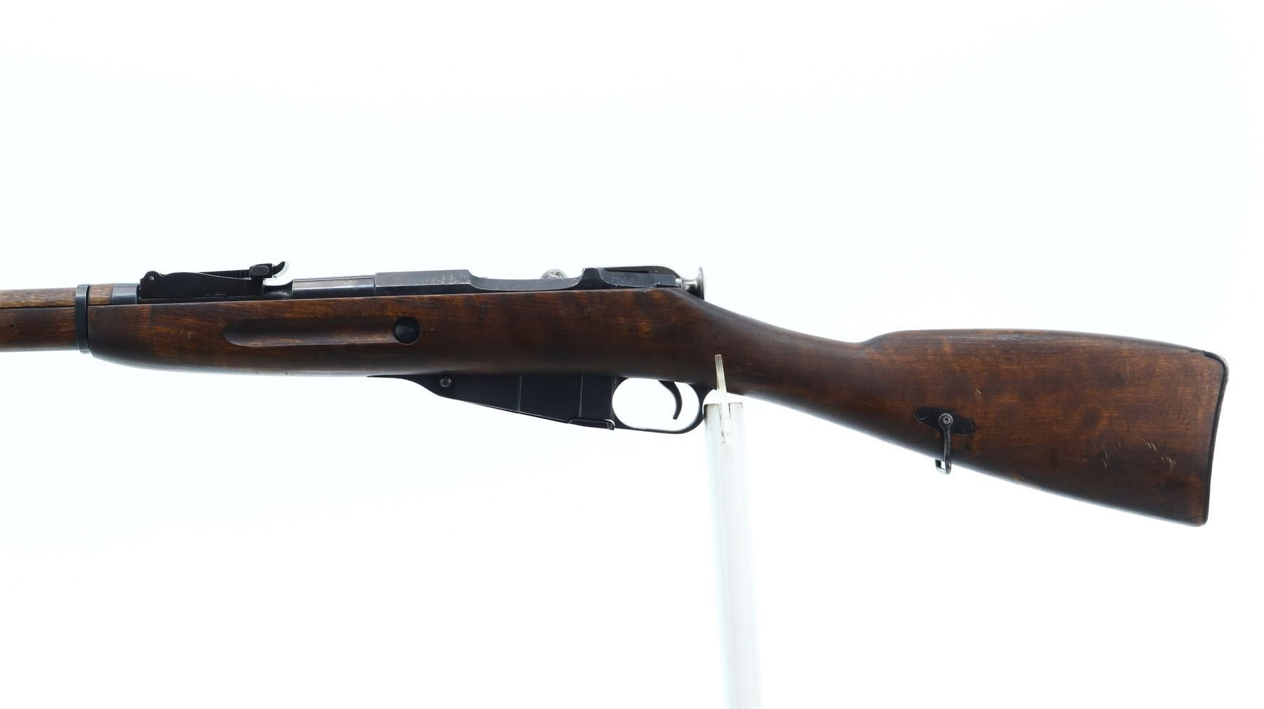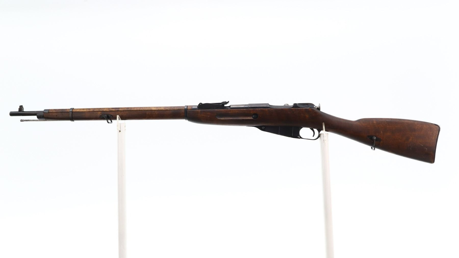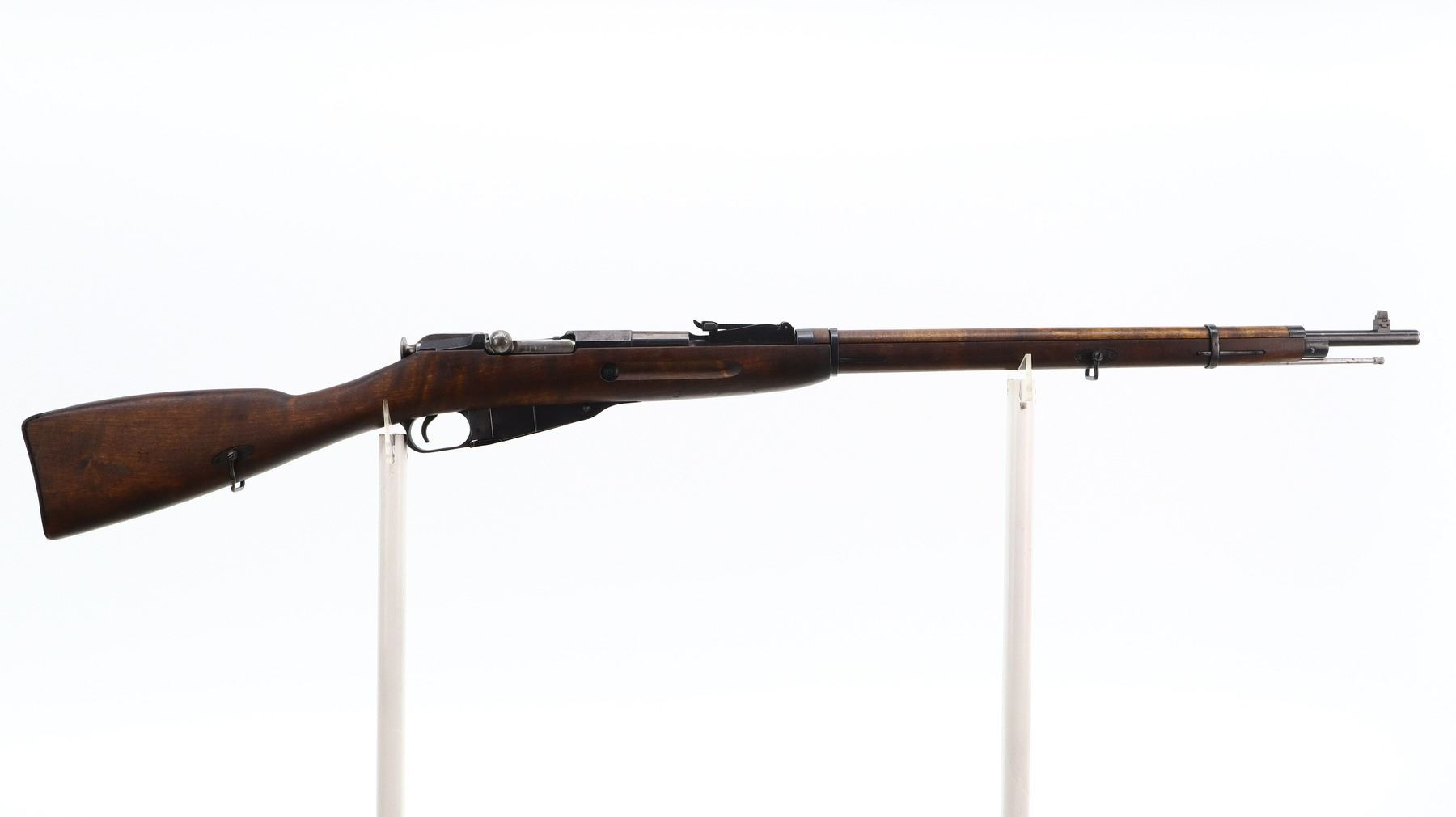 7+/10, FINNISH MOSIN NAGANT, MODEL: 91/30, CALIBER:7.62X54R, BORE IS VERY GOOD, SHINY. FINNISH REBUILD BOLT NUMBERED TO MATCH, BLADE FRONT SIGHT WITH RAMP, ADJUSTABLE U NOTCHED REAR SIGHT, TIKKA BARREL DATED 1944 WITH "SA" STAMP, HEX RECEIVER, SILVER BOLT WITH STRAIGHT HANDLE. TWO PIECE FULL MILITARY WOOD STOCKS, FINGER GROOVE FOREND, STRAIGHT GRIP, SMOOTH STEEL BUTT PLATE, FINNISH SLING SWIVELS AND CLEANING ROD. metal FINISH SHOWS SOME SCRATCHES, HANDLING MARKS AND WEAR. STOCKS SHOW SOME MARKS AD SCRATCHES., ACTION: BOLT ACTION RIFLE, BARREL LENGTH: 28.5", SERIAL # 59476, CONDITION: 7+/10, CLASS: CANADIAN NON RESTRICTED