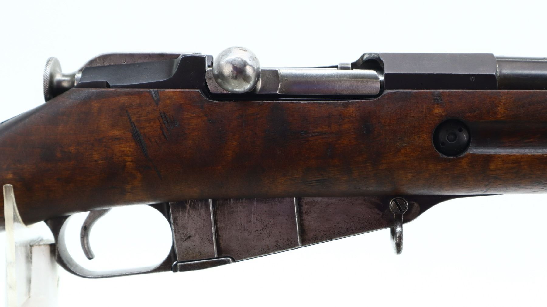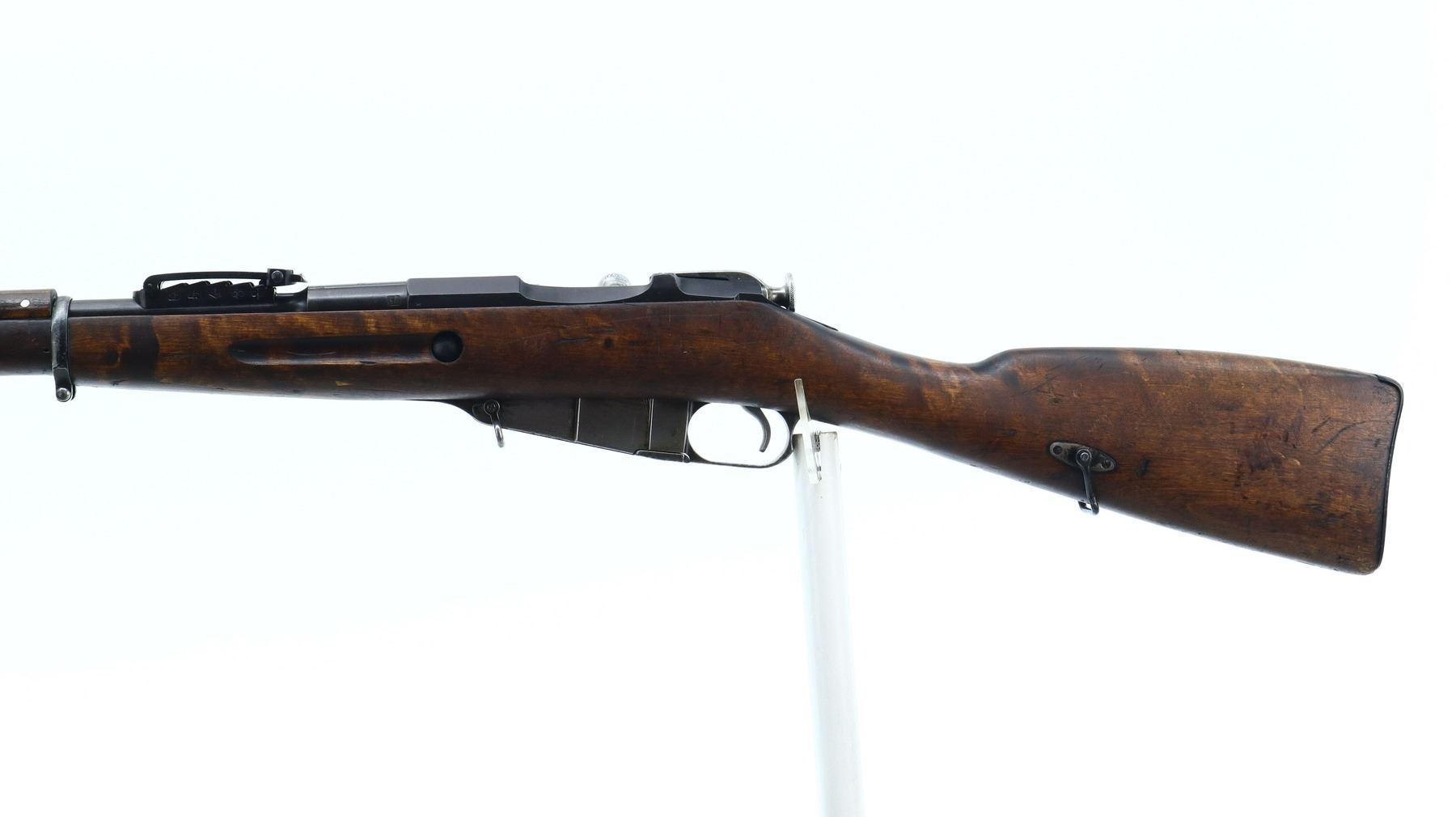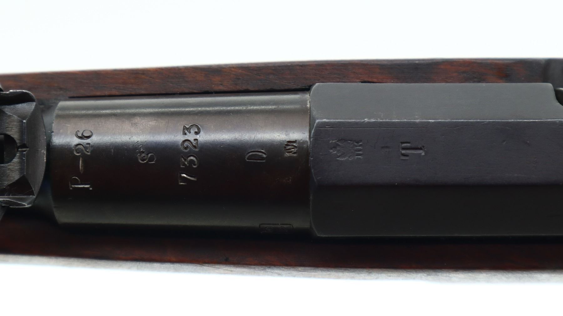 7/10, FINNISH MOSIN NAGANT, MODEL: 1891 P-26, CALIBER:7.62X54R, BORE IS GOOD, SOME SHINE. FINNISH REBUILD. BLADE FRONT SIGHT WITH RAMP, ADJUSTABLE U NOTCHED REAR SIGHT, BARREL P-26 S 7323 D WITH SA STAMP, BARREL IS RETUBED USING ITALIAN METHOD OF RELINING, HEX RECEIVER MARKED WITH LETTER T, SILVER BOLT WITH STRAIGHT HANDLE. TWO PIECE FULL MILITARY WOOD STOCKS, FINGER GROOVE FOREND, STRAIGHT GRIP, SMOOTH STEEL BUTT PLATE, PARTIAL SA STAMPED ON RIGHT SIDE OF STOCK, FINNISH SWIVELS AND CLEANING ROD. METAL FINISH SHOWS SOME SCRATCHES, HANDLING MARKS AND WEAR. STOCKS SHOW SOME MARKS, SCRATCHES AND WEAR., ACTION: BOLT ACTION RIFLE, BARREL LENGTH: 31.5", SERIAL # 7323, CONDITION: 7/10, CLASS: CANADIAN NON RESTRICTED
