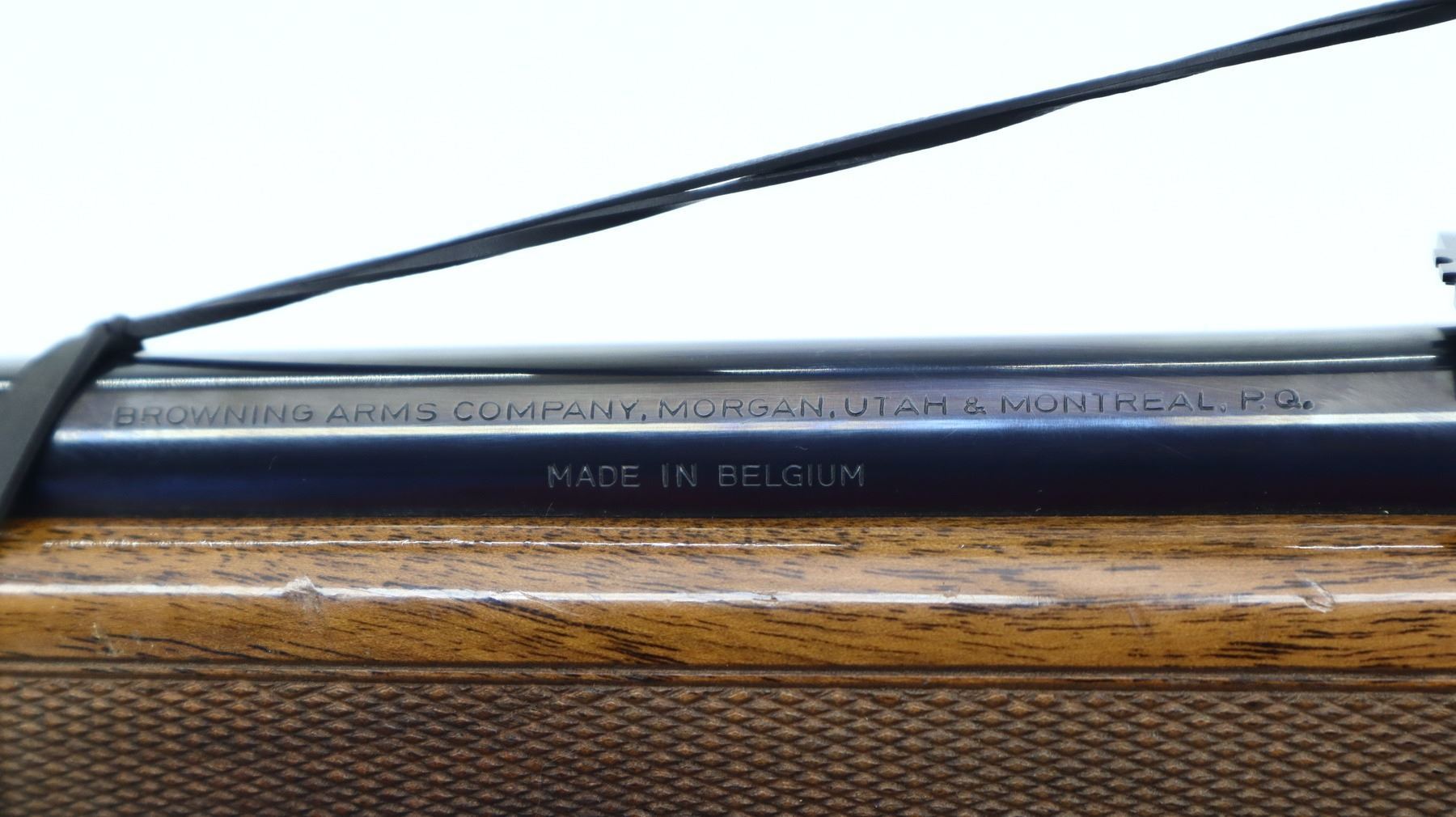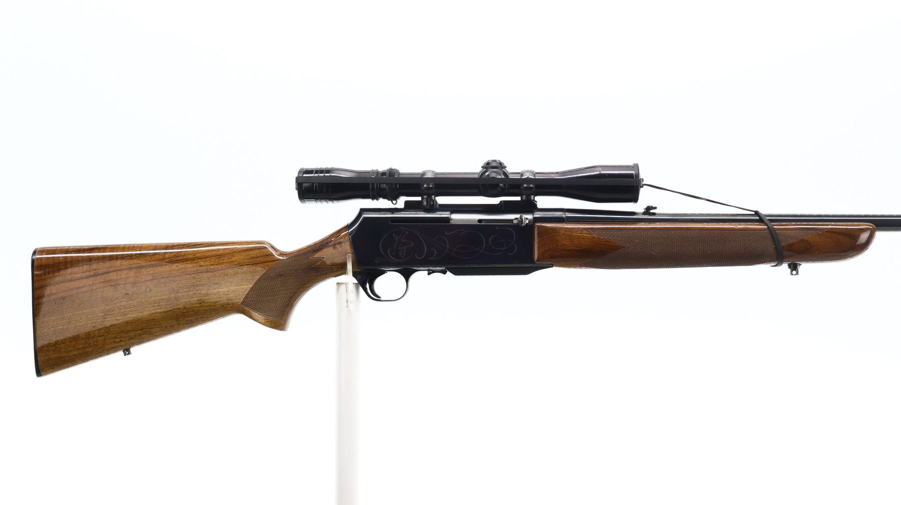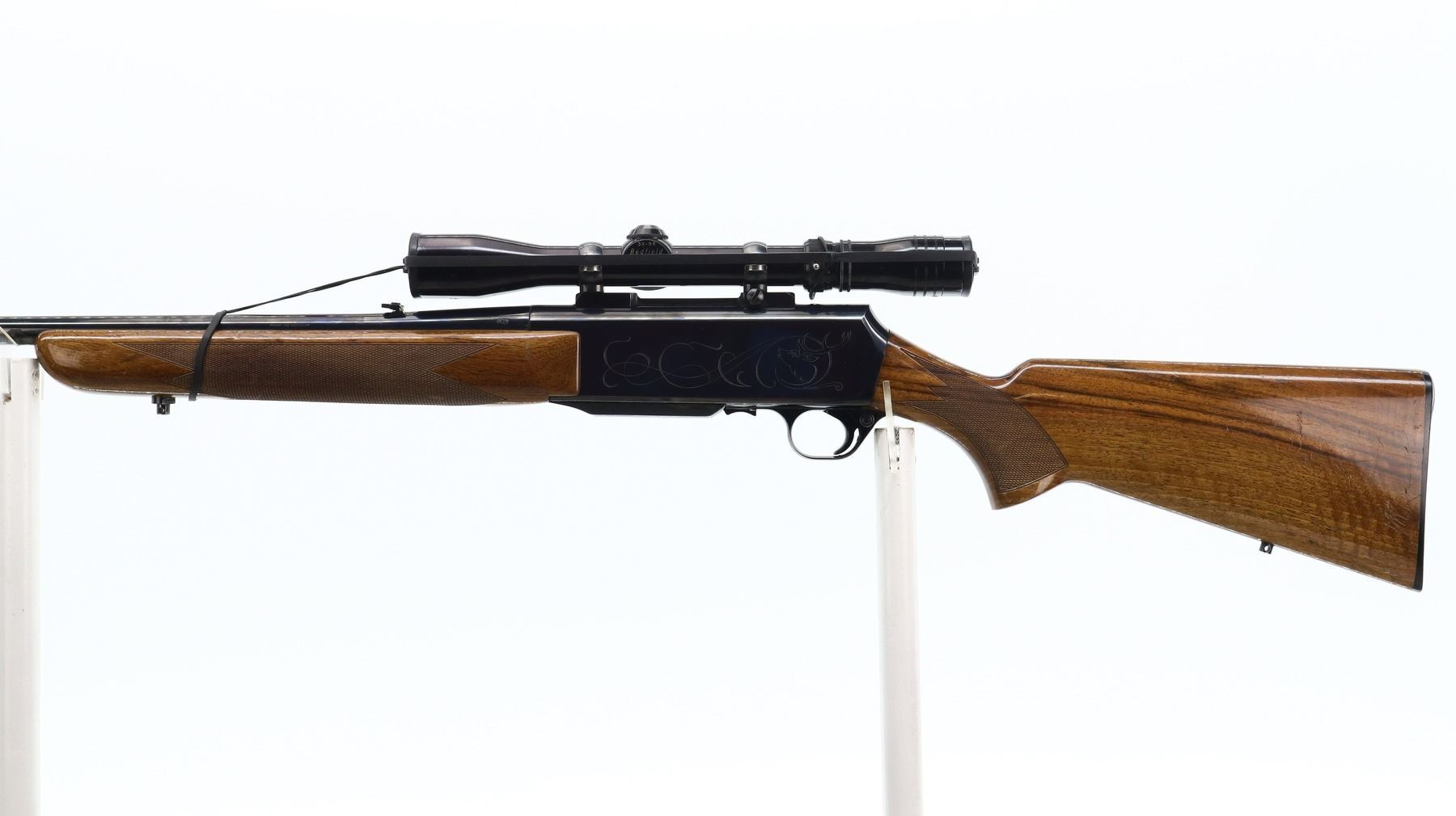 7+/10, FN BROWNING, MODEL: BAR SAFARI, CALIBER:270 WIN, COMES WITH MAGAZINE, SOCK, CHAMBER FLAG, BORE IS VERY GOOD. BLADE FRONT SIGHT WITH RAMP, ADJUSTABLE FOLDING U NOTCHED REAR SIGHT, BLUED FINISH, ENGRAVED RECEIVER, DRILLED AND TAPED WITH REDFIELD 3-9 X 32 WA SCOPE, CLEAR OPTICS, DUPLEX CROSSHAIR. TWO PIECE WOOD STOCKS, CHECKERED FOREARM AND PISTOL GRIP, TEXTURED BLACK POLYMER BROWNING BUTT PLATE, SWIVEL STUDS. METAL FINISH SHOWS SOME SCRATCHES, HANDLING MARKS AND WEAR. STOCKS SHOW SOME MARKS, SCRATCHES AND WEAR. , ACTION: SEMI AUTOMATIC RIFLE, BARREL LENGTH: 22", SERIAL # 57478M70, CONDITION: 7+/10, CLASS: CANADIAN NON RESTRICTED