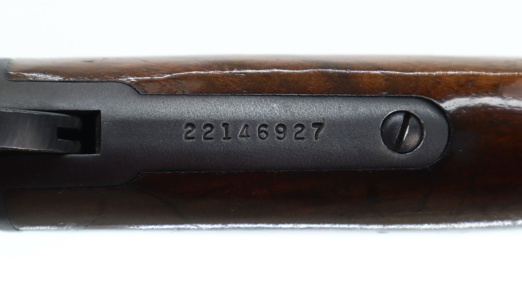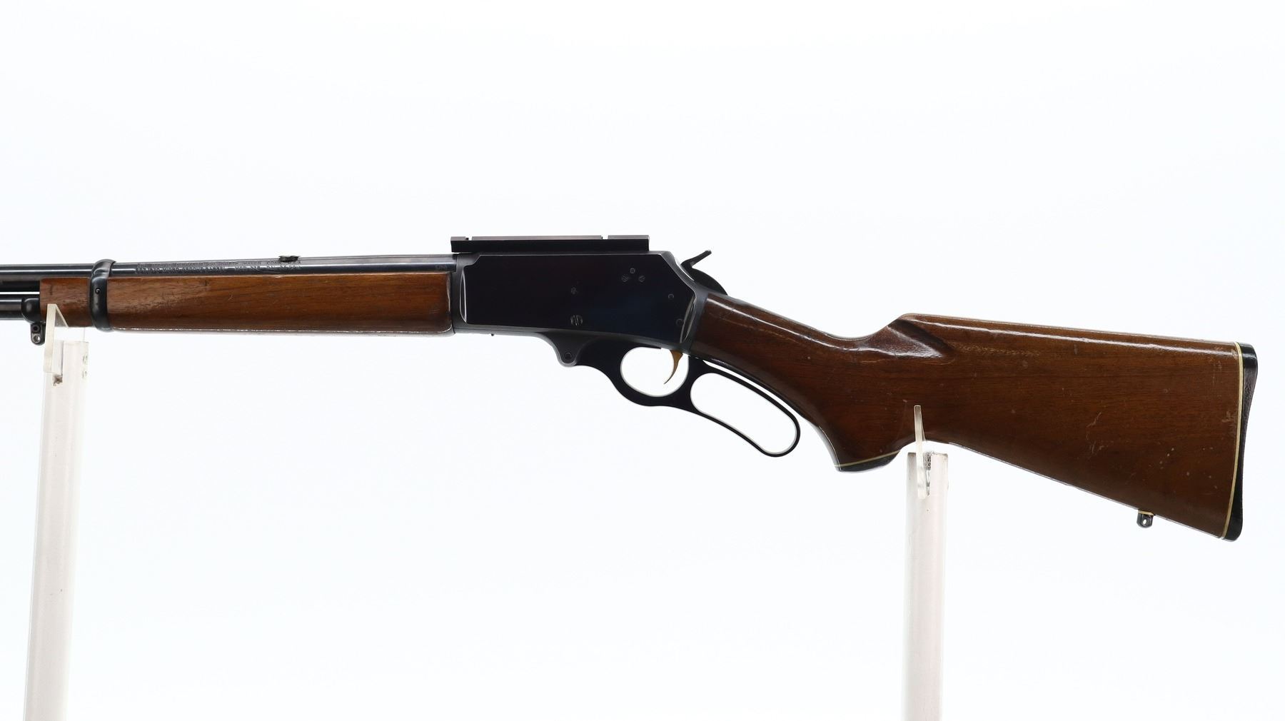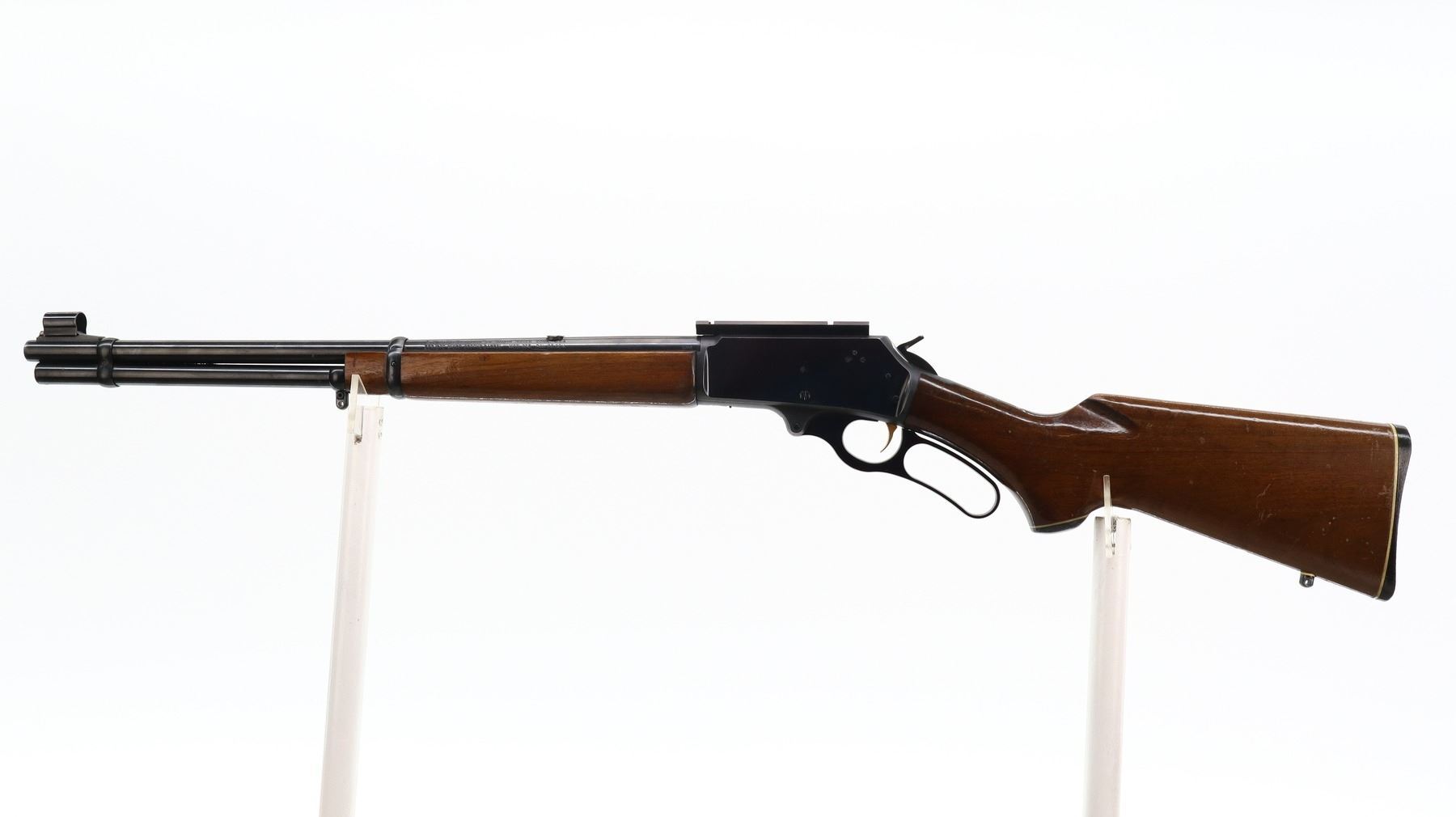 7/10, MARLIN JM, MODEL: 336, CALIBER:35 REM, BORE IS VERY GOOD. BLADE FRONT SIGHT WITH HOOD AND RAMP, REAR SIGHT REMOVED, SLOT BLANK INSTALLED, RECEIVER DRILLED AND TAPED WITH ON PIECE SCOPE BASE INSTALLED, GROOVED SPUR HAMMER AND GOLD TRIGER. TWO PIECE SMOOTH WOOD STOCKS, PISTOL GRIP, CHECKERED BLACK POLYMER BUTT PLATE, GRIP CAP, SWIVEL STUDS AND FULL LENGTH MAG TUBE. METAL FINISH SHOWS SOME SCRATCHES, HANDLING MARKS AND WEAR. STOCKS SHOW SOME MARKS, SCRATCHES AND WEAR. , ACTION: LEVER ACTION RIFLE, BARREL LENGTH: 20", SERIAL # 22146927, CONDITION: 7/10, CLASS: CANADIAN NON RESTRICTED