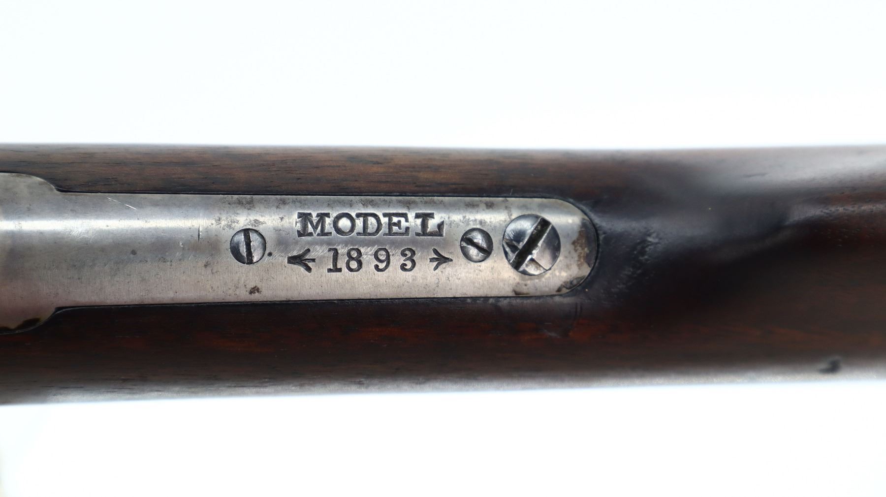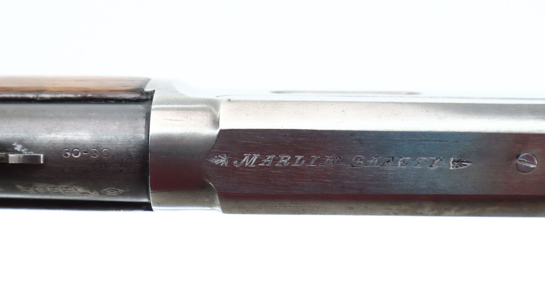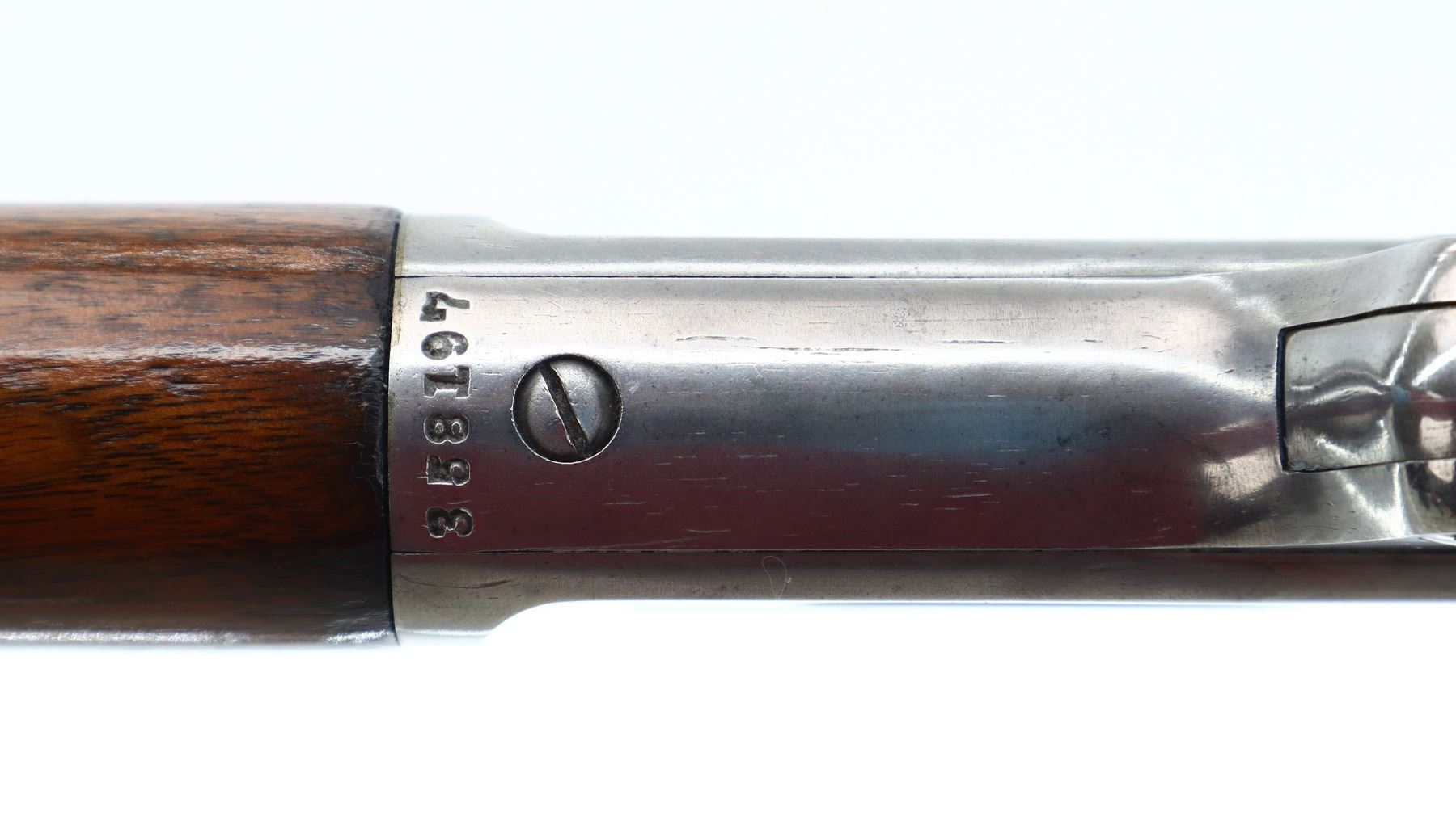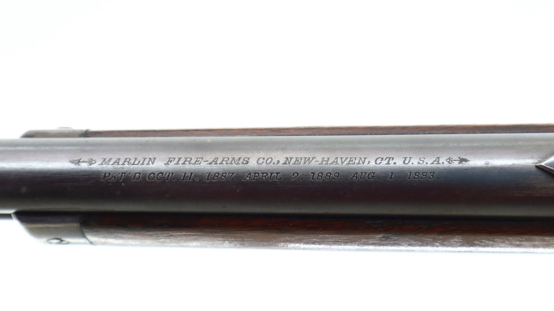 7/10, MARLIN, MODEL: 1893, CALIBER:30-30 WIN, BORE IS VERY GOOD. BLADE FRONT SIGHT, ADJUSTABLE U NOTCHED REAR SIGHT, BLUED BARREL AND MAG TUBE, SILVER RECEIVER WITH TRACES OF COLOUR CASED HARDENING, CHECKERED SPUR HAMMER. TWO PIECE SMOOTH WOOD STOCKS, STRAIGHT GRIP, SMOOTH CURVED STEEL BUTT PLATE AND FULL LENGTH MAG TUBE. METAL FINISH SHOWS SOME SCRATCHES, HANDLING MARKS AND WEAR. STOCKS SHOW SOME MARKS, SCRATCHES AND WEAR., ACTION: LEVER ACTION RIFLE, BARREL LENGTH: 20", SERIAL # 358197, CONDITION: 7/10, CLASS: CANADIAN NON RESTRICTED