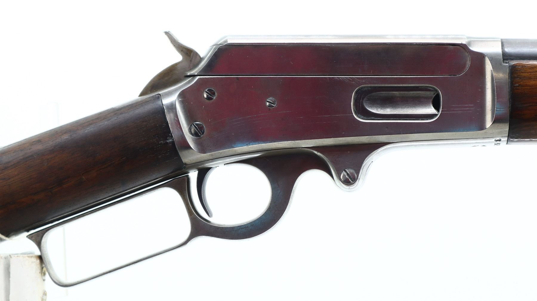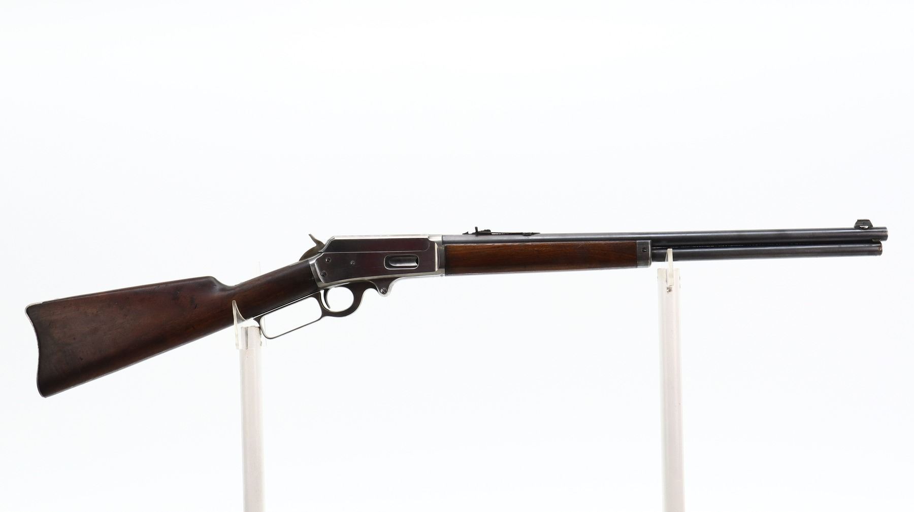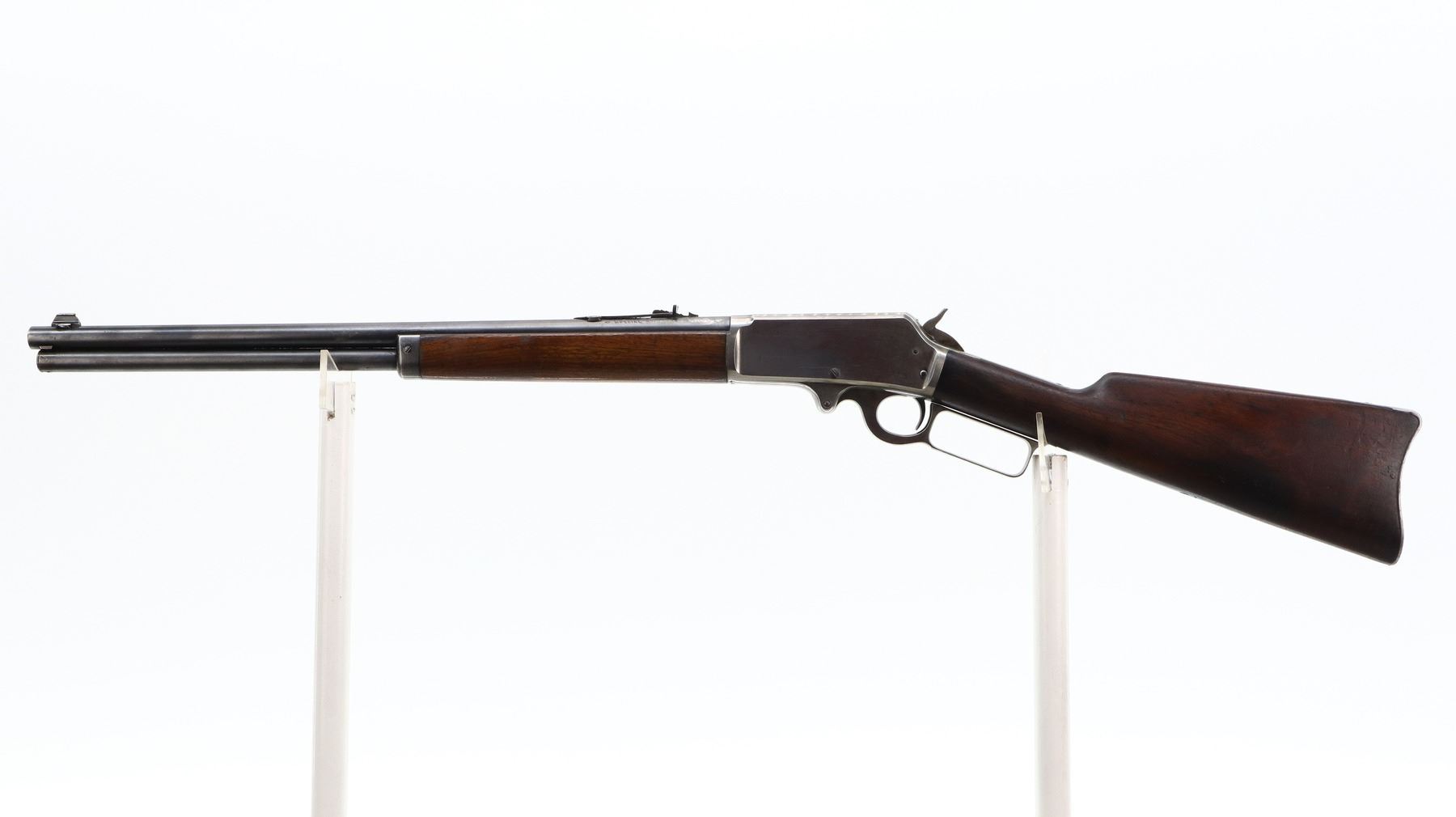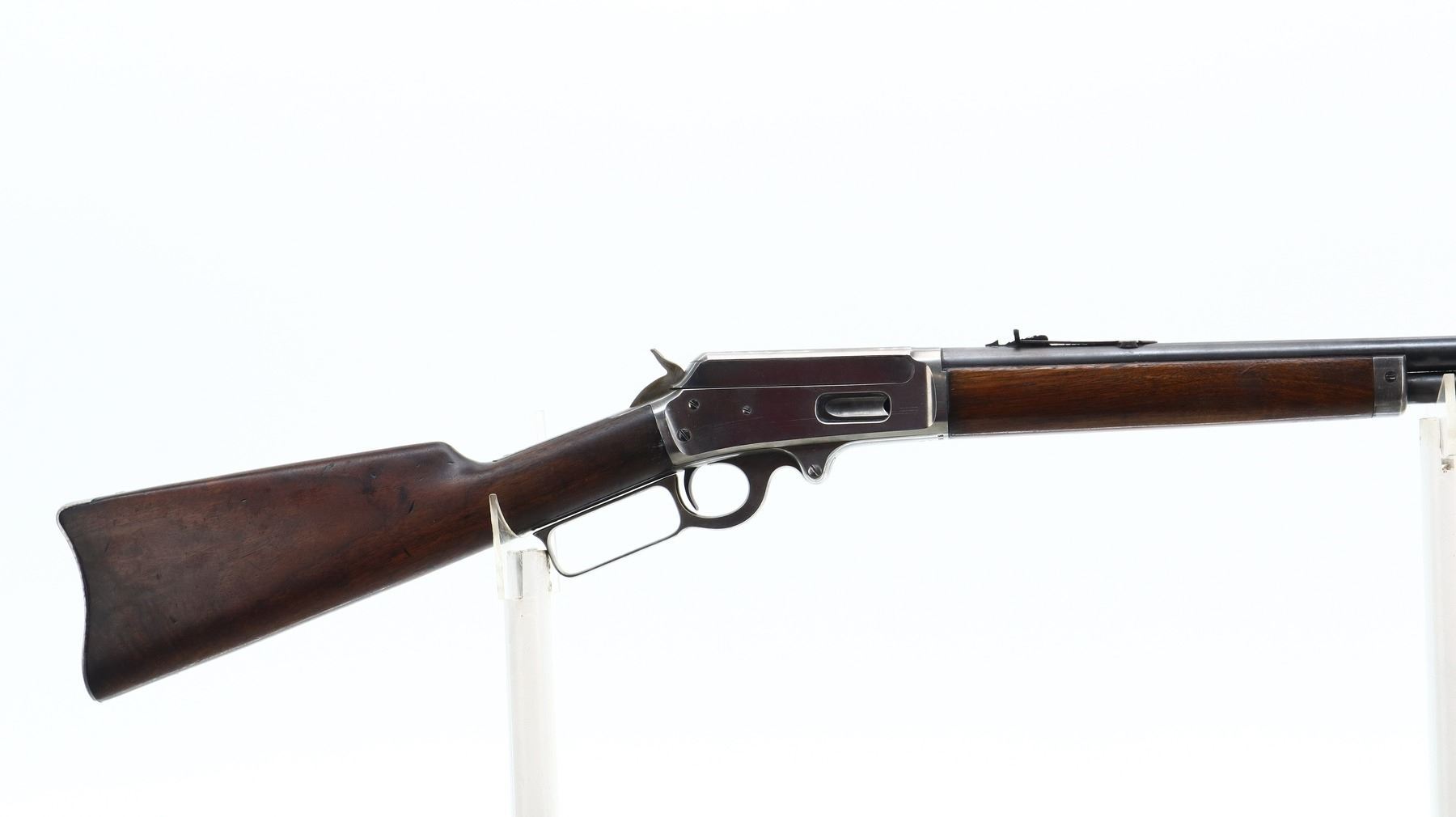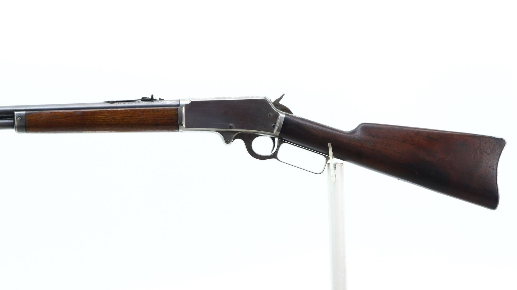 7/10, MARLIN, MODEL: 1893, CALIBER:30-30 WIN, BORE IS VERY GOOD. BLADE FRONT SIGHT, ADJUSTABLE U NOTCHED REAR SIGHT, BLUED BARREL AND MAG TUBE, SILVER RECEIVER WITH TRACES OF COLOUR CASED HARDENING, CHECKERED SPUR HAMMER. TWO PIECE SMOOTH WOOD STOCKS, STRAIGHT GRIP, SMOOTH CURVED STEEL BUTT PLATE AND FULL LENGTH MAG TUBE. METAL FINISH SHOWS SOME SCRATCHES, HANDLING MARKS AND WEAR. STOCKS SHOW SOME MARKS, SCRATCHES AND WEAR., ACTION: LEVER ACTION RIFLE, BARREL LENGTH: 20", SERIAL # 358197, CONDITION: 7/10, CLASS: CANADIAN NON RESTRICTED