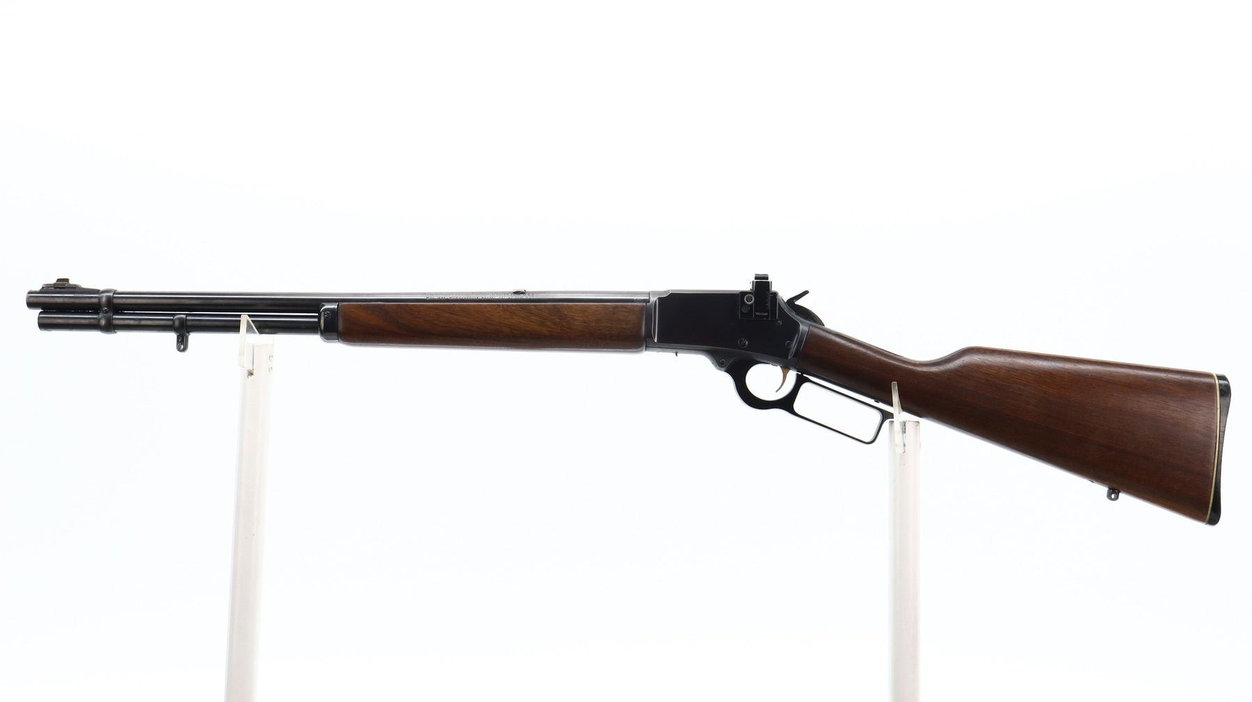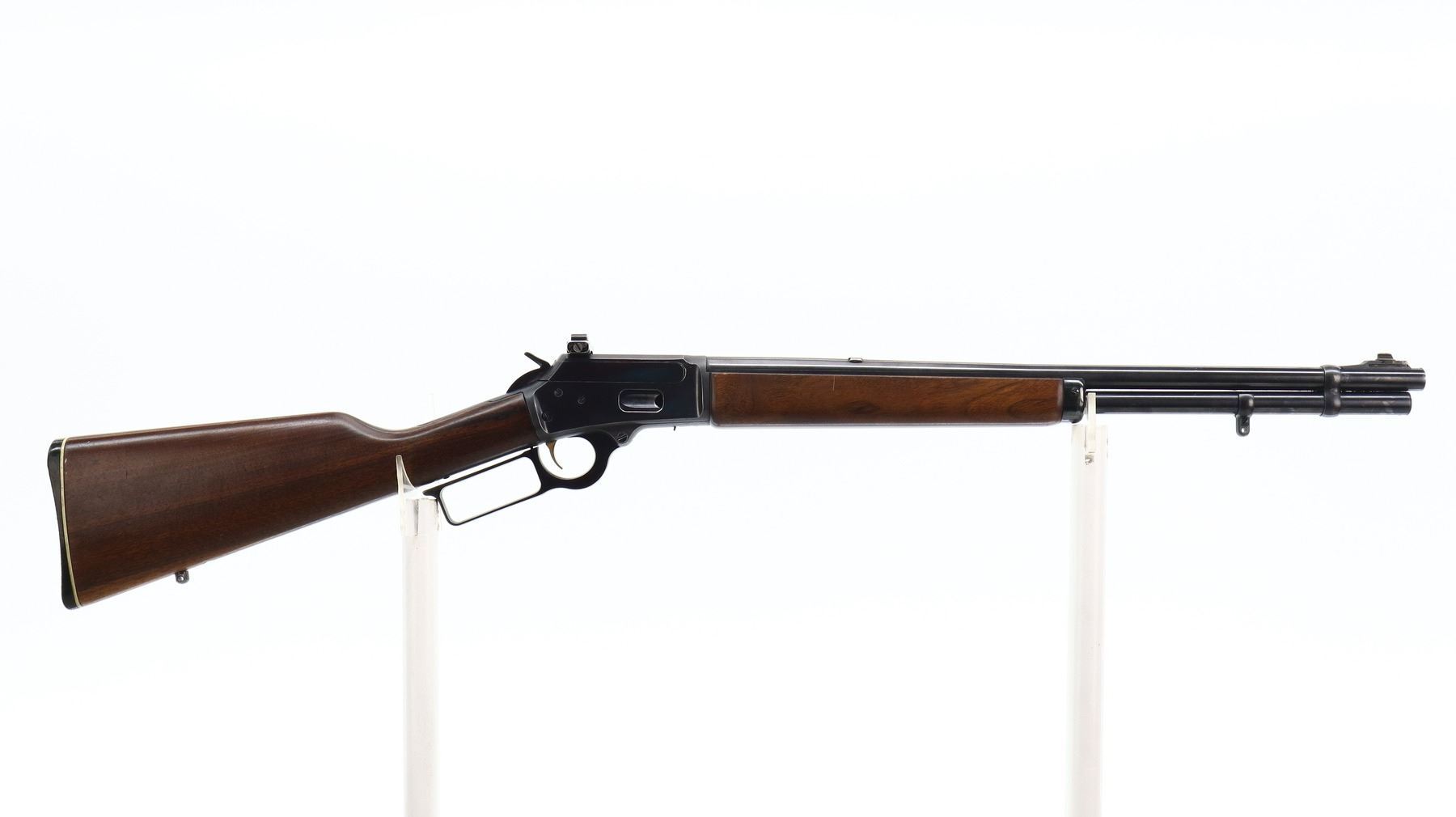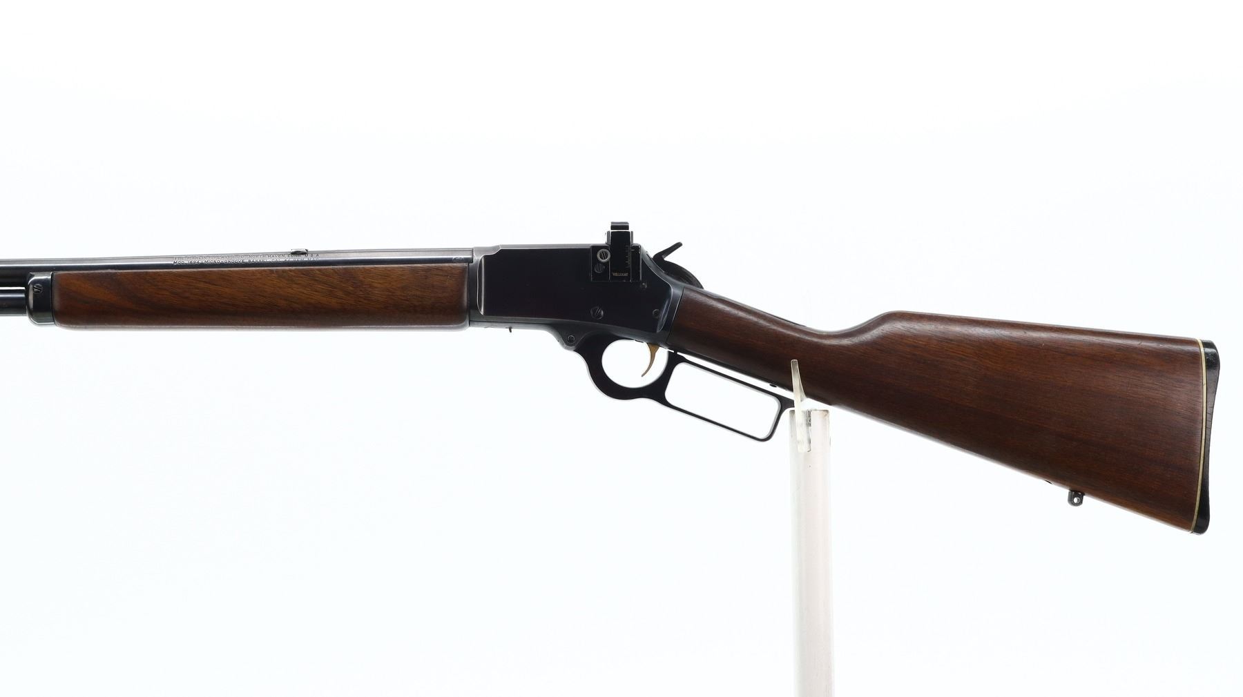 7/10, MARLIN JM, MODEL: 1894, CALIBER:44 MAG, BORE IS VERY GOOD. BLADE FRONT SIGHT WITH RAMP, REAR SIGHT REMOVED, SLOT BLANK INSTALLED, BLUED FINISH, RECEIVER DRILLED AND TAPED NO PLUG SCREWS INSTALLED, RECEIVER HAS AN ADJUSTABLE WILLIAMS PEEP SIGHT INSTALLED, GROOVED SPUR HAMMER. TWO PIECE SMOOTH WOOD STOCKS, STRAIGHT GRIP, CHECKERED BLACK POLYMER BUTT PLATE, SWIVEL STUDS AND FULL LENGTH MAG TUBE. METAL FINISH SHOWS SOME SCRATCHES, HANDLING MARKS AND WEAR. STOCKS SHOW SOME MARKS, SCRATCHES AND WEAR. , ACTION: LEVER ACTION RIFLE, BARREL LENGTH: 20.25", SERIAL # 22003179, CONDITION: 7/10, CLASS: CANADIAN NON RESTRICTED