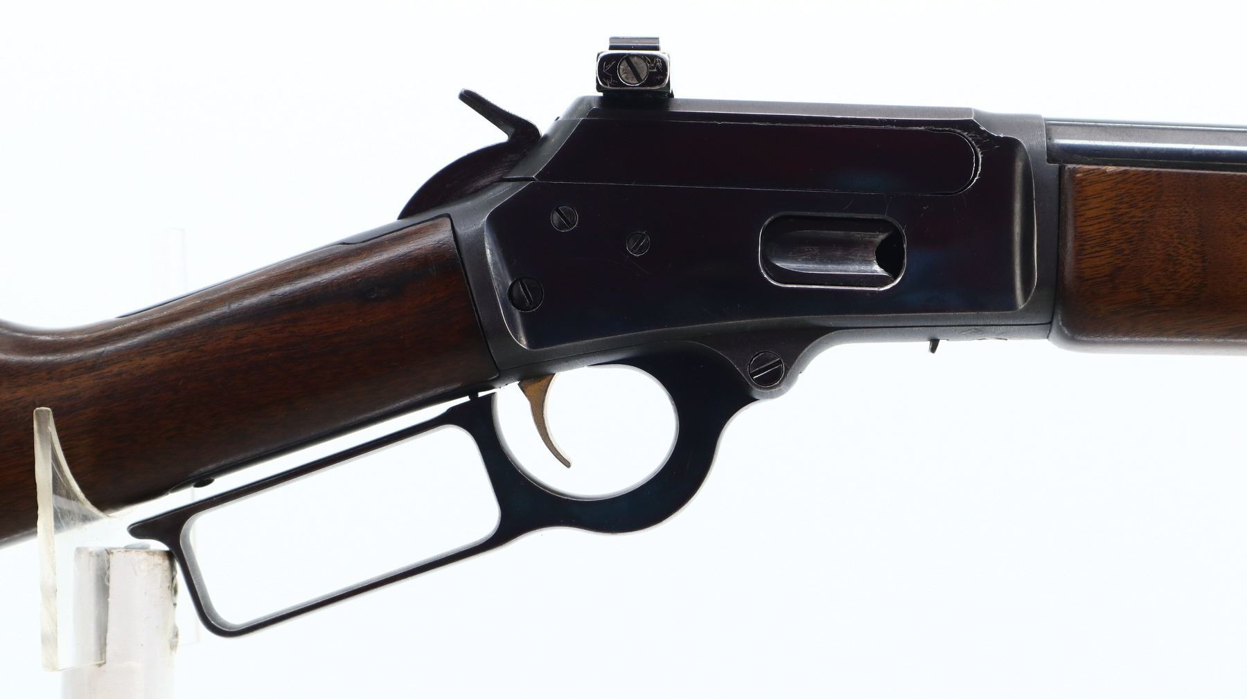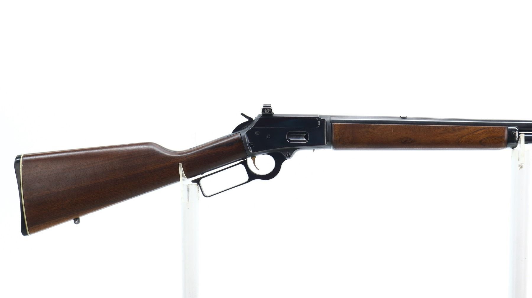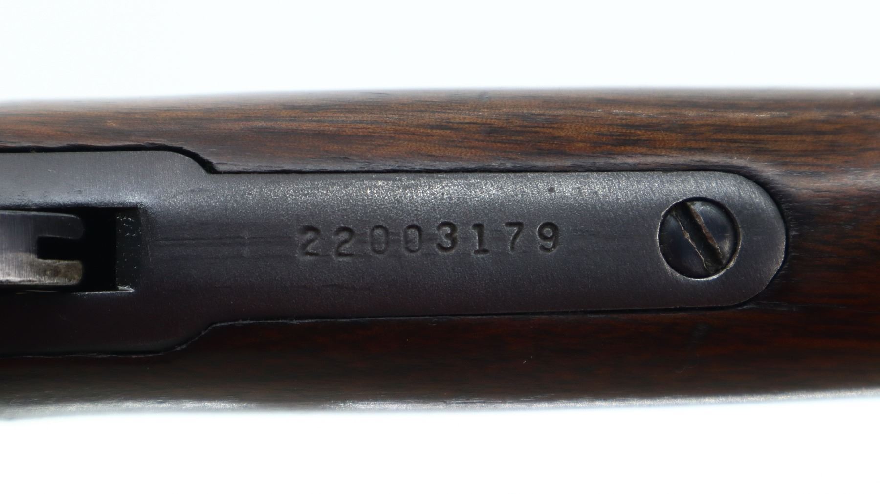 7/10, MARLIN JM, MODEL: 1894, CALIBER:44 MAG, BORE IS VERY GOOD. BLADE FRONT SIGHT WITH RAMP, REAR SIGHT REMOVED, SLOT BLANK INSTALLED, BLUED FINISH, RECEIVER DRILLED AND TAPED NO PLUG SCREWS INSTALLED, RECEIVER HAS AN ADJUSTABLE WILLIAMS PEEP SIGHT INSTALLED, GROOVED SPUR HAMMER. TWO PIECE SMOOTH WOOD STOCKS, STRAIGHT GRIP, CHECKERED BLACK POLYMER BUTT PLATE, SWIVEL STUDS AND FULL LENGTH MAG TUBE. METAL FINISH SHOWS SOME SCRATCHES, HANDLING MARKS AND WEAR. STOCKS SHOW SOME MARKS, SCRATCHES AND WEAR. , ACTION: LEVER ACTION RIFLE, BARREL LENGTH: 20.25", SERIAL # 22003179, CONDITION: 7/10, CLASS: CANADIAN NON RESTRICTED