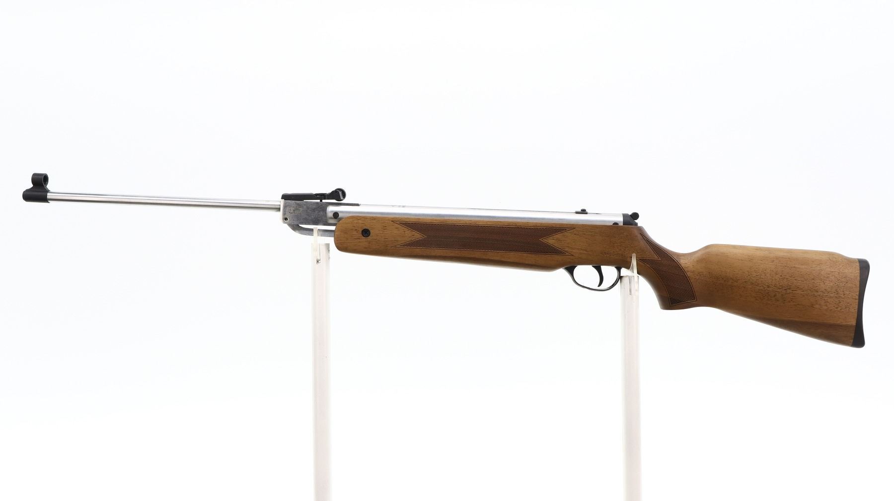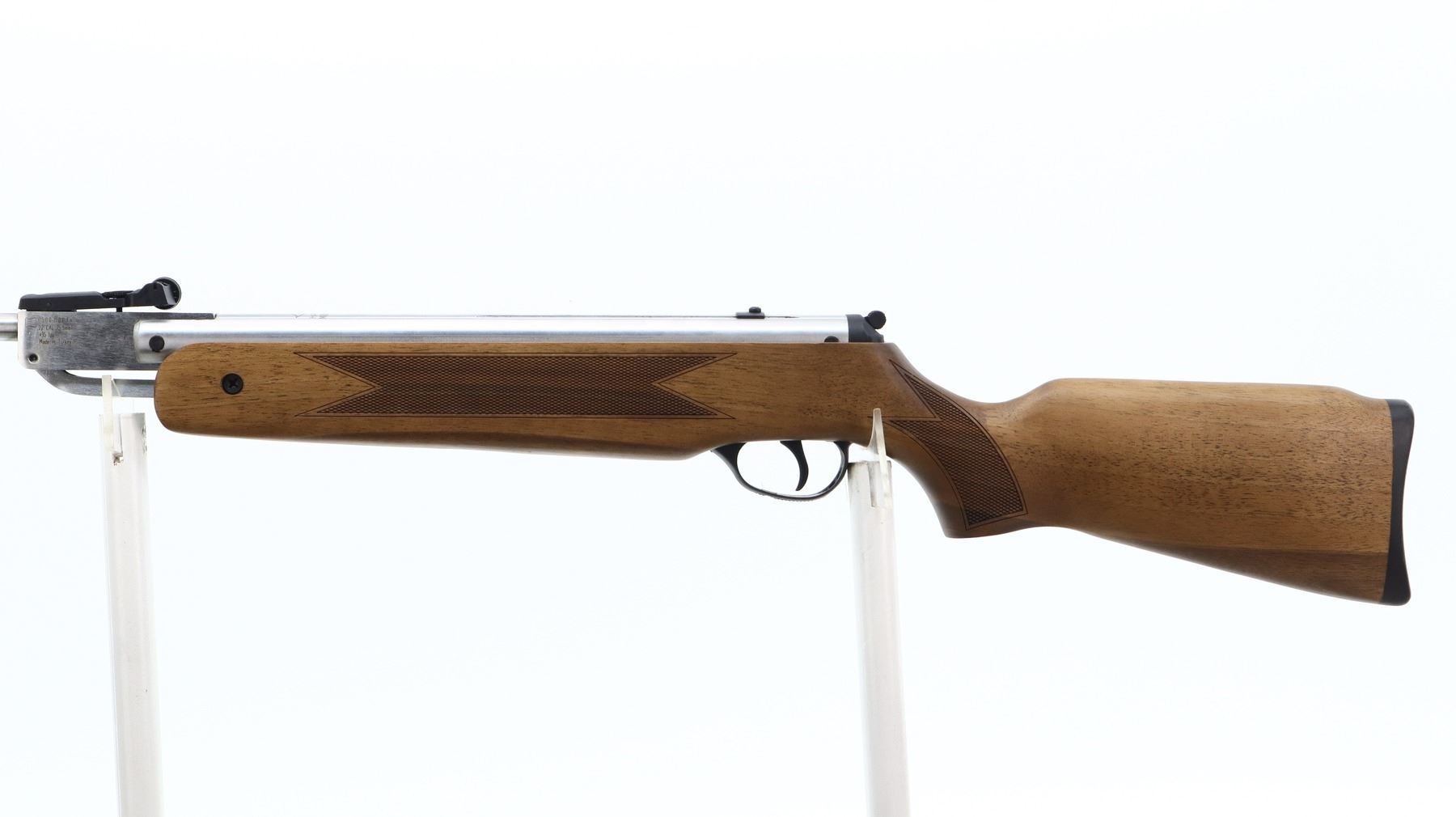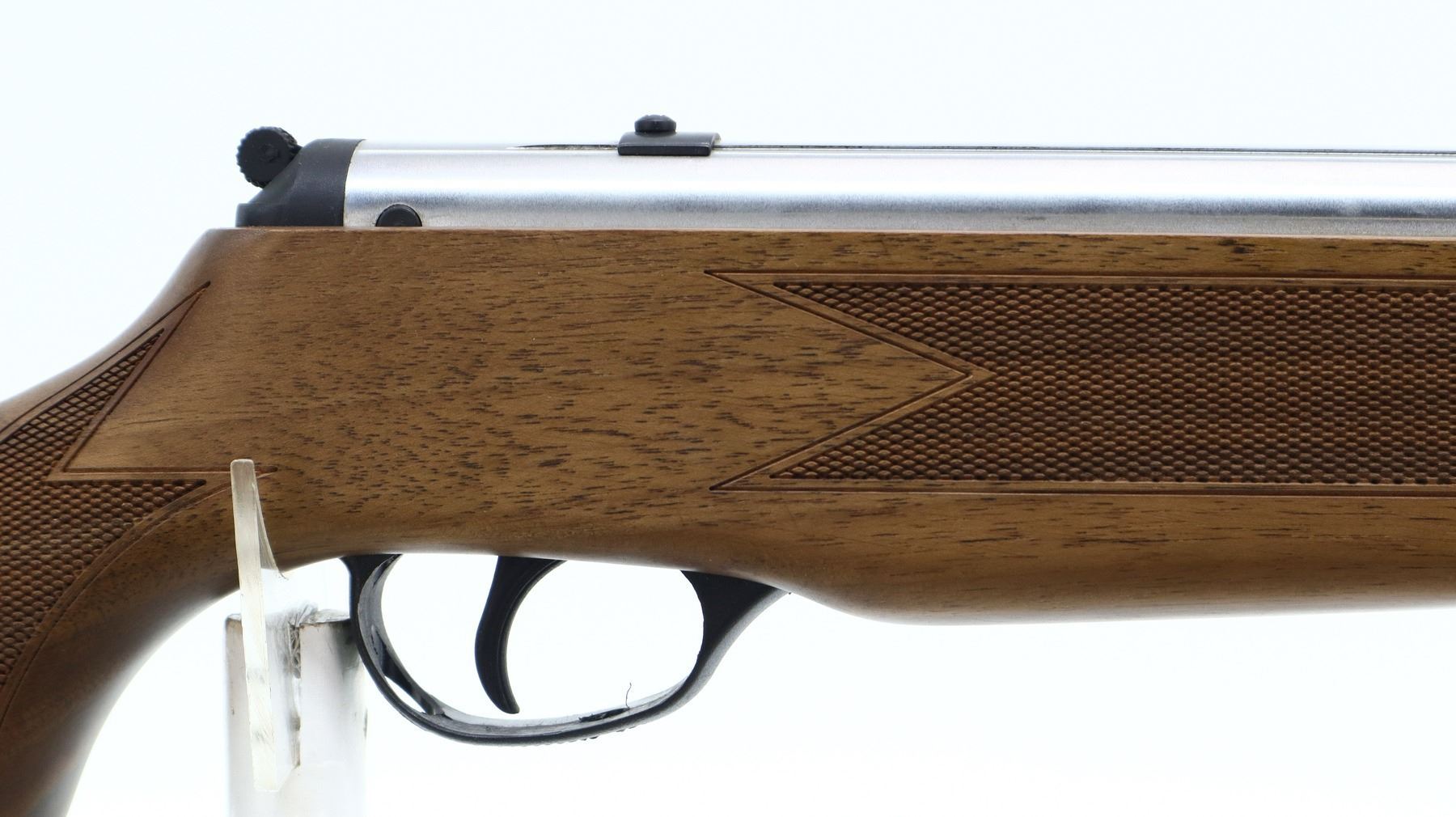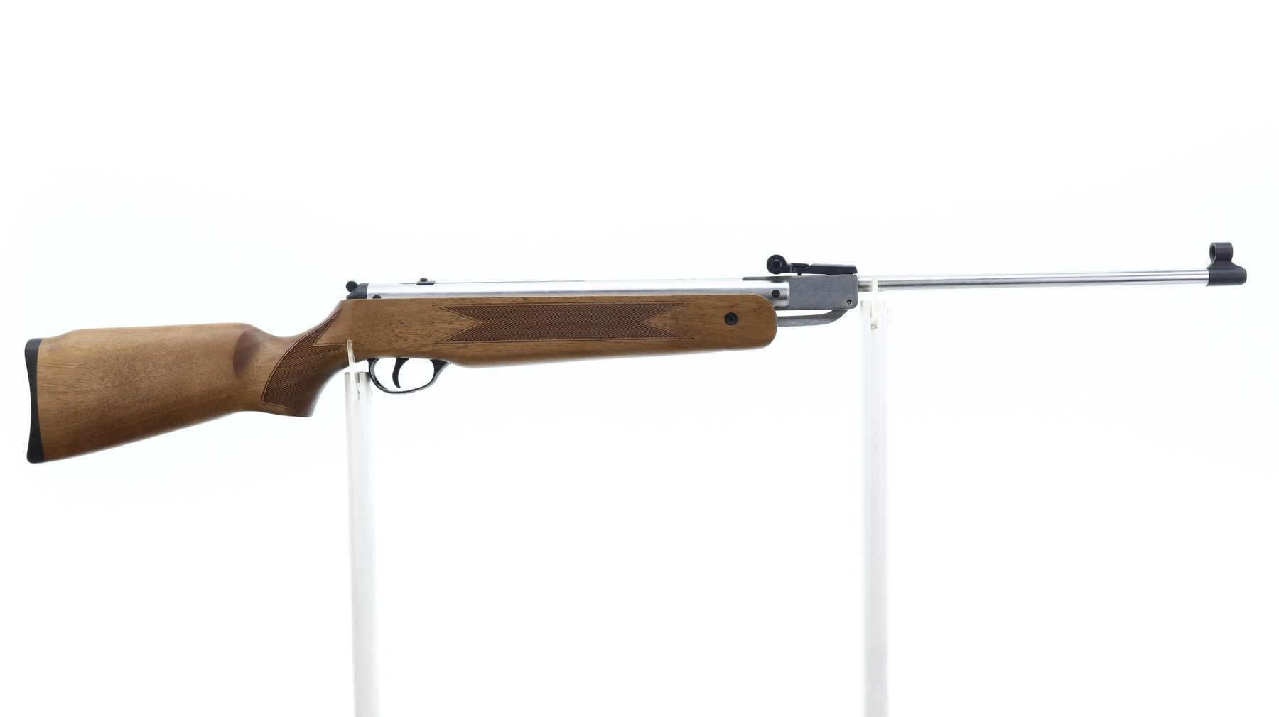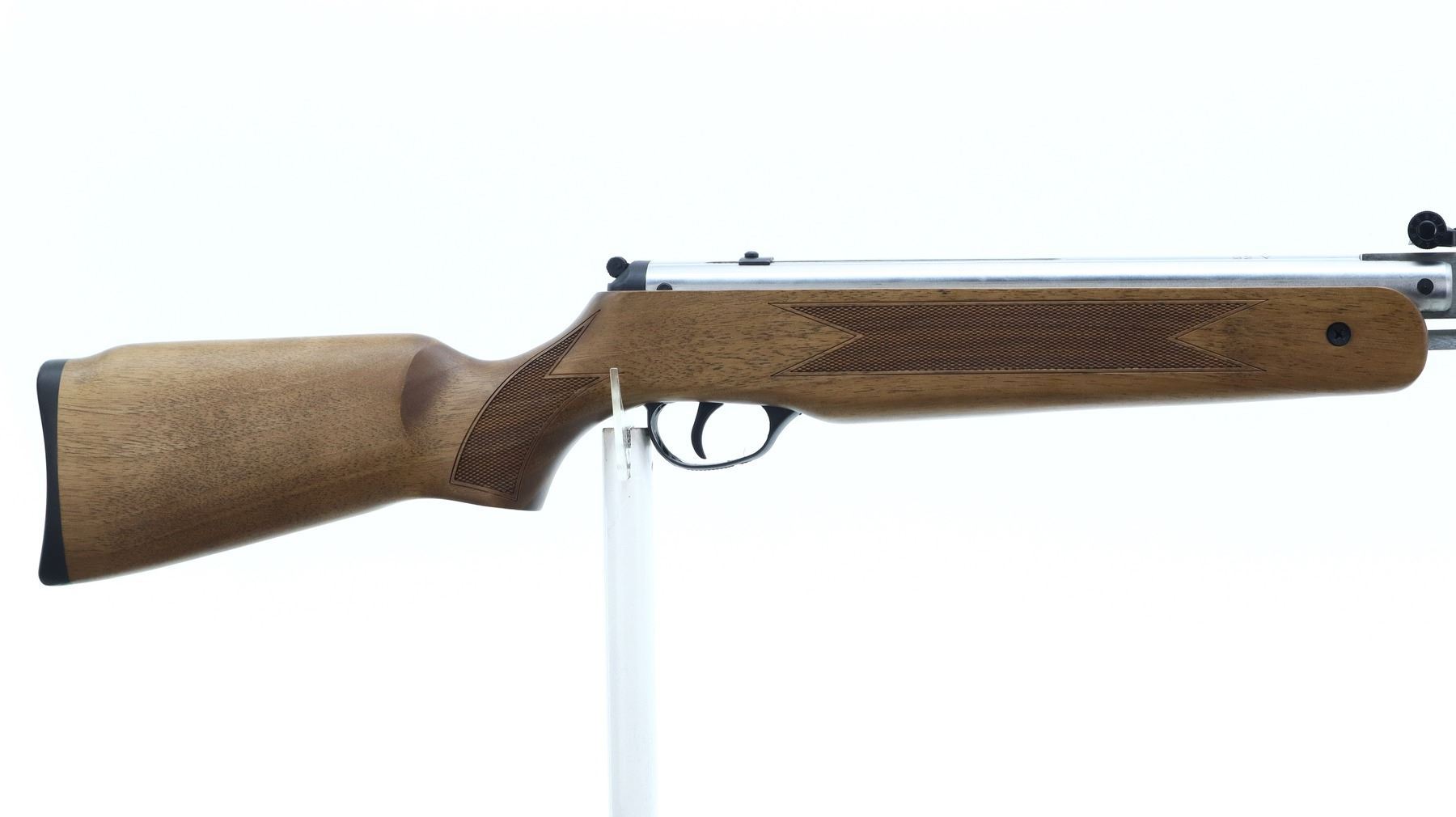 AS NEW IN BOX, HATSAN, MODEL: 60S CR, CALIBER:22 CAL PELLET, COMES WITH BOX, MANUAL, BORE IS EXCELLENT. APPEARS AS NEW, MAY HAVE BEEN TEST FIRED IN FACTORY. BLADE FRONT SIGHT WITH HOOD AND RAMP, ADJUSTABLE U NOTCHED REAR SIGHT, STAINLESS FINISH, RECEIVER GROOVED FOR SCOPE MOUNT, TANG SAFETY. ONE PIECE WOOD STOCK, CHECKERED FOREARM AND PISTOL GRIP, BLACK RUBBER RECOIL PAD. SHOWS SLIGHT HANDLING MARKS OVERALL., ACTION: HINGED SINGLE SHOT AIR RIFLE, BARREL LENGTH: 18", SERIAL # 050808014, CONDITION: AS NEW IN BOX, CLASS: CANADIAN NON RESTRICTED
