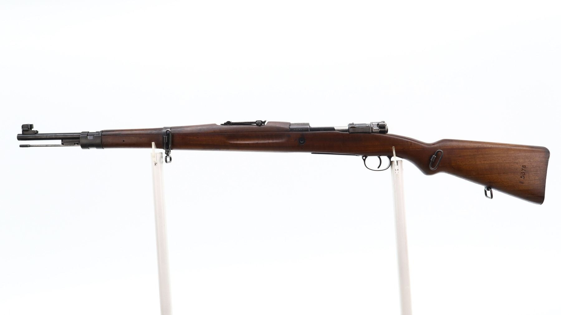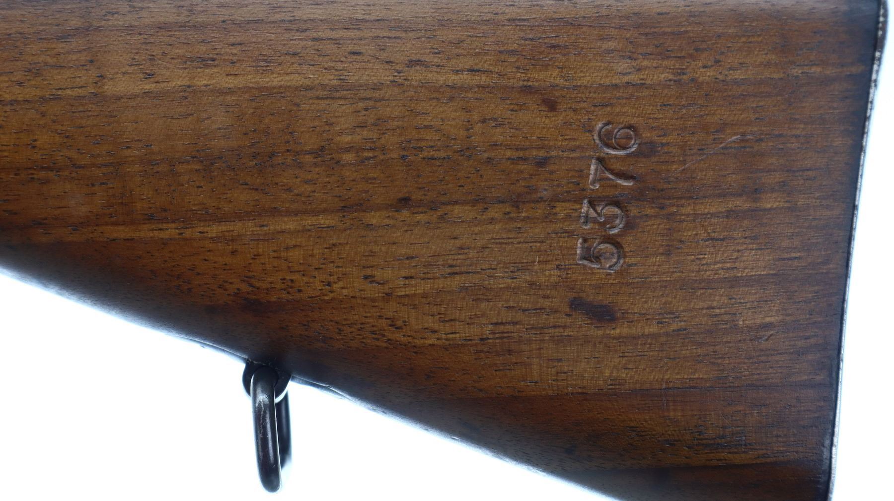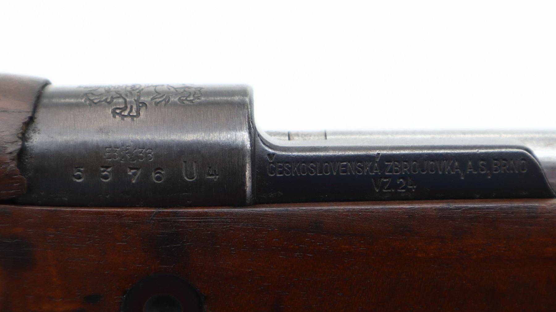 7+/10, CZECH MAUSER, MODEL: VZ24, CALIBER:8MM MAUSER, BORE IS FAIR, WORN, PITTED. MANUFACTURED BY BRNO ARSENAL REBUILD, NUMBERED TO MATCH. BARLEY CORN FRONT SIGHT WITH RAMP AND EARS, ADJUSTABLE U NOTCHED REAR SIGHT, CZECH LION CREST ON RECEIVER, SILVER BOLT WITH STRAIGHT HANDLE. TWO PIECE FULL MILITARY WOOD STOCKS, FINGER GROOVE FOREND, PISTOL GRIP, SMOOTH STEEL BUTT PLATE, FOUR SWIVELS, CLEANING ROD AND BAYONET LUG. METAL FINISH SHOWS SOME SCRATCHES, HANDLING MARKS AND WEAR. STOCKS SHOW SOME MARKS AND SCRATCHES., ACTION: BOLT ACTION RIFLE, BARREL LENGTH: 23.5", SERIAL # 5376, CONDITION: 7+/10, CLASS: CANADIAN NON RESTRICTED