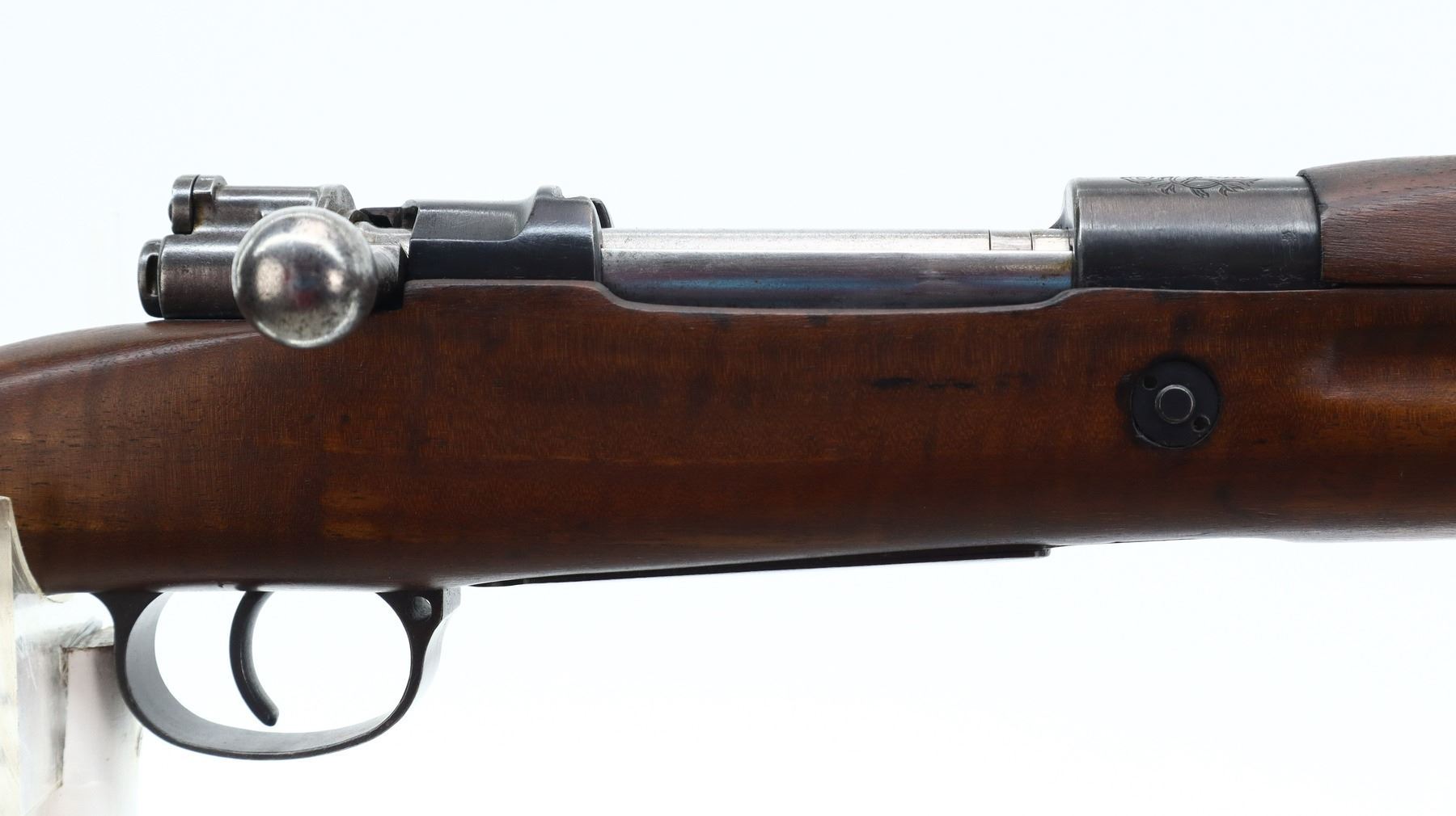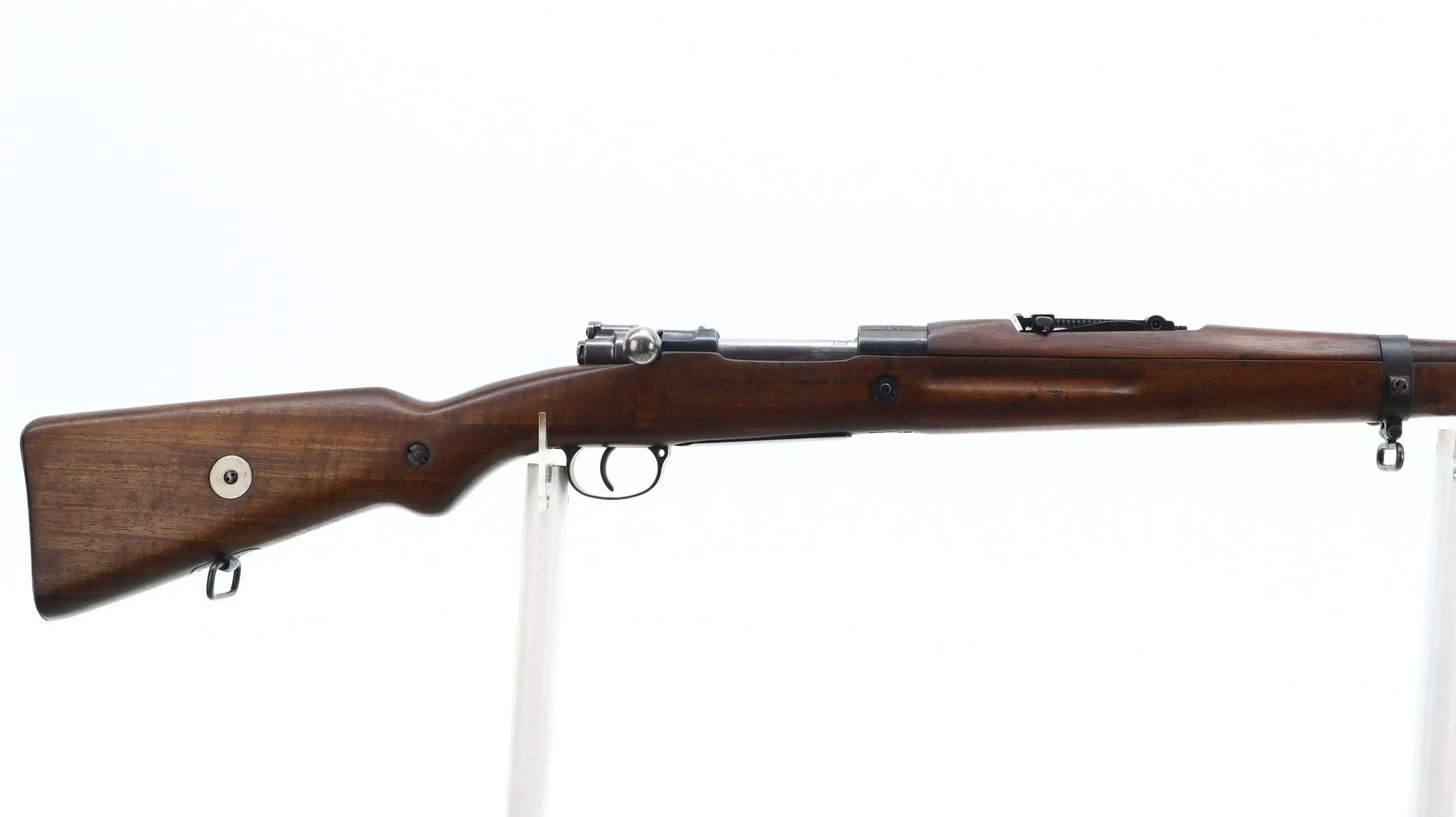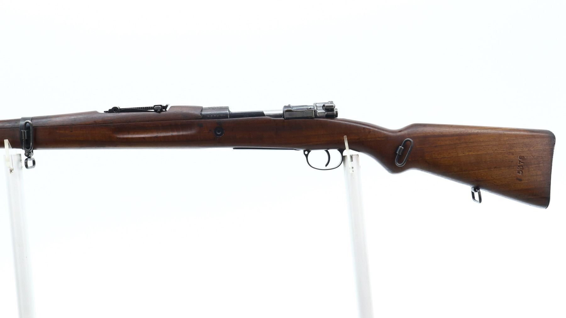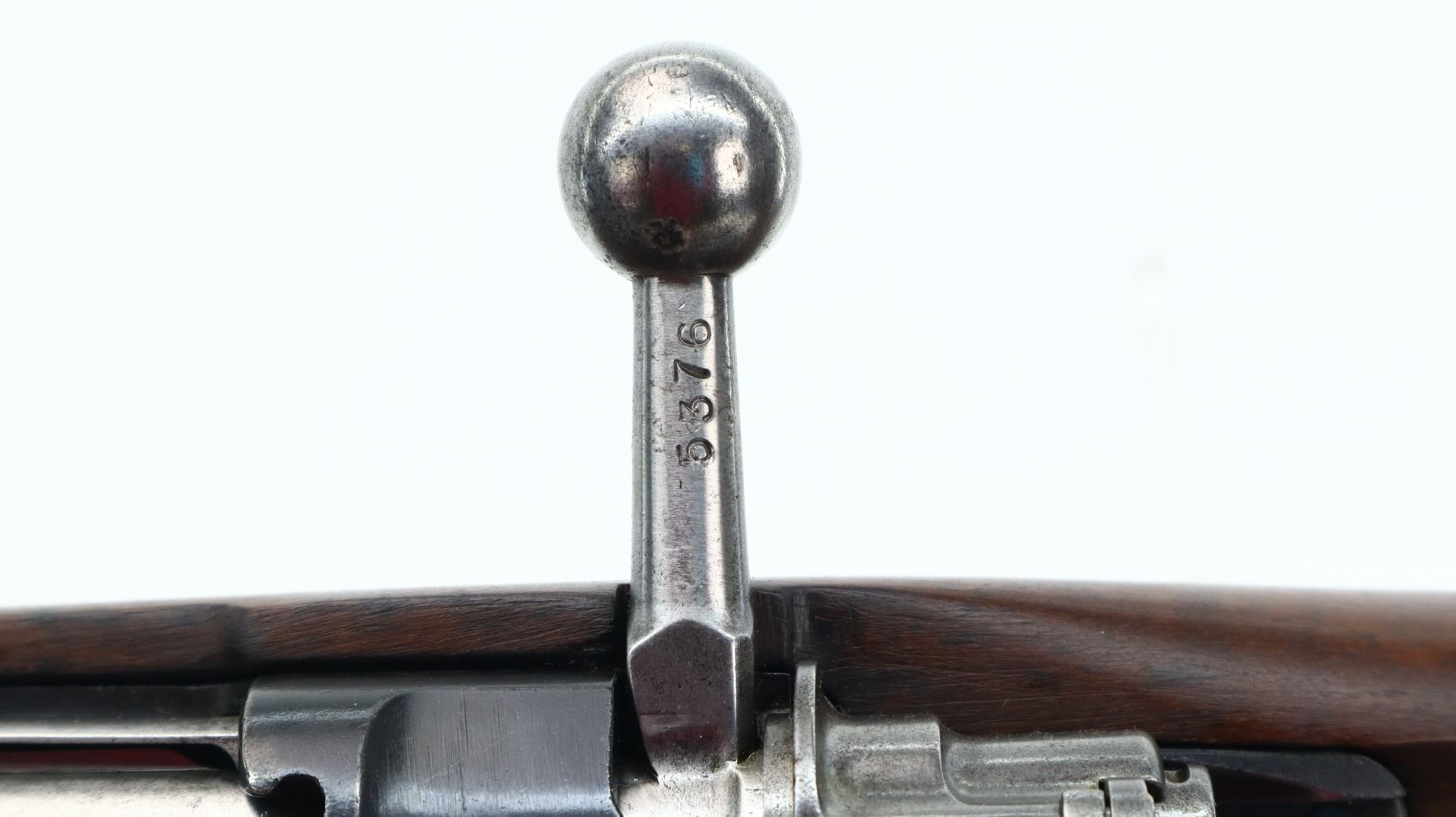 7+/10, CZECH MAUSER, MODEL: VZ24, CALIBER:8MM MAUSER, BORE IS FAIR, WORN, PITTED. MANUFACTURED BY BRNO ARSENAL REBUILD, NUMBERED TO MATCH. BARLEY CORN FRONT SIGHT WITH RAMP AND EARS, ADJUSTABLE U NOTCHED REAR SIGHT, CZECH LION CREST ON RECEIVER, SILVER BOLT WITH STRAIGHT HANDLE. TWO PIECE FULL MILITARY WOOD STOCKS, FINGER GROOVE FOREND, PISTOL GRIP, SMOOTH STEEL BUTT PLATE, FOUR SWIVELS, CLEANING ROD AND BAYONET LUG. METAL FINISH SHOWS SOME SCRATCHES, HANDLING MARKS AND WEAR. STOCKS SHOW SOME MARKS AND SCRATCHES., ACTION: BOLT ACTION RIFLE, BARREL LENGTH: 23.5", SERIAL # 5376, CONDITION: 7+/10, CLASS: CANADIAN NON RESTRICTED