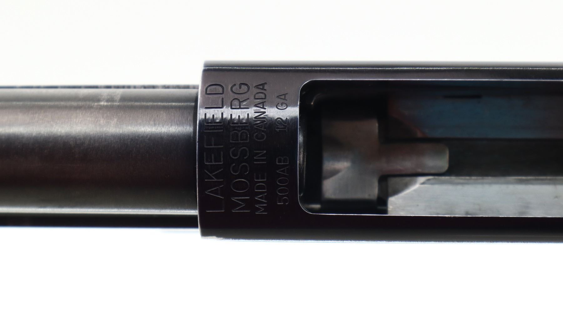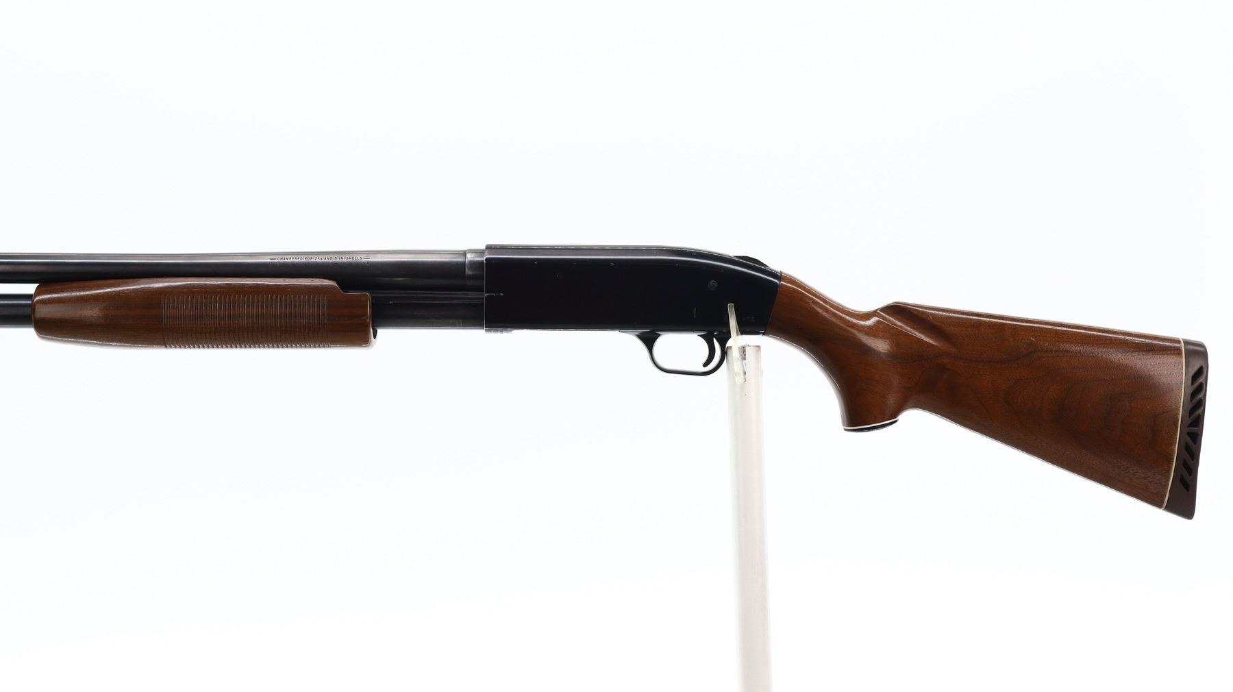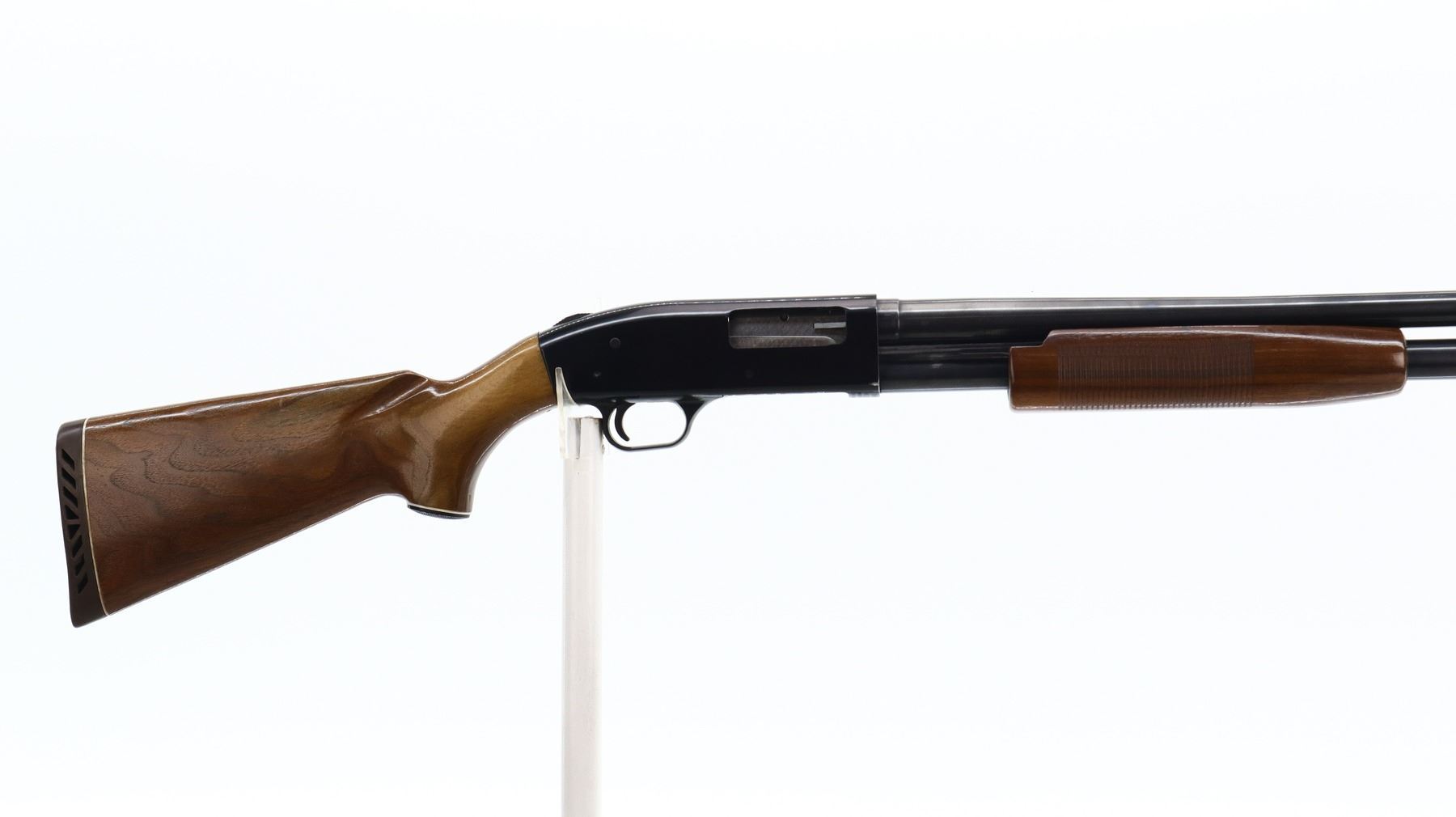 7/10, MOSSBERG, MODEL: 500AB, CALIBER:12 G X 3", BORE IS EXCELLENT. FIXED FULL CHOKE. BRASS BEAD, BLUED ROUND BARREL, BLACK ALLOY RECEIVER, TANG SAFETY. TWO PIECE WOOD STOCKS, GROOVED FOREND, PISTOL GRIP, BROWN VENTED RUBBER RECOIL PAD, GRIP CAP. METAL FINISH SHOWS SOME SCRATCHES, HANDLING MARKS AND WEAR. STOCKS SHOW SOME MARKS, SCRATCHES AND WEAR. , ACTION: PUMP ACTION SHOTGUN, BARREL LENGTH: 30", SERIAL # G121475, CONDITION: 7/10, CLASS: CANADIAN NON RESTRICTED