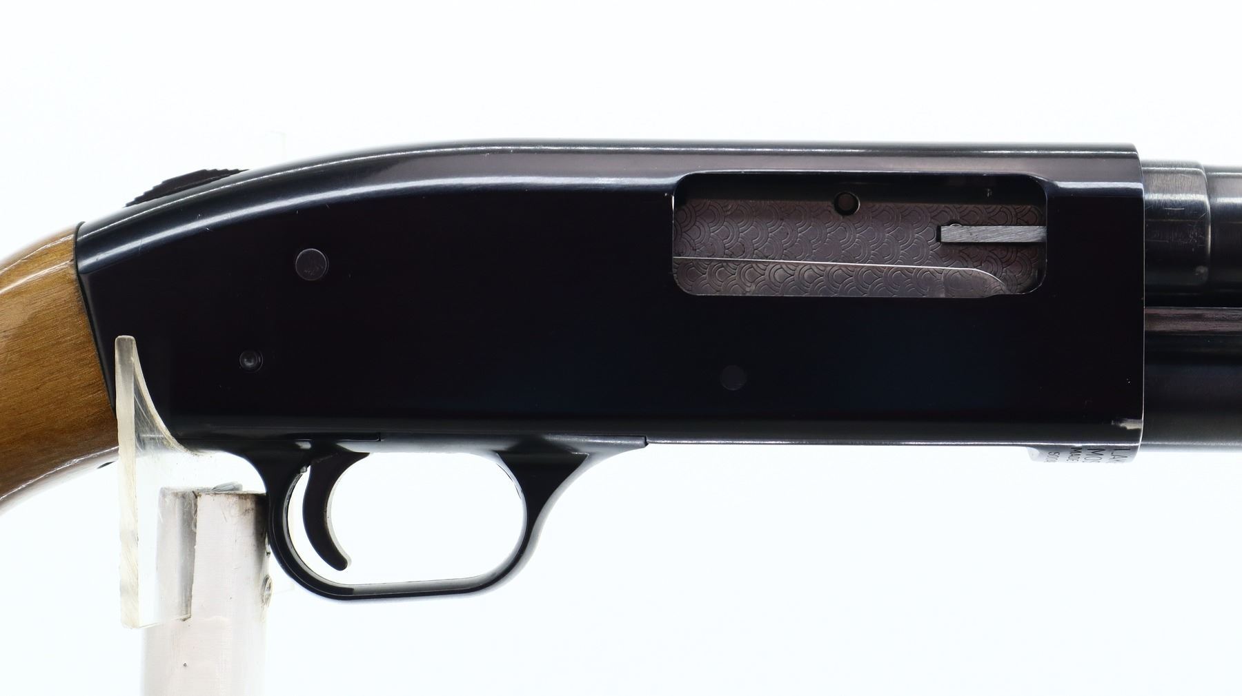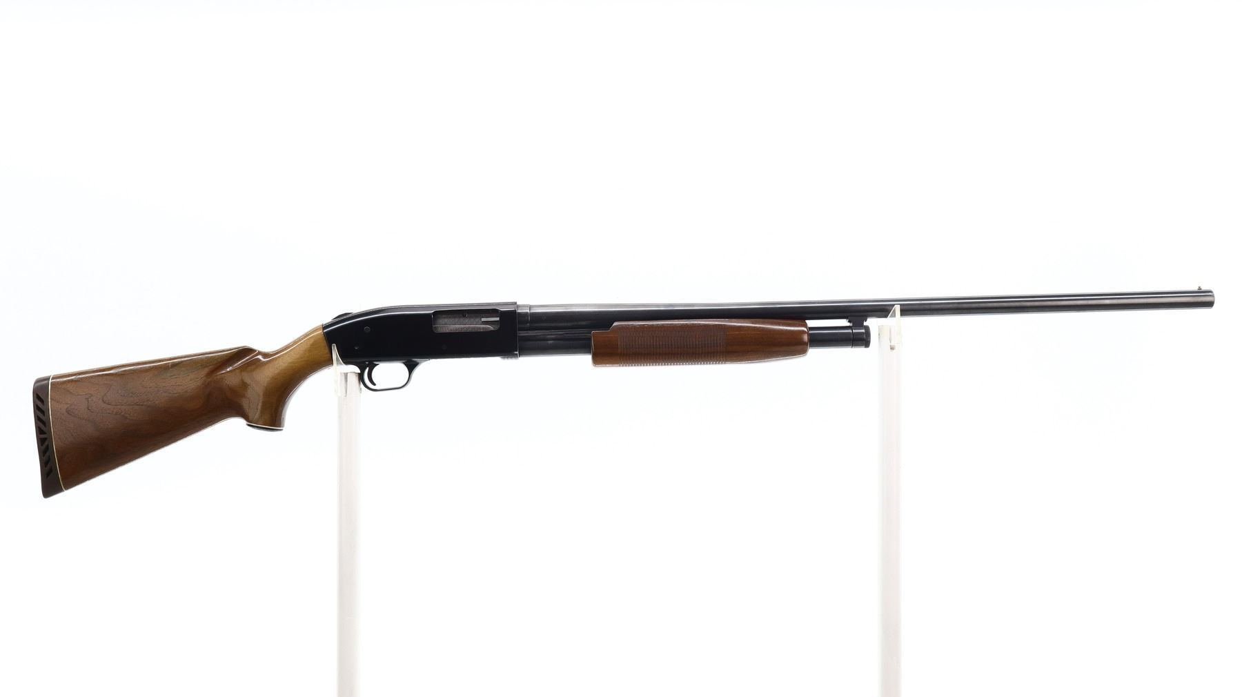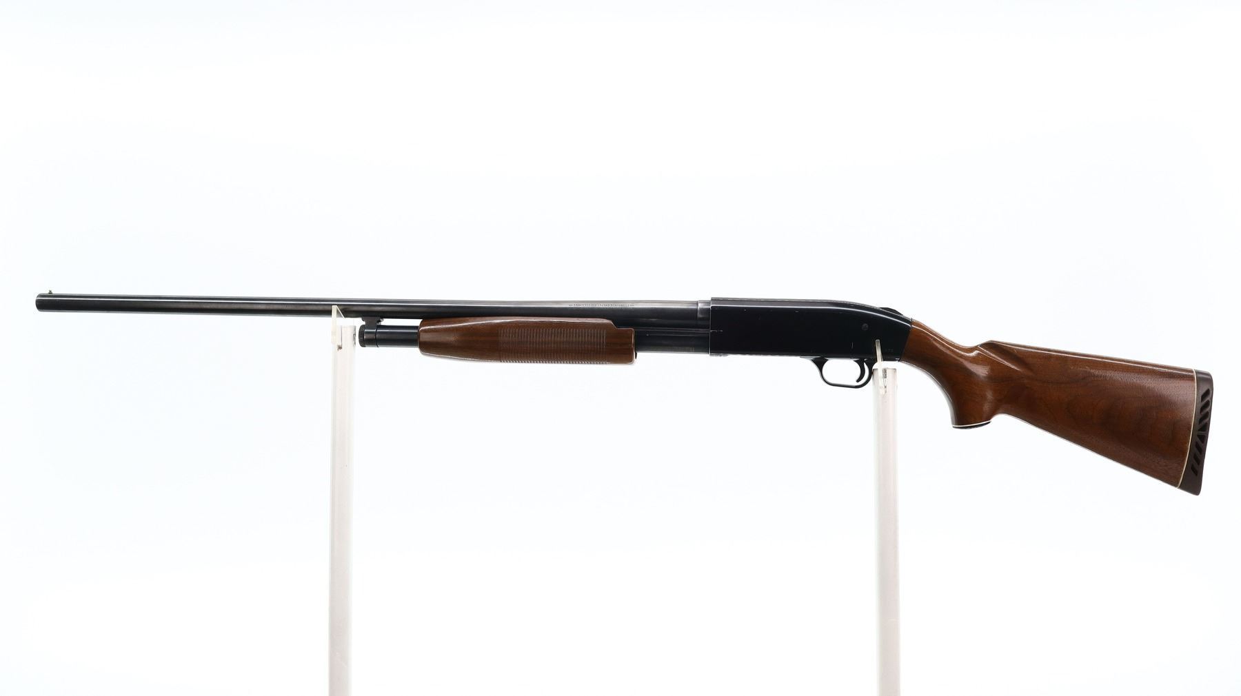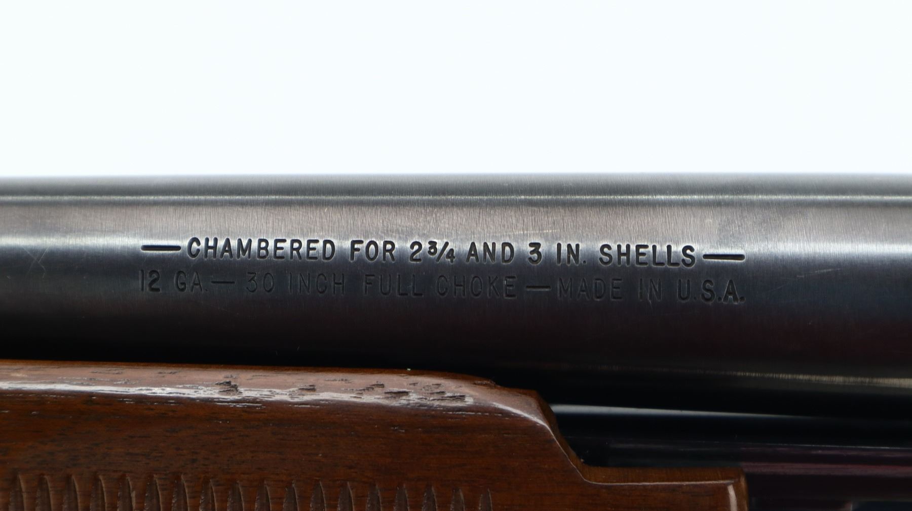 7/10, MOSSBERG, MODEL: 500AB, CALIBER:12 G X 3", BORE IS EXCELLENT. FIXED FULL CHOKE. BRASS BEAD, BLUED ROUND BARREL, BLACK ALLOY RECEIVER, TANG SAFETY. TWO PIECE WOOD STOCKS, GROOVED FOREND, PISTOL GRIP, BROWN VENTED RUBBER RECOIL PAD, GRIP CAP. METAL FINISH SHOWS SOME SCRATCHES, HANDLING MARKS AND WEAR. STOCKS SHOW SOME MARKS, SCRATCHES AND WEAR. , ACTION: PUMP ACTION SHOTGUN, BARREL LENGTH: 30", SERIAL # G121475, CONDITION: 7/10, CLASS: CANADIAN NON RESTRICTED