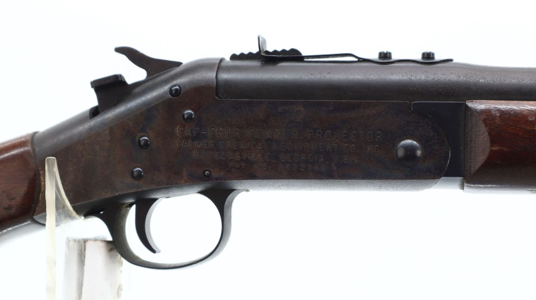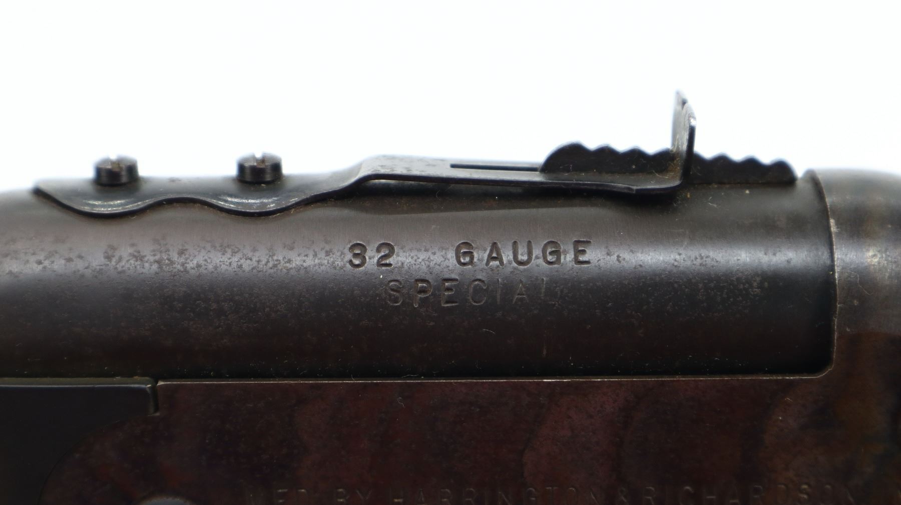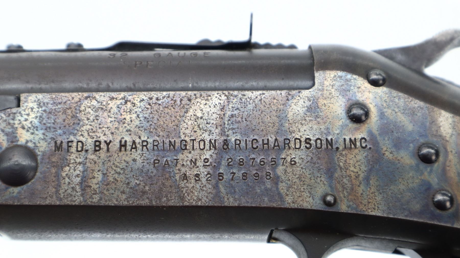 6/10, HARRINGTON & RICHARDSON, MODEL: CAP-CHUR POWDER PROJECTOR, CALIBER:32 G SPL, BORE IS GOOD, WITH SLIGHT PITTING. THIS IS A SINGLE SHOT SHOTGUN USED WITH SPECIAL CARTRIDGES TO TRANQUILIZE AND CAPTURE ANIMALS. BRASS BEAD, BLUED ROUND BARREL, ADJUSTABLE U NOTCHED REAR SIGHT, COLOUR CASE HARDENED RECEIVER, GROOVED SPUR HAMMER, EXTRACTOR. TWO PIECE SMOOTH WOOD STOCKS, PISTOL GRIP, GROOVED BLACK POLYMER BUTT PLATE. METAL FINISH SHOWS LIGHT RUST SPECKLES OVERALL WITH HANDLING MARKS AND WEAR. STOCKS SHOW MARKS, SCRATCHES AND WEAR. , ACTION: HINGED SINGLE SHOT, BARREL LENGTH: 26", SERIAL # AS257898, CONDITION: 6/10, CLASS: CANADIAN NON RESTRICTED