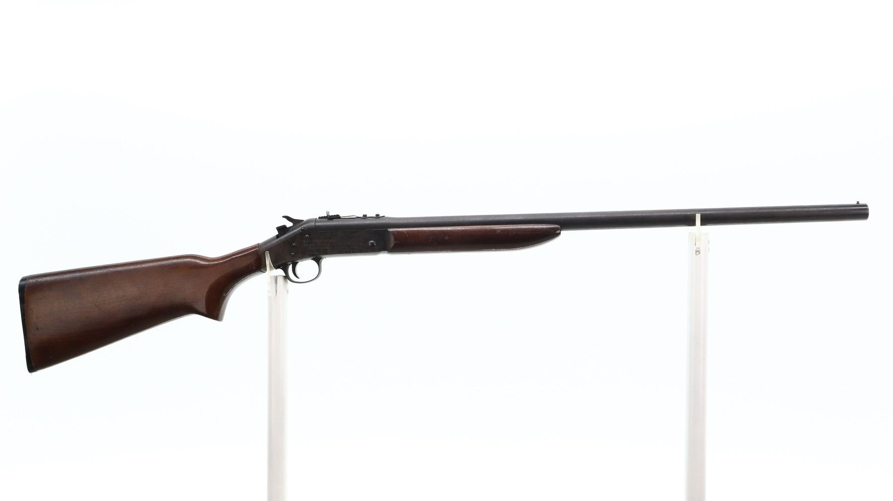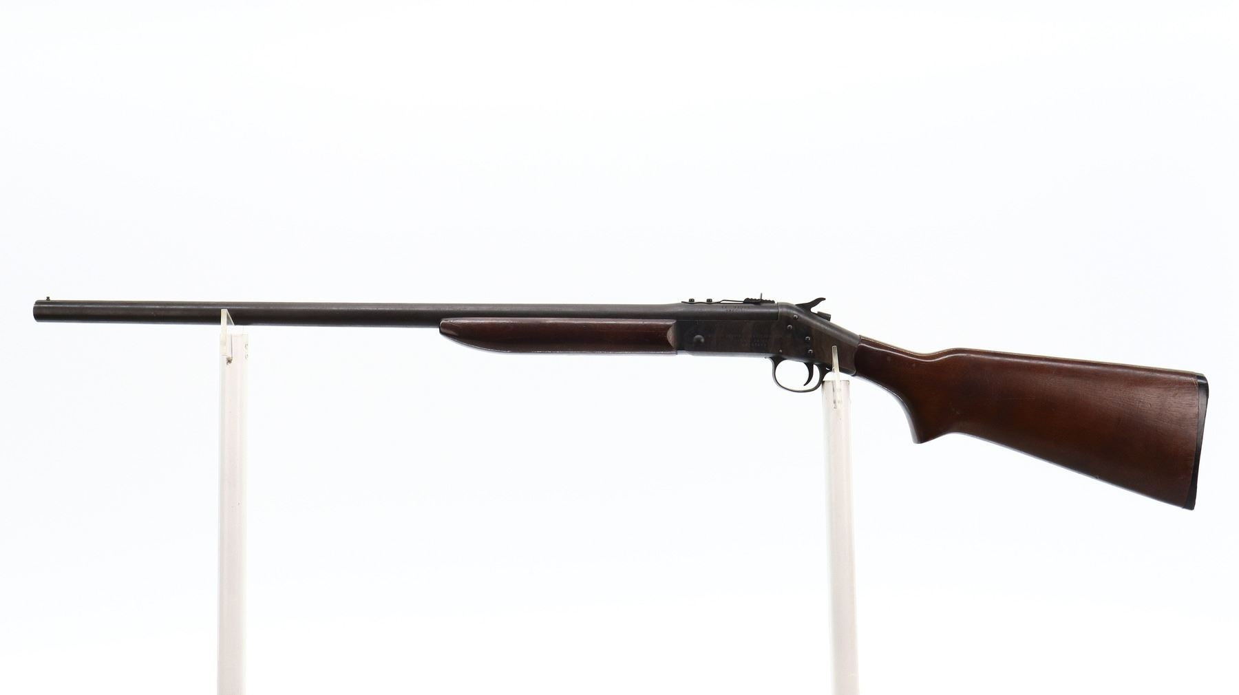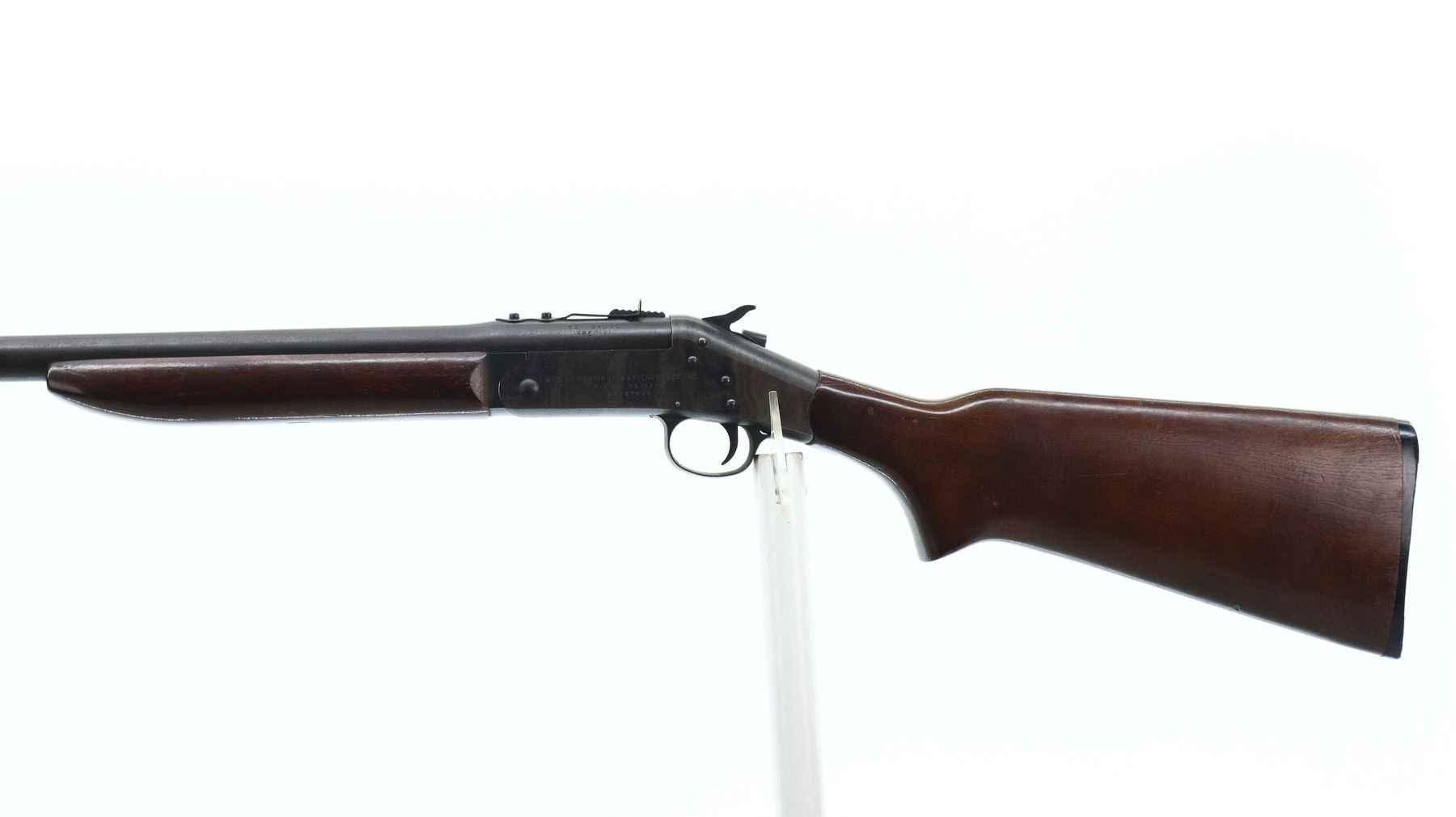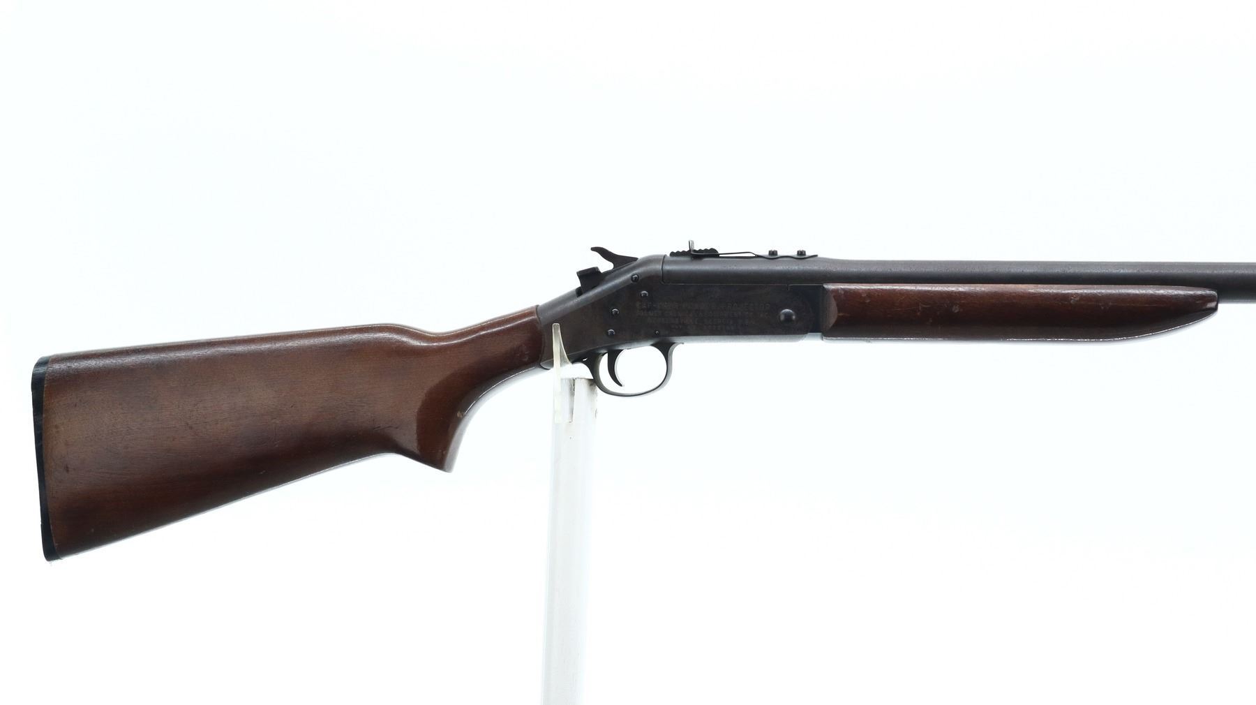 6/10, HARRINGTON & RICHARDSON, MODEL: CAP-CHUR POWDER PROJECTOR, CALIBER:32 G SPL, BORE IS GOOD, WITH SLIGHT PITTING. THIS IS A SINGLE SHOT SHOTGUN USED WITH SPECIAL CARTRIDGES TO TRANQUILIZE AND CAPTURE ANIMALS. BRASS BEAD, BLUED ROUND BARREL, ADJUSTABLE U NOTCHED REAR SIGHT, COLOUR CASE HARDENED RECEIVER, GROOVED SPUR HAMMER, EXTRACTOR. TWO PIECE SMOOTH WOOD STOCKS, PISTOL GRIP, GROOVED BLACK POLYMER BUTT PLATE. METAL FINISH SHOWS LIGHT RUST SPECKLES OVERALL WITH HANDLING MARKS AND WEAR. STOCKS SHOW MARKS, SCRATCHES AND WEAR. , ACTION: HINGED SINGLE SHOT, BARREL LENGTH: 26", SERIAL # AS257898, CONDITION: 6/10, CLASS: CANADIAN NON RESTRICTED