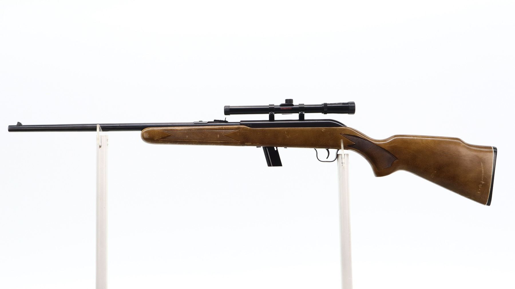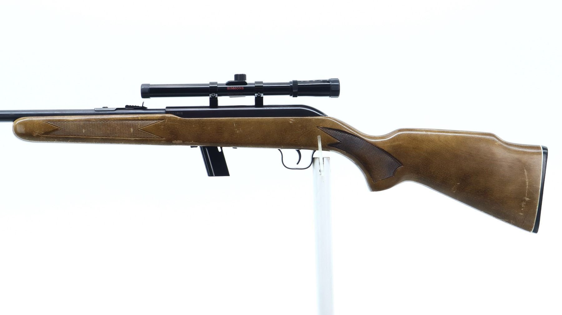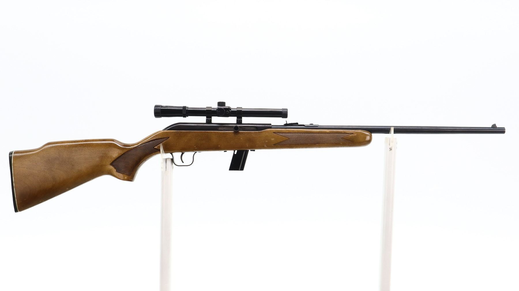 7/10, LAKEFIELD, MODEL: 64B, CALIBER:22 LR, COMES WITH MAGAZINE, BORE IS VERY GOOD. BROKEN BLADE FRONT SIGHT, ADJUSTABLE U NOTCHED REAR SIGHT, BLUED FINISH, GROOVED RECEIVER WITH SIMMONS 1002M1 4X15 SCOPE, CLEAR OPTICS WITH DUPLEX CROSSHAIR. ONE PIECE WOOD STOCK, CHECKERED FOREARM AND PISTOL GRIP, RAISED COMB, CHECKERED BLACK POLYMER BUTT PLATE. METAL FINISH SHOWS SOME SCRATCHES, HANDLING MARKS AND WEAR. STOCK SHOWS SOME MARKS, SCRATCHES AND WEAR. , ACTION: SEMI AUTOMATIC RIFLE, BARREL LENGTH: 20", SERIAL # L013885, CONDITION: 7/10, CLASS: CANADIAN NON RESTRICTED