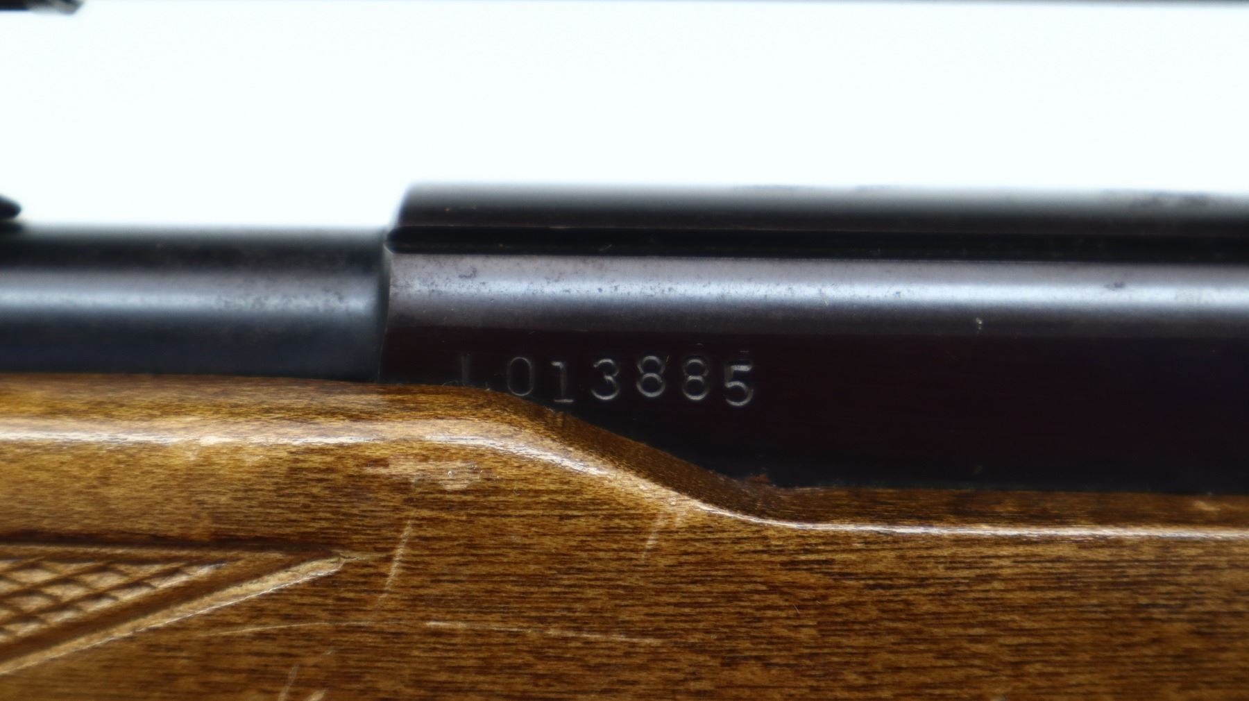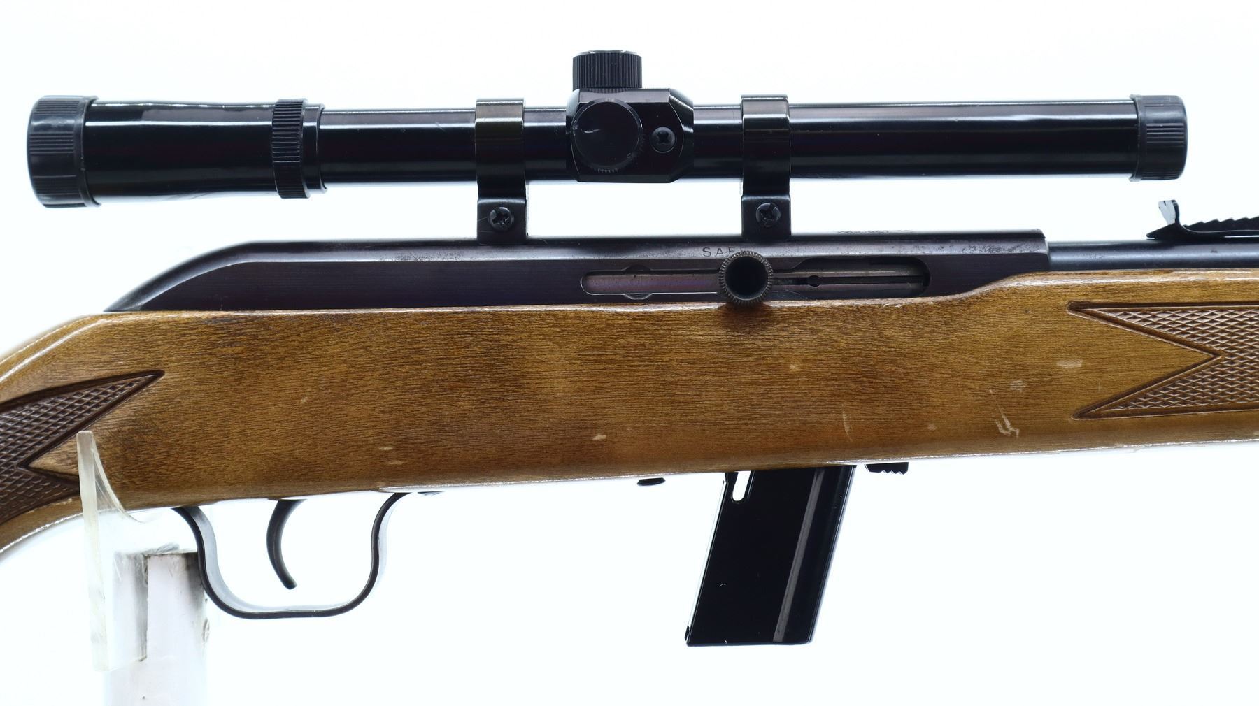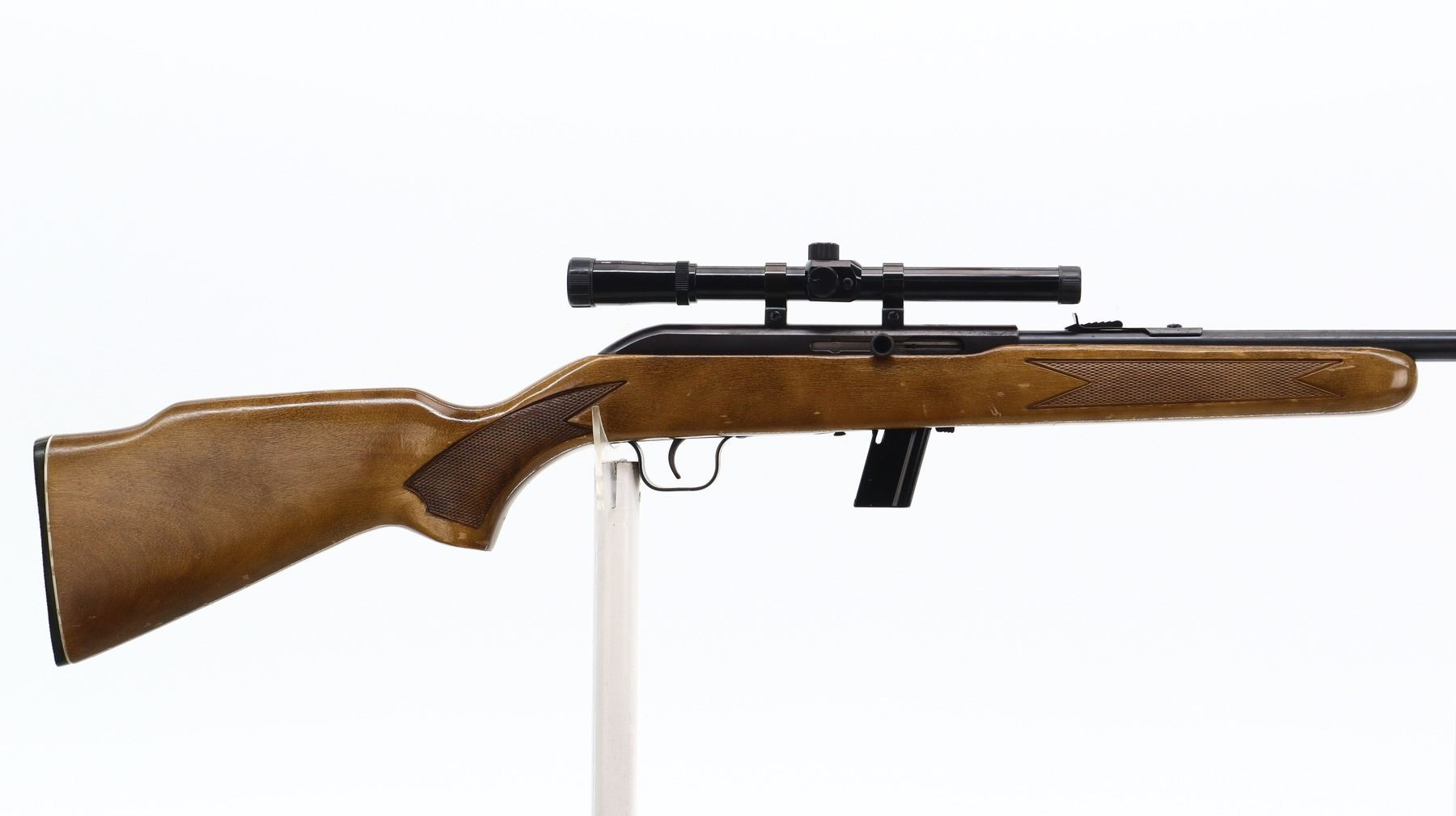 7/10, LAKEFIELD, MODEL: 64B, CALIBER:22 LR, COMES WITH MAGAZINE, BORE IS VERY GOOD. BROKEN BLADE FRONT SIGHT, ADJUSTABLE U NOTCHED REAR SIGHT, BLUED FINISH, GROOVED RECEIVER WITH SIMMONS 1002M1 4X15 SCOPE, CLEAR OPTICS WITH DUPLEX CROSSHAIR. ONE PIECE WOOD STOCK, CHECKERED FOREARM AND PISTOL GRIP, RAISED COMB, CHECKERED BLACK POLYMER BUTT PLATE. METAL FINISH SHOWS SOME SCRATCHES, HANDLING MARKS AND WEAR. STOCK SHOWS SOME MARKS, SCRATCHES AND WEAR. , ACTION: SEMI AUTOMATIC RIFLE, BARREL LENGTH: 20", SERIAL # L013885, CONDITION: 7/10, CLASS: CANADIAN NON RESTRICTED