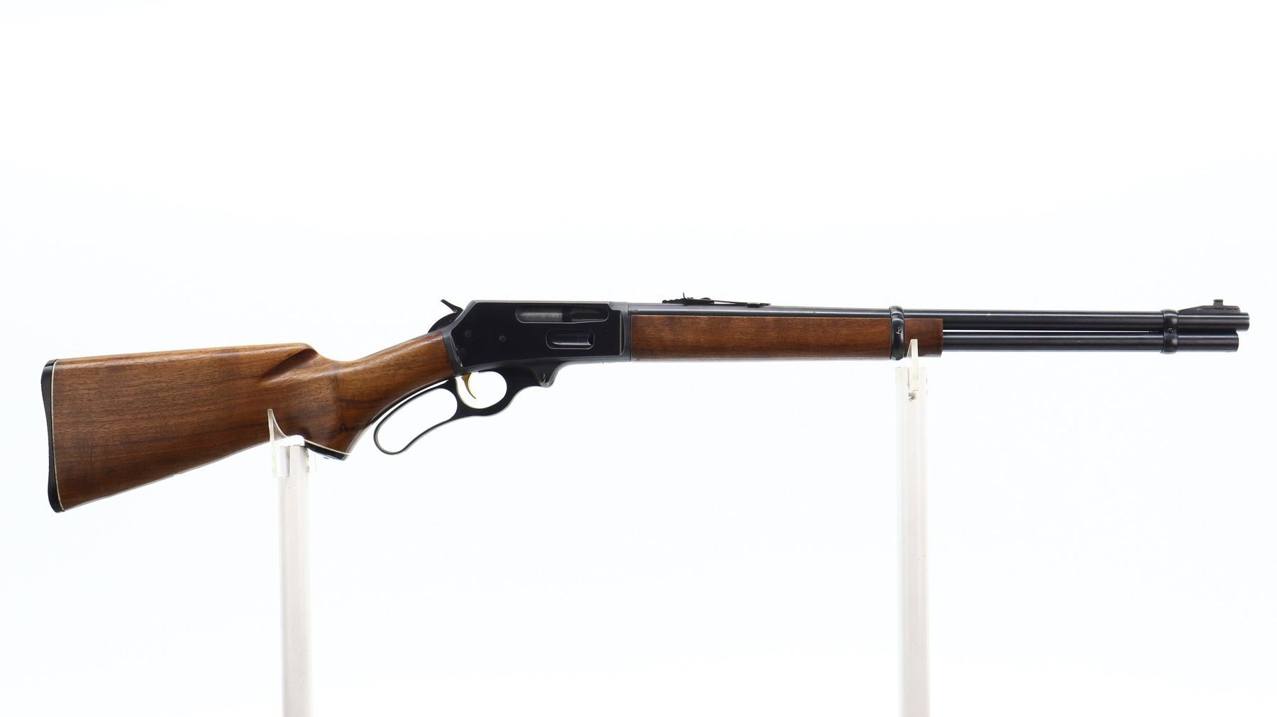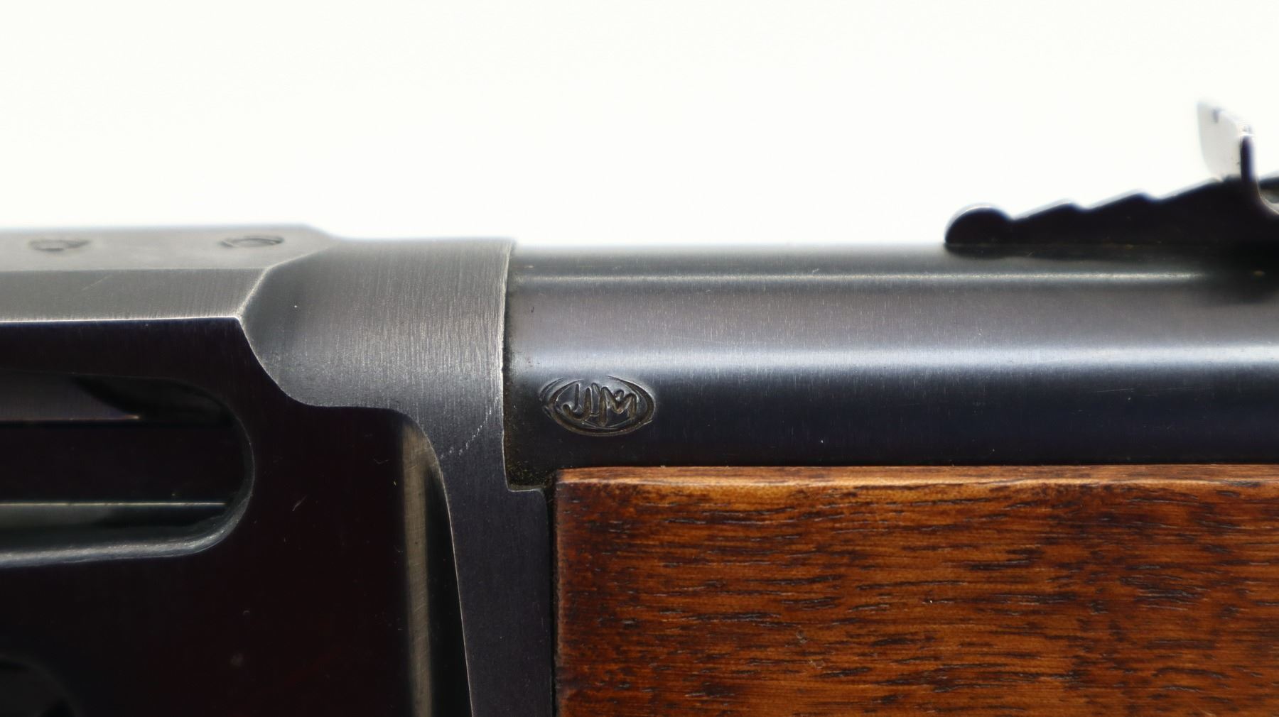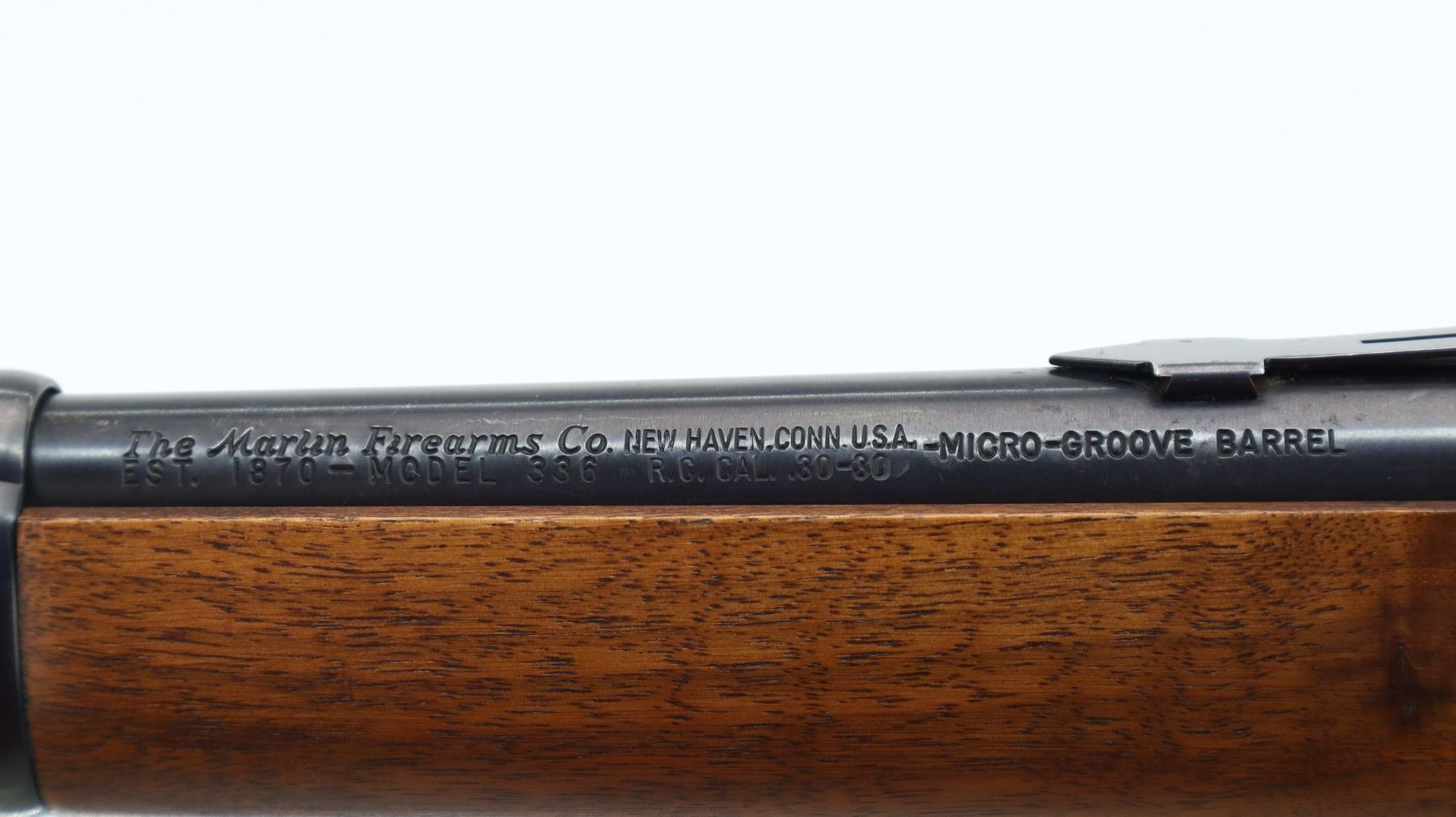 7/10, MARLIN JM, MODEL: 336, CALIBER:30-30 WIN, BORE IS EXCELLENT. BLADE FRONT SIGHT WITH RAMP, ADJUSTABLE U NOTCHED REAR SIGHT, BLUED FINISH, RECEIVER DRILLED AND TAPPED FOR SCOPE MOUNT WITH PLUG SCREWS INSTALLED, GROOVED SPUR HAMMER, GOLD TRIGGER. TWO PIECE SMOOTH WOOD STOCKS, PISTOL GRIP WITH CAP, CHECKERED BLACK POLYMER BUTT PLATE, FULL LENGTH MAG TUBE. METAL FINISH SHOWS SOME SCRATCHES, HANDLING MARKS AND WEAR. STOCKS SHOWS SOME MARKS, SCRATCHES AND WEAR. , ACTION: LEVER ACTION RIFLE, BARREL LENGTH: 20.25", SERIAL # U9038, CONDITION: 7/10, CLASS: CANADIAN NON RESTRICTED