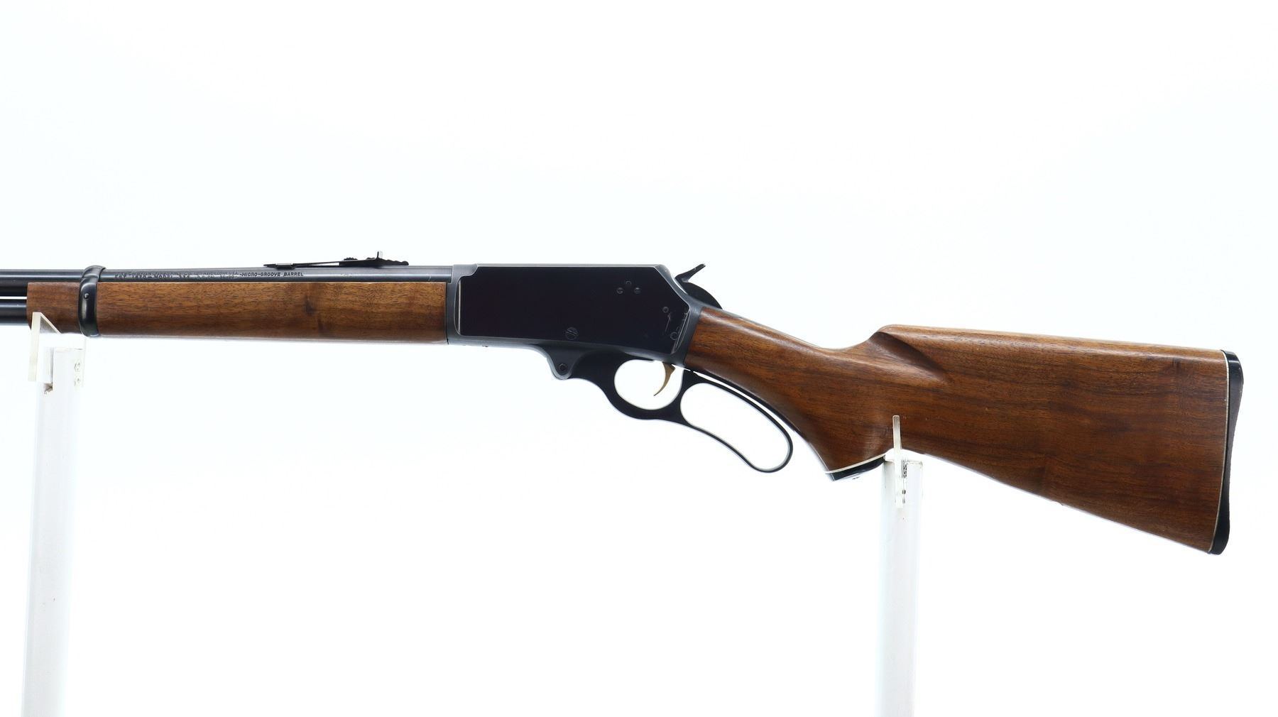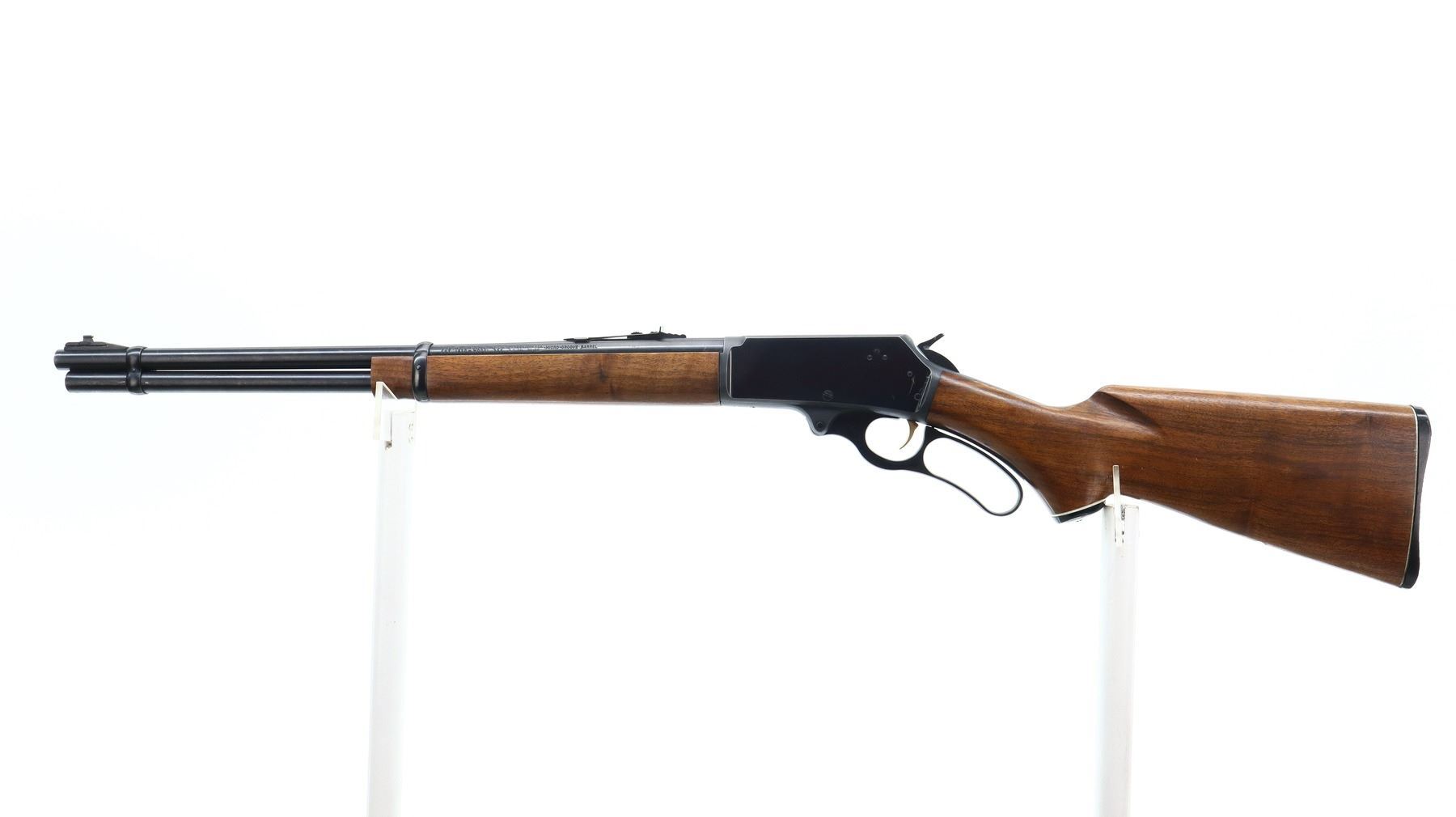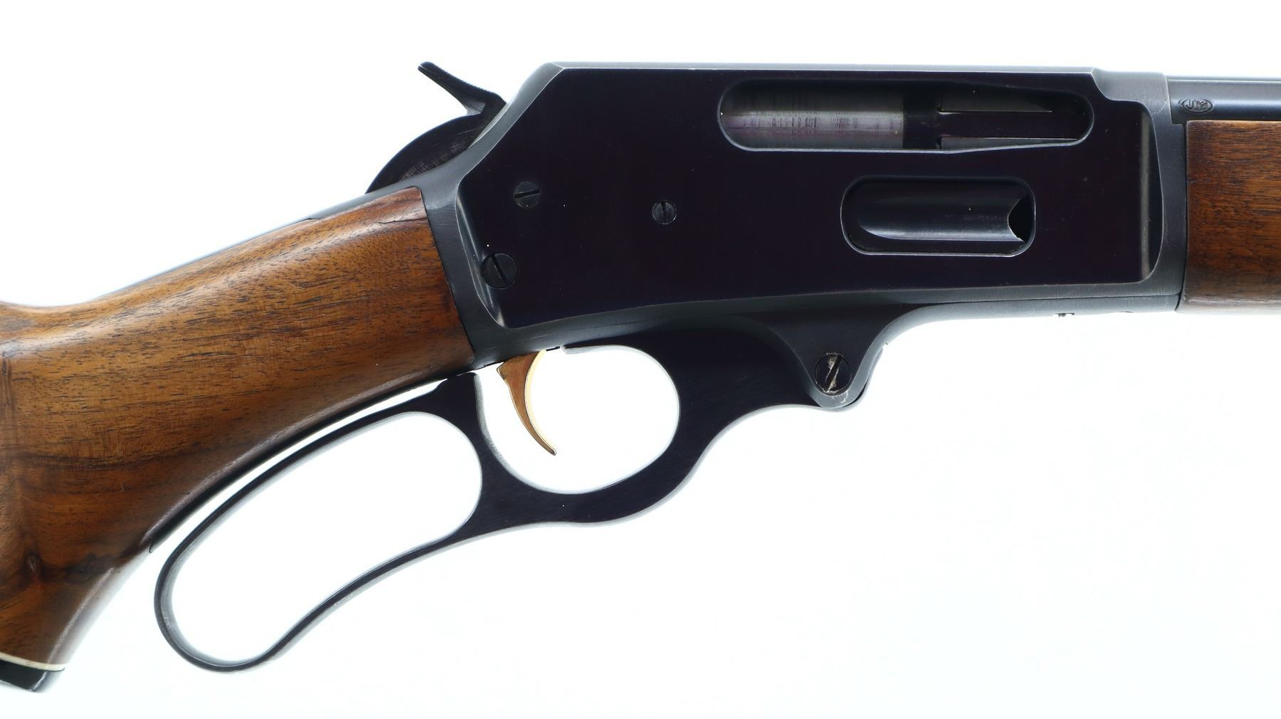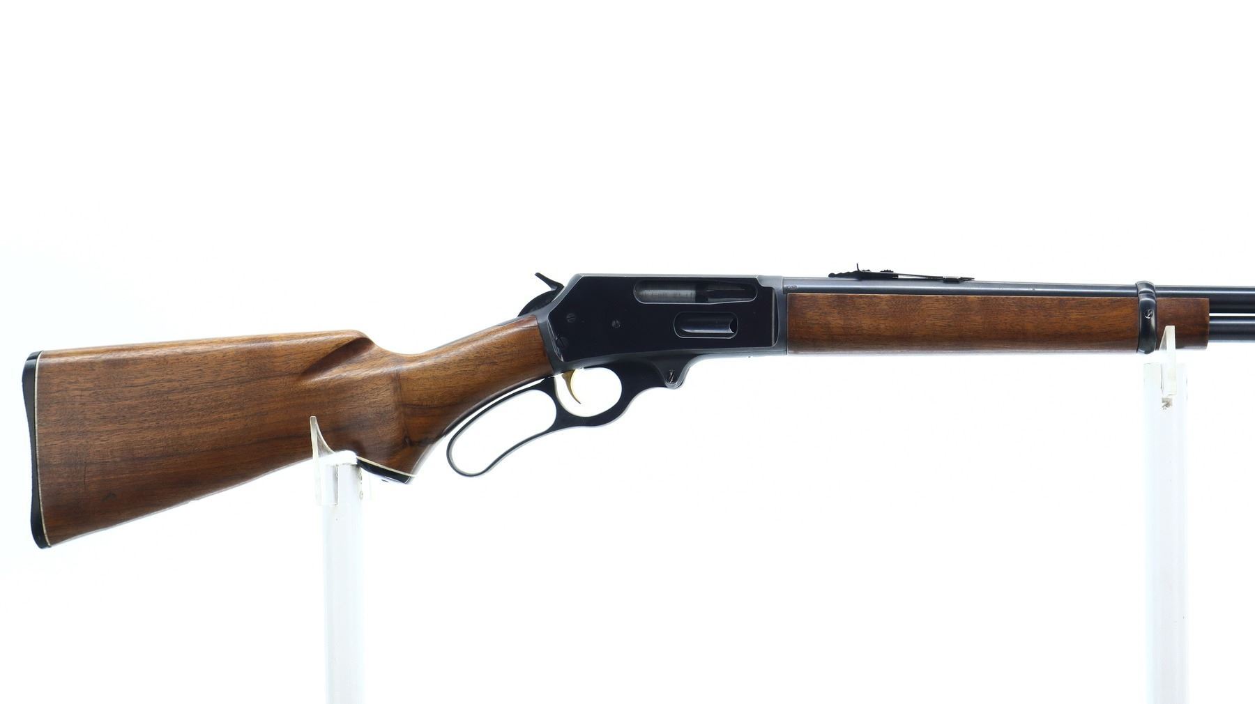 7/10, MARLIN JM, MODEL: 336, CALIBER:30-30 WIN, BORE IS EXCELLENT. BLADE FRONT SIGHT WITH RAMP, ADJUSTABLE U NOTCHED REAR SIGHT, BLUED FINISH, RECEIVER DRILLED AND TAPPED FOR SCOPE MOUNT WITH PLUG SCREWS INSTALLED, GROOVED SPUR HAMMER, GOLD TRIGGER. TWO PIECE SMOOTH WOOD STOCKS, PISTOL GRIP WITH CAP, CHECKERED BLACK POLYMER BUTT PLATE, FULL LENGTH MAG TUBE. METAL FINISH SHOWS SOME SCRATCHES, HANDLING MARKS AND WEAR. STOCKS SHOWS SOME MARKS, SCRATCHES AND WEAR. , ACTION: LEVER ACTION RIFLE, BARREL LENGTH: 20.25", SERIAL # U9038, CONDITION: 7/10, CLASS: CANADIAN NON RESTRICTED