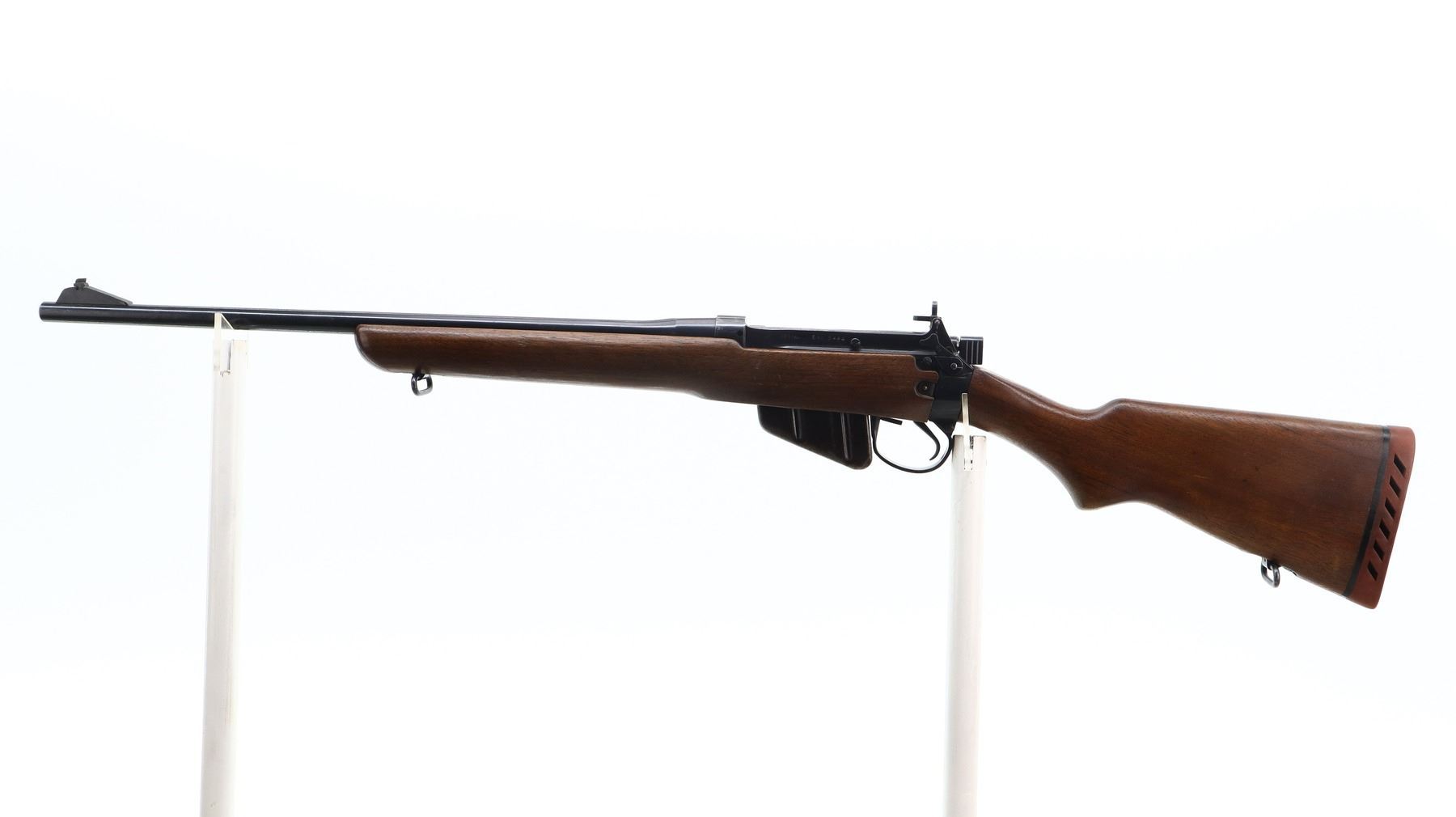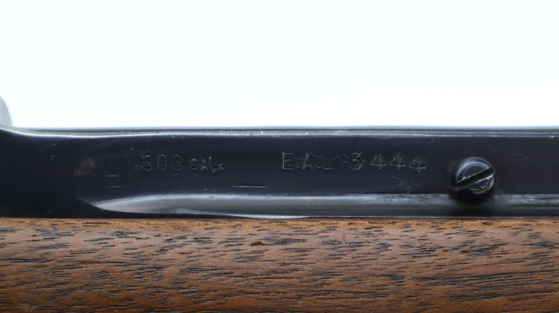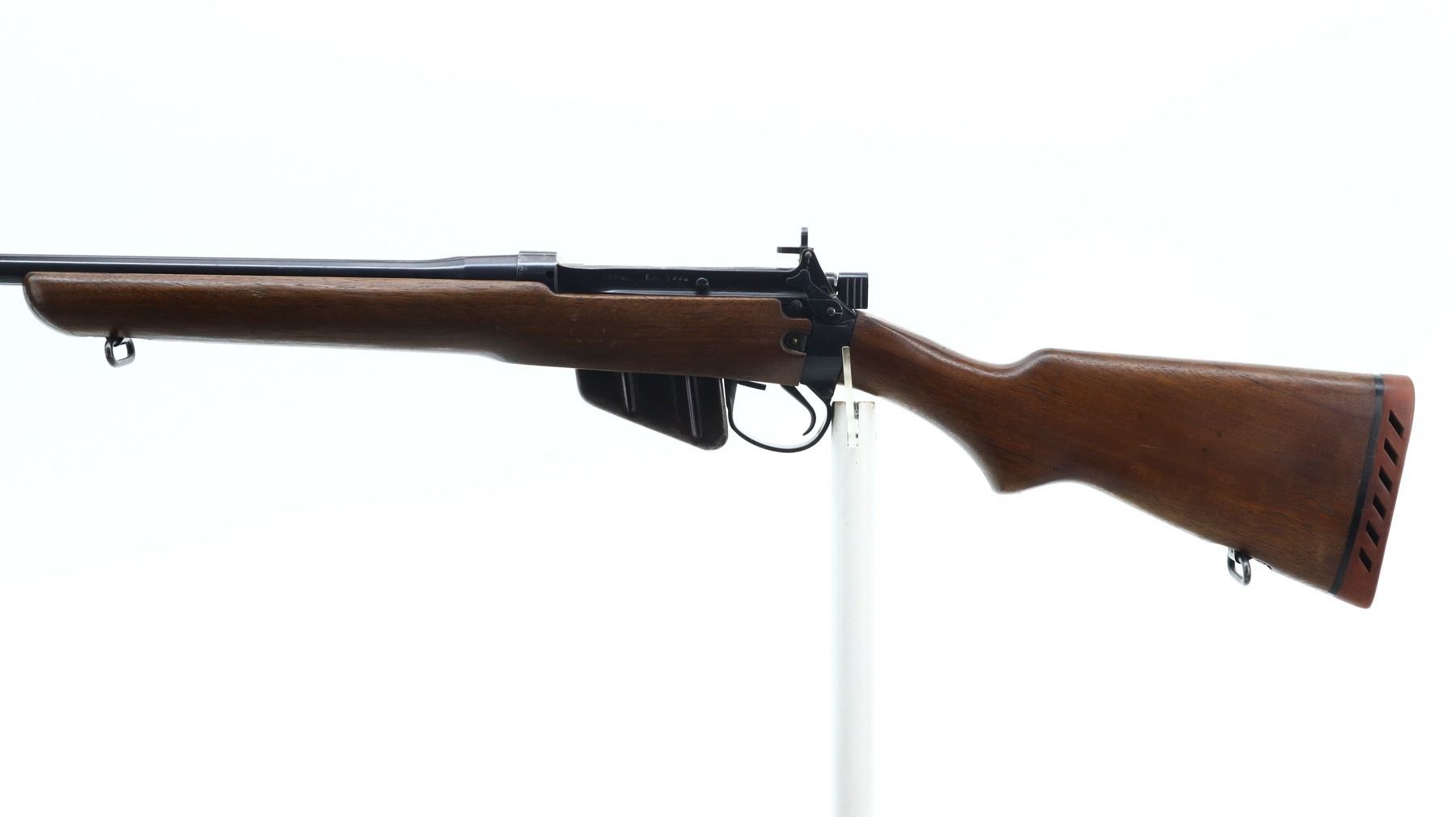 7/10, LEE ENFIELD, MODEL: EAL B MODEL 2ND PRODUCTION CIVILIAN, CALIBER:303 BR, COMES WITH MAGAZINE, BORE IS VERY GOOD. BLADE FRONT SIGHT WITH RAMP, RECEIVER BRIDGE REMOVED, TWO POSITION L FLIP REAR PEEP SIGHT, BLUED FINISH. TWO PIECE SMOOTH WOOD STOCKS, PISTOL GRIP, JOSTOM RED VENTED RUBBER RECOIL PAD, SLING SWIVELS. METAL FINISH SHOWS SOME SCRATCHES, HANDLING MARKS AND WEAR. STOCKS SHOW SOME MARKS, SCRATCHES AND WEAR. , ACTION: BOLT ACTION RIFLE, BARREL LENGTH: 21.25", SERIAL # 3444, CONDITION: 7/10, CLASS: CANADIAN NON RESTRICTED
